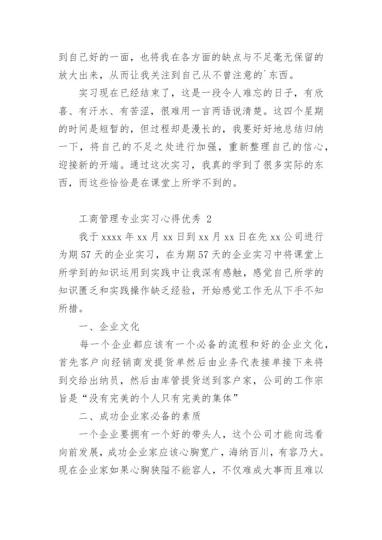 工商管理专业实习心得优秀工商管理专业实习心得优秀范文实习是我们走向社会、步入工作岗位的一个必不可少的重要环节。下面是小编为您整理的工商管理专业实习心得,一起来看看工商管理专业实习心得!工商管理专业实习心得优秀1实习目的为了真正做到理论和实践相结合,也为了能更详细地了解工商管理这一专业的真正内涵,通过对企业实际的调查、研究,熟悉外贸实务的具体操作程序,增强感性认识,初步培养学生理论联系实际的能力和分析问题与解决问题的能力。真正做到融会贯通,切实达到实习的目的。实习心得实习是一个很好的平台,让我对社会有了新的领悟和认识,只有在现实中经历过,才会明白这个社会是如此的复杂,远没有我们想象的美好工商管理实习心得体会。在酒店实习期间,我发现自己的想法和观点是如此的幼稚,不过后来我就慢慢转变了,想法变得成熟。在大学里,我们只是一张白纸,只有通过实习才能体味社会和人生,在话务员这个不起眼的岗位,我能够感受到社会上的人情事理,我在一点点的积累社会经验和学习处世之道,了解人际关系的复杂,这是整个实习过程中最宝贵的一部分。整个实习历程,我不仅看到自己好的一面,也将我在各方面的缺点与不足毫无保留的放大出来,从而让我关注到自己从不曾注意的`东西。实习现在已经结束了,这是一段令人难忘的日子,有欣喜、有汗水、有苦涩,很难用一言两语说清楚。这四个星期的时间是短暂的,但过程却是漫长的,我要好好地总结归纳一下,将自己的不足之处进行加强,重新整理自己的信心,迎接新的开端。通过这次实习,我真的学到了很多实际的东西,而这些恰恰是在课堂上所学不到的。工商管理专业实习心得优秀2我于xxxx年xx月xx日到xx月xx日在先xx公司进行为期57天的企业实习,在为期57天的企业实习中将课堂上所学到的知识运用到实践中让我深有感触,感觉自己所学的知识匮乏和实践操作缺乏经验,开始感觉工作无从下手不知所措。一、企业文化每一个企业都应该有一个必备的流程和好的企业文化,首先客户向经销商发提货单然后由业务代表接单接下来将到交给出纳员,然后由库管提货送到客户家,公司的工作宗旨是“没有完美的个人只有完美的集体”二、成功企业家必备的素质一个企业要拥有一个好的带头人,这个公司才能向远看向前发展,成功企业家应该心胸宽广,海纳百川,有容乃大。现在企业家如果心胸狭隘不能容人,不仅难成大事而且难以与人亲密相处,企业家拥有宽大的胸怀不仅能够收揽人心,也能体现自己身边聚集了许多优秀的人才。还能使人心悦诚服,企业家必须有一个度量,宰相肚里能撑船,凡事要有度量这是成功企业家的修养,既能体现领导的高尚风格又能赢得别人的尊重,胸怀是一个励志建业的标准。企业家有强大的胸怀才能站的高忘得远,一个企业家应该有丰富的经验和娴熟的工作经验和管理技巧,并且要懂得行业中应该尊从得法律,和具备经营得技巧,对企业和员工负责有能够承担风险得责任敢于面对竞争对手给施加得压力,并且要有创新意识和创新能力。三、企业需要什么样的员工如果说老板是企业得带头人那么企业得员工就是撑起企业得脊梁,一个好的员工应该要有热情积极得工作态度,对工作负责也就是对自己负责,有一个好的工作态度,应该对企业忠诚要以正值得态度去面对事情,一个好的员工不应该不好的心情带到工作中去要和同事同心协力,要对工作抱有热情的态度,工作要积极主动要尊重领导的决定,拥有较强的专业知识和实践,并且应该有较强的沟通能力,一个好的'员工要对自己有信心能够让企业自己能给的希望。四、团队精神团队精神是企业的团队精神是一个企业的灵魂,没有了灵魂那么这个企业就没有了前进的动力和方向,一个企业拥有团队意识就能解决一切困难,团队要有合理的团队分工和具有较强的集体承受能力,只有有团队精神那么面对竞争对手就会战胜它,只有有团队精神就能够可以面临一切困难,一个完美的团队不能计较个人的得失,一个企业拥有一个好的团队精神那么就会勇登高,好的团队精神,不仅能让企业的到成长,而且还会让我们个人的到成长,在团队中学会配合学会理解。以上是我在xxx公司为期57天的工作总结其中包括了我所学到的知识和实践的经验,在实习期间受益良多,也为以后的实习有了一个初步的认识和了解,对以后的工作内容有了解,以上就是我的实习总结心得体会。