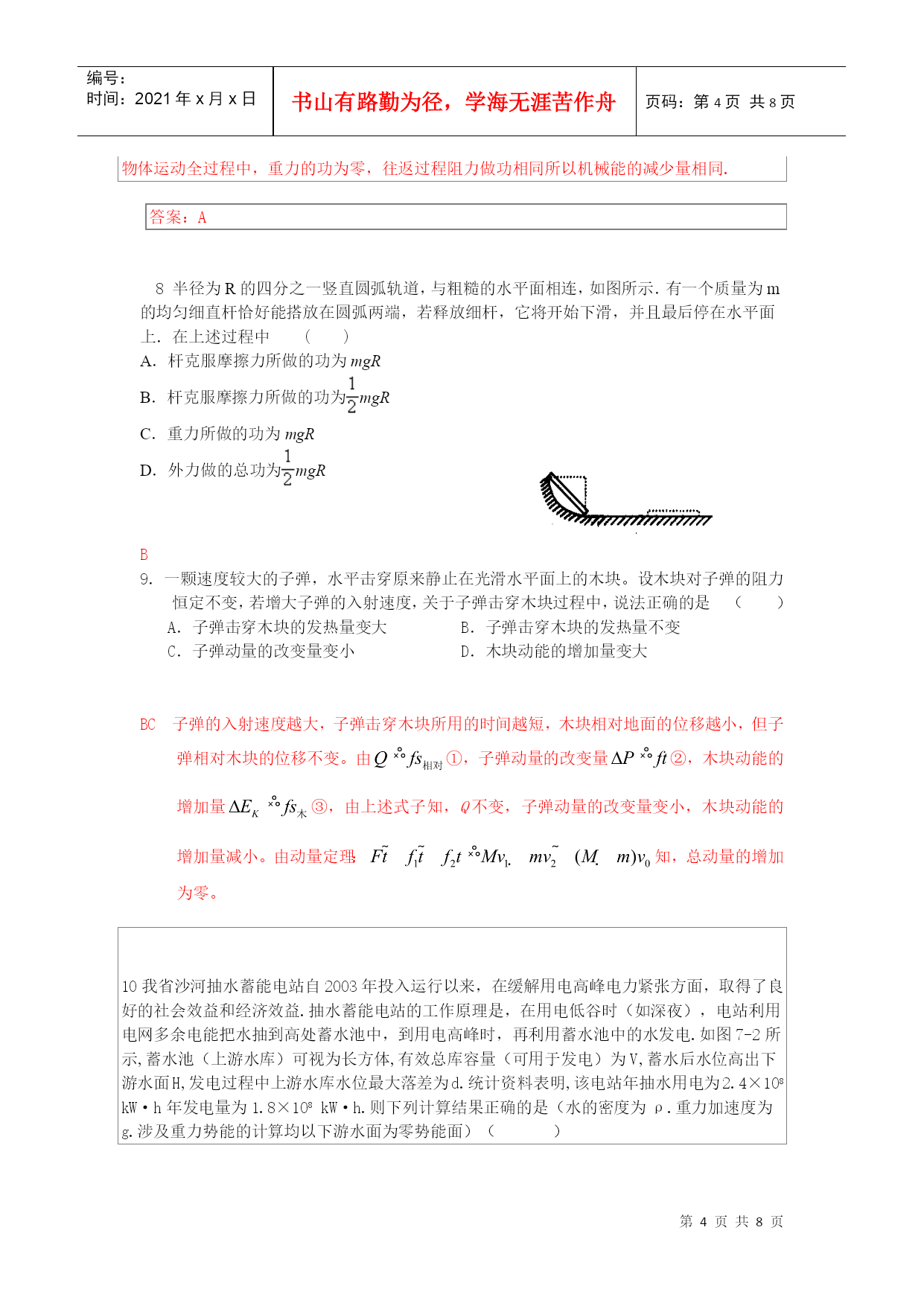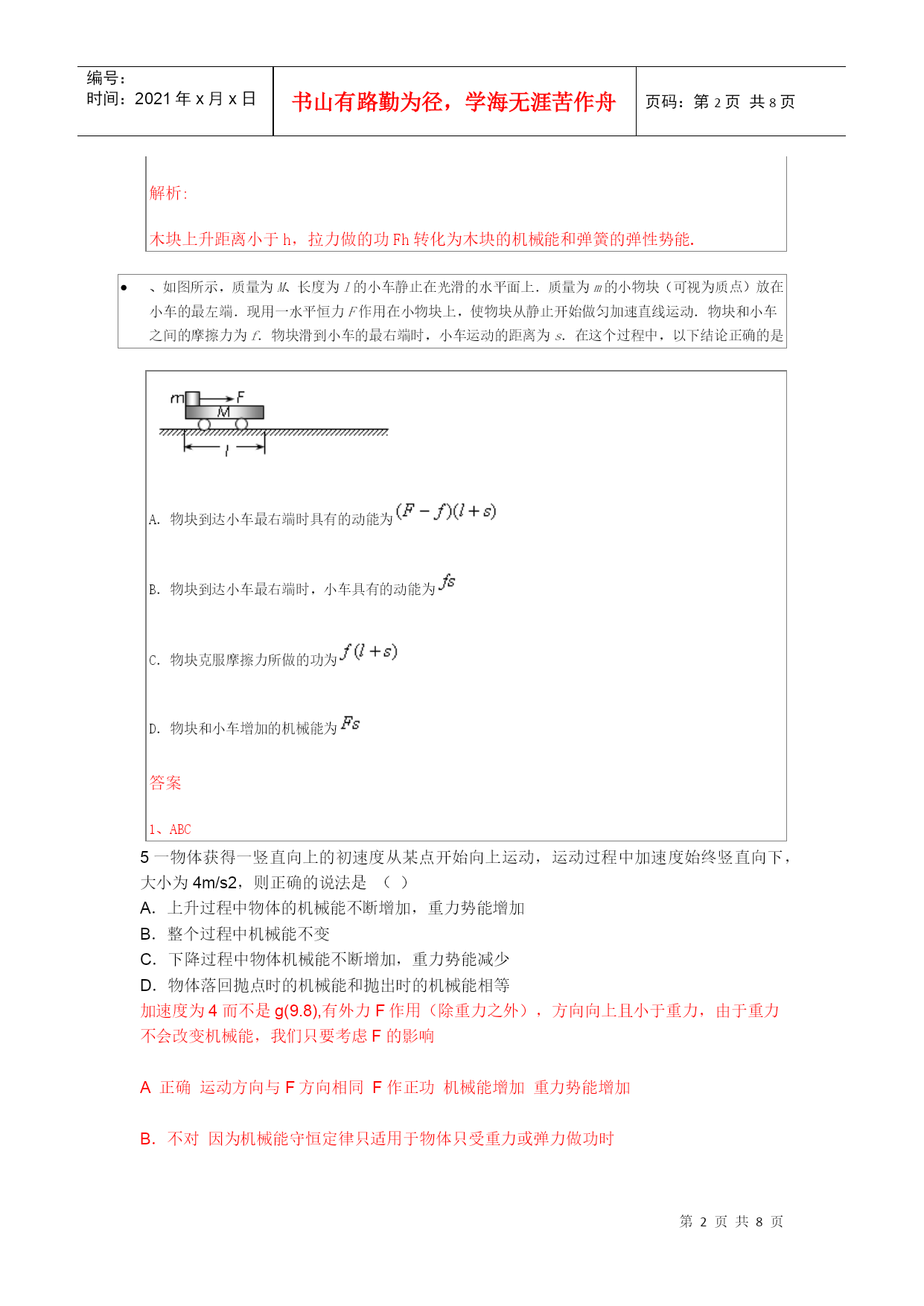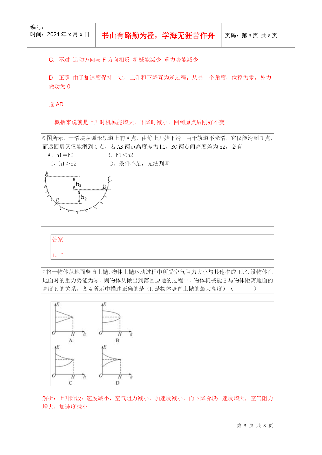 编号:时间:2021年x月x日书山有路勤为径,学海无涯苦作舟页码:第PAGE8页共NUMPAGES8页第PAGE\*MERGEFORMAT8页共NUMPAGES\*MERGEFORMAT8页机械能守恒2有一种叫做“蹦极跳”的运动中,质量为m的游戏者身系一根长为L、弹性优良的轻质柔软橡皮绳,从高处由静止开始下落1.5L时到达最低点,若在下落过程中不计空气阻力,则以下说法错误的是()A.速度先增大后减小B.加速度先减小后增大C.动能增加了mgLD.重力势能减少了0.5mgL答案1、解析:人从高处下落过程中,当橡皮绳未拉伸产生形变时,人做自由落体运动,加速度恒定,速度增加;当橡皮绳拉伸产生形变后,由于形变愈来愈大,则弹力越大,对人的阻碍越大,加速度则不断减小,但速度仍增加;当弹力增大到与人重力等大时,加速度为零,速度最大.此后,弹力大于重力,加速度又增加,但与速度反向,所以速度又减小,由于人的初、末动能均为零,故动能变化为零,C错;人在竖直方向下落了1.5L.故重力势能应减少1.5mgL,D对.答案:c3、一块质量为m的木块放在地面上,用一根弹簧连着木块,如图65所示,用恒力F拉弹簧,使木块离开地面,如果力F的作用点向上移动的距离为h,则()图6-5A.木块的重力势能增加了FhB.木块的机械能增加了FhC.拉力所做的功为FhD.木块的动能增加了Fh答案1、C解析:木块上升距离小于h,拉力做的功Fh转化为木块的机械能和弹簧的弹性势能.、如图所示,质量为M、长度为l的小车静止在光滑的水平面上.质量为m的小物块(可视为质点)放在小车的最左端.现用一水平恒力F作用在小物块上,使物块从静止开始做匀加速直线运动.物块和小车之间的摩擦力为f.物块滑到小车的最右端时,小车运动的距离为s.在这个过程中,以下结论正确的是A.物块到达小车最右端时具有的动能为B.物块到达小车最右端时,小车具有的动能为C.物块克服摩擦力所做的功为D.物块和小车增加的机械能为答案1、ABC5一物体获得一竖直向上的初速度从某点开始向上运动,运动过程中加速度始终竖直向下,大小为4m/s2,则正确的说法是()A.上升过程中物体的机械能不断增加,重力势能增加B.整个过程中机械能不变C.下降过程中物体机械能不断增加,重力势能减少D.物体落回抛点时的机械能和抛出时的机械能相等加速度为4而不是g(9.8),有外力F作用(除重力之外),方向向上且小于重力,由于重力不会改变机械能,我们只要考虑F的影响A正确运动方向与F方向相同F作正功机械能增加重力势能增加B.不对因为机械能守恒定律只适用于物体只受重力或弹力做功时C.不对运动方向与F方向相反机械能减少重力势能减少D正确由于加速度保持一定,上升和下降互为逆过程。从另一个角度,位移为零,外力做功为0选AD概括来说就是上升时机械能增大,下降时减小,回到原点后刚好不变6图所示,一滑块从弧形轨道上的A点,由静止开始下滑。由于轨道不光滑,它仅能滑到B点,而返回后又仅能滑到C点,若AB两点高度差为h1,BC两点间高度差为h2,必有A、h1=h2B、h1<h2C、h1>h2D、条件不足,无法判断答案1、C7将一物体从地面竖直上抛,物体上抛运动过程中所受空气阻力大小与其速率成正比.设物体在地面时的重力势能为零,则物体从抛出到落回原地的过程中,物体机械能E与物体距离地面的高度h的关系,图4所示中描述正确的是(H是物体竖直上抛的最大高度)()解析:上升阶段:速度减小,空气阻力减小,加速度减小,而下降阶段:速度增大,空气阻力增大,加速度减小物体运动全过程中,重力的功为零,往返过程阻力做功相同所以机械能的减少量相同.答案:A8半径为R的四分之一竖直圆弧轨道,与粗糙的水平面相连,如图所示.有一个质量为m的均匀细直杆恰好能搭放在圆弧两端,若释放细杆,它将开始下滑,并且最后停在水平面上.在上述过程中()A.杆克服摩擦力所做的功为mgRB.杆克服摩擦力所做的功为mgRC.重力所做的功为mgRD.外力做的总功为mgRB9.一颗速度较大的子弹,水平击穿原来静止在光滑水平面上的木块。设木块对子弹的阻力恒定不变,若增大子弹的入射速度,关于子弹击穿木块过程中,说法正确的是()A.子弹击穿木块的发热量变大B.子弹击穿木块的发热量不变C.子弹动量的改变量变小D.木块动能的增加量变大BC子弹的入射速度越大,子弹击穿木块所用的时间越短,木块相对地面的位移越小,但子弹相对木块的位移不变。由①,子弹动量的改变量②,木块动能的增加量③,由上述式子知,Q不变,子弹动量的改变量变小,木块动能的增加量减小。由动量定理:知,总动量的增加