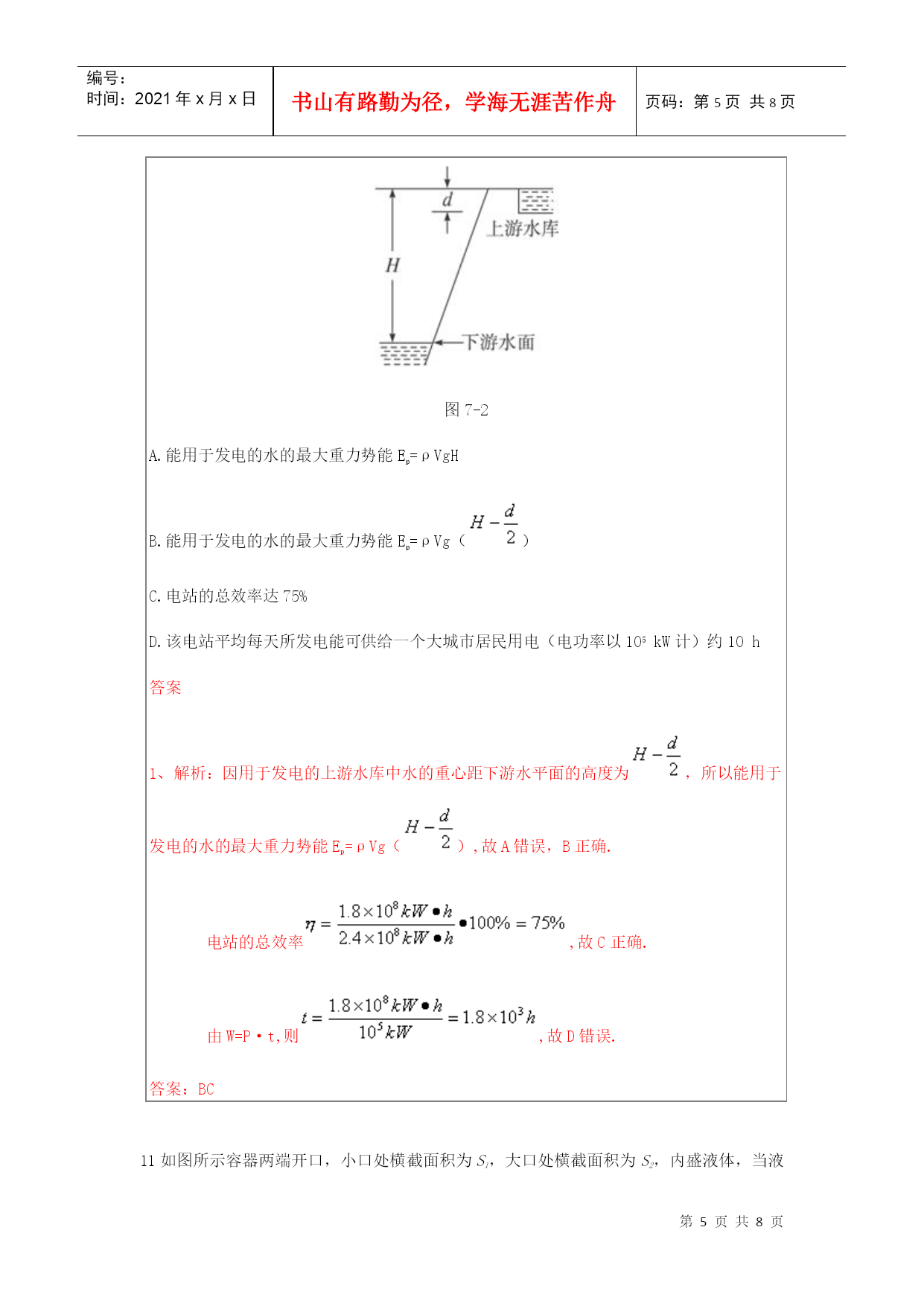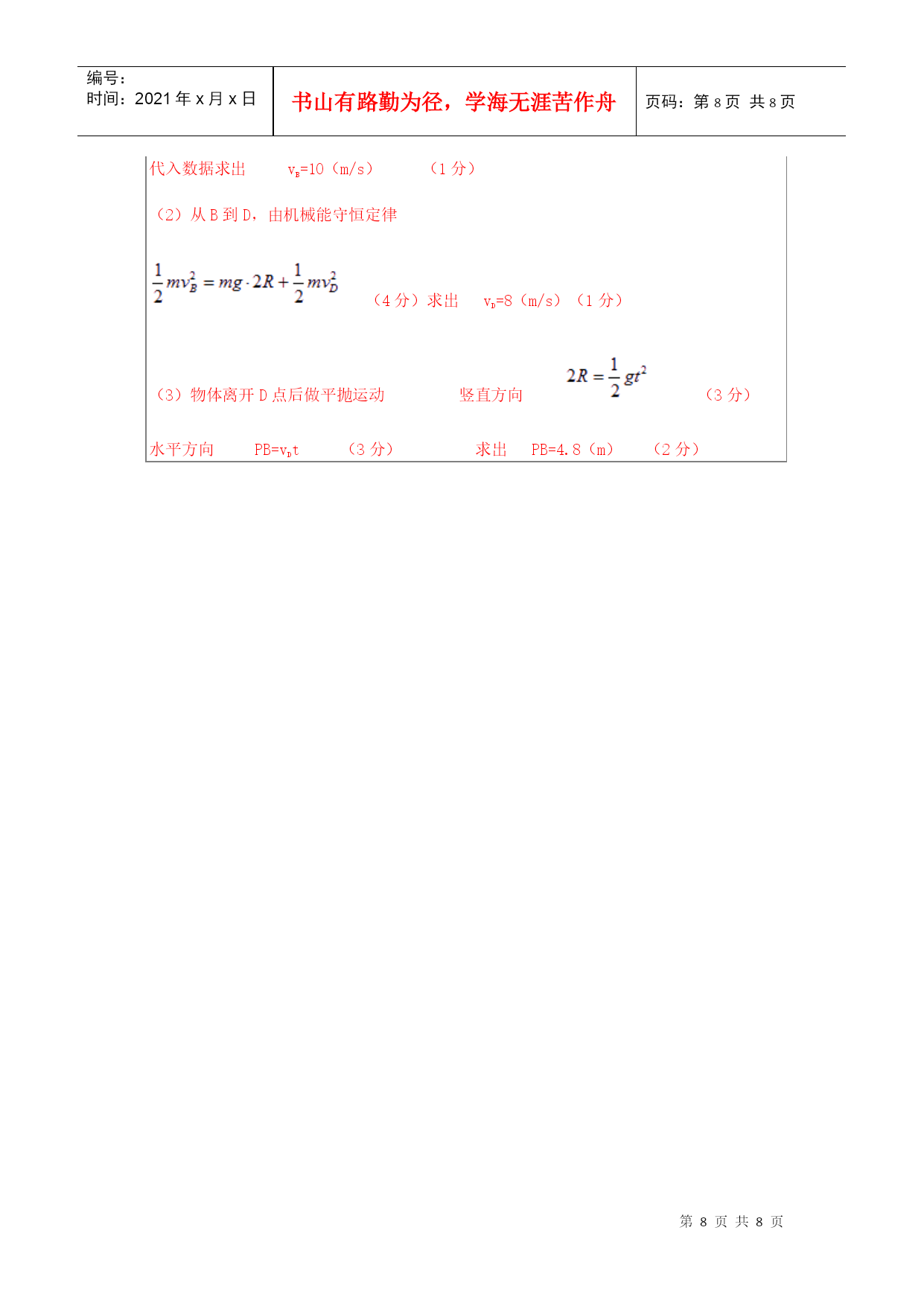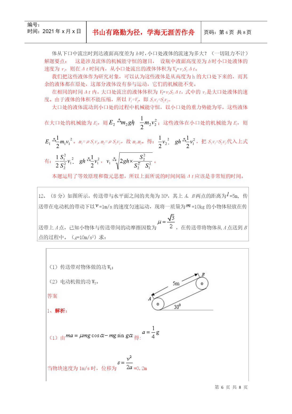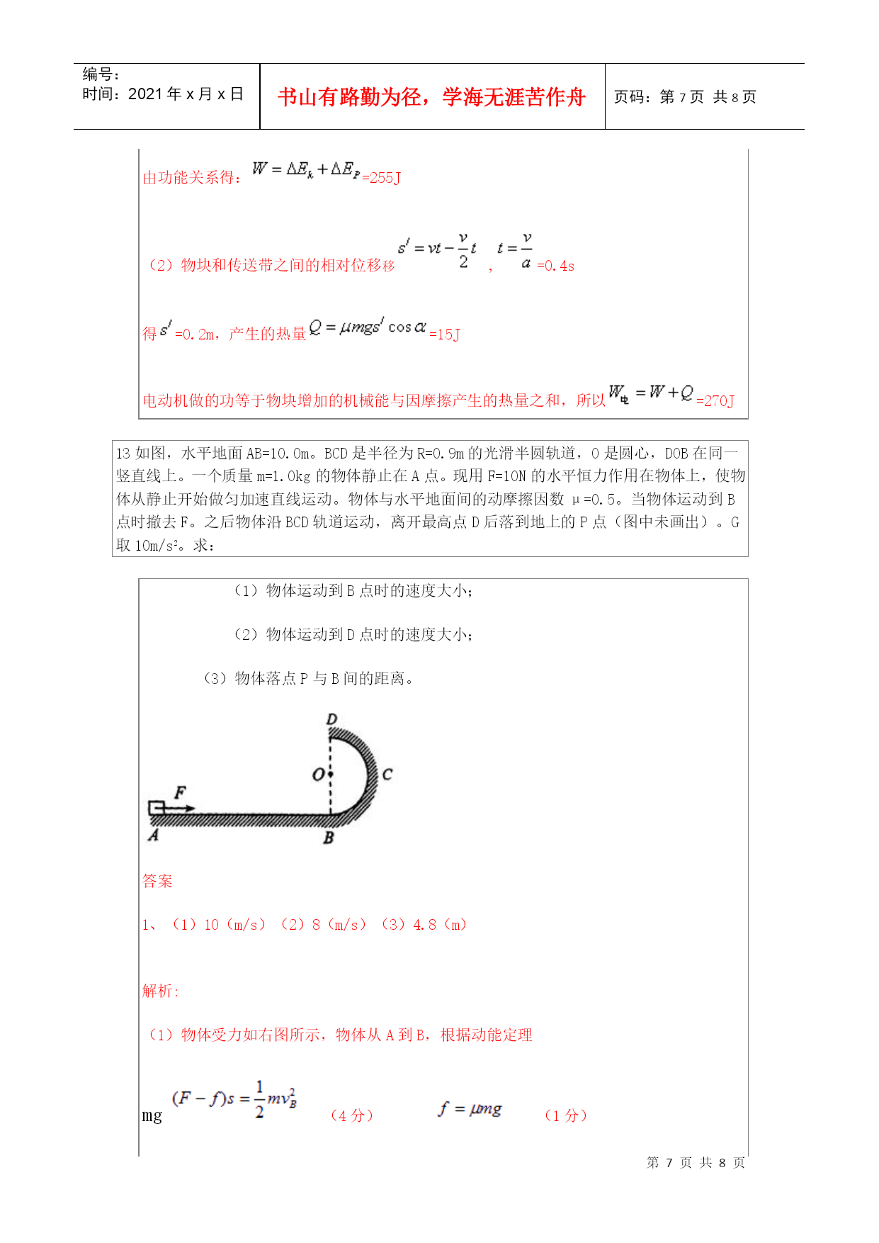 编号:时间:2021年x月x日书山有路勤为径,学海无涯苦作舟页码:第PAGE8页共NUMPAGES8页第PAGE\*MERGEFORMAT8页共NUMPAGES\*MERGEFORMAT8页机械能守恒2有一种叫做“蹦极跳”的运动中,质量为m的游戏者身系一根长为L、弹性优良的轻质柔软橡皮绳,从高处由静止开始下落1.5L时到达最低点,若在下落过程中不计空气阻力,则以下说法错误的是()A.速度先增大后减小B.加速度先减小后增大C.动能增加了mgLD.重力势能减少了0.5mgL答案1、解析:人从高处下落过程中,当橡皮绳未拉伸产生形变时,人做自由落体运动,加速度恒定,速度增加;当橡皮绳拉伸产生形变后,由于形变愈来愈大,则弹力越大,对人的阻碍越大,加速度则不断减小,但速度仍增加;当弹力增大到与人重力等大时,加速度为零,速度最大.此后,弹力大于重力,加速度又增加,但与速度反向,所以速度又减小,由于人的初、末动能均为零,故动能变化为零,C错;人在竖直方向下落了1.5L.故重力势能应减少1.5mgL,D对.答案:c3、一块质量为m的木块放在地面上,用一根弹簧连着木块,如图65所示,用恒力F拉弹簧,使木块离开地面,如果力F的作用点向上移动的距离为h,则()图6-5A.木块的重力势能增加了FhB.木块的机械能增加了FhC.拉力所做的功为FhD.木块的动能增加了Fh答案1、C解析:木块上升距离小于h,拉力做的功Fh转化为木块的机械能和弹簧的弹性势能.、如图所示,质量为M、长度为l的小车静止在光滑的水平面上.质量为m的小物块(可视为质点)放在小车的最左端.现用一水平恒力F作用在小物块上,使物块从静止开始做匀加速直线运动.物块和小车之间的摩擦力为f.物块滑到小车的最右端时,小车运动的距离为s.在这个过程中,以下结论正确的是A.物块到达小车最右端时具有的动能为B.物块到达小车最右端时,小车具有的动能为C.物块克服摩擦力所做的功为D.物块和小车增加的机械能为答案1、ABC5一物体获得一竖直向上的初速度从某点开始向上运动,运动过程中加速度始终竖直向下,大小为4m/s2,则正确的说法是()A.上升过程中物体的机械能不断增加,重力势能增加B.整个过程中机械能不变C.下降过程中物体机械能不断增加,重力势能减少D.物体落回抛点时的机械能和抛出时的机械能相等加速度为4而不是g(9.8),有外力F作用(除重力之外),方向向上且小于重力,由于重力不会改变机械能,我们只要考虑F的影响A正确运动方向与F方向相同F作正功机械能增加重力势能增加B.不对因为机械能守恒定律只适用于物体只受重力或弹力做功时C.不对运动方向与F方向相反机械能减少重力势能减少D正确由于加速度保持一定,上升和下降互为逆过程。从另一个角度,位移为零,外力做功为0选AD概括来说就是上升时机械能增大,下降时减小,回到原点后刚好不变6图所示,一滑块从弧形轨道上的A点,由静止开始下滑。由于轨道不光滑,它仅能滑到B点,而返回后又仅能滑到C点,若AB两点高度差为h1,BC两点间高度差为h2,必有A、h1=h2B、h1<h2C、h1>h2D、条件不足,无法判断答案1、C7将一物体从地面竖直上抛,物体上抛运动过程中所受空气阻力大小与其速率成正比.设物体在地面时的重力势能为零,则物体从抛出到落回原地的过程中,物体机械能E与物体距离地面的高度h的关系,图4所示中描述正确的是(H是物体竖直上抛的最大高度)()解析:上升阶段:速度减小,空气阻力减小,加速度减小,而下降阶段:速度增大,空气阻力增大,加速度减小物体运动全过程中,重力的功为零,往返过程阻力做功相同所以机械能的减少量相同.答案:A8半径为R的四分之一竖直圆弧轨道,与粗糙的水平面相连,如图所示.有一个质量为m的均匀细直杆恰好能搭放在圆弧两端,若释放细杆,它将开始下滑,并且最后停在水平面上.在上述过程中()A.杆克服摩擦力所做的功为mgRB.杆克服摩擦力所做的功为mgRC.重力所做的功为mgRD.外力做的总功为mgRB9.一颗速度较大的子弹,水平击穿原来静止在光滑水平面上的木块。设木块对子弹的阻力恒定不变,若增大子弹的入射速度,关于子弹击穿木块过程中,说法正确的是()A.子弹击穿木块的发热量变大B.子弹击穿木块的发热量不变C.子弹动量的改变量变小D.木块动能的增加量变大BC子弹的入射速度越大,子弹击穿木块所用的时间越短,木块相对地面的位移越小,但子弹相对木块的位移不变。由①,子弹动量的改变量②,木块动能的增加量③,由上述式子知,Q不变,子弹动量的改变量变小,木块动能的增加量减小。由动量定理:知,总动量的增加