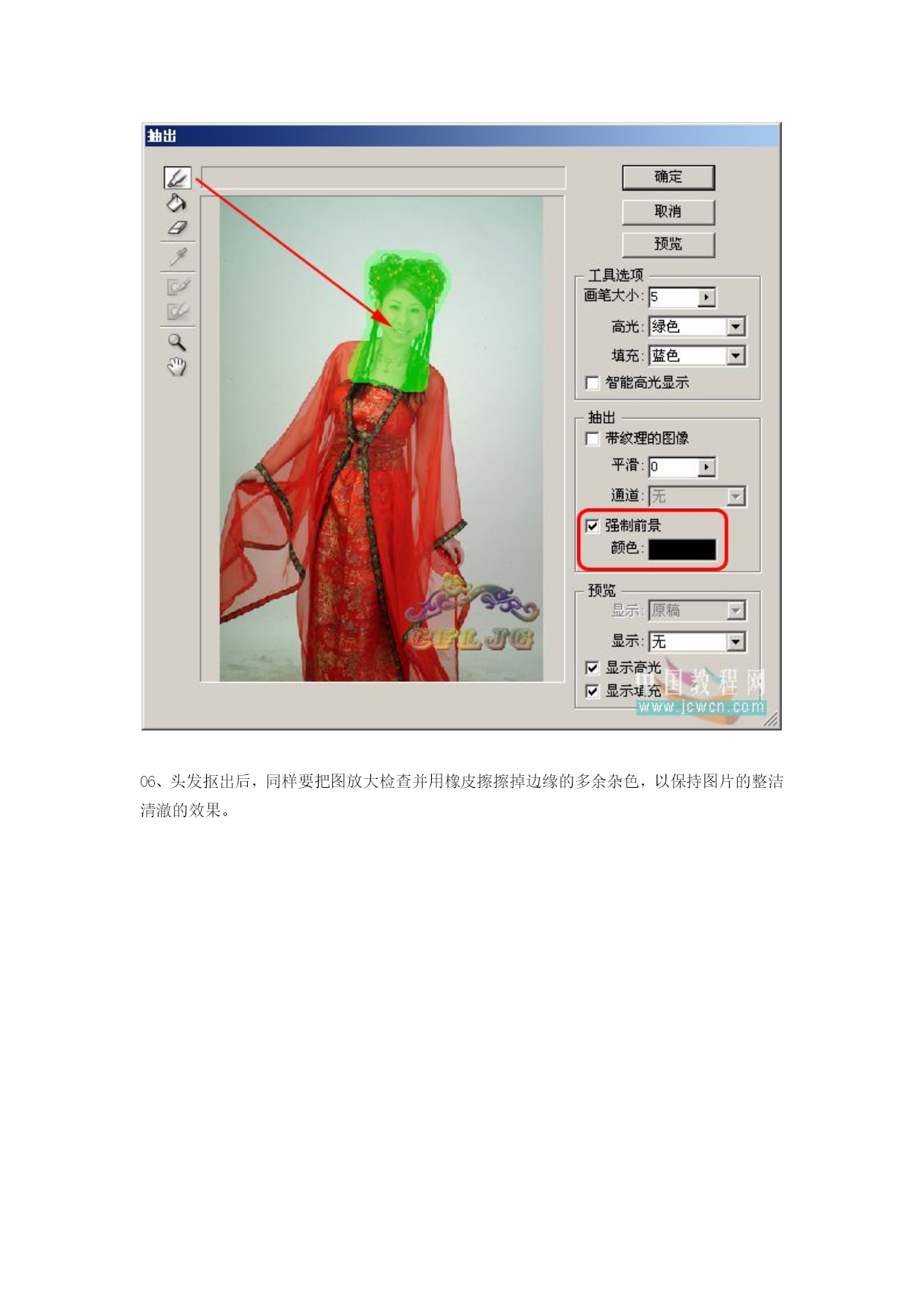 Photoshop抠图教程:教你抠出红色婚纱的技巧(3)2009-03-0712:27:52作者:HYPERLINK"http://www.jcwcn.com/member/member.php?username=cfljg"cfljg来源:HYPERLINK"http://bbs.jcwcn.com"\t"_blank"中国教程网论坛浏览次数:49887HYPERLINK"http://www.jcwcn.com/article/2009/0307/photoshop_31686_3.html"\l"comment#comment"评论04、透明的婚纱就抠出来了,需要注意的是:把图放大检查并用橡皮擦擦掉边缘的多余杂色,以保持图片的整洁清澈的效果。05、在图层1副本层执行滤镜--抽出,强制前景处打钩,颜色设置为黑色(#000000),同样用边缘高光器工具按图示涂抹绿色。目的是要获取头发的细节。06、头发抠出后,同样要把图放大检查并用橡皮擦擦掉边缘的多余杂色,以保持图片的整洁清澈的效果。