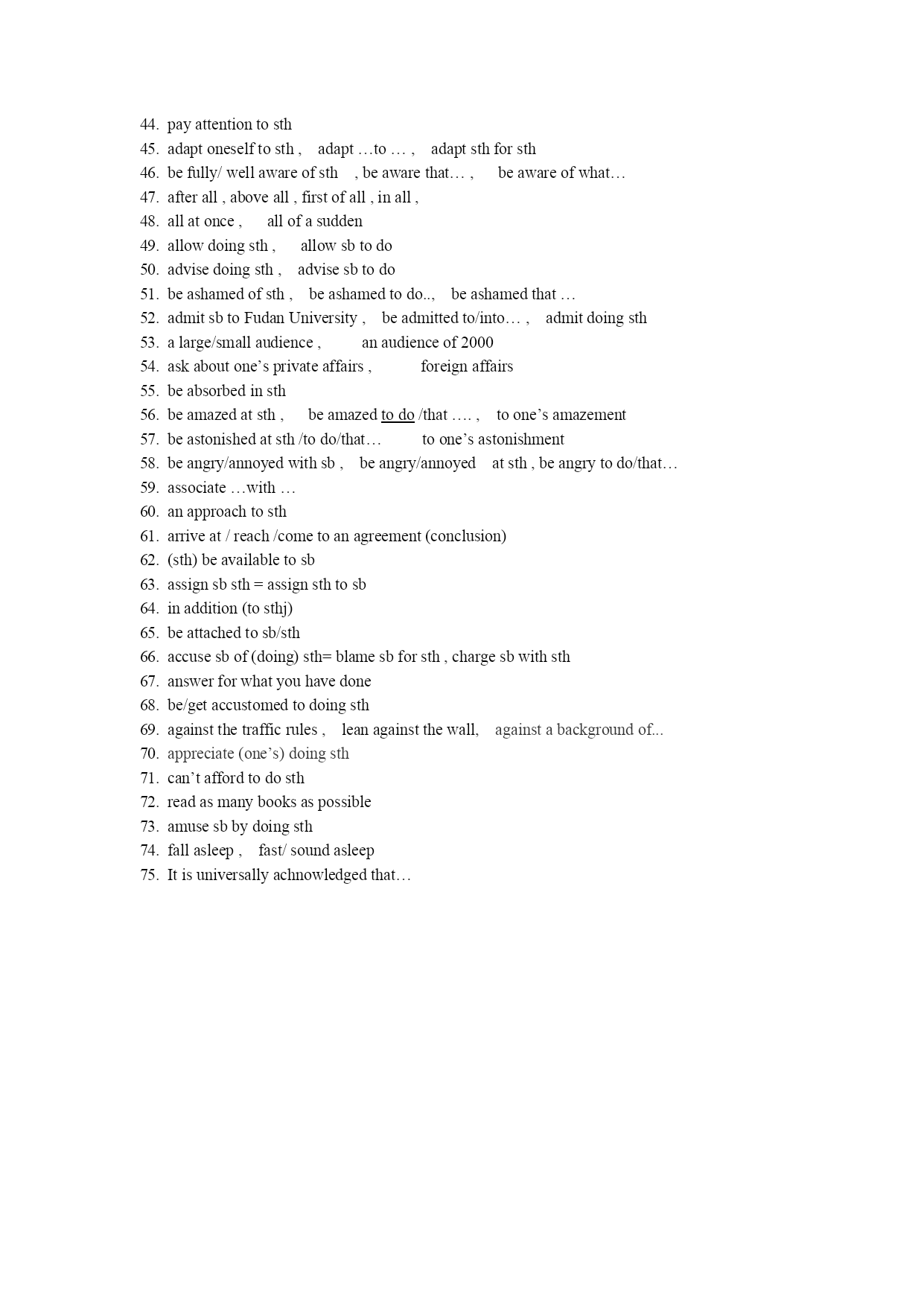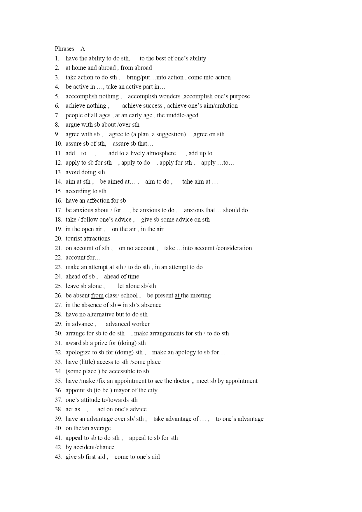 PhrasesAhavetheabilitytodosth,tothebestofone’sabilityathomeandabroad,fromabroadtakeactiontodosth,bring/put…intoaction,comeintoactionbeactivein…,takeanactivepartin…acccomplishnothing,accomplishwonders,accomplishone’spurposeachievenothing,achievesuccess,achieveone’saim/ambitionpeopleofallages,atanearlyage,themiddle-agedarguewithsbabout/oversthagreewithsb,agreeto(aplan,asuggestion),agreeonsthassuresbofsth,assuresbthat…add…to…,addtoalivelyatmosphere,adduptoapplytosbforsth,applytodo,applyforsth,apply…to…avoiddoingsthaimatsth,beaimedat…,aimtodo,taheaimat…accordingtosthhaveanaffectionforsbbeanxiousabout/for…,beanxioustodo,anxiousthat…shoulddotake/followone’sadvice,givesbsomeadviceonsthintheopenair,ontheair,intheairtouristattractionsonaccountofsth,onnoaccount,take…intoaccount/considerationaccountfor…makeanattemptatsth/todosth,inanattempttodoaheadofsb,aheadoftimeleavesbalone,letalonesb/sthbeabsentfromclass/school,bepresentatthemeetingintheabsenceofsb=insb’sabsencehavenoalternativebuttodosthinadvance,advancedworkerarrangeforsbtodosth,makearrangementsforsth/todosthawardsbaprizefor(doing)sthapologizetosbfor(doing)sth,makeanapologytosbfor…have(little)accesstosth/someplace(someplace)beaccessibletosbhave/make/fixanappointmenttoseethedoctor,,meetsbbyappointmentappointsb(tobe)mayorofthecityone’sattitudeto/towardssthactas…,actonone’sadvicehaveanadvantageoversb/sth,takeadvantageof…,toone’sadvantageonthe/anaverageappealtosbtodosth,appealtosbforsthbyaccident/chancegivesbfirstaid,cometoone’saidpayattentiontosthadaptoneselftosth,adapt…to…,adaptsthforsthbefully/wellawareofsth,beawarethat…,beawareofwhat…afterall,aboveall,firstofall,inall,allatonce,allofasuddenallowdoingsth,allowsbtodoadvisedoingsth,advisesbtodobeashamedofsth,beashamedtodo..,beashamedthat…admitsbtoFudanUniversity,beadmittedto/into…,admitdoingsthalarge/smallaudience,anaudienceof2000askaboutone’sprivateaffairs,foreignaffairsbeabsorbedinsthbeamazedatsth,beamazedtodo/that….