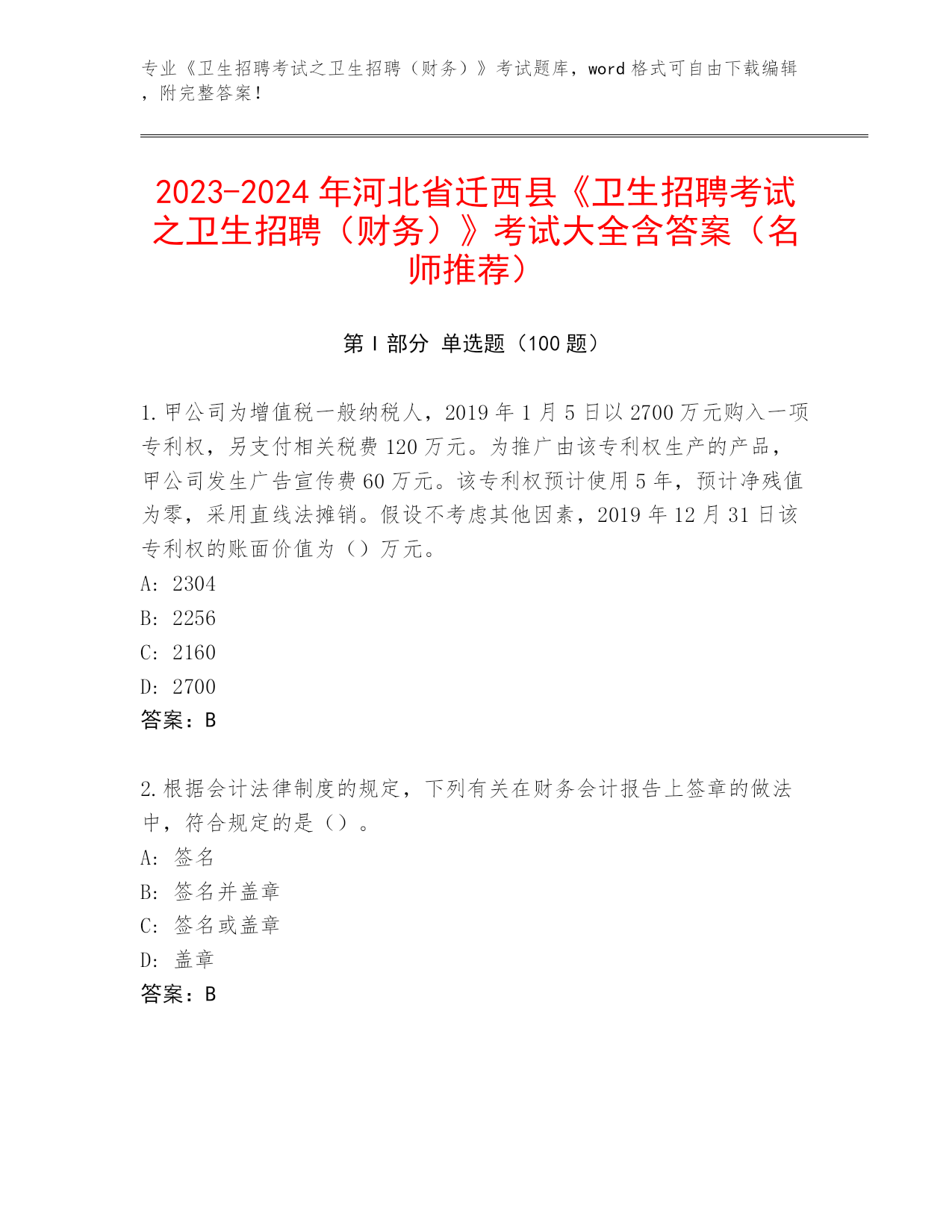 2023-2024年河北省迁西县《卫生招聘考试之卫生招聘(财务)》考试大全含答案(名师推荐)