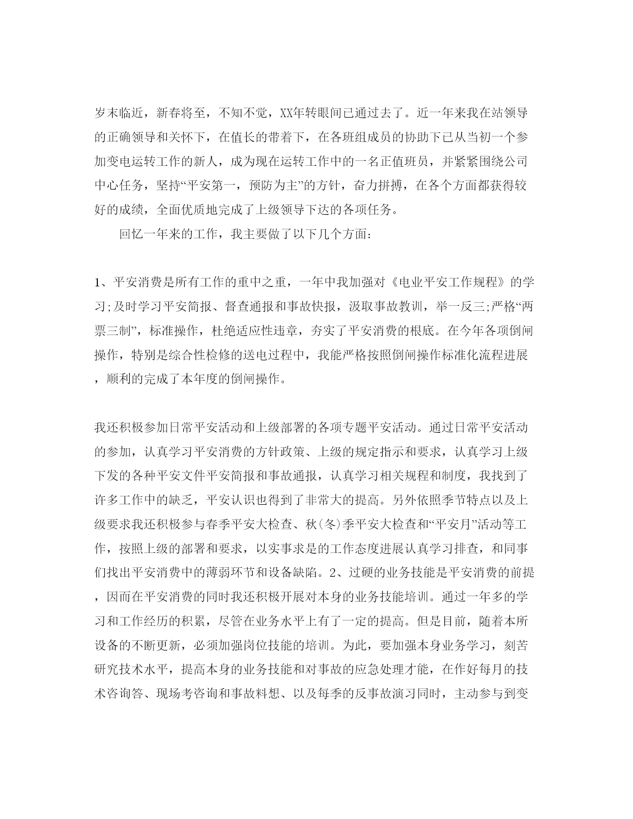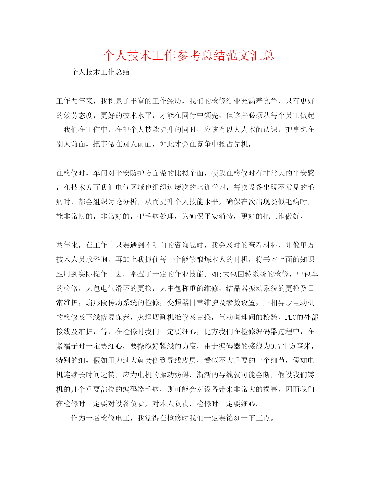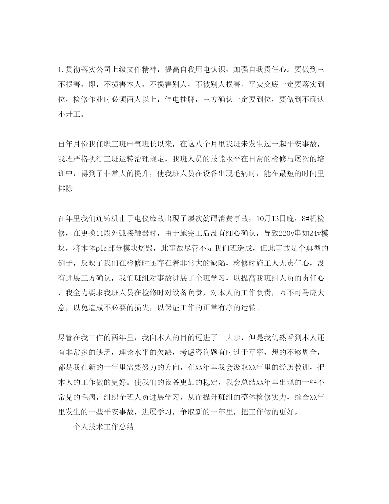 个人技术工作参考总结范文汇总个人技术工作总结工作两年来,我积累了丰富的工作经历,我们的检修行业充满着竞争,只有更好的效劳态度,更好的技术水平,才能在同行中领先,但这些必须从每个员工做起。我们在工作中,在把个人技能提升的同时,应该有以人为本的认识,把事想在别人前面,把事做在别人前面,如此才会在竞争中抢占先机,在检修时,车间对平安防护方面做的比拟全面,使我在检修时有非常大的平安感,在技术方面我们电气区域也组织过屡次的培训学习,每次设备出现不常见的毛病时,都会组织讨论分析,从而提升个人技能水平,确保在次出现类似毛病时,能非常快的,非常好的,把毛病处理,为确保平安消费,更好的把工作做好。两年来,在工作中只要遇到不明白的咨询题时,我会及时的查看材料,并像甲方技术人员求咨询,再加上我抓住每一个能够锻炼本人的时机,将书本上面的知识应用到实际操作中去,掌握了一定的作业技能。如;大包回转系统的检修,中包车的检修,大包电气滑环的更换,大中包称重的维修,结晶器振动系统的更换及日常维护,扇形段传动系统的检修,变频器日常维护及参数设置,三相异步电动机的检修及下线修复保养,火焰切割机维修及更换,气动调理阀的校验,PLC的外部接线及维护,等,在检修时我们一定要细心,比方我们在检修编码器过程中,在紧端子时一定要细心,要操纵好紧线的力度,由于编码器的接线为0.7平方毫米,特别的细,假如用力过大就会伤到导线皮层,看似不大重要的一个细节,假如电机连续长时间运转,应为电机的振动妨碍,渐渐的导线就可能会断,假设我们铸机的几个重要部位的编码器毛病,则可能会对设备带来非常大的损害,因而我们在检修时一定要对设备负责,对本人负责,检修时一定要细心。作为一名检修电工,我觉得在检修时我们一定要铭刻一下三点。1.贯彻落实公司上级文件精神,提高自我用电认识,加强自我责任心。要做到三不损害,即,不损害本人,不损害别人,不被别人损害。平安交底一定要落实到位,检修作业时必须两人以上,停电挂牌,三方确认一定要到位,要做到不确认不开工。自年月份我任职三班电气班长以来,在这八个月里我班未发生过一起平安事故,我班严格执行三班运转治理规定,我班人员的技能水平在日常的检修与屡次的培训中,得到了非常大的提升,使我班人员在设备出现毛病时,能在最短的时间里排除。在年里我们连铸机由于电仪缘故出现了屡次妨碍消费事故,10月13日晚,8#机检修,在更换11段外弧接触器时,由于施完工后没有细心确认,导致220v串如24v模块,将本体plc部分模块烧毁,此事故尽管不是我们班造成,但此事故是个典型的例子,反映了我们在检修时还存在着非常大的缺陷,检修时施工人无责任心,没有进展三方确认,我们班组对事故进展了全班学习,以提高我班组人员的责任心,我全力要求我班人员在检修时对设备负责,对本人的工作负责,万不可马虎大意,以免造成不必要的损失,以保证工作的正常有序的运转。尽管在我工作的两年里,我向本人的目的迈进了一大步,但是我仍然看到本人还有非常多的缺乏,理论水平的欠缺,考虑咨询题有时过于草率,想的不够周全,都是我在新的一年里需要努力的方向,在XX年里我会汲取XX年里的经历教训,把本人的工作做的更好。使我们的设备更加的稳定。我会总结XX年里出现的一些不常见的毛病,组织全班人员进展学习。从而提升班组的整体检修实力,综合XX年里发生的一些平安事故,进展学习,争取新的一年里,把工作做的更好。个人技术工作总结岁末临近,新春将至,不知不觉,XX年转眼间已通过去了。近一年来我在站领导的正确领导和关怀下,在值长的带着下,在各班组成员的协助下已从当初一个参加变电运转工作的新人,成为现在运转工作中的一名正值班员,并紧紧围绕公司中心任务,坚持“平安第一,预防为主”的方针,奋力拼搏,在各个方面都获得较好的成绩,全面优质地完成了上级领导下达的各项任务。回忆一年来的工作,我主要做了以下几个方面:1、平安消费是所有工作的重中之重,一年中我加强对《电业平安工作规程》的学习;及时学习平安简报、督查通报和事故快报,汲取事故教训,举一反三;严格“两票三制”,标准操作,杜绝适应性违章,夯实了平安消费的根底。在今年各项倒闸操作,特别是综合性检修的送电过程中,我能严格按照倒闸操作标准化流程进展,顺利的完成了本年度的倒闸操作。我还积极参加日常平安活动和上级部署的各项专题平安活动。通过日常平安活动的参加,认真学习平安消费的方针政策、上级的规定指示和要求,认真学习上级下发的各种平安文件平安简报和事故通报,认真学习相关规程和制度,我找到了许多工作中的缺乏,平安认识也得到了非常大的提高。另外依照季节特点以及上级要求我还积极参与春季平安大检查、秋(冬)季平安大检查和“平安月”活动等工作,按照上级的部署和要求,以实事求是的工作态度进展认真学习排查,和同事们找出