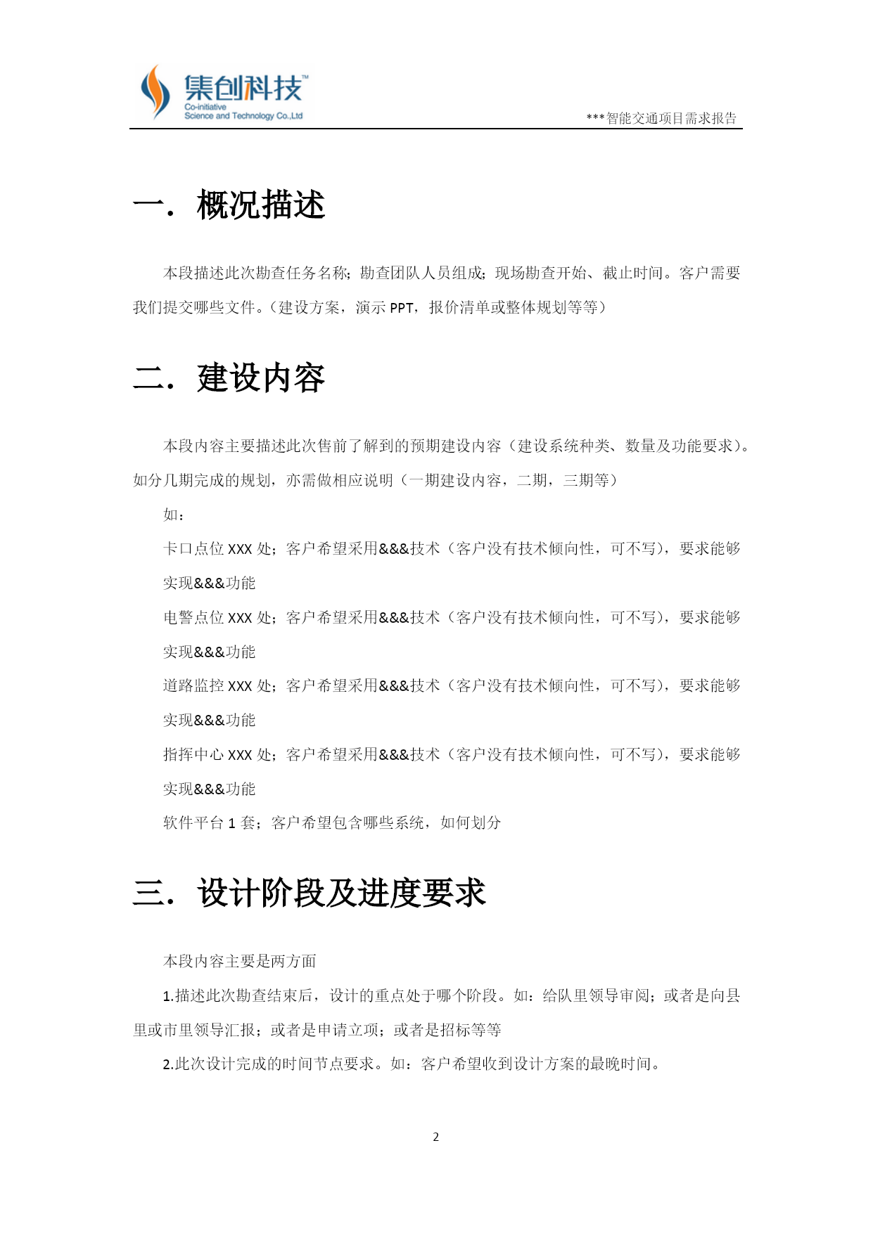 ***智能交通项目需求报告PAGE\*MERGEFORMAT2***智能交通项目需求报告四川省集创科技有限责任公司xxxx年xx月xx日一.概况描述本段描述此次勘查任务名称;勘查团队人员组成;现场勘查开始、截止时间。客户需要我们提交哪些文件。(建设方案,演示PPT,报价清单或整体规划等等)二.建设内容本段内容主要描述此次售前了解到的预期建设内容(建设系统种类、数量及功能要求)。如分几期完成的规划,亦需做相应说明(一期建设内容,二期,三期等)如:卡口点位XXX处;客户希望采用&&&技术(客户没有技术倾向性,可不写),要求能够实现&&&功能电警点位XXX处;客户希望采用&&&技术(客户没有技术倾向性,可不写),要求能够实现&&&功能道路监控XXX处;客户希望采用&&&技术(客户没有技术倾向性,可不写),要求能够实现&&&功能指挥中心XXX处;客户希望采用&&&技术(客户没有技术倾向性,可不写),要求能够实现&&&功能软件平台1套;客户希望包含哪些系统,如何划分三.设计阶段及进度要求本段内容主要是两方面1.描述此次勘查结束后,设计的重点处于哪个阶段。如:给队里领导审阅;或者是向县里或市里领导汇报;或者是申请立项;或者是招标等等2.此次设计完成的时间节点要求。如:客户希望收到设计方案的最晚时间。