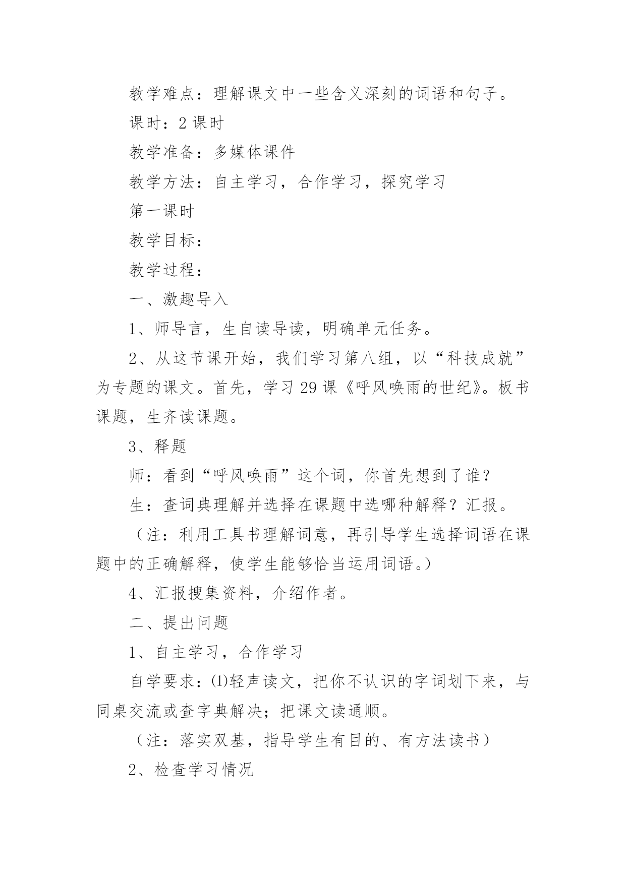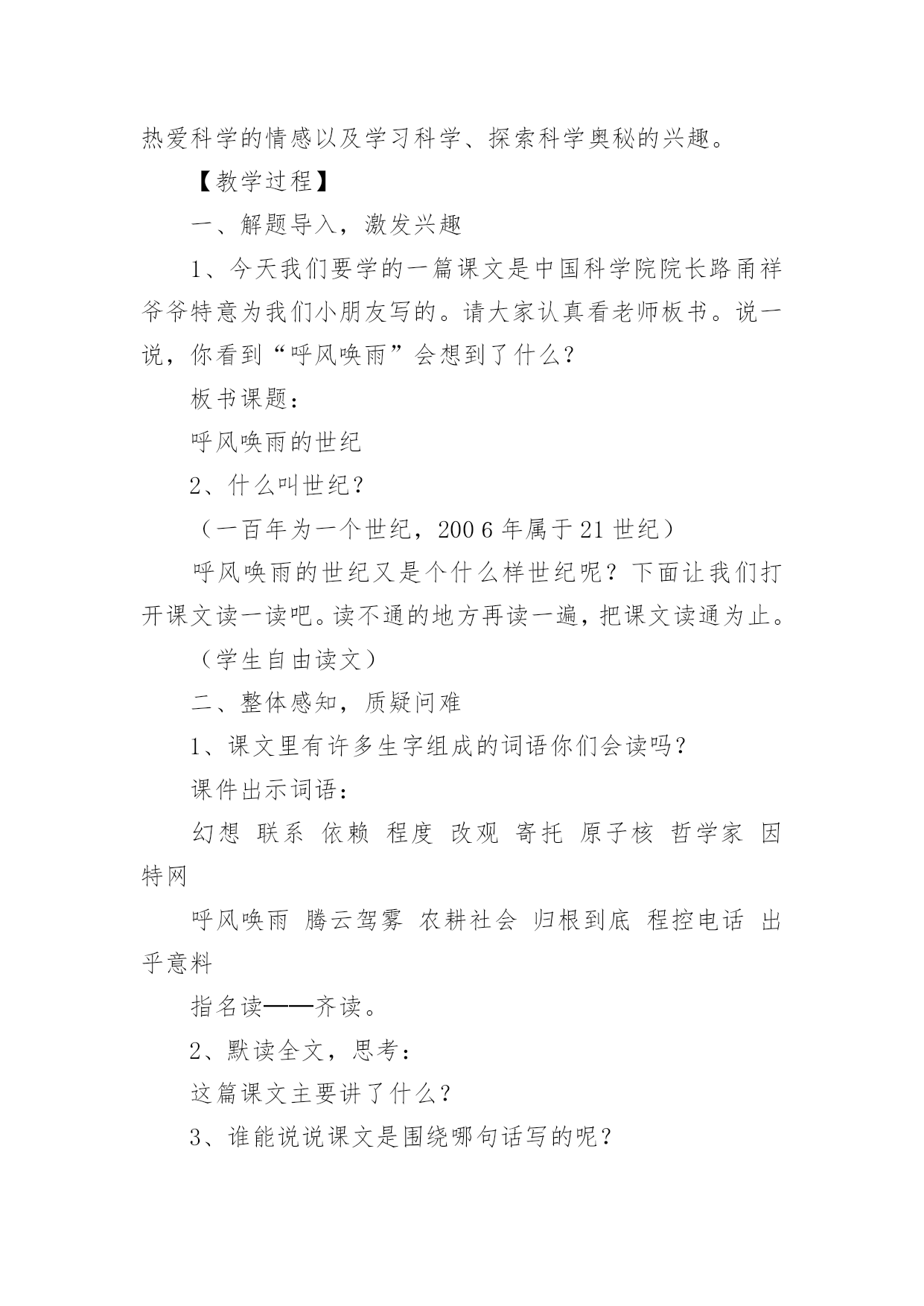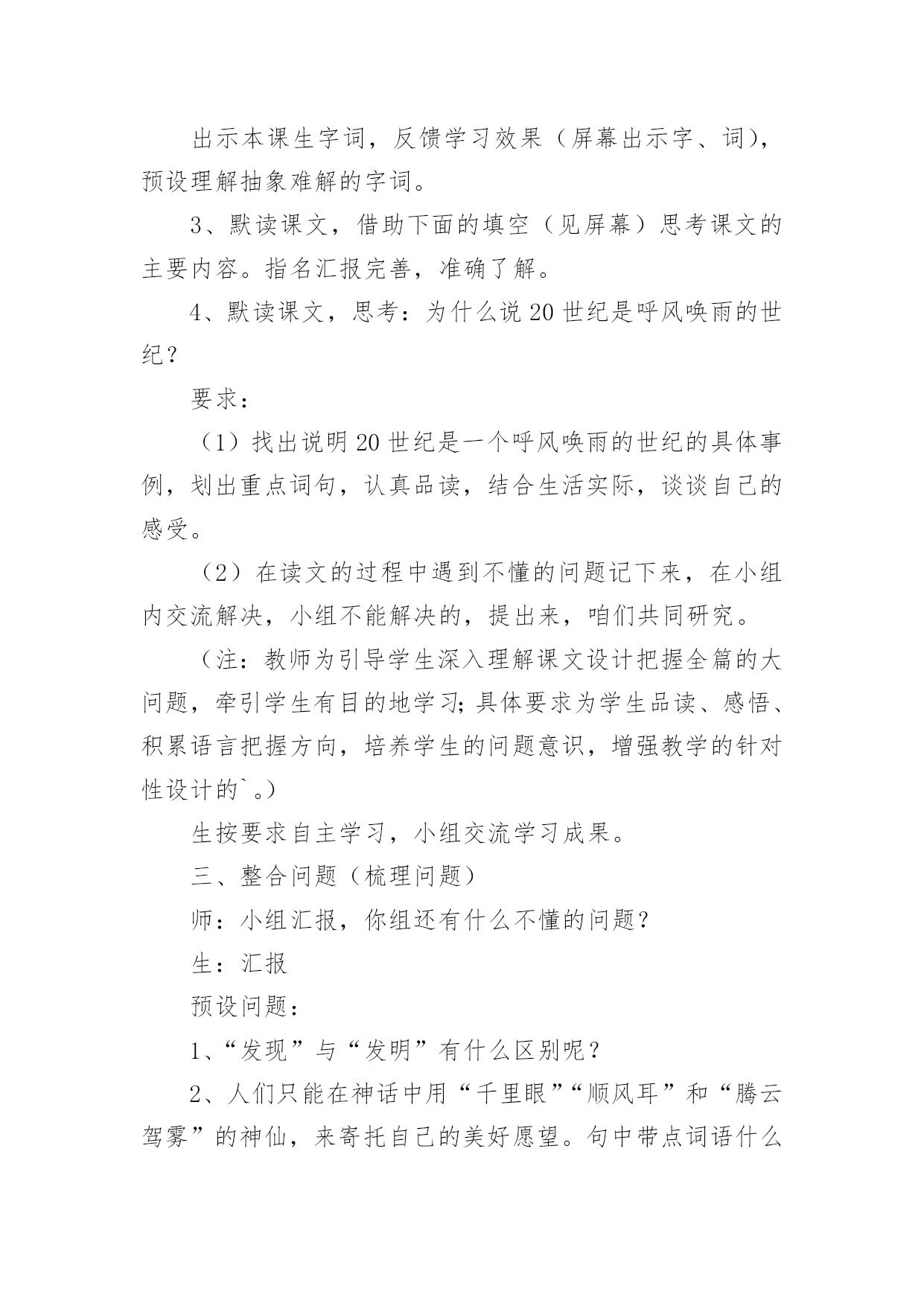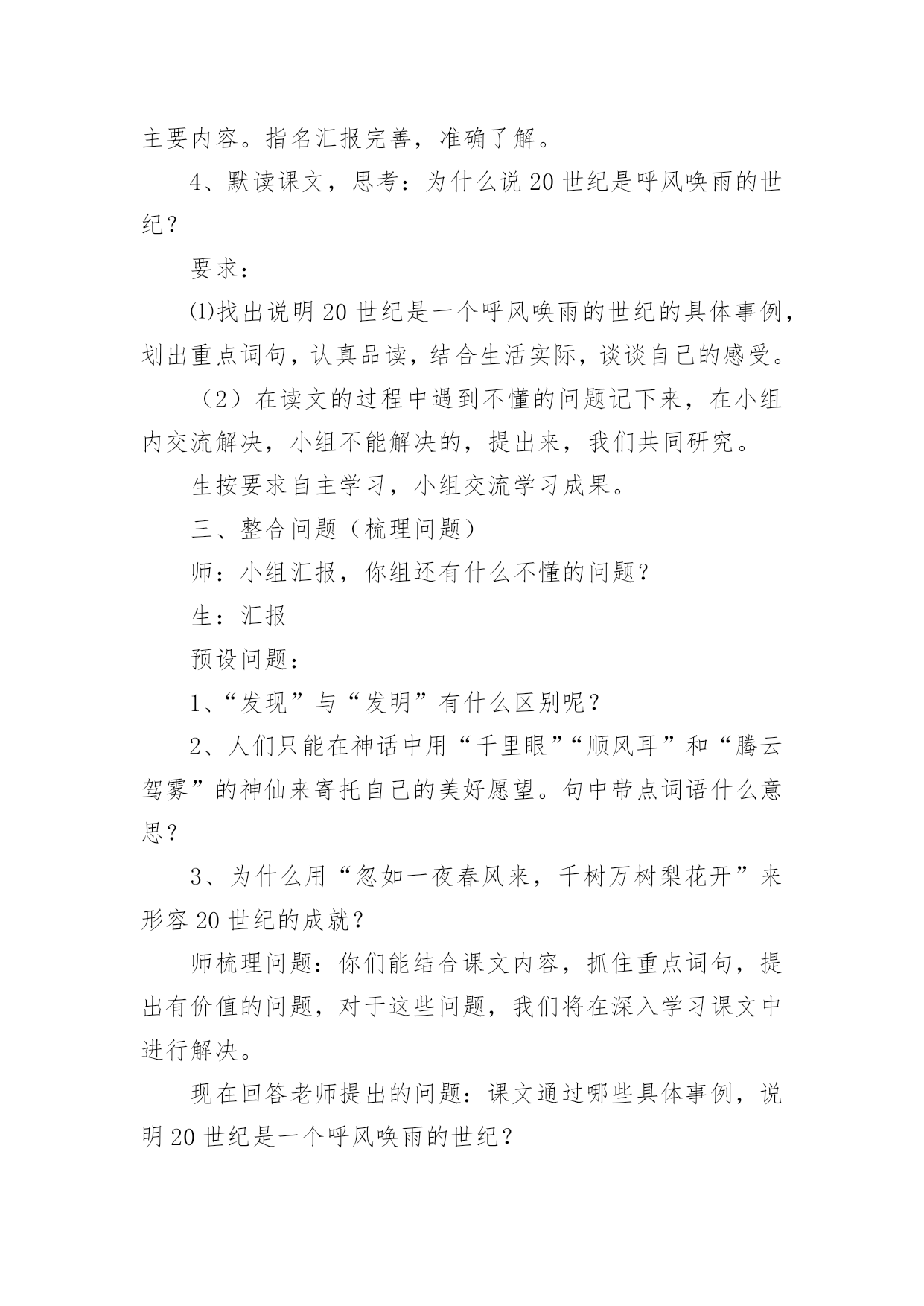 《呼风唤雨的世纪》教学设计《呼风唤雨的世纪》教学设计汇编(12篇)作为一名为他人授业解惑的教育工作者,就有可能用到教学设计,教学设计是一个系统化规划教学系统的过程。优秀的教学设计都具备一些什么特点呢?下面是小编为大家整理的《呼风唤雨的世纪》教学设计,希望对大家有所帮助。《呼风唤雨的世纪》教学设计篇1教学目标:1、认识5个生字,会写12个生字,正确读写“呼风唤雨、出乎意料、改观、程度、依赖、农耕社会、腾云驾雾、寄托、幻想、洞察、原子核、程控电话、因特网、联系、哲学家、归根到底”等词语。2、有感情地朗读课文,体会语言简洁、条理清楚的表达特点,能联系生活实际,谈出自己的阅读感受。3、了解20世纪科学技术给人类带来的巨大变化,激发热爱科学的情感以及学习科学、探索科学奥秘的兴趣。教学重点:了解20世纪科学技术给人类带来的巨大变化。教学难点:理解课文中一些含义深刻的词语和句子。教学课时:2课时教学准备:多媒体课件教学方法:自主学习,合作学习,探究学习第一课时教学过程:一、激趣导入1、师导言,生自读导读,明确单元任务。2、从这节课开始,我们学习第八组,以“科技成就”为专题的课文。首先,学习29课《呼风唤雨的世纪》。板书课题,生齐读课题。3、释题师:看到“呼风唤雨”这个词,你首先想到了谁?生:查词典理解并选择在课题中选哪种解释?汇报。4、汇报搜集资料,介绍作者。二、提出问题1、自主学习,合作学习自学要求:⑴轻声读文,把你不认识的字词划下来,与同桌交流或查字典解决;把课文读通顺。2、检查学习情况出示本课生字词,反馈学习效果(屏幕出示字、词),预设理解抽象难解的字词。3、默读课文,借助下面的填空(见屏幕)思考课文的主要内容。指名汇报完善,准确了解。4、默读课文,思考:为什么说20世纪是呼风唤雨的世纪?要求:⑴找出说明20世纪是一个呼风唤雨的世纪的具体事例,划出重点词句,认真品读,结合生活实际,谈谈自己的感受。(2)在读文的过程中遇到不懂的问题记下来,在小组内交流解决,小组不能解决的,提出来,我们共同研究。生按要求自主学习,小组交流学习成果。三、整合问题(梳理问题)师:小组汇报,你组还有什么不懂的问题?生:汇报预设问题:1、“发现”与“发明”有什么区别呢?2、人们只能在神话中用“千里眼”“顺风耳”和“腾云驾雾”的神仙来寄托自己的美好愿望。句中带点词语什么意思?3、为什么用“忽如一夜春风来,千树万树梨花开”来形容20世纪的成就?师梳理问题:你们能结合课文内容,抓住重点词句,提出有价值的问题,对于这些问题,我们将在深入学习课文中进行解决。现在回答老师提出的问题:课文通过哪些具体事例,说明20世纪是一个呼风唤雨的世纪?四、解决问题1、学习第4自然段。看看这段课文通过哪些具体事例,说明20世纪是一个呼风唤雨的世纪?生:汇报出具体事例。师:请结合有关语句谈谈自己的'理解。师追问:为什么说“日益把人类居住的星球变成联系紧密的‘地球村’”?生:汇报,朗读这段话。师:你能举出20世纪科技成就方面的例子吗?生:汇报,说说感受。师:欣赏一组20世纪科技成就的图片。小结:生活在这样现代化的时代,你的心情如何?有什么感受?表达这种情感,用喜欢的方式介绍现代科技成就。(读四自然段)《呼风唤雨的世纪》教学设计篇2【教学目标】1、认识5个生字,会写12个生字。正确读写“呼风唤雨、出乎意料、改观、程度、依赖、农耕社会、腾云驾雾、寄托、幻想、洞察、原子核、程控电话、因特网、联系、哲学家、归根到底”等词语。2、感情地朗读课文,体会语言简洁、条理清楚的表达特点,能联系生活实际,谈出自己的阅读感受。3、了解20世纪科学技术给人类带来的巨大变化,激发热爱科学的情感以及学习科学、探索科学奥秘的兴趣。【教学过程】一、解题导入,激发兴趣1、今天我们要学的一篇课文是中国科学院院长路甬祥爷爷特意为我们小朋友写的。请大家认真看老师板书。说一说,你看到“呼风唤雨”会想到了什么?板书课题:呼风唤雨的世纪2、什么叫世纪?(一百年为一个世纪,2006年属于21世纪)呼风唤雨的世纪又是个什么样世纪呢?下面让我们打开课文读一读吧。读不通的地方再读一遍,把课文读通为止。(学生自由读文)二、整体感知,质疑问难1、课文里有许多生字组成的词语你们会读吗?课件出示词语:幻想联系依赖程度改观寄托原子核哲学家因特网呼风唤雨腾云驾雾农耕社会归根到底程控电话出乎意料指名读──齐读。2、默读全文,思考:这篇课文主要讲了什么?3、谁能说说课文是围绕哪句话写的呢?出示:20世纪是一个呼风唤雨的世纪。齐读。4、古人说:学贵有疑。所以,要读懂课文,一定要学会提出问题。请大家看课文,你想弄清什么问题?5、看来大家越来越会读书了。那么20世纪是谁来呼风唤雨呢?那么人类又是用什么来呼风唤雨呢?请女同学读课文第二自然段,其他同学想一想你从这一段