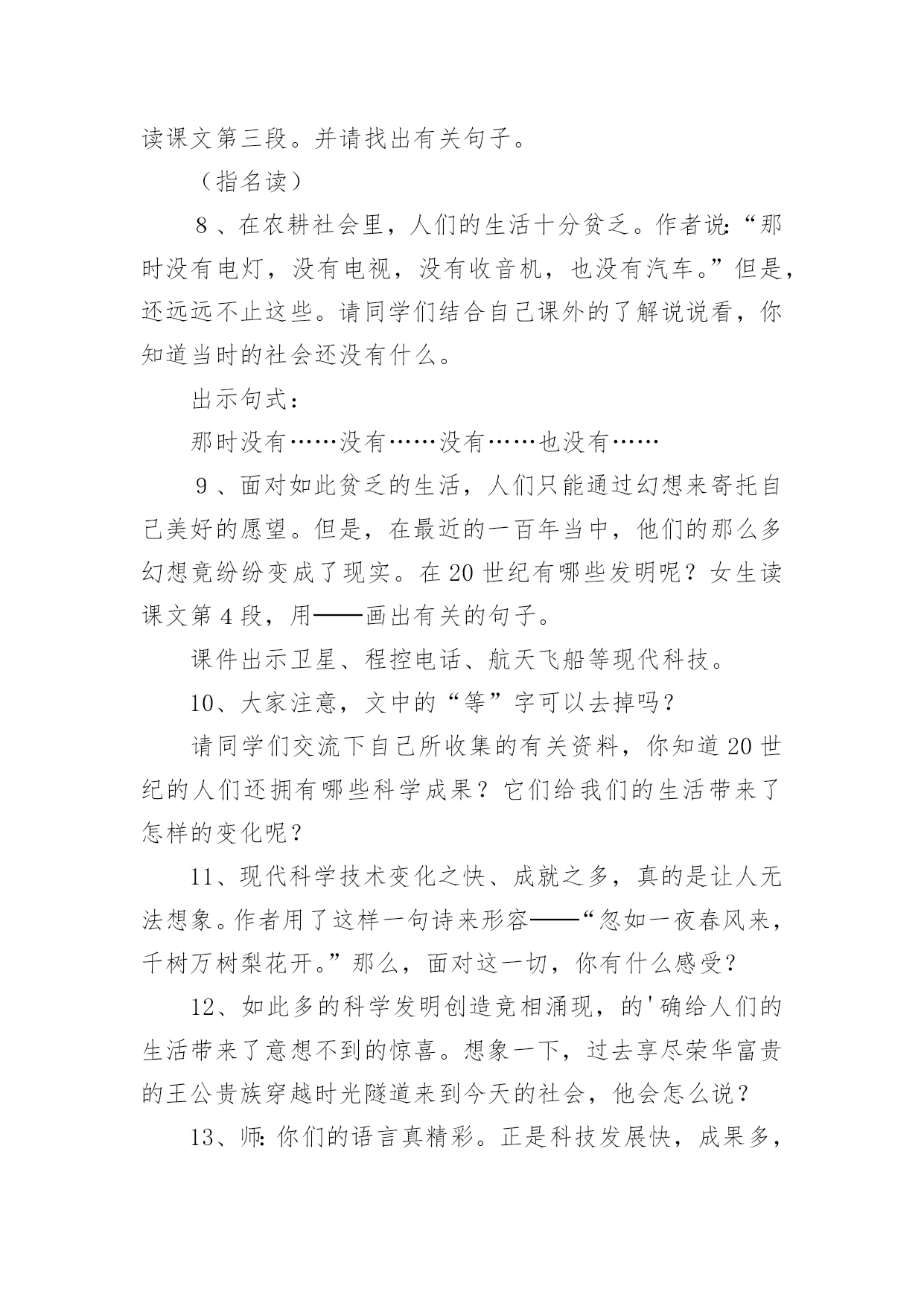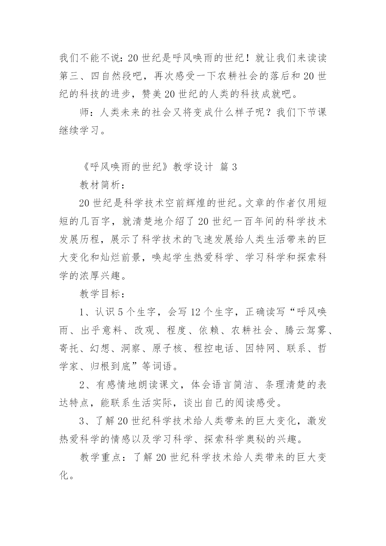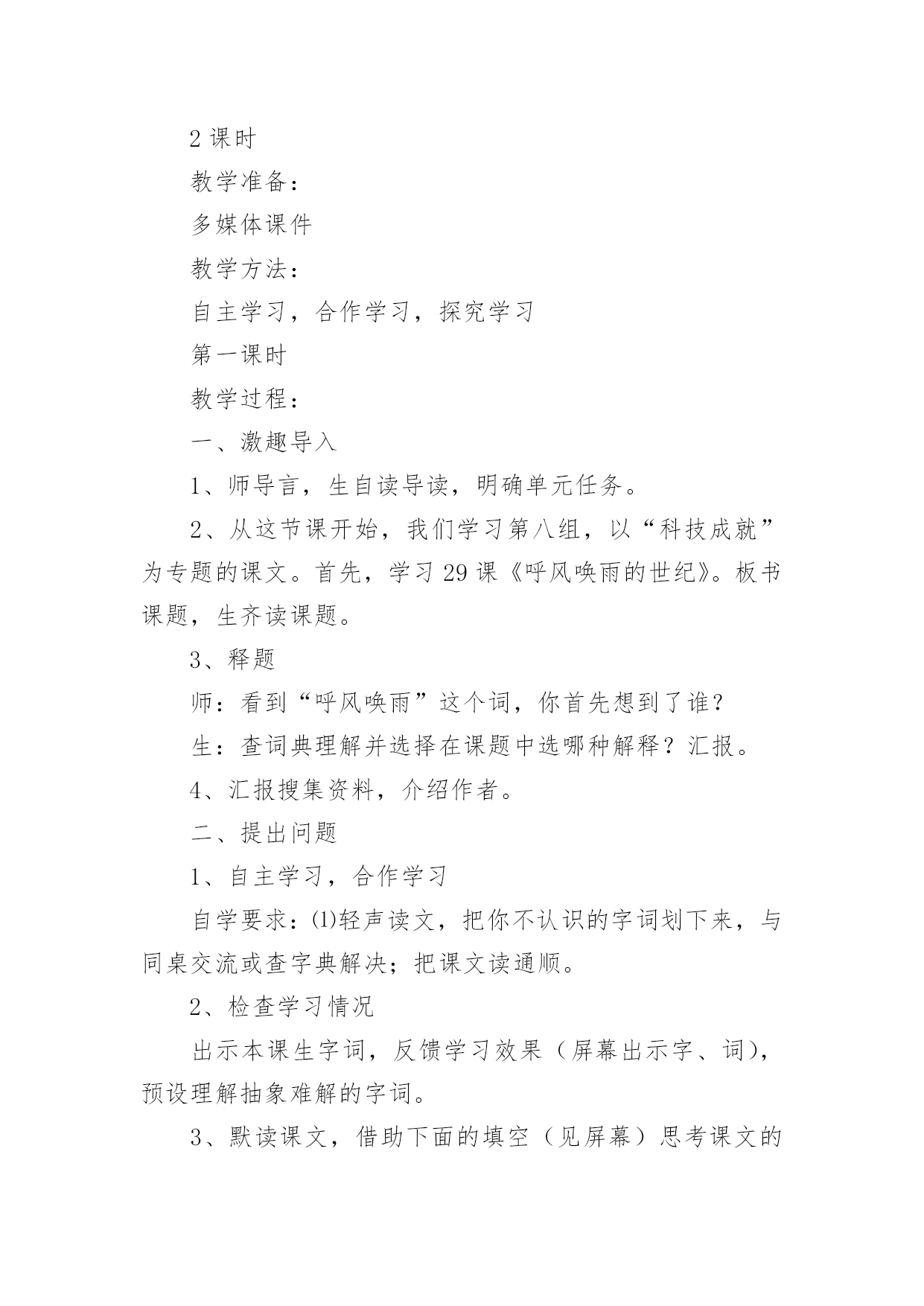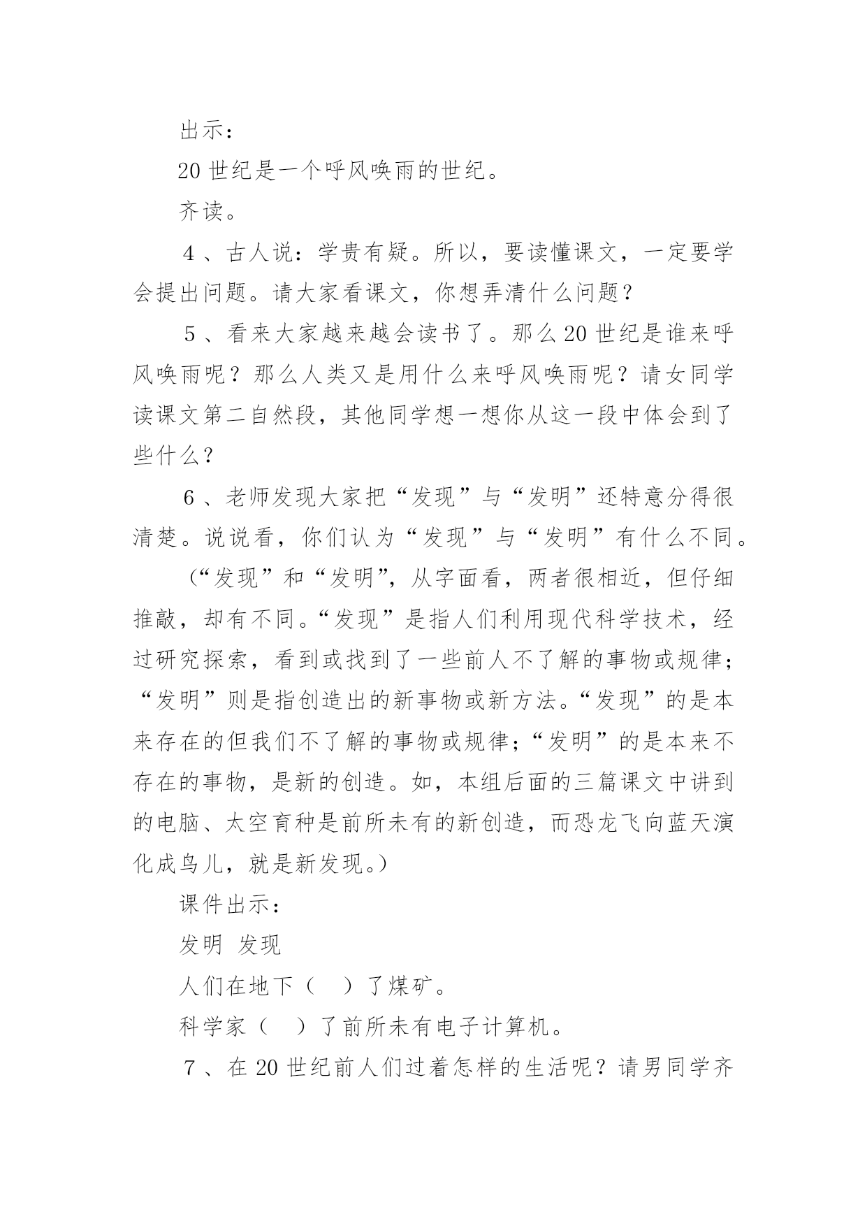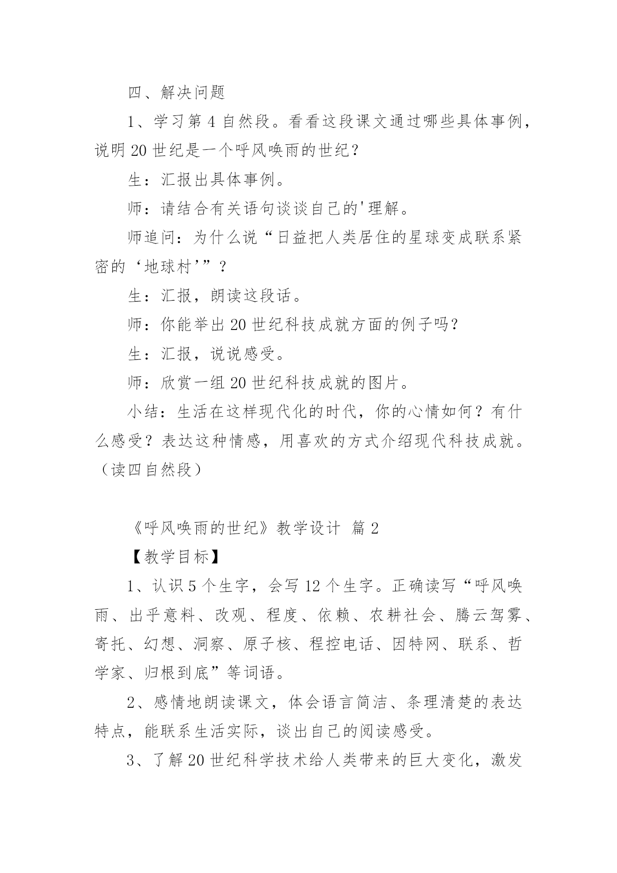 《呼风唤雨的世纪》教学设计《呼风唤雨的世纪》教学设计汇编(12篇)作为一名为他人授业解惑的教育工作者,就有可能用到教学设计,教学设计是一个系统化规划教学系统的过程。优秀的教学设计都具备一些什么特点呢?下面是小编为大家整理的《呼风唤雨的世纪》教学设计,希望对大家有所帮助。《呼风唤雨的世纪》教学设计篇1教学目标:1、认识5个生字,会写12个生字,正确读写“呼风唤雨、出乎意料、改观、程度、依赖、农耕社会、腾云驾雾、寄托、幻想、洞察、原子核、程控电话、因特网、联系、哲学家、归根到底”等词语。2、有感情地朗读课文,体会语言简洁、条理清楚的表达特点,能联系生活实际,谈出自己的阅读感受。3、了解20世纪科学技术给人类带来的巨大变化,激发热爱科学的情感以及学习科学、探索科学奥秘的兴趣。教学重点:了解20世纪科学技术给人类带来的巨大变化。教学难点:理解课文中一些含义深刻的词语和句子。教学课时:2课时教学准备:多媒体课件教学方法:自主学习,合作学习,探究学习第一课时教学过程:一、激趣导入1、师导言,生自读导读,明确单元任务。2、从这节课开始,我们学习第八组,以“科技成就”为专题的课文。首先,学习29课《呼风唤雨的世纪》。板书课题,生齐读课题。3、释题师:看到“呼风唤雨”这个词,你首先想到了谁?生:查词典理解并选择在课题中选哪种解释?汇报。4、汇报搜集资料,介绍作者。二、提出问题1、自主学习,合作学习自学要求:⑴轻声读文,把你不认识的字词划下来,与同桌交流或查字典解决;把课文读通顺。2、检查学习情况出示本课生字词,反馈学习效果(屏幕出示字、词),预设理解抽象难解的字词。3、默读课文,借助下面的填空(见屏幕)思考课文的主要内容。指名汇报完善,准确了解。4、默读课文,思考:为什么说20世纪是呼风唤雨的世纪?要求:⑴找出说明20世纪是一个呼风唤雨的世纪的具体事例,划出重点词句,认真品读,结合生活实际,谈谈自己的感受。(2)在读文的过程中遇到不懂的问题记下来,在小组内交流解决,小组不能解决的,提出来,我们共同研究。生按要求自主学习,小组交流学习成果。三、整合问题(梳理问题)师:小组汇报,你组还有什么不懂的问题?生:汇报预设问题:1、“发现”与“发明”有什么区别呢?2、人们只能在神话中用“千里眼”“顺风耳”和“腾云驾雾”的神仙来寄托自己的美好愿望。句中带点词语什么意思?3、为什么用“忽如一夜春风来,千树万树梨花开”来形容20世纪的成就?师梳理问题:你们能结合课文内容,抓住重点词句,提出有价值的问题,对于这些问题,我们将在深入学习课文中进行解决。现在回答老师提出的问题:课文通过哪些具体事例,说明20世纪是一个呼风唤雨的世纪?四、解决问题1、学习第4自然段。看看这段课文通过哪些具体事例,说明20世纪是一个呼风唤雨的世纪?生:汇报出具体事例。师:请结合有关语句谈谈自己的'理解。师追问:为什么说“日益把人类居住的星球变成联系紧密的‘地球村’”?生:汇报,朗读这段话。师:你能举出20世纪科技成就方面的例子吗?生:汇报,说说感受。师:欣赏一组20世纪科技成就的图片。小结:生活在这样现代化的时代,你的心情如何?有什么感受?表达这种情感,用喜欢的方式介绍现代科技成就。(读四自然段)《呼风唤雨的世纪》教学设计篇2【教学目标】1、认识5个生字,会写12个生字。正确读写“呼风唤雨、出乎意料、改观、程度、依赖、农耕社会、腾云驾雾、寄托、幻想、洞察、原子核、程控电话、因特网、联系、哲学家、归根到底”等词语。2、感情地朗读课文,体会语言简洁、条理清楚的表达特点,能联系生活实际,谈出自己的阅读感受。3、了解20世纪科学技术给人类带来的巨大变化,激发热爱科学的情感以及学习科学、探索科学奥秘的兴趣。【教学过程】一、解题导入,激发兴趣1、今天我们要学的一篇课文是中国科学院院长路甬祥爷爷特意为我们小朋友写的。请大家认真看老师板书。说一说,你看到“呼风唤雨”会想到了什么?板书课题:呼风唤雨的世纪2、什么叫世纪?(一百年为一个世纪,2006年属于21世纪)呼风唤雨的世纪又是个什么样世纪呢?下面让我们打开课文读一读吧。读不通的地方再读一遍,把课文读通为止。(学生自由读文)二、整体感知,质疑问难1、课文里有许多生字组成的词语你们会读吗?课件出示词语:幻想联系依赖程度改观寄托原子核哲学家因特网呼风唤雨腾云驾雾农耕社会归根到底程控电话出乎意料指名读──齐读。2、默读全文,思考:这篇课文主要讲了什么?3、谁能说说课文是围绕哪句话写的呢?出示:20世纪是一个呼风唤雨的世纪。齐读。4、古人说:学贵有疑。所以,要读懂课文,一定要学会提出问题。请大家看课文,你想弄清什么问题?5、看来大家越来越会读书了。那么20世纪是谁来呼风唤雨呢?那么人类又是用什么来呼风唤雨呢?请女同学读课文第二自然段,其他同学想一想你从这一段