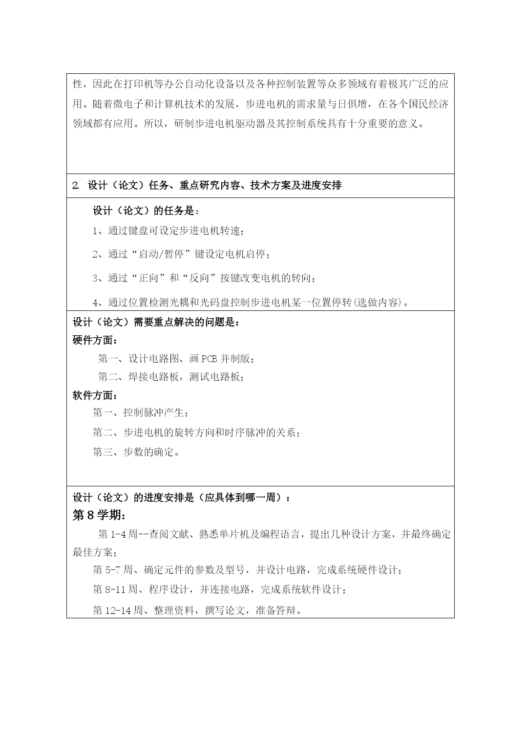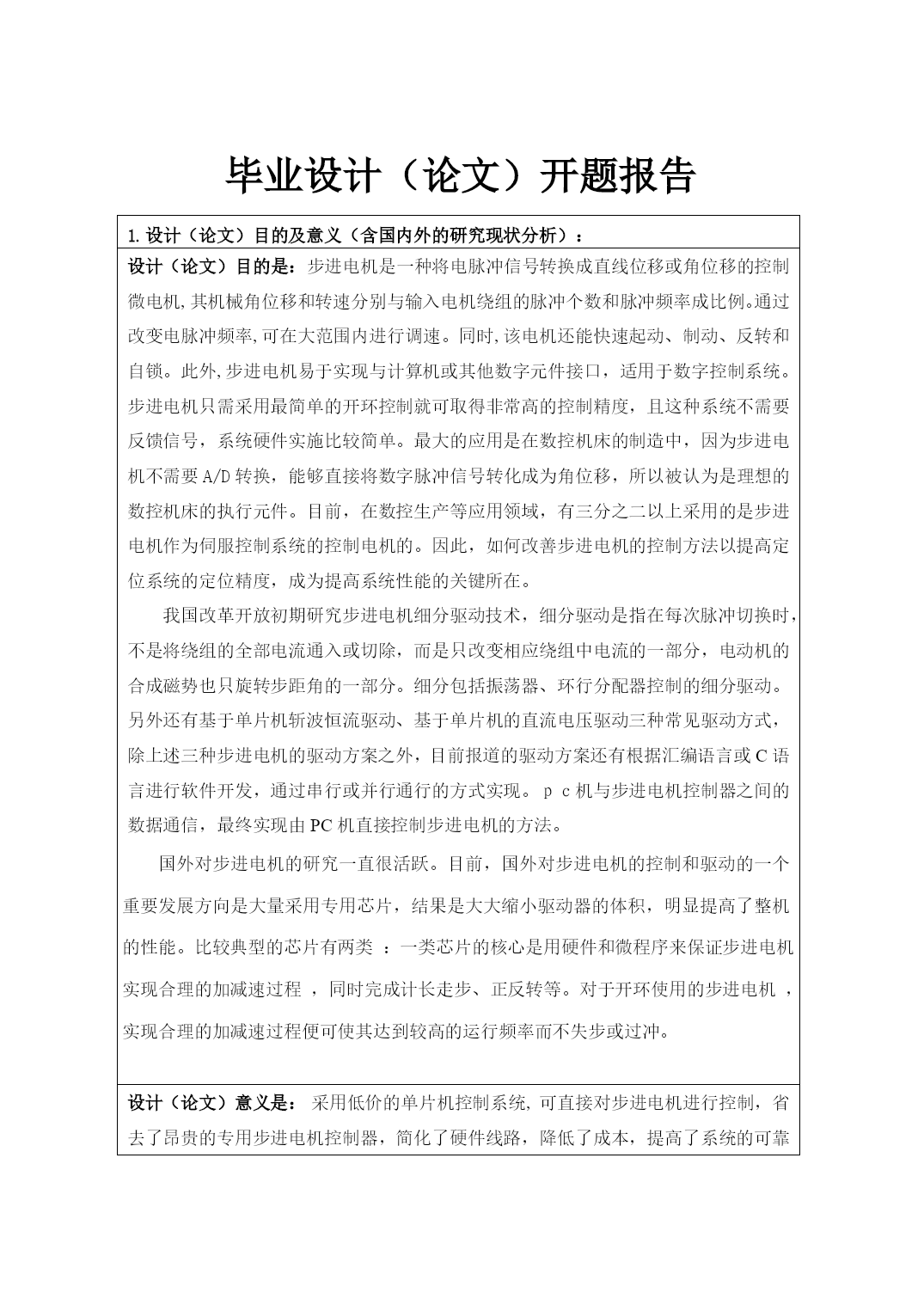 大连理工大学毕业设计(论文)开题报告题目名称:基于单片机的步进电机控制学院(系):电子与自动化学院专业:自动化班级:1005学生姓名:*******同组人:指导教师:*********毕业设计(论文)开题报告1.设计(论文)目的及意义(含国内外的研究现状分析):设计(论文)目的是:步进电机是一种将电脉冲信号转换成直线位移或角位移的控制微电机,其机械角位移和转速分别与输入电机绕组的脉冲个数和脉冲频率成比例。通过改变电脉冲频率,可在大范围内进行调速。同时,该电机还能快速起动、制动、反转和自锁。此外,步进电机易于实现与计算机或其他数字元件接口,适用于数字控制系统。步进电机只需采用最简单的开环控制就可取得非常高的控制精度,且这种系统不需要反馈信号,系统硬件实施比较简单。最大的应用是在数控机床的制造中,因为步进电机不需要A/D转换,能够直接将数字脉冲信号转化成为角位移,所以被认为是理想的数控机床的执行元件。目前,在数控生产等应用领域,有三分之二以上采用的是步进电机作为伺服控制系统的控制电机的。因此,如何改善步进电机的控制方法以提高定位系统的定位精度,成为提高系统性能的关键所在。我国改革开放初期研究步进电机细分驱动技术,细分驱动是指在每次脉冲切换时,不是将绕组的全部电流通入或切除,而是只改变相应绕组中电流的一部分,电动机的合成磁势也只旋转步距角的一部分。细分包括振荡器、环行分配器控制的细分驱动。另外还有基于单片机斩波恒流驱动、基于单片机的直流电压驱动三种常见驱动方式,除上述三种步进电机的驱动方案之外,目前报道的驱动方案还有根据汇编语言或C语言进行软件开发,通过串行或并行通行的方式实现。pc机与步进电机控制器之间的数据通信,最终实现由PC机直接控制步进电机的方法。国外对步进电机的研究一直很活跃。目前,国外对步进电机的控制和驱动的一个重要发展方向是大量采用专用芯片,结果是大大缩小驱动器的体积,明显提高了整机的性能。比较典型的芯片有两类:一类芯片的核心是用硬件和微程序来保证步进电机实现合理的加减速过程,同时完成计长走步、正反转等。对于开环使用的步进电机,实现合理的加减速过程便可使其达到较高的运行频率而不失步或过冲。设计(论文)意义是:采用低价的单片机控制系统,可直接对步进电机进行控制,省去了昂贵的专用步进电机控制器,简化了硬件线路,降低了成本,提高了系统的可靠性,因此在打印机等办公自动化设备以及各种控制装置等众多领域有着极其广泛的应用。随着微电子和计算机技术的发展,步进电机的需求量与日俱增,在各个国民经济领域都有应用。所以,研制步进电机驱动器及其控制系统具有十分重要的意义。2.设计(论文)任务、重点研究内容、技术方案及进度安排设计(论文)的任务是:1、通过键盘可设定步进电机转速;2、通过“启动/暂停”键设定电机启停;3、通过“正向”和“反向”按键改变电机的转向;4、通过位置检测光耦和光码盘控制步进电机某一位置停转(选做内容)。设计(论文)需要重点解决的问题是:硬件方面:第一、设计电路图、画PCB并制版;第二、焊接电路板,测试电路板;软件方面:第一、控制脉冲产生;第二、步进电机的旋转方向和时序脉冲的关系;第三、步数的确定。设计(论文)的进度安排是(应具体到哪一周):第8学期:第1-4周--查阅文献、熟悉单片机及编程语言,提出几种设计方案,并最终确定最佳方案;第5-7周、确定元件的参数及型号,并设计电路,完成系统硬件设计;第8-11周、程序设计,并连接电路,完成系统软件设计;第12-14周、整理资料,撰写论文,准备答辩。报告人签字:罗云生2014年3月10日3.指导教师意见:结论:指导教师签字:年月日