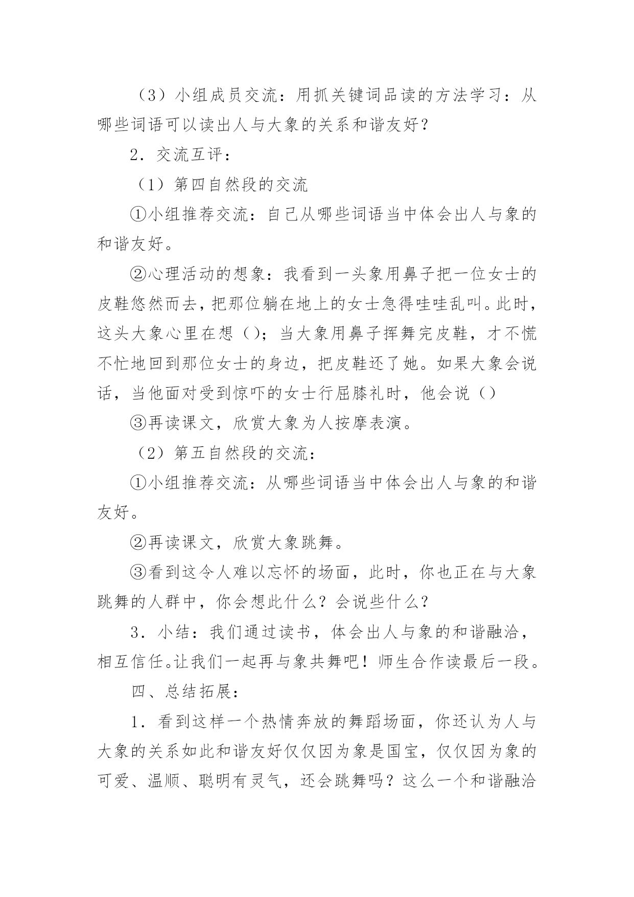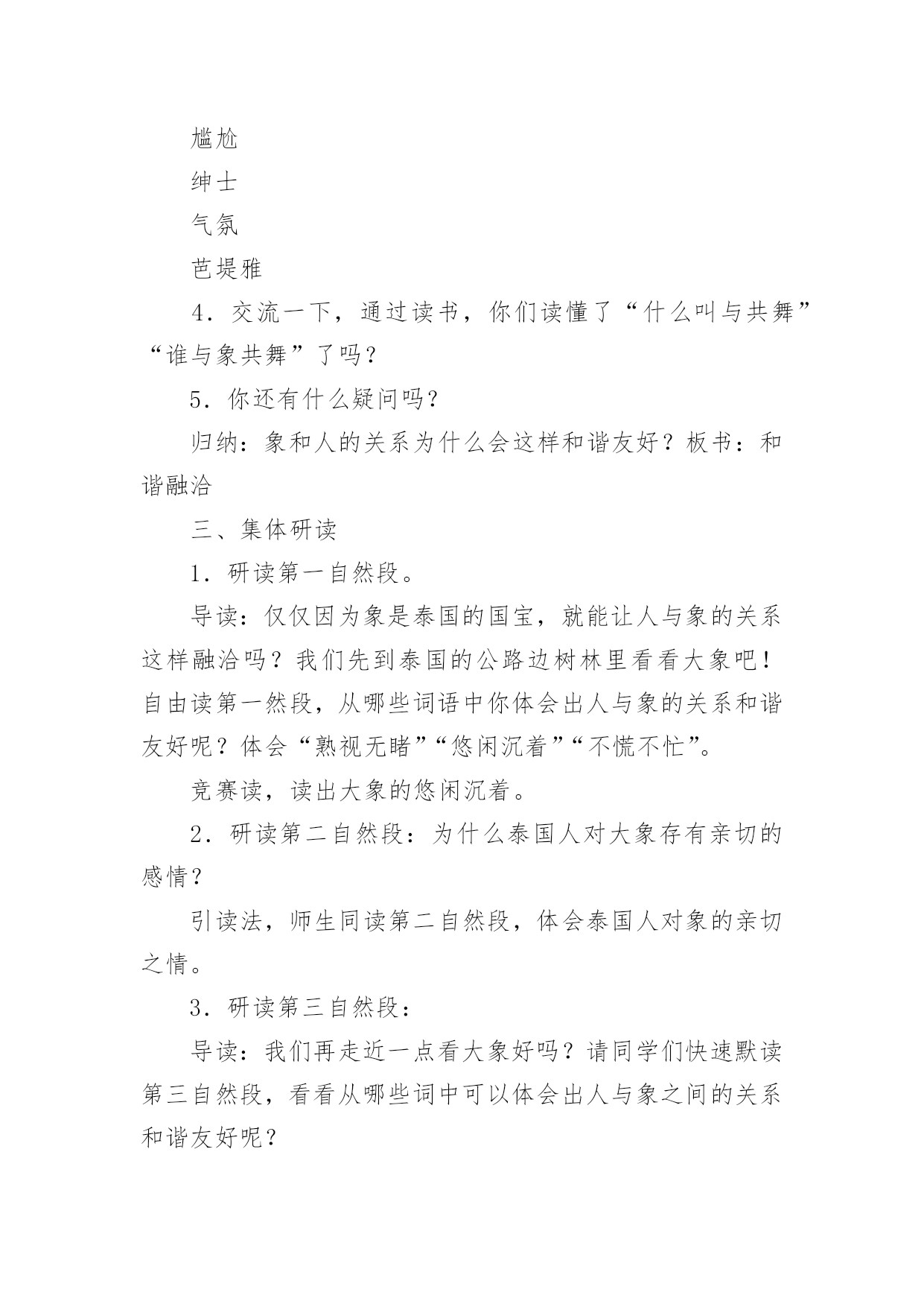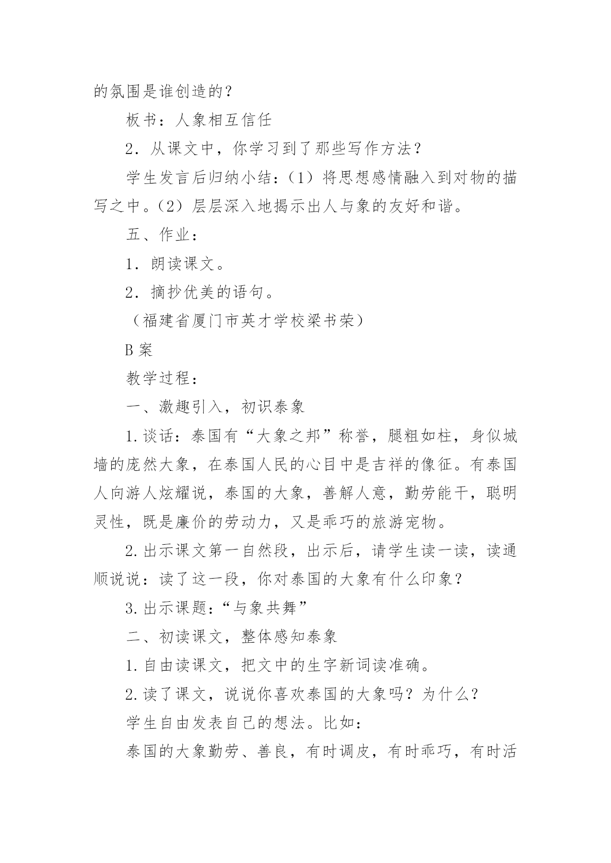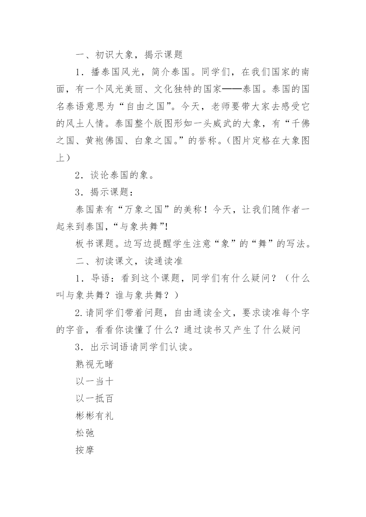 与象共舞教学设计在教学工作者实际的教学活动中,通常需要用到教学设计来辅助教学,借助教学设计可以让教学工作更加有效地进行。我们该怎么去写教学设计呢?以下是小编收集整理的与象共舞教学设计,欢迎大家借鉴与参考,希望对大家有所帮助。与象共舞教学设计1一、教学目标1、认识八个生字,读读记记“悠闲、松弛、尴尬”等词语。2、了解泰国的独特风情文化,感受人与动物和谐相处的美好。3、有感情地朗读课文,体会人与动物和谐相处的境界。4、领悟课文的表达方法。二、教学重点:了解人与大象的亲密关系。三、教学难点:比较本文与《威尼斯的小艇》在写法上的异同。四、课前预习1、自学课文,尝试理解。2、搜集有关泰国、大象表演的有关资料。五、课时划分:一课时六、教具准备:小黑板七、教学过程(一)谈论泰国,导入新课。1、板书课题、读题。2、引导学生汇报课前搜集的资料,谈论泰国的象。3、教师补充。(二)初读课文,整体感知。1、自由读课文,读准字音。2、字词质疑,讨论交流。3、畅谈体会(主要谈对大象的印象)。(三)抓住重点,理解课文。1、让学生根据阅读提示提问题,教师引导抓住问题:(1)在泰国,人与象的关系是怎样的?课文怎样具体写?(2)课文和《威尼斯的小艇》在写法上有什么异同?2、讨论交流第一个问题。(1)默读、讨论、交流,教师巡视。(2)汇报、总结。3、讨论交流第二个问题。(1)讨论、交流,教师巡视。(2)汇报、总结。4、找出自己喜欢的段落有感情地朗读。(1)学生自由读。(2)教师指名读、注意表扬鼓励。(四)小练笔。学习本课总分段式写一物或一处景物。(1)学生写。(2)交流。(五)作业:有感情地朗读课文。板书设计:27与象共舞人和谐亲密象与象共舞教学设计2学习目标1.有感情地朗读课文,感受泰国人与大象和谐相处的境界。2.认读课文8个生字,能联系上下文理解重点词的意思。课前准备搜集有关泰国、大象表演节目、人与动物和谐相处的文字、图像资料,做成课件。课时安排1课时A案教学过程一、初识大象,揭示课题1.播泰国风光,简介泰国。同学们,在我们国家的南面,有一个风光美丽、文化独特的国家──泰国。泰国的国名泰语意思为“自由之国”。今天,老师要带大家去感受它的风土人情。泰国整个版图形如一头威武的大象,有“千佛之国、黄袍佛国、白象之国。”的誉称。(图片定格在大象图上)2.谈论泰国的象。3.揭示课题:泰国素有“万象之国”的美称!今天,让我们随作者一起来到泰国,“与象共舞”!板书课题。边写边提醒学生注意“象”的“舞”的写法。二、初读课文,读通读准1.导语:看到这个课题,同学们有什么疑问?(什么叫与象共舞?谁与象共舞?)2.请同学们带着问题,自由通读全文,要求读准每个字的字音,看看你读懂了什么?通过读书又产生了什么疑问3.出示词语请同学们认读。熟视无睹以一当十以一抵百彬彬有礼松弛按摩尴尬绅士气氛芭堤雅4.交流一下,通过读书,你们读懂了“什么叫与共舞”“谁与象共舞”了吗?5.你还有什么疑问吗?归纳:象和人的关系为什么会这样和谐友好?板书:和谐融洽三、集体研读1.研读第一自然段。导读:仅仅因为象是泰国的国宝,就能让人与象的关系这样融洽吗?我们先到泰国的公路边树林里看看大象吧!自由读第一然段,从哪些词语中你体会出人与象的关系和谐友好呢?体会“熟视无睹”“悠闲沉着”“不慌不忙”。竞赛读,读出大象的悠闲沉着。2.研读第二自然段:为什么泰国人对大象存有亲切的感情?引读法,师生同读第二自然段,体会泰国人对象的亲切之情。3.研读第三自然段:导读:我们再走近一点看大象好吗?请同学们快速默读第三自然段,看看从哪些词中可以体会出人与象之间的关系和谐友好呢?理解“拍”“喷”“平静坦然”“松弛”“晶莹温和”。利用换词法来体会“拍”与“喷”的用词精当。竞赛读,读出与大象靠得很近,读出紧张的心情松弛下来的感觉。4.学法小结:读书,不但要从字面上理解,还要联系上下文深入体会,字里行间间包含着作者的思想感情,作者表面写大象的可爱温顺,实际上是在赞美人与大象之间的和谐融洽。我们刚才体会人与象的关系和谐友好,用的什么方法来学的?──抓关键词品读。5.过渡:你们想不想自己去看看大象表演呀?接下来就请同学们按照各组所拿到的学习单,选自己感兴趣的一段进行合作学习吧!四、合作研读:1.出示第四、五自然段的学习单,学生合作学习。第四自然段的合作学习单:(1)小组成员齐读第四自然段一遍。(2)个人学习:为人按摩的大象是什么样子的?用“______”画出描写大象为人按摩时的句子,读一读。(3)小组成员交流:用抓关键词品读的方法学习:从哪些词语可以读出人与大象的关系和谐友好?第五自然段的合作学习单:(1)小组成员齐读第五自然段一遍。(2)个人学习:舞蹈的大象是什么样子的?用“______”画出描写大象跳舞的句子,读一读。(3)小组成员交流: