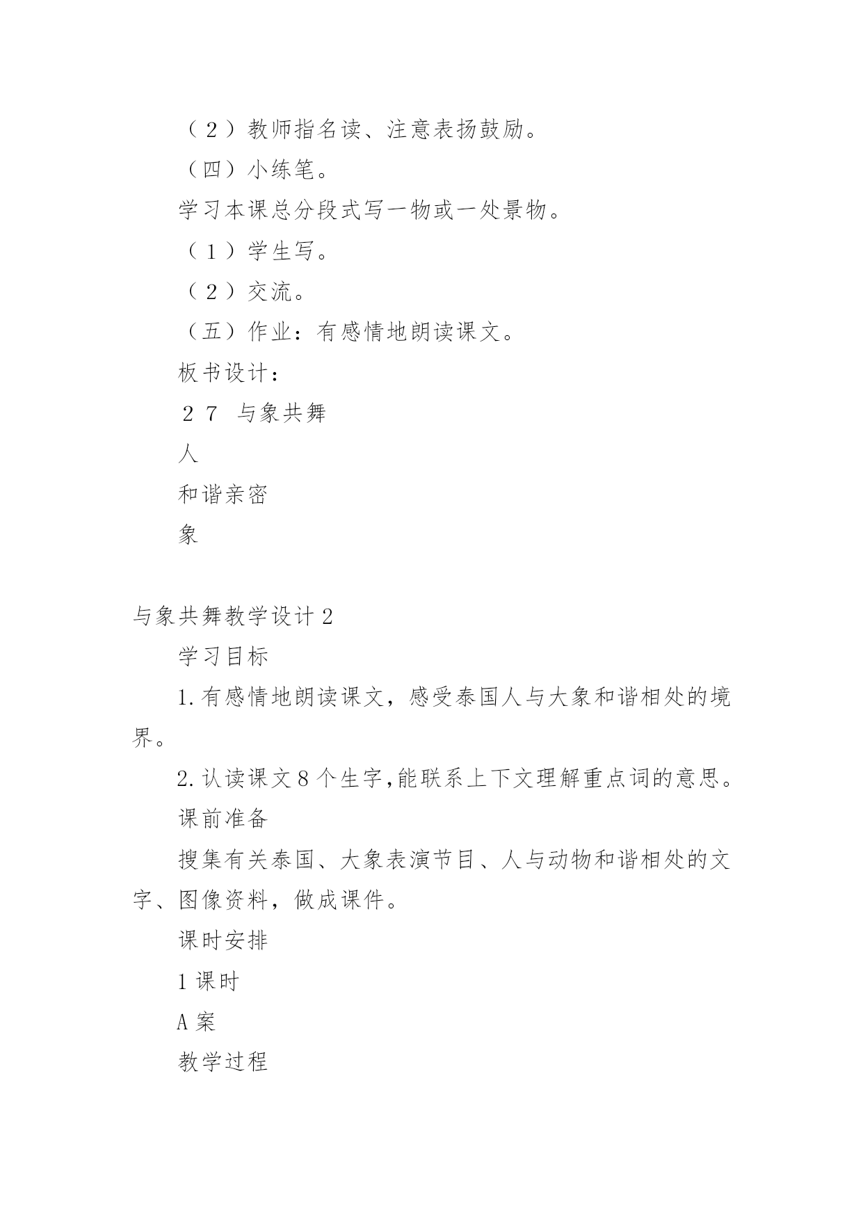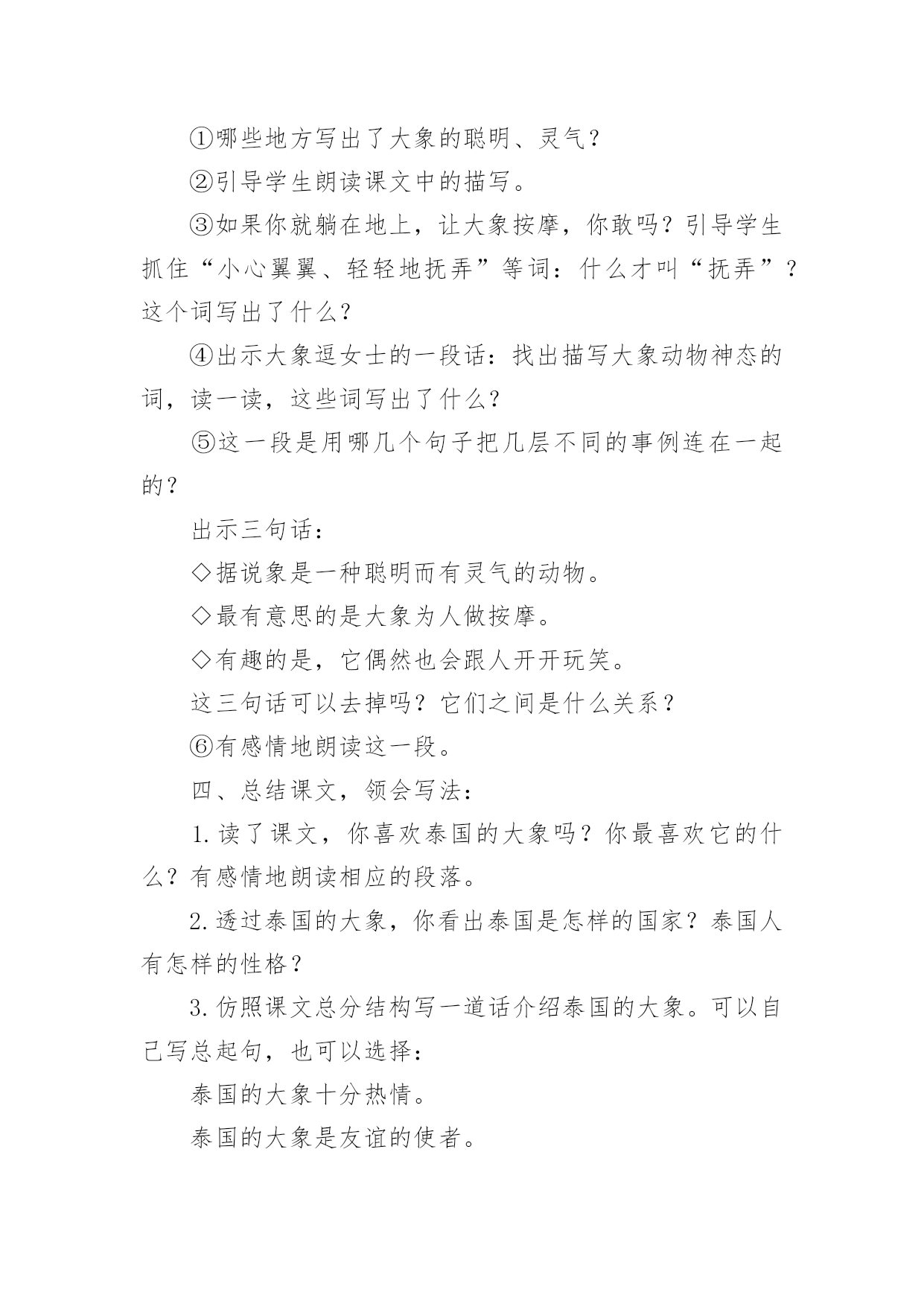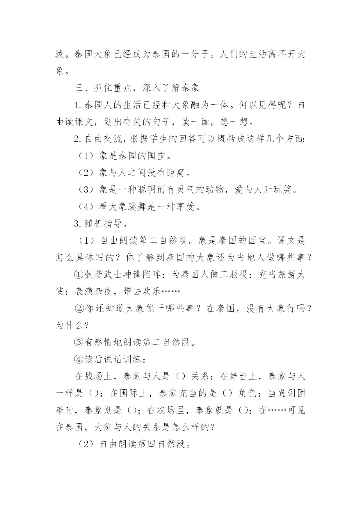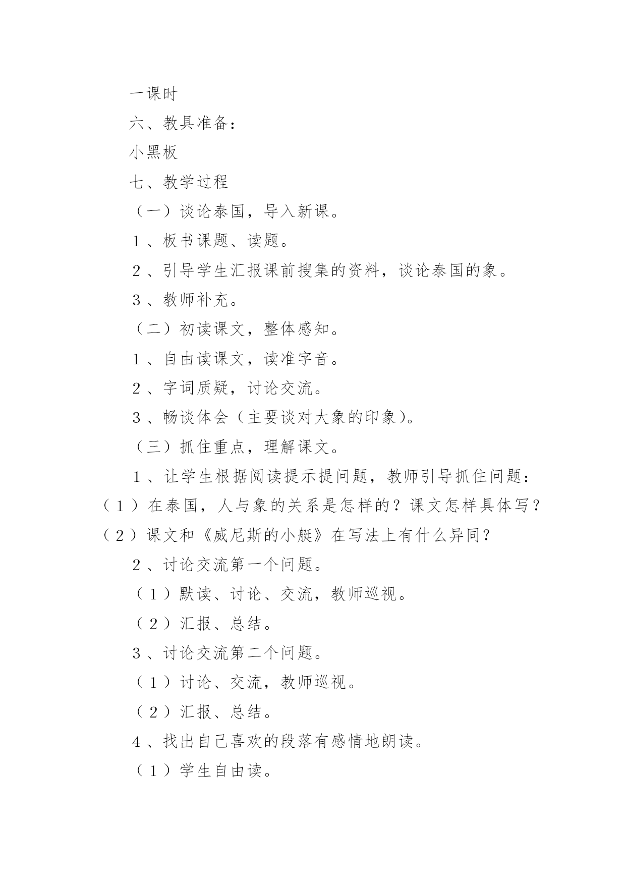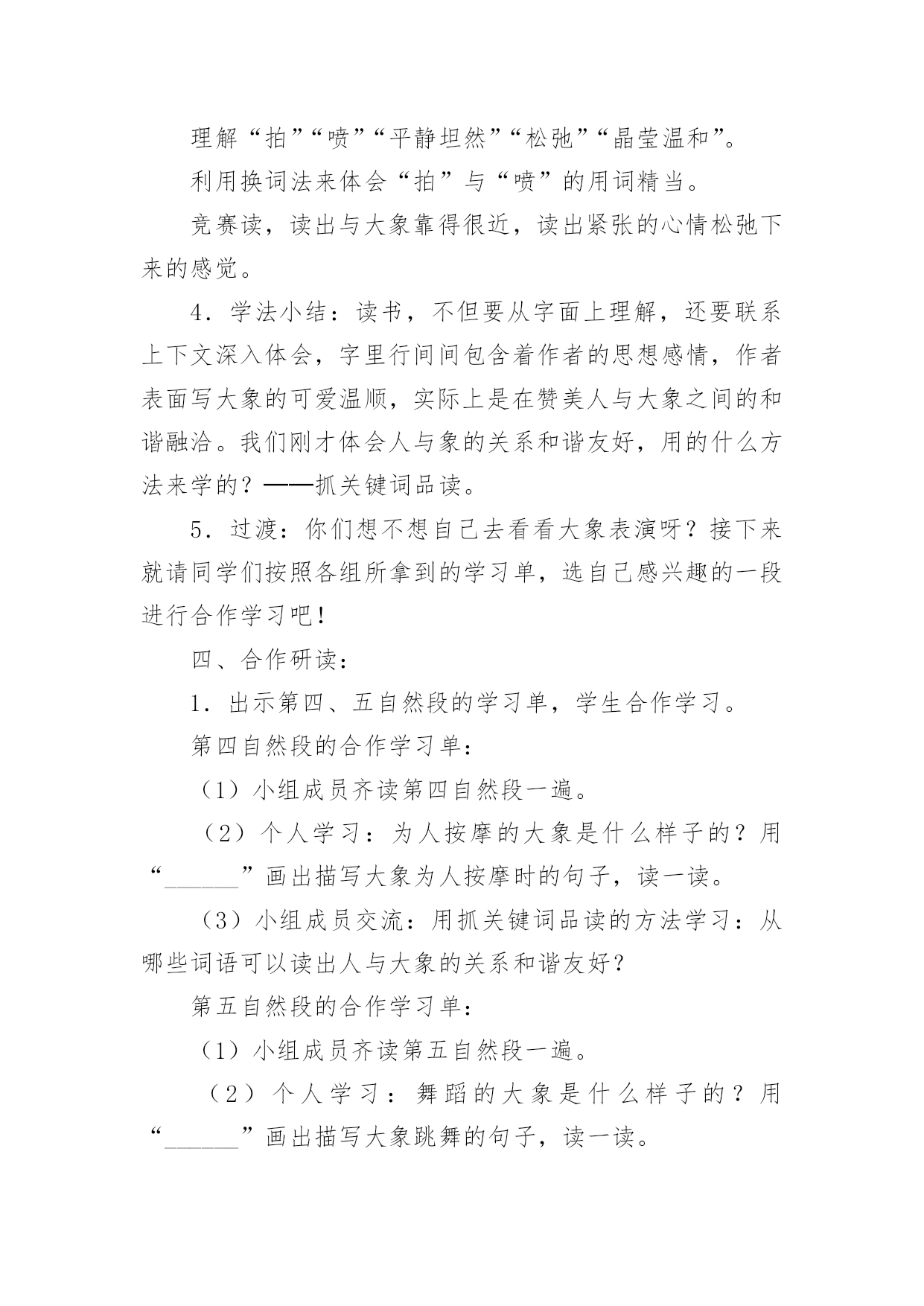 与象共舞教学设计在教学工作者实际的教学活动中,通常需要用到教学设计来辅助教学,借助教学设计可以让教学工作更加有效地进行。我们该怎么去写教学设计呢?以下是小编收集整理的与象共舞教学设计,欢迎大家借鉴与参考,希望对大家有所帮助。与象共舞教学设计1一、教学目标1、认识八个生字,读读记记“悠闲、松弛、尴尬”等词语。2、了解泰国的独特风情文化,感受人与动物和谐相处的美好。3、有感情地朗读课文,体会人与动物和谐相处的境界。4、领悟课文的表达方法。二、教学重点:了解人与大象的亲密关系。三、教学难点:比较本文与《威尼斯的小艇》在写法上的异同。四、课前预习1、自学课文,尝试理解。2、搜集有关泰国、大象表演的有关资料。五、课时划分:一课时六、教具准备:小黑板七、教学过程(一)谈论泰国,导入新课。1、板书课题、读题。2、引导学生汇报课前搜集的资料,谈论泰国的象。3、教师补充。(二)初读课文,整体感知。1、自由读课文,读准字音。2、字词质疑,讨论交流。3、畅谈体会(主要谈对大象的印象)。(三)抓住重点,理解课文。1、让学生根据阅读提示提问题,教师引导抓住问题:(1)在泰国,人与象的关系是怎样的?课文怎样具体写?(2)课文和《威尼斯的小艇》在写法上有什么异同?2、讨论交流第一个问题。(1)默读、讨论、交流,教师巡视。(2)汇报、总结。3、讨论交流第二个问题。(1)讨论、交流,教师巡视。(2)汇报、总结。4、找出自己喜欢的段落有感情地朗读。(1)学生自由读。(2)教师指名读、注意表扬鼓励。(四)小练笔。学习本课总分段式写一物或一处景物。(1)学生写。(2)交流。(五)作业:有感情地朗读课文。板书设计:27与象共舞人和谐亲密象与象共舞教学设计2学习目标1.有感情地朗读课文,感受泰国人与大象和谐相处的境界。2.认读课文8个生字,能联系上下文理解重点词的意思。课前准备搜集有关泰国、大象表演节目、人与动物和谐相处的文字、图像资料,做成课件。课时安排1课时A案教学过程一、初识大象,揭示课题1.播泰国风光,简介泰国。同学们,在我们国家的南面,有一个风光美丽、文化独特的国家──泰国。泰国的国名泰语意思为“自由之国”。今天,老师要带大家去感受它的风土人情。泰国整个版图形如一头威武的大象,有“千佛之国、黄袍佛国、白象之国。”的誉称。(图片定格在大象图上)2.谈论泰国的象。3.揭示课题:泰国素有“万象之国”的美称!今天,让我们随作者一起来到泰国,“与象共舞”!板书课题。边写边提醒学生注意“象”的“舞”的写法。二、初读课文,读通读准1.导语:看到这个课题,同学们有什么疑问?(什么叫与象共舞?谁与象共舞?)2.请同学们带着问题,自由通读全文,要求读准每个字的字音,看看你读懂了什么?通过读书又产生了什么疑问3.出示词语请同学们认读。熟视无睹以一当十以一抵百彬彬有礼松弛按摩尴尬绅士气氛芭堤雅4.交流一下,通过读书,你们读懂了“什么叫与共舞”“谁与象共舞”了吗?5.你还有什么疑问吗?归纳:象和人的关系为什么会这样和谐友好?板书:和谐融洽三、集体研读1.研读第一自然段。导读:仅仅因为象是泰国的国宝,就能让人与象的关系这样融洽吗?我们先到泰国的公路边树林里看看大象吧!自由读第一然段,从哪些词语中你体会出人与象的关系和谐友好呢?体会“熟视无睹”“悠闲沉着”“不慌不忙”。竞赛读,读出大象的悠闲沉着。2.研读第二自然段:为什么泰国人对大象存有亲切的感情?引读法,师生同读第二自然段,体会泰国人对象的亲切之情。3.研读第三自然段:导读:我们再走近一点看大象好吗?请同学们快速默读第三自然段,看看从哪些词中可以体会出人与象之间的关系和谐友好呢?理解“拍”“喷”“平静坦然”“松弛”“晶莹温和”。利用换词法来体会“拍”与“喷”的用词精当。竞赛读,读出与大象靠得很近,读出紧张的心情松弛下来的感觉。4.学法小结:读书,不但要从字面上理解,还要联系上下文深入体会,字里行间间包含着作者的思想感情,作者表面写大象的可爱温顺,实际上是在赞美人与大象之间的和谐融洽。我们刚才体会人与象的关系和谐友好,用的什么方法来学的?──抓关键词品读。5.过渡:你们想不想自己去看看大象表演呀?接下来就请同学们按照各组所拿到的学习单,选自己感兴趣的一段进行合作学习吧!四、合作研读:1.出示第四、五自然段的学习单,学生合作学习。第四自然段的合作学习单:(1)小组成员齐读第四自然段一遍。(2)个人学习:为人按摩的大象是什么样子的?用“______”画出描写大象为人按摩时的句子,读一读。(3)小组成员交流:用抓关键词品读的方法学习:从哪些词语可以读出人与大象的关系和谐友好?第五自然段的合作学习单:(1)小组成员齐读第五自然段一遍。(2)个人学习:舞蹈的大象是什么样子的?用“______”画出描写大象跳舞的句子,读一读。(3)小组成员交流: