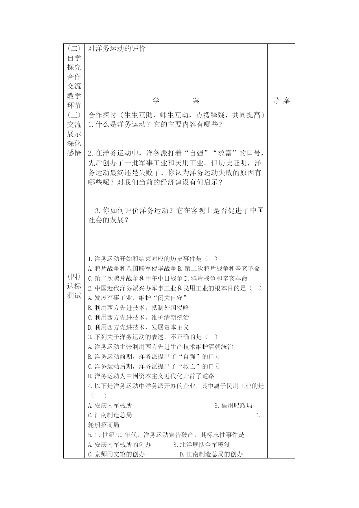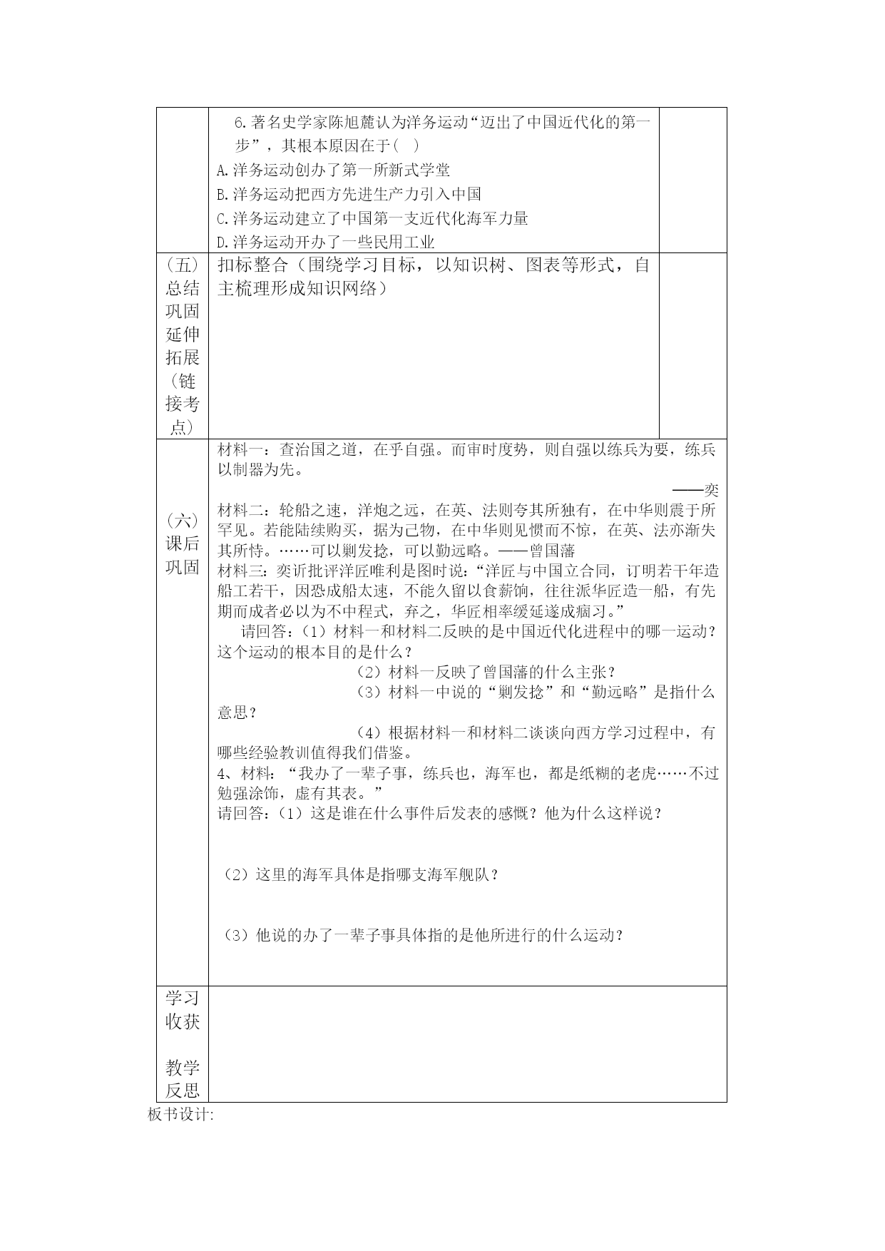 周次第三周年级、科目八年历史教学时间课型新课第()课时1授课人王春荣课题第6课洋务运动教学目标【知识与能力】了解洋务运动的时间口号代表人物内容、对洋务运动的评价等。【过程与方法】分析洋务运动使学生认识到这次运动并没有使中国走向富强之路,但引进了西方先进的技术,是中国出现了第一批近代企业。【情感态度与价值观】辩证发展的看待历史事物,激发爱国主义热情。学习重点洋务运动的代表人物,创办军事工业、创办民用工业。学习难点对洋务运动的评价。预习准备通读课文,把本课不明白的地方画出来教具学具挂图教学方法合作探究,师生互动探究教学过程教学环节学案导案(一)预习导学一、独立试航(预习课文,自主完成基础知识,记下发现的问题)1.第二次鸦片战争后,统治集团内部出现了一批较为开明的官员,形成了在中央以为代表,在地方以,,,为代表的洋务派。2.洋务运动前期,洋务派以为口号,采用西方先进生产技术,创办了,,等一批近代军事工业。洋务运动后期,又以为口号,开办了一批民用企业。主要有,,。70年代中期到80年代中期,洋务派筹建了,,三支海军。3.1862年创办的是洋务派创办的第一所新式学堂。它以培养和为宗旨。4.甲午中日战争中,全军覆没,洋务运动也随之破产。5.你是如何评价洋务运动的?自己不能解决的问题:(二)自学探究合作交流对洋务运动的评价教学环节学案导案(三)交流展示深化感悟合作探讨(生生互助、师生互动,点拨释疑,共同提高)1.什么是洋务运动?它的主要内容有哪些?2.在洋务运动中,洋务派打着“自强”“求富”的口号,先后创办了一批军事工业和民用工业。但历史证明,洋务运动最终还是失败了。你认为洋务运动失败的原因有哪些呢?对我们当前的经济建设有何启示?3.你如何评价洋务运动?它在客观上是否促进了中国社会的发展?(四)达标测试1.洋务运动开始和结束对应的历史事件是()A.鸦片战争和八国联军侵华战争B.第二次鸦片战争和辛亥革命C.第二次鸦片战争和甲午中日战争D.鸦片战争和辛亥革命2.中国近代洋务派兴办军事工业和民用工业的根本目的是()A.发展军事工业,维护“闭关自守”B.利用西方先进技术,抵制外国侵略C.利用西方先进技术,维护清朝统治D.利用西方先进技术,发展资本主义3.下列关于洋务运动的表述,不正确的是()A.洋务运动主张利用西方先进生产技术维护清朝统治B.洋务运动前期,洋务派提出了“自强”的口号C.洋务运动后期,洋务派提出了“救亡”的口号D.洋务运动为中国资本主义近代化开辟了道路4.以下是洋务运动中洋务派开办的企业,其中属于民用工业的是()A.安庆内军械所B.福州船政局C.江南制造总局D.轮船招商局5.19世纪90年代,洋务运动宣告破产,其标志性事件是A.安庆内军械所的创办B.北洋舰队全军覆没C.京师同文馆的创办D.江南制造总局的创办6.著名史学家陈旭麓认为洋务运动“迈出了中国近代化的第一步”,其根本原因在于()A.洋务运动创办了第一所新式学堂B.洋务运动把西方先进生产力引入中国C.洋务运动建立了中国第一支近代化海军力量D.洋务运动开办了一些民用工业(五)总结巩固延伸拓展(链接考点)扣标整合(围绕学习目标,以知识树、图表等形式,自主梳理形成知识网络)(六)课后巩固材料一:查治国之道,在乎自强。而审时度势,则自强以练兵为要,练兵以制器为先。──奕材料二:轮船之速,洋炮之远,在英、法则夸其所独有,在中华则震于所罕见。若能陆续购买,据为己物,在中华则见惯而不惊,在英、法亦渐失其所恃。……可以剿发捻,可以勤远略。——曾国藩材料三:奕批评洋匠唯利是图时说:“洋匠与中国立合同,订明若干年造船工若干,因恐成船太速,不能久留以食薪饷,往往派华匠造一船,有先期而成者必以为不中程式,弃之,华匠相率缓延遂成痼习。”请回答:(1)材料一和材料二反映的是中国近代化进程中的哪一运动?这个运动的根本目的是什么?(2)材料一反映了曾国藩的什么主张?(3)材料一中说的“剿发捻”和“勤远略”是指什么意思?(4)根据材料一和材料二谈谈向西方学习过程中,有哪些经验教训值得我们借鉴。4、材料:“我办了一辈子事,练兵也,海军也,都是纸糊的老虎……不过勉强涂饰,虚有其表。”请回答:(1)这是谁在什么事件后发表的感慨?他为什么这样说?(2)这里的海军具体是指哪支海军舰队?(3)他说的办了一辈子事具体指的是他所进行的什么运动?学习收获教学反思板书设计:一、一个中央代表;二、两个旗号;两个阶段;三、三支海军四、四个代表------曾国藩,李鸿章,左宗棠,张之洞;四字旗号——自强求富;四大内容——军事、民用工业,筹划