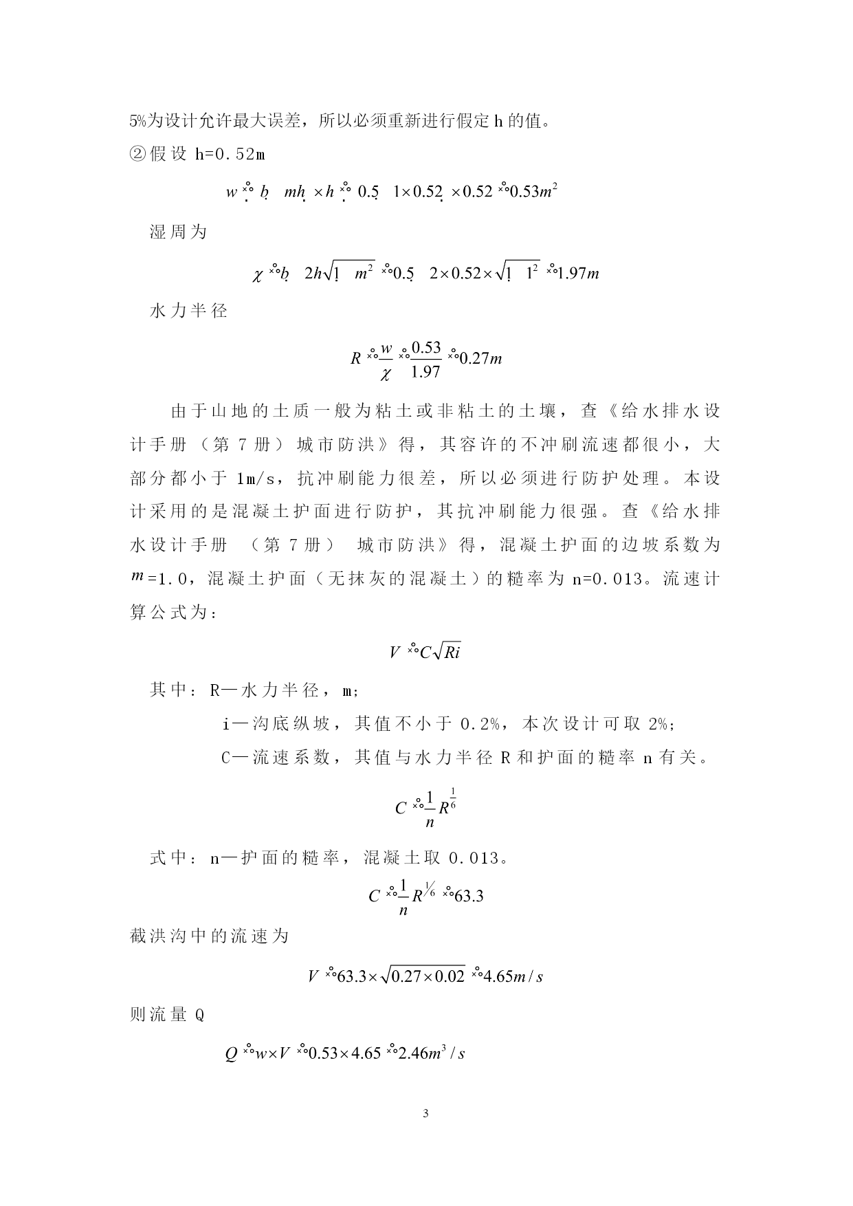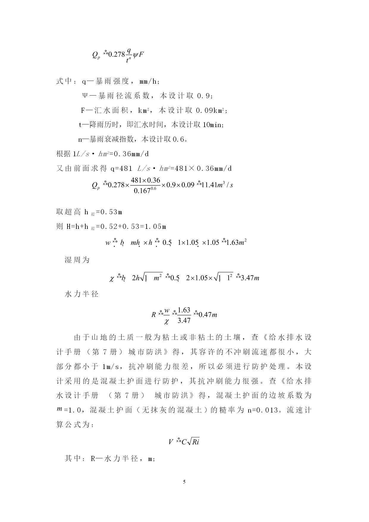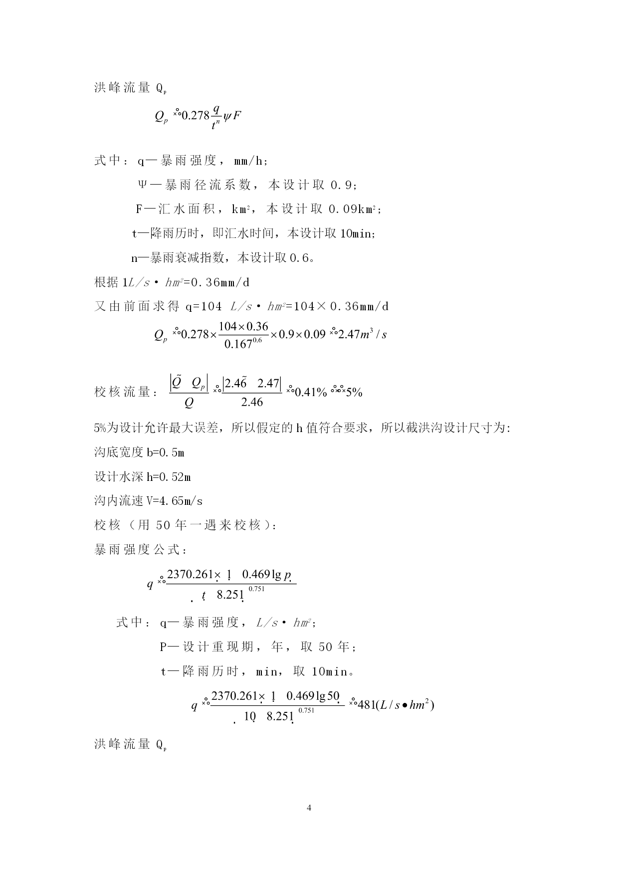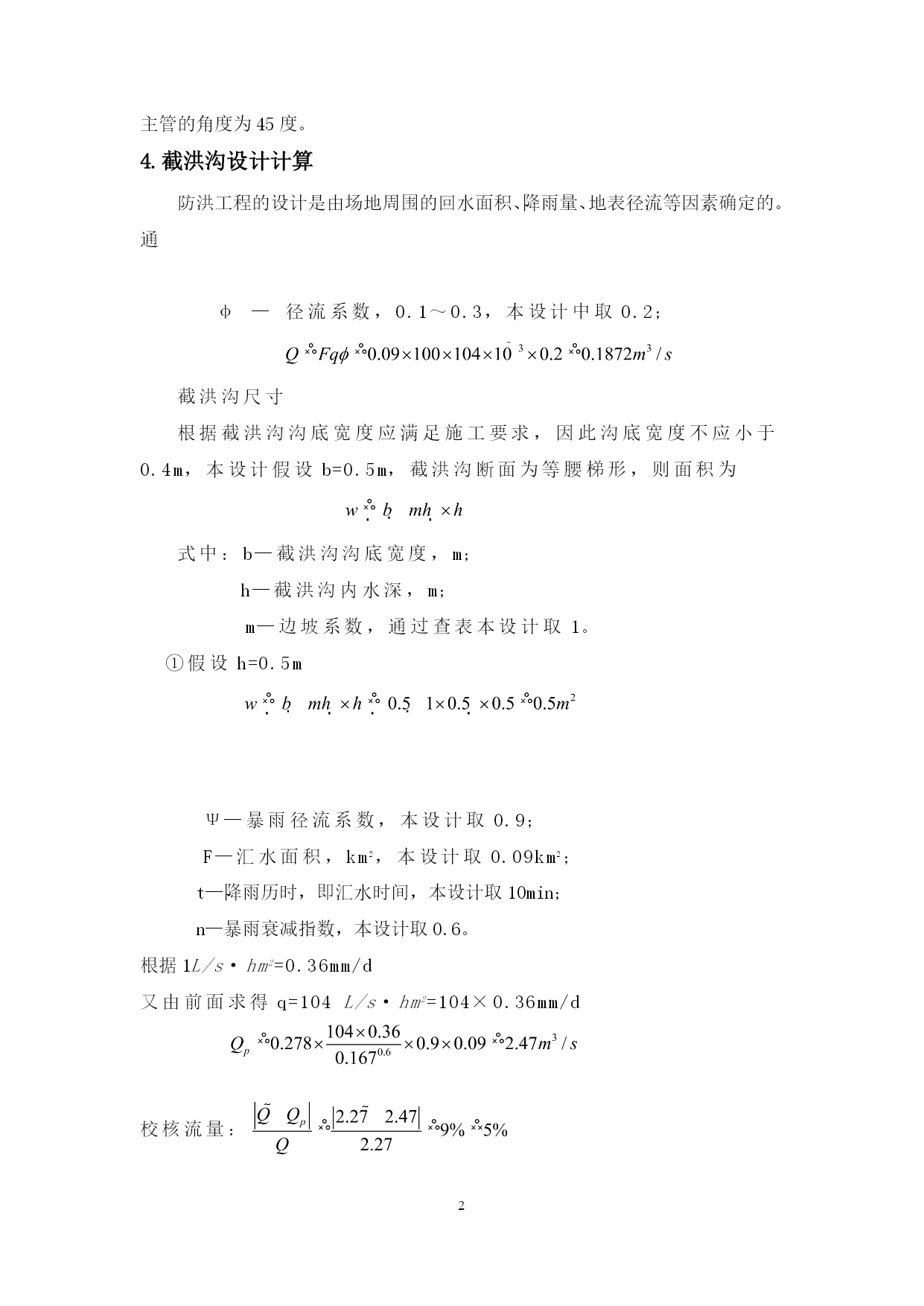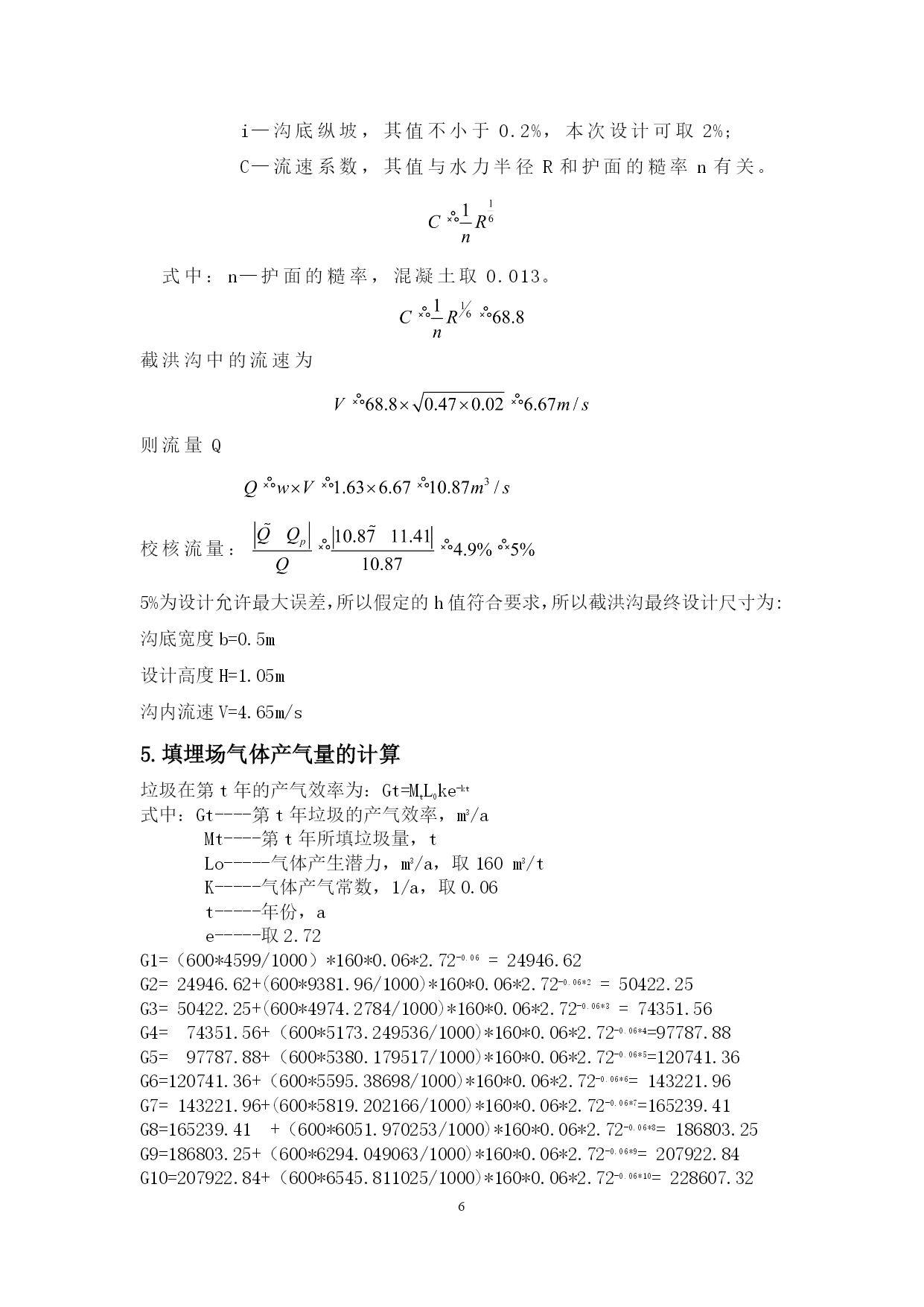 PAGE\*MERGEFORMAT71渗滤液产生量计算Q=CIA/1000式中:Q--------渗滤液产生量,m3/dI----------多年平均降雨量,mm/dA---------作业单元汇水面积,m2C---------作业渗出系数。一般去(0.1~0.8)由相关计算可得:A=23270m2I=4.28mm/d取C=0.2则:Q=CIA/1000=23270X0.2X4.28=19.91m3/d2.调节池的计算公式如下:V=(Qmax-Qt)X5式中:V-----------调节池的体积,m3Qmax---------设计最大渗滤液产生量,m3/dQt-------------渗滤液处理厂规模,m3/d取Qt=35污水储存周期为30天,设计的最大流量取25年来最大流量值Qmax=CIA/1000==60.6m3/dV1=(Qmax-Qt)X5=(60.6-35)X5=128.28m3/dV=30V1=3864m3设计调节池的面积A,调节池的有效水深H取7m,超高0.5mA=V/H=3864/7=552m2调节池的长度L.取调节池的宽度为8m,L=552/8=69m则池的实际长宽高只比为=69:8:73.收集管道的计算由以上公式计算得Qmac=60.6m3/d=7.0X10-4m3/s由曼宁公式:Q=式中:Q-------管道净流量,m3/sn-------粗糙系数,取n-0.009A-------管的内截面积,m3S-------管道的坡降,为25。rh-------水力半径通过公式计算可得:管的内劲r=0.008mm经过校核后取主流管径为DN400mm支流管径为DN200mm支管相距50m支管与主管的角度为45度。4.截洪沟设计计算防洪工程的设计是由场地周围的回水面积、降雨量、地表径流等因素确定的。通φ—径流系数,0.1~0.3,本设计中取0.2;截洪沟尺寸根据截洪沟沟底宽度应满足施工要求,因此沟底宽度不应小于0.4m,本设计假设b=0.5m,截洪沟断面为等腰梯形,则面积为式中:b—截洪沟沟底宽度,m;h—截洪沟内水深,m;m—边坡系数,通过查表本设计取1。①假设h=0.5mΨ—暴雨径流系数,本设计取0.9;F—汇水面积,km2,本设计取0.09km2;t—降雨历时,即汇水时间,本设计取10min;n—暴雨衰减指数,本设计取0.6。根据1L/s·hm2=0.36mm/d又由前面求得q=104L/s·hm2=104×0.36mm/d校核流量:5%为设计允许最大误差,所以必须重新进行假定h的值。②假设h=0.52m湿周为水力半径由于山地的土质一般为粘土或非粘土的土壤,查《给水排水设计手册(第7册)城市防洪》得,其容许的不冲刷流速都很小,大部分都小于1m/s,抗冲刷能力很差,所以必须进行防护处理。本设计采用的是混凝土护面进行防护,其抗冲刷能力很强。查《给水排水设计手册(第7册)城市防洪》得,混凝土护面的边坡系数为=1.0,混凝土护面(无抹灰的混凝土)的糙率为n=0.013。流速计算公式为:其中:R—水力半径,m;i—沟底纵坡,其值不小于0.2%,本次设计可取2%;C—流速系数,其值与水力半径R和护面的糙率n有关。式中:n—护面的糙率,混凝土取0.013。截洪沟中的流速为则流量Q洪峰流量Qp式中:q—暴雨强度,mm/h;Ψ—暴雨径流系数,本设计取0.9;F—汇水面积,km2,本设计取0.09km2;t—降雨历时,即汇水时间,本设计取10min;n—暴雨衰减指数,本设计取0.6。根据1L/s·hm2=0.36mm/d又由前面求得q=104L/s·hm2=104×0.36mm/d校核流量:5%为设计允许最大误差,所以假定的h值符合要求,所以截洪沟设计尺寸为:沟底宽度b=0.5m设计水深h=0.52m沟内流速V=4.65m/s校核(用50年一遇来校核):暴雨强度公式:式中:q—暴雨强度,L/s·hm2;P—设计重现期,年,取50年;t—降雨历时,min,取10min。洪峰流量Qp式中:q—暴雨强度,mm/h;Ψ—暴雨径流系数,本设计取0.9;F—汇水面积,km2,本设计取0.09km2;t—降雨历时,即汇水时间,本设计取10min;n—暴雨衰减指数,本设计取0.6。根据1L/s·hm2=0.36mm/d又由前面求得q=481L/s·hm2=481×0.36mm/d取超高h超=0.53m则H=h+h超=0.52+0.53=1.05m湿周为水力半径由于山地的土质一般为粘土或非粘土的土壤,查《