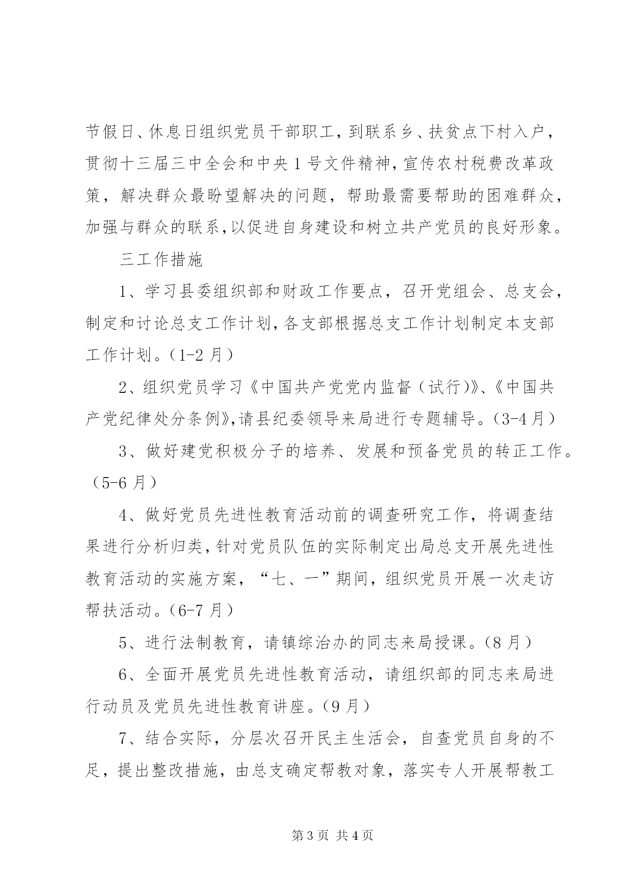 第PAGE\*Arabic\*MERGEFORMAT4页共NUMPAGES\*MERGEFORMAT4页县财政局总支XX年工作计划一、指导思想:以邓小平理论和“xxxx”重要思想为指导,深入贯彻xx大和xx届三中全会精神,按照县委组织部工作部署,紧紧围绕加强党的建设这条主线,加强党组织和党员队伍建设,不断开创组织工作新局面,为全面推进财政各项改革和完成全年各项工作任务提供坚强的组织保证和人才支持。二、工作重点1、抓思想建设。继续认真组织全体党员干部职工学习xx大精神,把学习贯彻“xxxx”重要思想推向新高潮。在去年组织党员干部职工学习xx大精神、贯彻“xxxx”重要思想的基础上,~年局党组、总支及各支部按照工作要点在“新”字上求突破,在“深”字上下功夫,在“突”字上见成效,把“xxxx”重要思想的学习、十六精神的贯彻牢牢定位在落实和指导实践上。通过完善党组、党员干部的学习制度,请专人宣讲、进党校培训和自学等形式,抓好、组织好学习,保证每月一次不走过场,进一步增强大家的自觉性和坚定性,并把学习理论和改进作风、提高素质结合起来,以人为本,开展创建“学习型、创新型、竞争型、服务型”财政机关活动,努力造就一支政治过硬、业务熟练,作风优良的财政干部队伍。2、抓组织建设,深入开展党员先进性教育活动,确保党员队伍的先进性。在去年初步开展党员先进性教育的基础上,按照县委部署,党总支将组织专人对机关党员队伍的现状进行调查研究,在调查研究的基础上,根据我局党员队伍状况及工作的实际,制定出局机关党员先进性教育活动实施方案,扎实认真开展这项活动。同时加强党员管理,一方面严把“入口”,注重对建党积极分子队伍建设,严格日常管理,提高发展质量,坚持成熟一个发展一个和有计划发展的原则,实行预备党员入党前公示制;对意志衰退、不愿意参加党内活动的党员开展帮教活动,指定专人负责进行帮教;另一方面疏通“出口”,加大对不合格党员的处置力度,以保持党员队伍的纯洁性。3、抓党员干部作风建设。党风建设是我们党一项长期而又艰巨的工作任务,是关系到我们党和国家生死存亡的一件大事。根据本局实际,~年着重对党员干部职工加强《中国共产党党内监督条例(试行)》和《中国共产党纪律处分条例》以及相关法律的学习,广泛宣传,认真贯彻执行,按照“八个坚持,八个反对”和“为民”、“务实”、“清廉”的要求,切实改进学风、政风、文风和生活作风,通过请纪委、监察、政法部门同志来讲座,召开党内民主生活会和继续在全局开展以“治虚、治懒、治赌”为主要内容的“三治”教育活动以及行风自查等形式,整治作风上的突出问题。还结合开展“两访”活动和建整扶贫工作,利用节假日、休息日组织党员干部职工,到联系乡、扶贫点下村入户,贯彻十三届三中全会和中央1号文件精神,宣传农村税费改革政策,解决群众最盼望解决的问题,帮助最需要帮助的困难群众,加强与群众的联系,以促进自身建设和树立共产党员的良好形象。三工作措施1、学习县委组织部和财政工作要点,召开党组会、总支会,制定和讨论总支工作计划,各支部根据总支工作计划制定本支部工作计划。(1-2月)2、组织党员学习《中国共产党党内监督(试行)》、《中国共产党纪律处分条例》,请县纪委领导来局进行专题辅导。(3-4月)3、做好建党积极分子的培养、发展和预备党员的转正工作。(5-6月)4、做好党员先进性教育活动前的调查研究工作,将调查结果进行分析归类,针对党员队伍的实际制定出局总支开展先进性教育活动的实施方案,“七、一”期间,组织党员开展一次走访帮扶活动。(6-7月)5、进行法制教育,请镇综治办的同志来局授课。(8月)6、全面开展党员先进性教育活动,请组织部的同志来局进行动员及党员先进性教育讲座。(9月)7、结合实际,分层次召开民主生活会,自查党员自身的不足,提出整改措施,由总支确定帮教对象,落实专人开展帮教工作。(10-11月)8、抓好党费收缴工作的清理。(12月)xx年三月二日