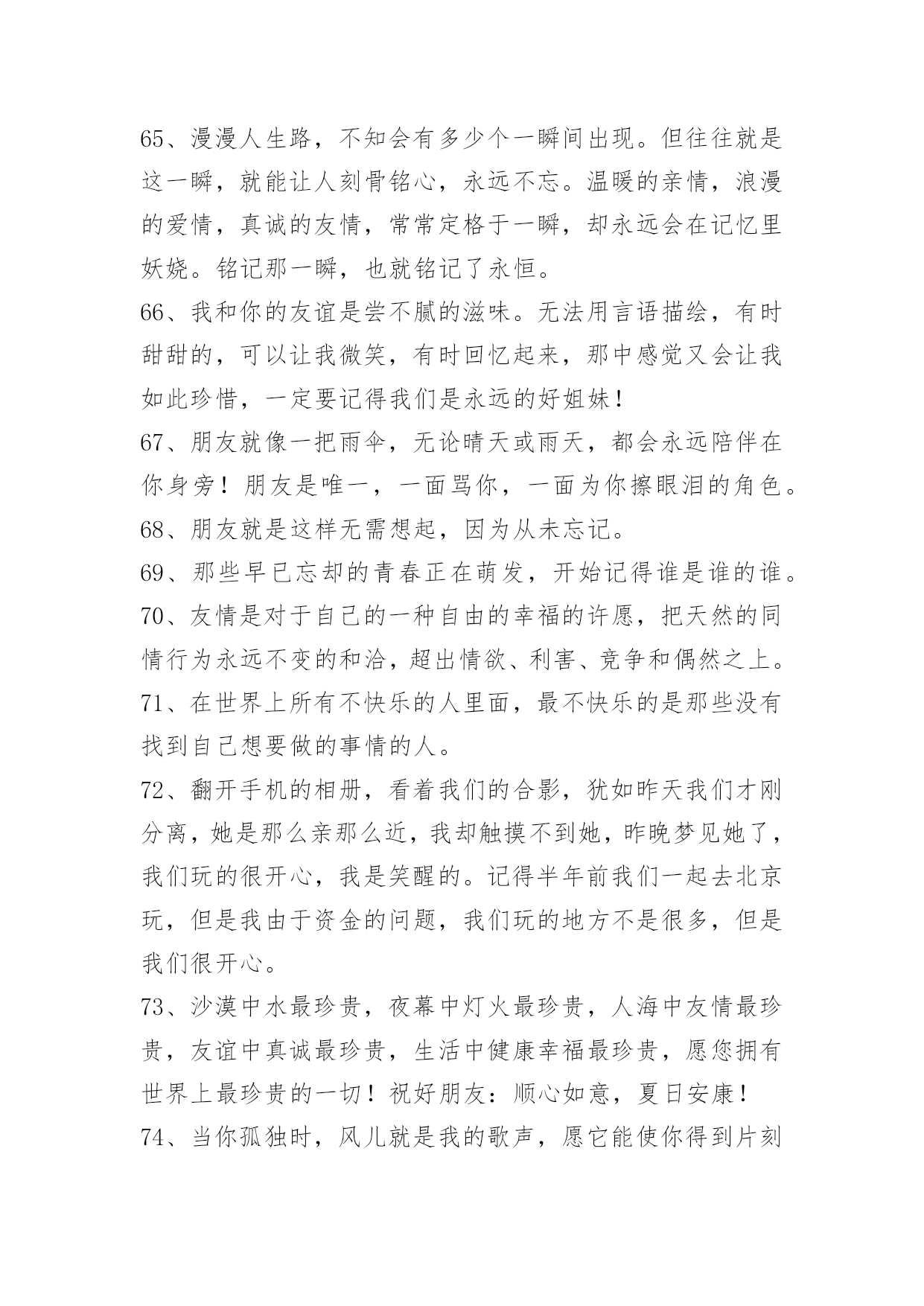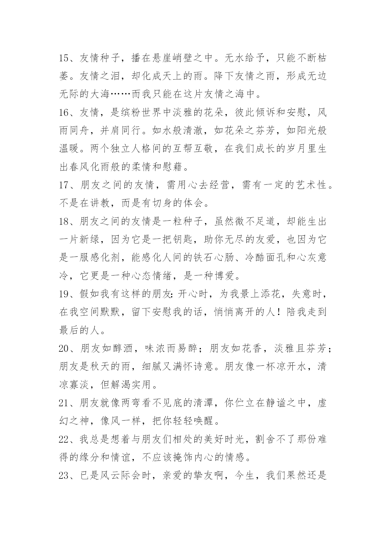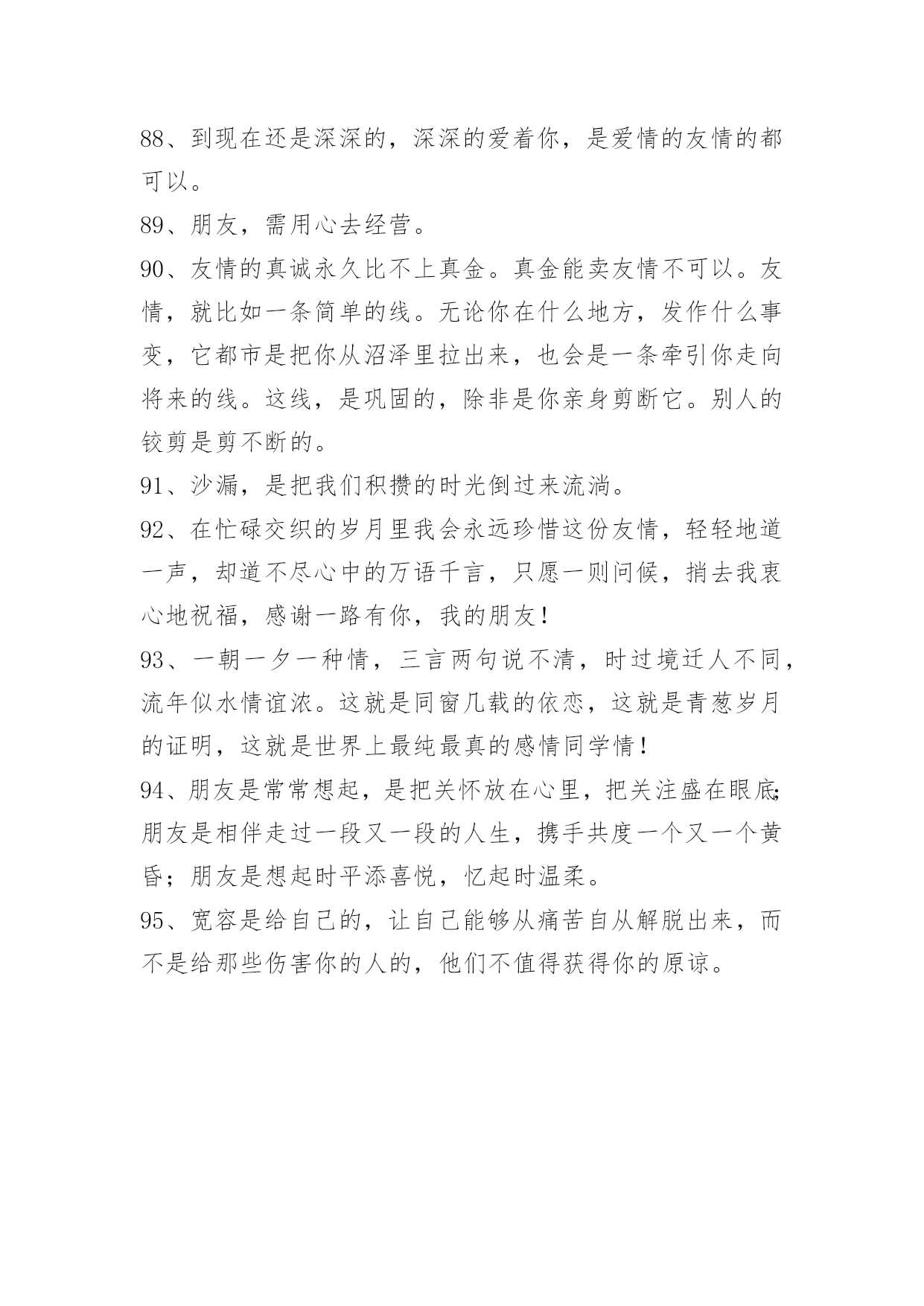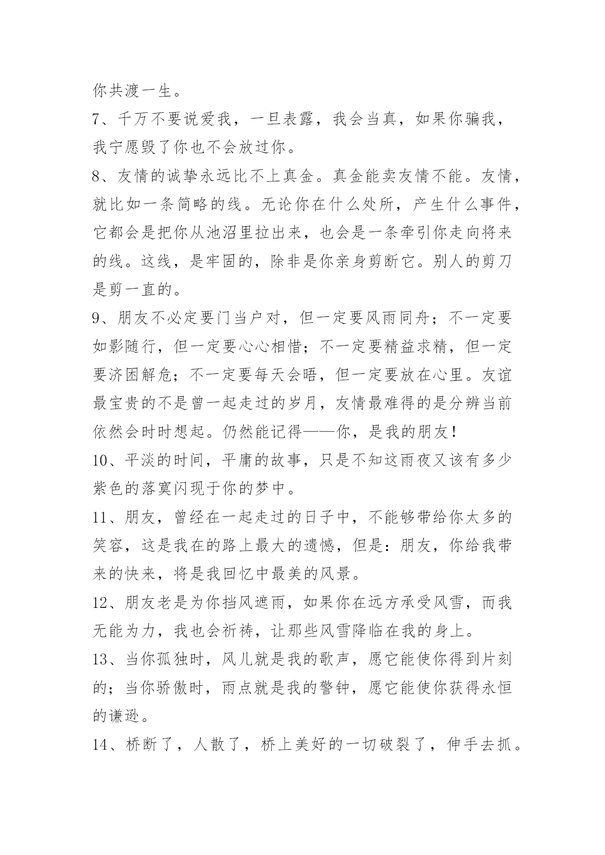 简洁的友情语句95条2024年简洁的友情语句汇编95条我知道友情已经离我越来越遥远了,我凭命想抓住它,可是它已经坐上时间的特快列车出发了,我只能远远相望,双颊挂着眼泪来祭奠我即将远去的友情。多少个无眠之夜里站在窗前,脑海里不断重复着曾经的点点滴滴。我明白,曾经一切不会再来,只有淡淡的祝福,祝福我曾经的朋友一切都好!以下是关于友情语句95条,供大家参考借鉴,希望可以帮助到有需要的朋友。1、倾听春天的莺歌燕语,我们感受到生命的活力,意境的优美;倾听大海的潮起潮落,我们感受到激越的乐章和壮美的境界;倾听长者的教诲,我们如坐春风;倾听朋友的诉说,我们感觉到友谊的可贵。2、朋友是你房中的一扇窗,春送你花香,夏送你清凉,秋送你硕果,冬送你热和。3、没有蝴蝶的夏天不多彩,没有星星的夜晚不浪漫,没有梦想的人生不值得,没有友情的日子不快乐。4、人海茫茫,唯你不忘。5、时间会冲淡一切,请对自己好点。6、人人都离不开友情。你可以没有爱情,但是你绝不能没有友情;一旦没有了友情,生活就不会有悦耳的和音,就死水一滩;友情无处不在,她伴随你左右,萦绕在你身边,和你共渡一生。7、千万不要说爱我,一旦表露,我会当真,如果你骗我,我宁愿毁了你也不会放过你。8、友情的诚挚永远比不上真金。真金能卖友情不能。友情,就比如一条简略的线。无论你在什么处所,产生什么事件,它都会是把你从池沼里拉出来,也会是一条牵引你走向将来的线。这线,是牢固的,除非是你亲身剪断它。别人的剪刀是剪一直的。9、朋友不必定要门当户对,但一定要风雨同舟;不一定要如影随行,但一定要心心相惜;不一定要精益求精,但一定要济困解危;不一定要每天会晤,但一定要放在心里。友谊最宝贵的不是曾一起走过的岁月,友情最难得的是分辨当前依然会时时想起。仍然能记得——你,是我的朋友!10、平淡的时间,平庸的故事,只是不知这雨夜又该有多少紫色的落寞闪现于你的梦中。11、朋友,曾经在一起走过的日子中,不能够带给你太多的笑容,这是我在的路上最大的遗憾,但是:朋友,你给我带来的快来,将是我回忆中最美的风景。12、朋友老是为你挡风遮雨,如果你在远方承受风雪,而我无能为力,我也会祈祷,让那些风雪降临在我的身上。13、当你孤独时,风儿就是我的歌声,愿它能使你得到片刻的;当你骄傲时,雨点就是我的警钟,愿它能使你获得永恒的谦逊。14、桥断了,人散了,桥上美好的一切破裂了,伸手去抓。15、友情种子,播在悬崖峭壁之中。无水给予,只能不断枯萎。友情之泪,却化成天上的雨。降下友情之雨,形成无边无际的大海……而我只能在这片友情之海中。16、友情,是缤粉世界中淡雅的花朵,彼此倾诉和安慰,风雨同舟,并肩同行。如水般清澈,如花朵之芬芳,如阳光般温暖。两个独立人格间的互帮互敬,在我们成长的岁月里生出春风化雨般的柔情和慰藉。17、朋友之间的友情,需用心去经营,需有一定的艺术性。不是在讲教,而是有切身的体会。18、朋友之间的友情是一粒种子,虽然微不足道,却能生出一片新绿,因为它是一把钥匙,助你无尽的友爱,也因为它是一服感化剂,能感化人间的铁石心肠、冷酷面孔和心灰意冷,它更是一种心态情绪,是一种博爱。19、假如我有这样的朋友:开心时,为我景上添花,失意时,在我空间默默,留下安慰我的话,悄悄离开的人!陪我走到最后的人。20、朋友如醇酒,味浓而易醉;朋友如花香,淡雅且芬芳;朋友是秋天的雨,细腻又满怀诗意。朋友像一杯凉开水,清凉寡淡,但解渴实用。21、朋友就像两弯看不见底的清潭,你伫立在静谧之中,虚幻之神,像风一样,把你轻轻唤醒。22、我总是想着与朋友们相处的美好时光,割舍不了那份难得的缘分和情谊,不应该掩饰内心的情感。23、已是风云际会时,亲爱的挚友啊,今生,我们果然还是战友。24、这一刻,有我最深的思念,让云捎去满心的祝福,点缀你甜蜜的梦,愿我们在彼此心头。25、岁月把悼念的影子,拖成修长而又曲折的色块,但一句温馨的祝贺,却始终牢牢地牵系着咱们彼此的心情。26、过的石椅,青苔遍布,旧影斑驳,它还残存着你我相倚的轮廓,你在左,爱在右,一起聆听风中花的呢喃而如今,我只能装进时光的沙漏,一分一秒地计算,下一次花开的时间初夏的风,干净而又透明,从花隙间迅疾地掠过,似不忍目睹它们失色的容颜。27、路是自己走的,小心点;朋友是相互的,帮着点;幸福是感知的,看开点;烦恼是自找的,健忘点;心态是练就的,平和点;友情是培养的,纯洁点;成功是付出的,努力点;失败是难免的,宽心点。28、女生之间,好是形影不离,不好是黑白两道。29、友情能给你一个宽敞的空间,在那个空间里,你可以随心所欲,自然的相处,心灵的相通。30、友情是大自然的一抹色彩,独具慧眼的匠师才能把它表现得尽善尽美;友谊是乐谱上的一个跳动音符,感情细腻的歌唱者才能把它表达得至真至纯。31、亲情与友情对于生活都十分重要,但维