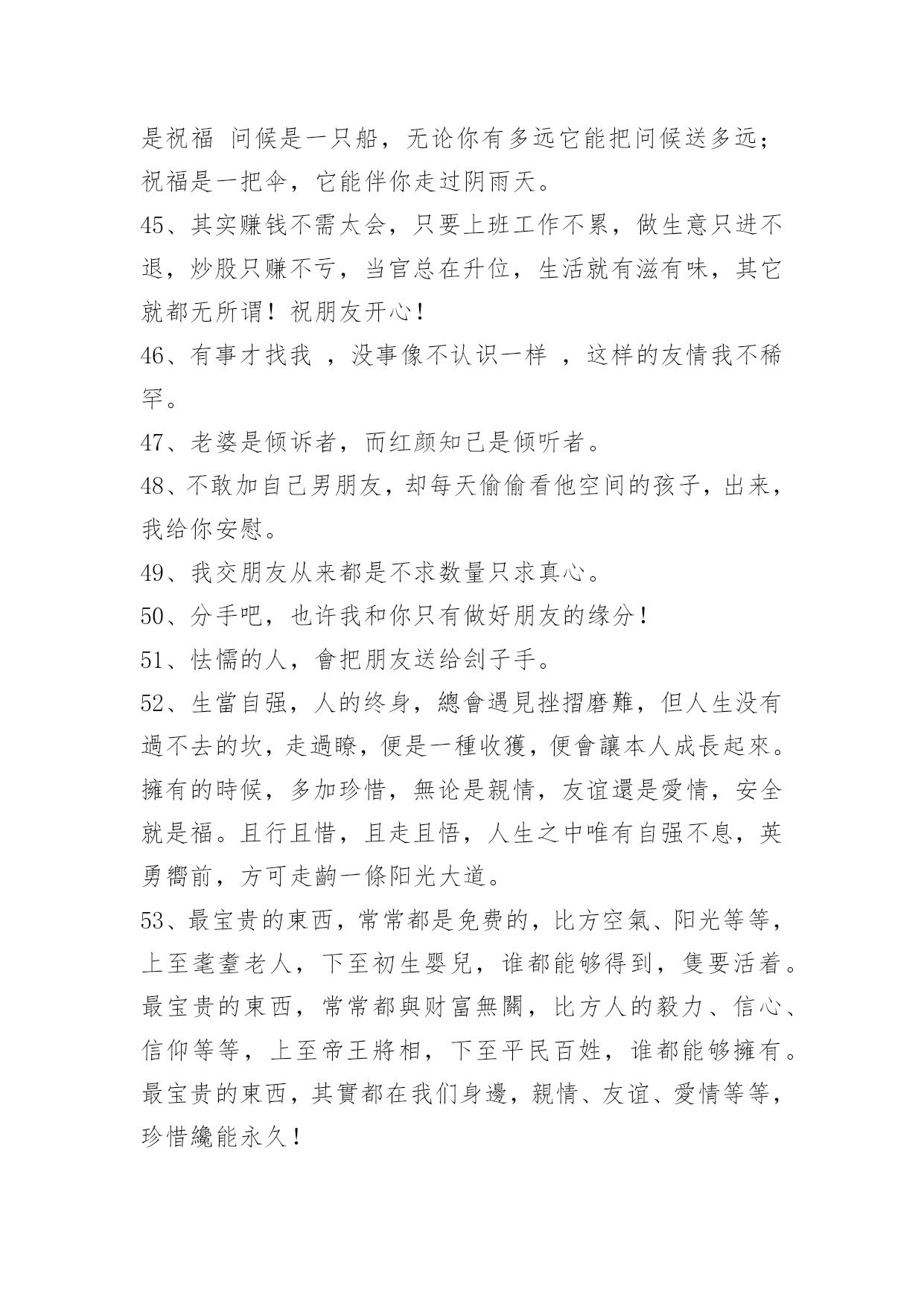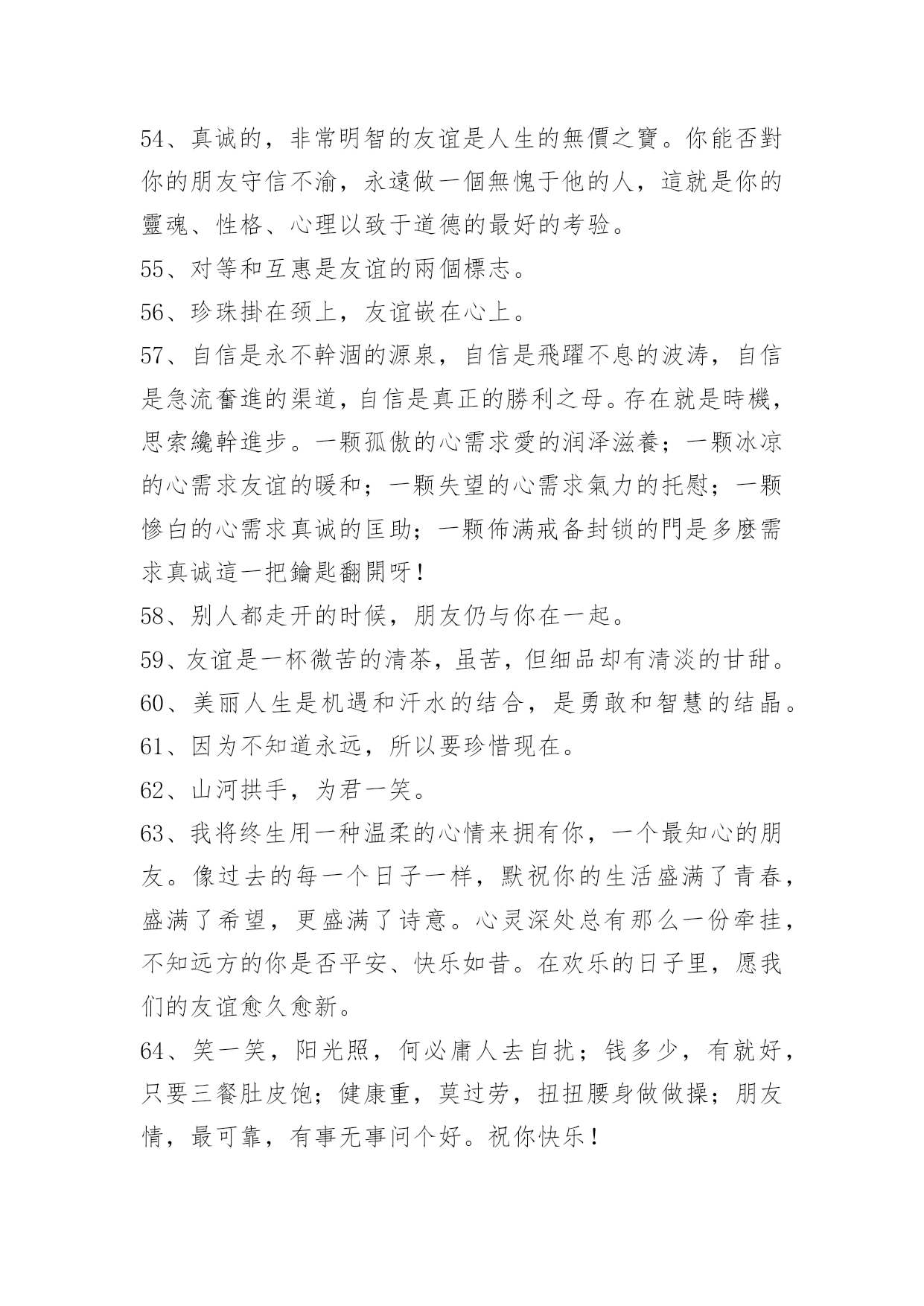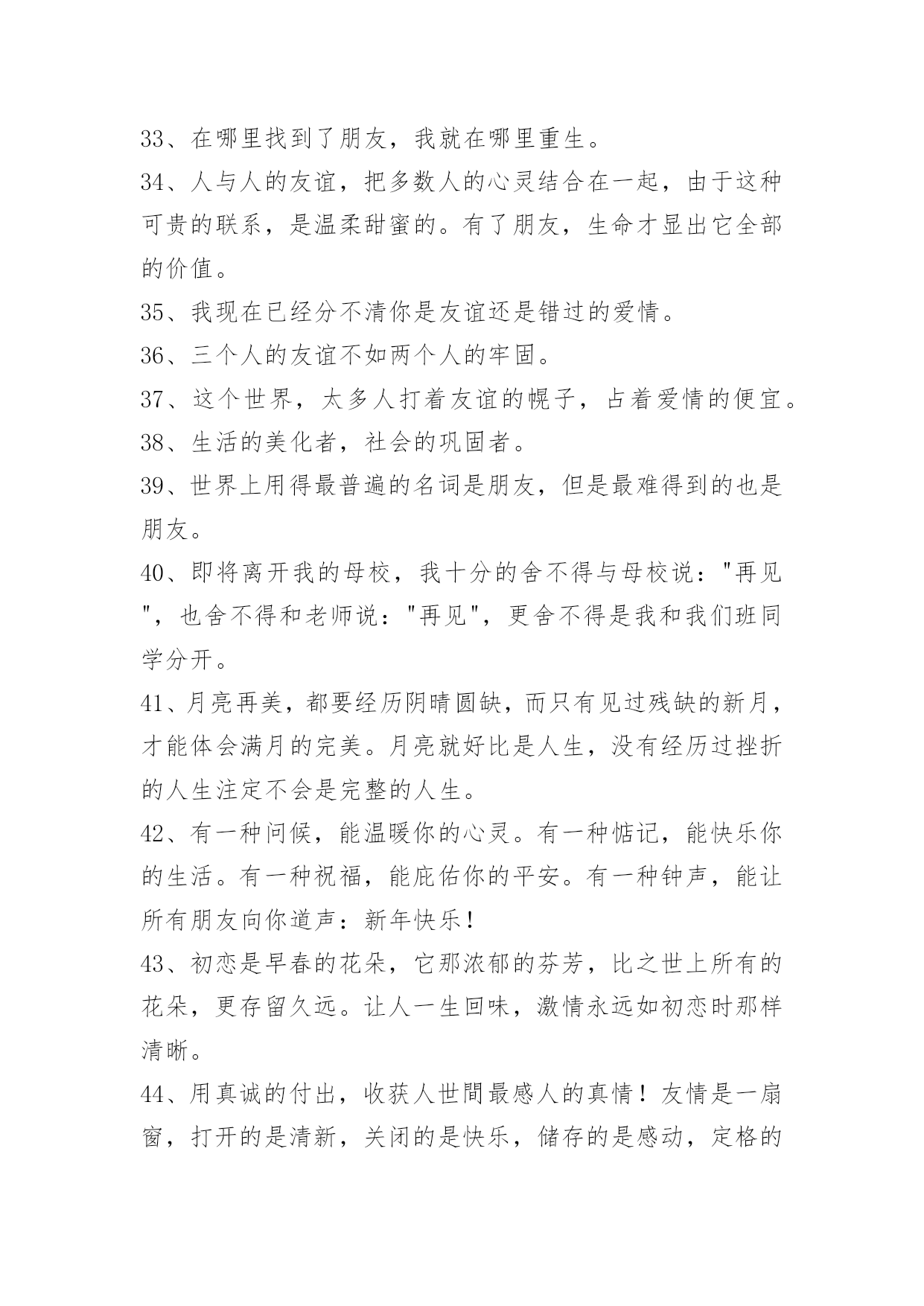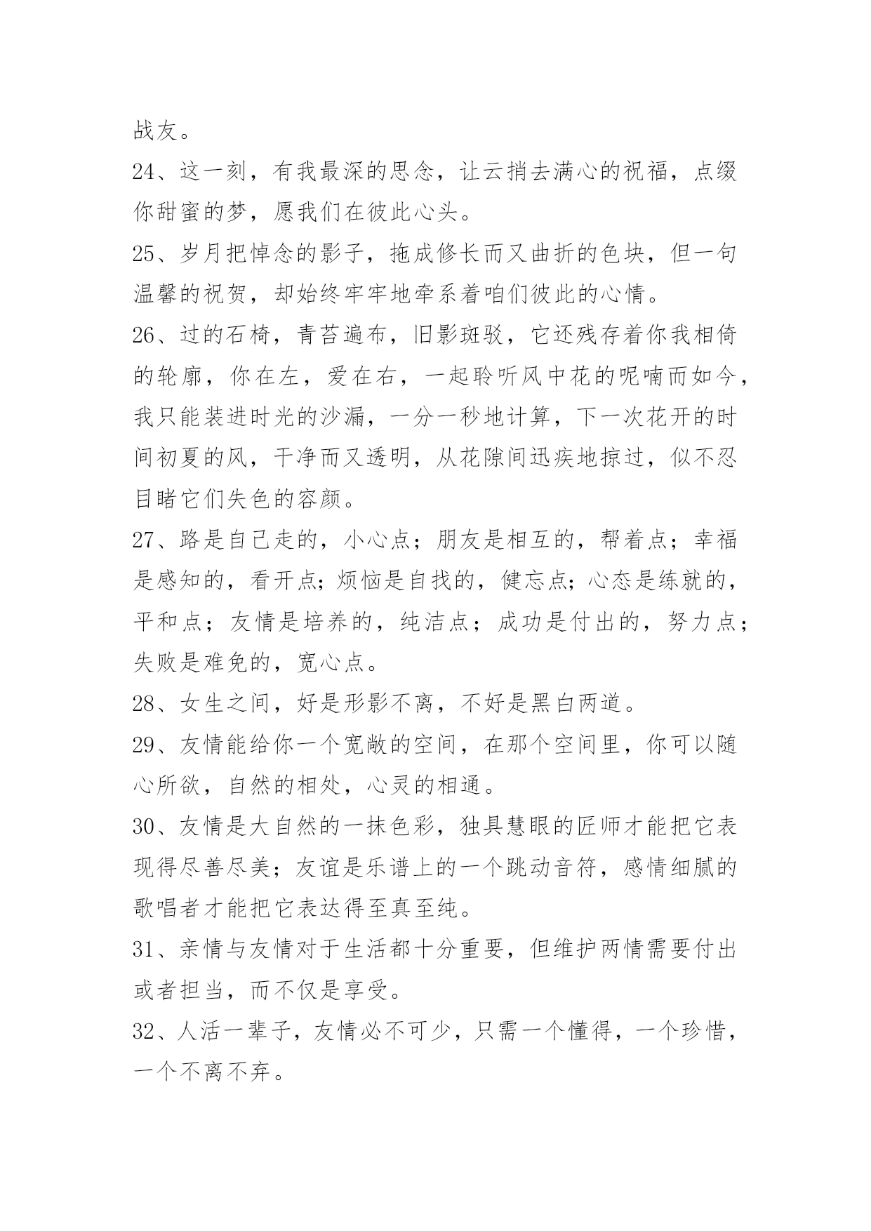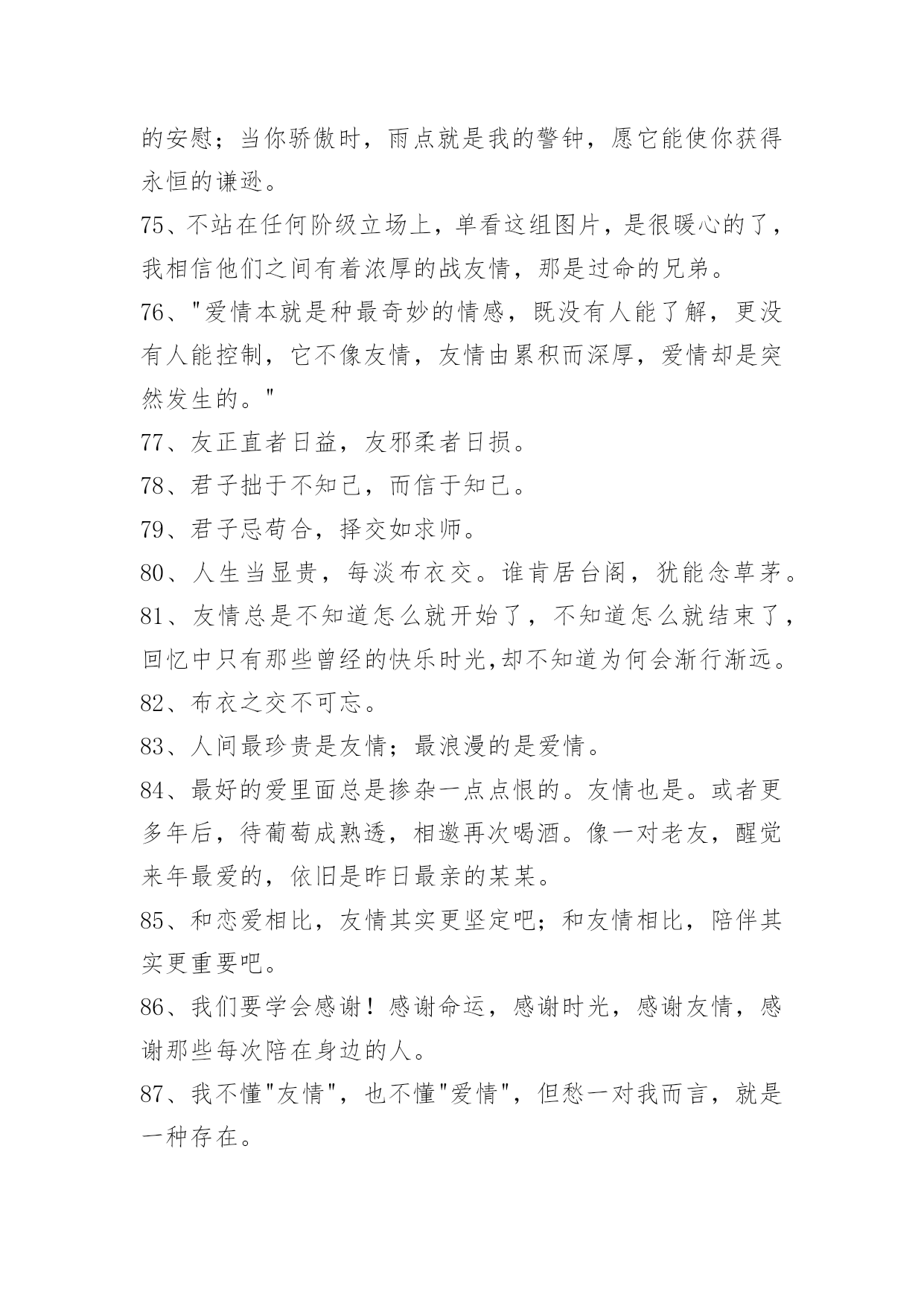 简洁的友情语句95条2024年简洁的友情语句汇编95条我知道友情已经离我越来越遥远了,我凭命想抓住它,可是它已经坐上时间的特快列车出发了,我只能远远相望,双颊挂着眼泪来祭奠我即将远去的友情。多少个无眠之夜里站在窗前,脑海里不断重复着曾经的点点滴滴。我明白,曾经一切不会再来,只有淡淡的祝福,祝福我曾经的朋友一切都好!以下是关于友情语句95条,供大家参考借鉴,希望可以帮助到有需要的朋友。1、倾听春天的莺歌燕语,我们感受到生命的活力,意境的优美;倾听大海的潮起潮落,我们感受到激越的乐章和壮美的境界;倾听长者的教诲,我们如坐春风;倾听朋友的诉说,我们感觉到友谊的可贵。2、朋友是你房中的一扇窗,春送你花香,夏送你清凉,秋送你硕果,冬送你热和。3、没有蝴蝶的夏天不多彩,没有星星的夜晚不浪漫,没有梦想的人生不值得,没有友情的日子不快乐。4、人海茫茫,唯你不忘。5、时间会冲淡一切,请对自己好点。6、人人都离不开友情。你可以没有爱情,但是你绝不能没有友情;一旦没有了友情,生活就不会有悦耳的和音,就死水一滩;友情无处不在,她伴随你左右,萦绕在你身边,和你共渡一生。7、千万不要说爱我,一旦表露,我会当真,如果你骗我,我宁愿毁了你也不会放过你。8、友情的诚挚永远比不上真金。真金能卖友情不能。友情,就比如一条简略的线。无论你在什么处所,产生什么事件,它都会是把你从池沼里拉出来,也会是一条牵引你走向将来的线。这线,是牢固的,除非是你亲身剪断它。别人的剪刀是剪一直的。9、朋友不必定要门当户对,但一定要风雨同舟;不一定要如影随行,但一定要心心相惜;不一定要精益求精,但一定要济困解危;不一定要每天会晤,但一定要放在心里。友谊最宝贵的不是曾一起走过的岁月,友情最难得的是分辨当前依然会时时想起。仍然能记得——你,是我的朋友!10、平淡的时间,平庸的故事,只是不知这雨夜又该有多少紫色的落寞闪现于你的梦中。11、朋友,曾经在一起走过的日子中,不能够带给你太多的笑容,这是我在的路上最大的遗憾,但是:朋友,你给我带来的快来,将是我回忆中最美的风景。12、朋友老是为你挡风遮雨,如果你在远方承受风雪,而我无能为力,我也会祈祷,让那些风雪降临在我的身上。13、当你孤独时,风儿就是我的歌声,愿它能使你得到片刻的;当你骄傲时,雨点就是我的警钟,愿它能使你获得永恒的谦逊。14、桥断了,人散了,桥上美好的一切破裂了,伸手去抓。15、友情种子,播在悬崖峭壁之中。无水给予,只能不断枯萎。友情之泪,却化成天上的雨。降下友情之雨,形成无边无际的大海……而我只能在这片友情之海中。16、友情,是缤粉世界中淡雅的花朵,彼此倾诉和安慰,风雨同舟,并肩同行。如水般清澈,如花朵之芬芳,如阳光般温暖。两个独立人格间的互帮互敬,在我们成长的岁月里生出春风化雨般的柔情和慰藉。17、朋友之间的友情,需用心去经营,需有一定的艺术性。不是在讲教,而是有切身的体会。18、朋友之间的友情是一粒种子,虽然微不足道,却能生出一片新绿,因为它是一把钥匙,助你无尽的友爱,也因为它是一服感化剂,能感化人间的铁石心肠、冷酷面孔和心灰意冷,它更是一种心态情绪,是一种博爱。19、假如我有这样的朋友:开心时,为我景上添花,失意时,在我空间默默,留下安慰我的话,悄悄离开的人!陪我走到最后的人。20、朋友如醇酒,味浓而易醉;朋友如花香,淡雅且芬芳;朋友是秋天的雨,细腻又满怀诗意。朋友像一杯凉开水,清凉寡淡,但解渴实用。21、朋友就像两弯看不见底的清潭,你伫立在静谧之中,虚幻之神,像风一样,把你轻轻唤醒。22、我总是想着与朋友们相处的美好时光,割舍不了那份难得的缘分和情谊,不应该掩饰内心的情感。23、已是风云际会时,亲爱的挚友啊,今生,我们果然还是战友。24、这一刻,有我最深的思念,让云捎去满心的祝福,点缀你甜蜜的梦,愿我们在彼此心头。25、岁月把悼念的影子,拖成修长而又曲折的色块,但一句温馨的祝贺,却始终牢牢地牵系着咱们彼此的心情。26、过的石椅,青苔遍布,旧影斑驳,它还残存着你我相倚的轮廓,你在左,爱在右,一起聆听风中花的呢喃而如今,我只能装进时光的沙漏,一分一秒地计算,下一次花开的时间初夏的风,干净而又透明,从花隙间迅疾地掠过,似不忍目睹它们失色的容颜。27、路是自己走的,小心点;朋友是相互的,帮着点;幸福是感知的,看开点;烦恼是自找的,健忘点;心态是练就的,平和点;友情是培养的,纯洁点;成功是付出的,努力点;失败是难免的,宽心点。28、女生之间,好是形影不离,不好是黑白两道。29、友情能给你一个宽敞的空间,在那个空间里,你可以随心所欲,自然的相处,心灵的相通。30、友情是大自然的一抹色彩,独具慧眼的匠师才能把它表现得尽善尽美;友谊是乐谱上的一个跳动音符,感情细腻的歌唱者才能把它表达得至真至纯。31、亲情与友情对于生活都十分重要,但维