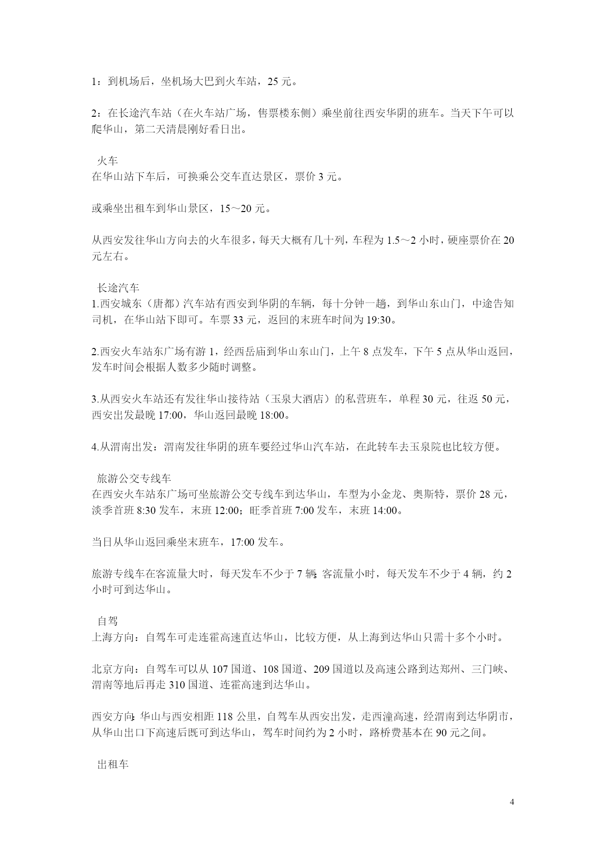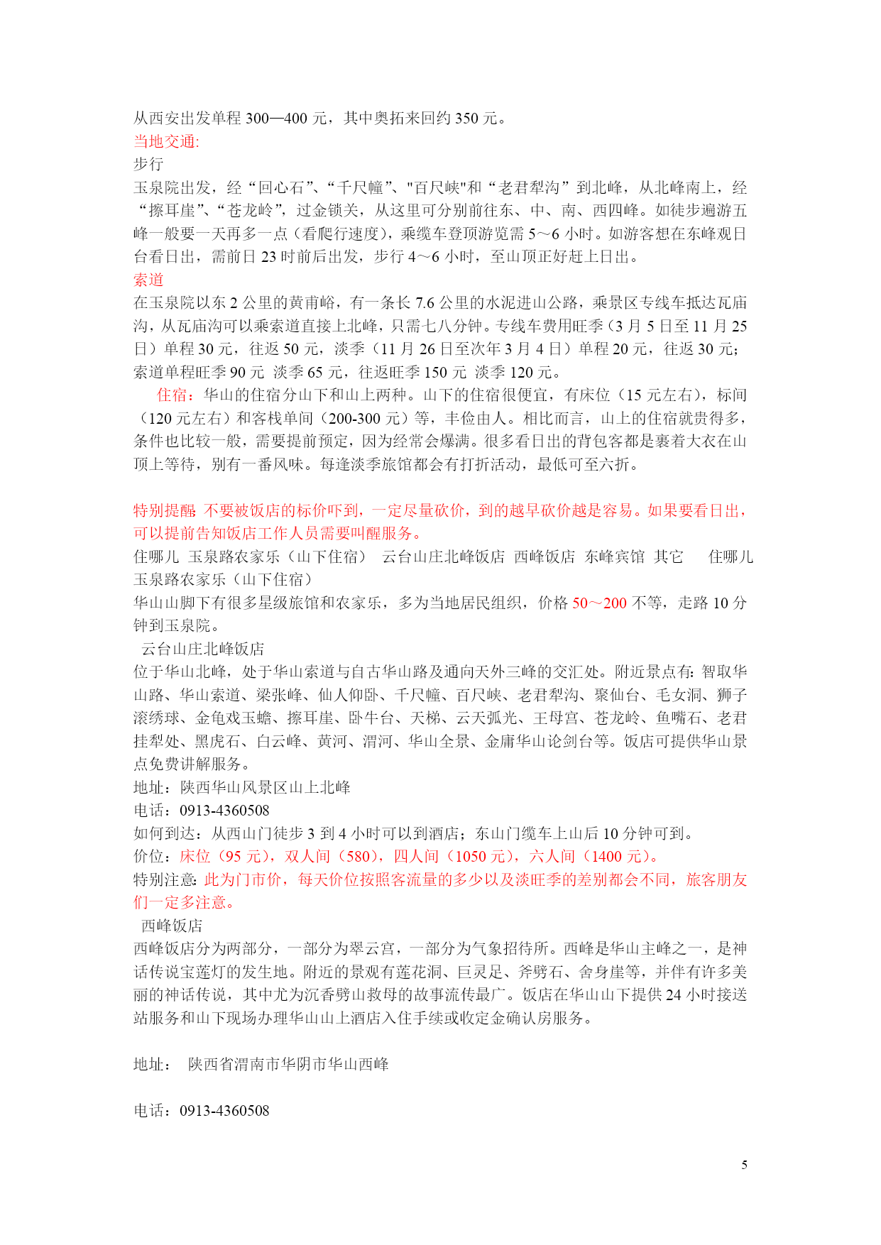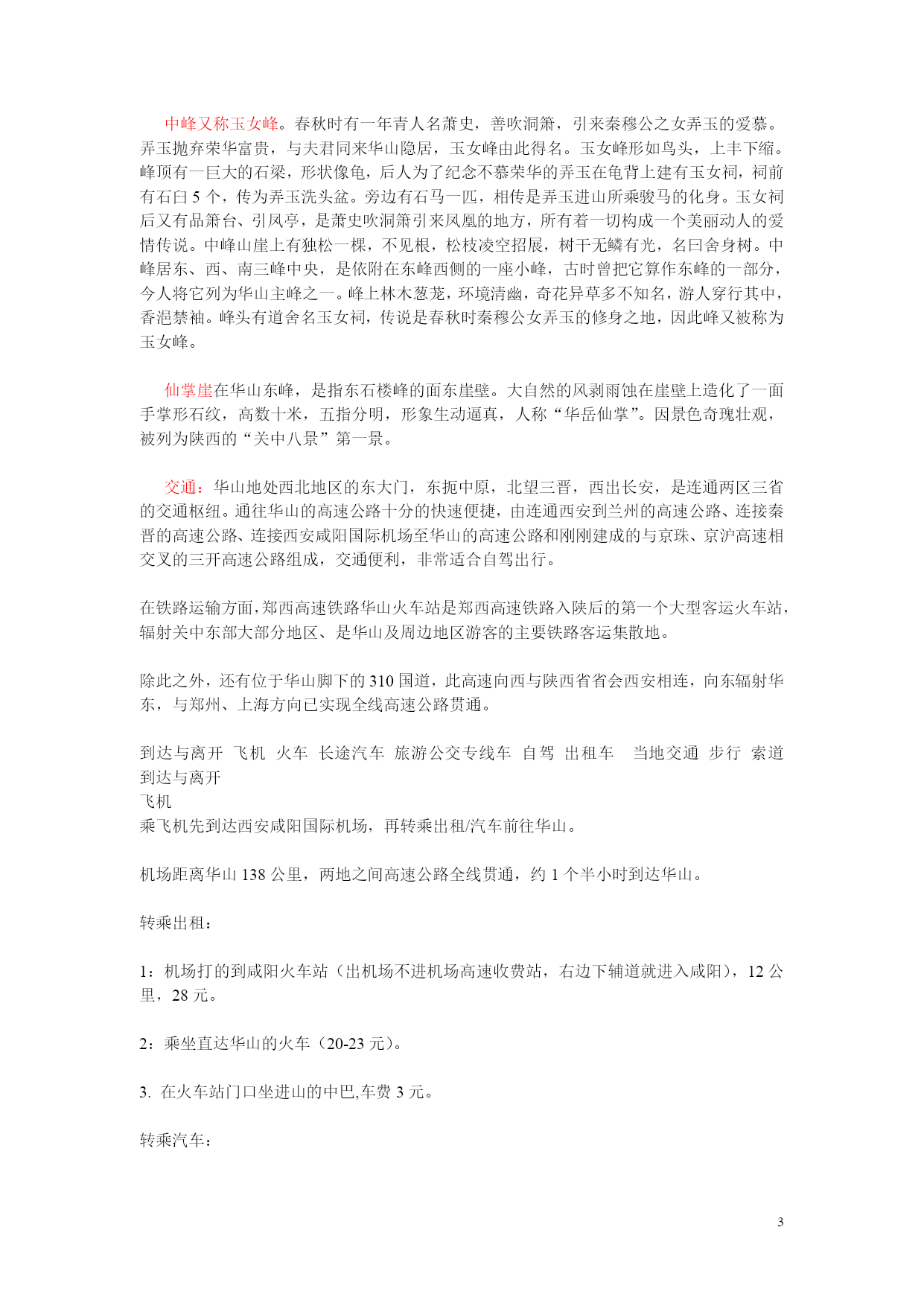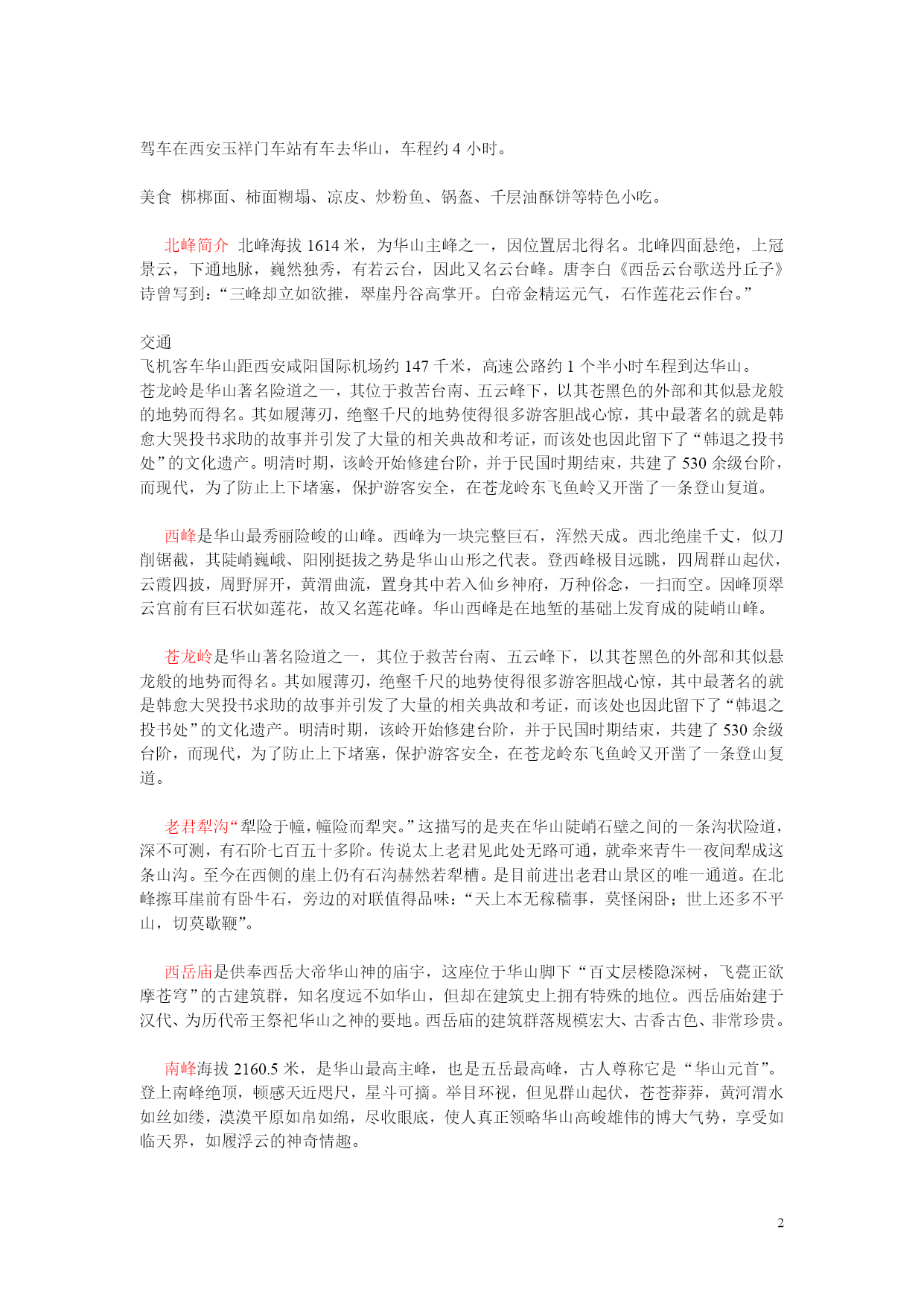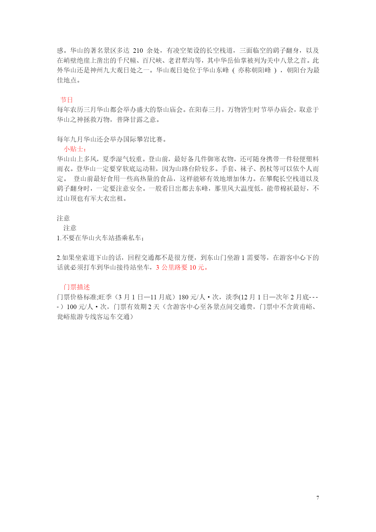 PAGEPAGE7旅游小攻略物资:白色棉手套(爬山攀铁索用)、塑料雨衣(嘿嘿高山上经常会有些小雨的)、软底运动鞋、食用一些高热量的食品、一件棉袄。游玩时间:路线:D1玉泉院五里关莎萝坪毛女洞青柯坪回心石千尺幢百尺峡老君犁沟北峰擦耳崖苍龙岭五云峰金锁关中峰这条被当地人称为“华山峪”的登山道,包括了沿途众多景点,是登华山的最佳选择。到达金锁关后,才可上中峰游览,并以环线游览东、西、南三峰。西安、华山游参观被誉为“世界第八大奇迹”的兵马俑;游走唐代华清宫内的温泉浴池华清池;攀爬五岳之一的华山。D1华清池秦始皇兵马俑大雁塔第一天从西安出发,在火车站乘专线车前往兵马俑。途中经过华清池,下车游览3小时。晚上会市区,前往大雁塔广场欣赏音乐喷泉。D2华山第二天乘车前往华山,华山五座山峰如莲花状,以“奇险骏伟”著称天下,游览北峰、苍龙岭、天梯、鹞子翻身等知名景点。玉泉院位于陕西华阴市玉泉路最南端,是华山道教活动的主要场所,也是游客从华山峪游览华山的必经之地。玉泉院为登临华山的门户。相传金仙公主在镇岳宫玉井中汲水洗头,不慎将玉簪掉入水中,却在返回玉泉院后,用泉水洗手时无意中找到了玉簪,方知此泉与玉井相通,于是赐名此泉为玉泉。玉泉院因此得名。华山东峰,又名朝阳峰,海拔2090米,是华山主峰之一,因位置居东得名。华山东峰杨公塔峰顶有一平台,居高临险,视野开阔,是著名的观日出的地方,人称朝阳台,东峰也因之被称为朝阳峰。峰上有三茅洞,洞内有陈抟像,洞外有甘露池。附近的清虚洞前有一孤峰,峰顶上有铁瓦亭一座,铁棋一枰,据说宋太祖赵匡胤曾在这里和陈抟下棋,棋败,将华山输给陈抟,亭遂得名“赌棋亭”。华山三大险简介“华山三大险”位于从玉泉院出发到北峰的登山通道上。分别是千尺幢、百尺峡和老君犁沟。千尺幢有石梯370余阶,盘旋于悬崖峭壁之上,游人需手握铁索,手足并用,沿陡峭的山路攀登,千尺悬崖令人望而生畏。其间,崖壁陡峭,头顶只见一线天光,惊险绝伦。出口名曰“天井”,为“太华咽喉”。若用铁板盖上,则上下无路可走。出千尺幢不远是百尺峡,这里是登山第二道险关。两壁高耸,中间夹有一块从天而降的巨石,上刻“惊心石”三个大字,游人要从石下小路穿过,确实惊心动魄。此后还有仙人桥、俯渭崖、黑虎岭等小险处,就到了登山第三道险关老君犁沟,这是夹在陡峭石壁之间的一条沟状险道,深不可测,有石阶570有余。传说太上老君见此处无路可通,就牵来青牛一夜间犁成这条山沟。交通客车自驾可从西安火车站乘坐西安到华山的旅游专线车。驾车在西安玉祥门车站有车去华山,车程约4小时。美食梆梆面、柿面糊塌、凉皮、炒粉鱼、锅盔、千层油酥饼等特色小吃。北峰简介北峰海拔1614米,为华山主峰之一,因位置居北得名。北峰四面悬绝,上冠景云,下通地脉,巍然独秀,有若云台,因此又名云台峰。唐李白《西岳云台歌送丹丘子》诗曾写到:“三峰却立如欲摧,翠崖丹谷高掌开。白帝金精运元气,石作莲花云作台。”交通飞机客车华山距西安咸阳国际机场约147千米,高速公路约1个半小时车程到达华山。苍龙岭是华山著名险道之一,其位于救苦台南、五云峰下,以其苍黑色的外部和其似悬龙般的地势而得名。其如履薄刃,绝壑千尺的地势使得很多游客胆战心惊,其中最著名的就是韩愈大哭投书求助的故事并引发了大量的相关典故和考证,而该处也因此留下了“韩退之投书处”的文化遗产。明清时期,该岭开始修建台阶,并于民国时期结束,共建了530余级台阶,而现代,为了防止上下堵塞,保护游客安全,在苍龙岭东飞鱼岭又开凿了一条登山复道。西峰是华山最秀丽险峻的山峰。西峰为一块完整巨石,浑然天成。西北绝崖千丈,似刀削锯截,其陡峭巍峨、阳刚挺拔之势是华山山形之代表。登西峰极目远眺,四周群山起伏,云霞四披,周野屏开,黄渭曲流,置身其中若入仙乡神府,万种俗念,一扫而空。因峰顶翠云宫前有巨石状如莲花,故又名莲花峰。华山西峰是在地堑的基础上发育成的陡峭山峰。苍龙岭是华山著名险道之一,其位于救苦台南、五云峰下,以其苍黑色的外部和其似悬龙般的地势而得名。其如履薄刃,绝壑千尺的地势使得很多游客胆战心惊,其中最著名的就是韩愈大哭投书求助的故事并引发了大量的相关典故和考证,而该处也因此留下了“韩退之投书处”的文化遗产。明清时期,该岭开始修建台阶,并于民国时期结束,共建了530余级台阶,而现代,为了防止上下堵塞,保护游客安全,在苍龙岭东飞鱼岭又开凿了一条登山复道。老君犁沟“犁险于幢,幢险而犁突。”这描写的是夹在华山陡峭石壁之间的一条沟状险道,深不可测,有石阶七百五十多阶。传说太上老君见此处无路可通,就牵来青牛一夜间犁成这条山沟。至今在西侧的崖上仍有石沟赫然若犁槽。是目前进出老君山景区的唯一通道。在北峰擦耳崖前有卧牛石,旁边的对联