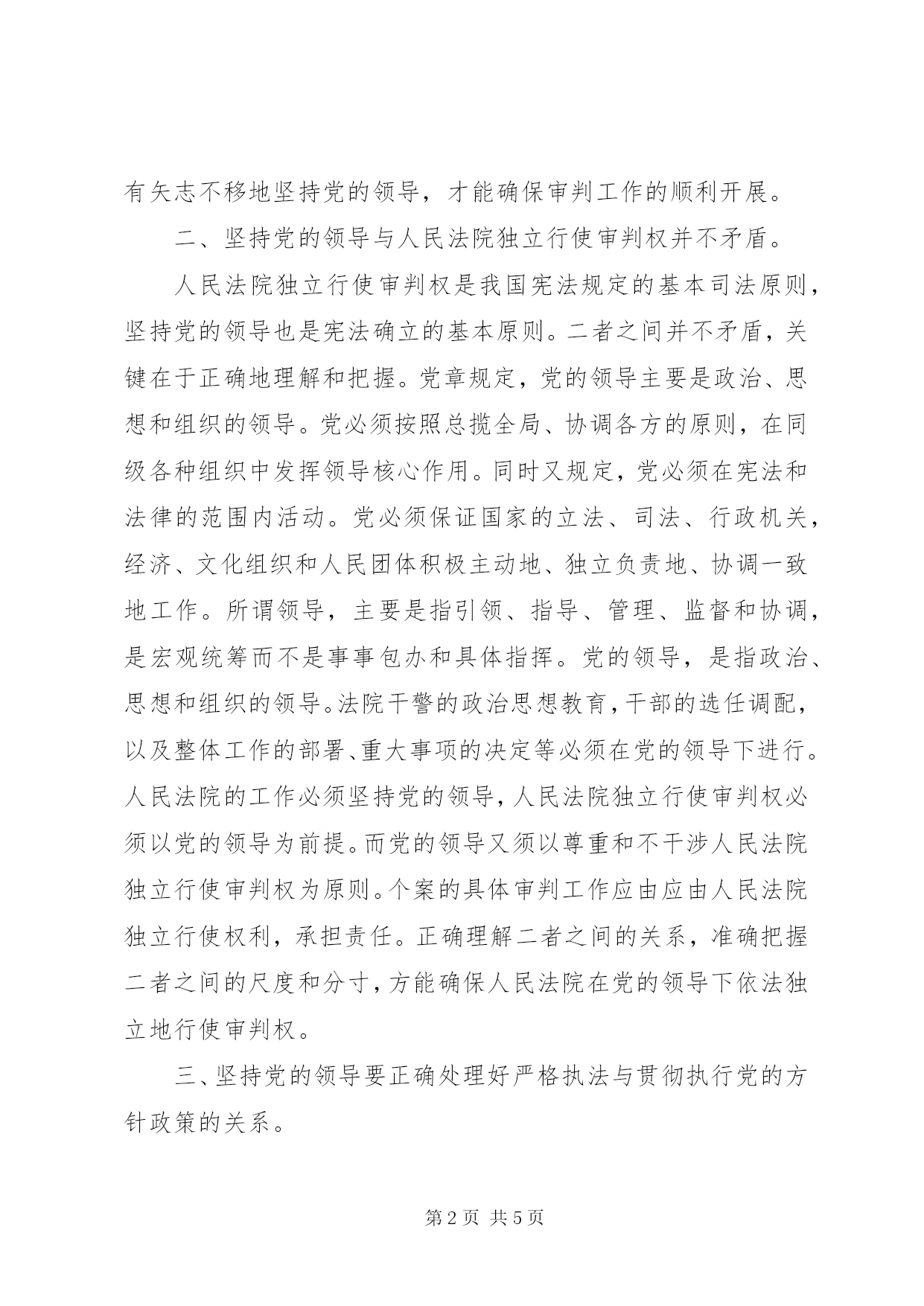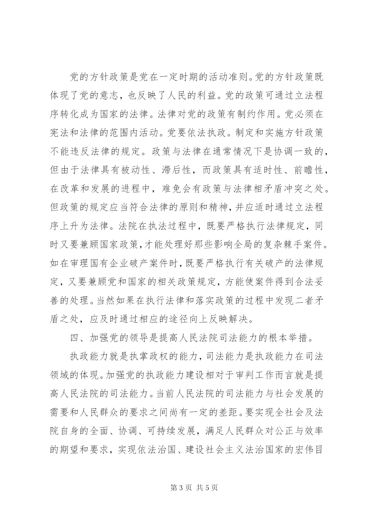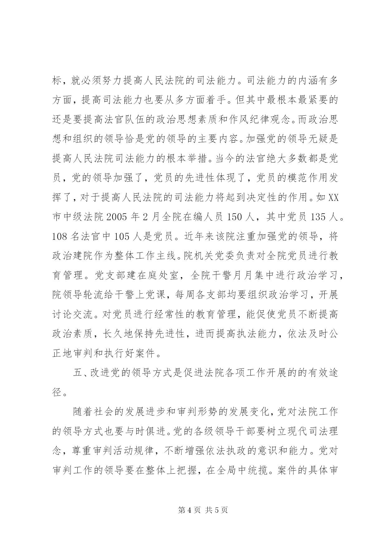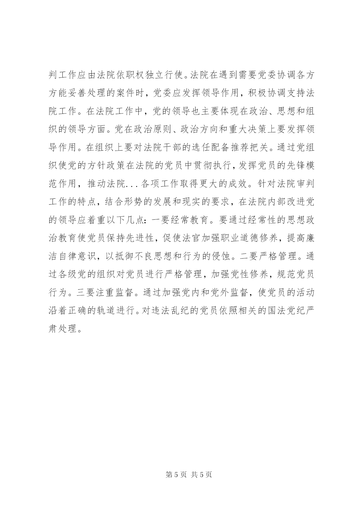 第PAGE\*Arabic\*MERGEFORMAT5页共NUMPAGES\*MERGEFORMAT5页党的领导是提高司法能力的保证...我国宪法将党对各项事业的领导作为基本原则予以明确,宪法和法律同时也赋予人民法院行使国家的审判权。加强与改进党对法院工作的领导,对于提高人民法院的司法能力和人民法官的执法水平,实践“公正与效率”的工作主题和司法为民的根本要求,使人民法院在依法治国、建设社会主义法治国家的进程中发挥更好的作用具有十分重要的意义。一、坚持党的领导是审判工作顺利开展的前提和保证。中国共产党是中国社会主义事业的领导核心。历史证明只有坚持中国共产党的领导才能取得中国革命和建设的成功。中国的国情和现状决定了只有坚持中国共产党的领导才能取得中国特色社会主义事业的更大成就和全面建设小康社会宏伟目标的最终实现。依法治国,建设社会主义法治国家是新时期我国的基本治国方略,是全面建设小康社会的重要内容,也是实现这一目标有力保障。作为法治建设的核心力量,随着依法治国进程的不断深入和全面建设小康社会的逐步推进,人民法院在国家政治和社会生活中将发挥越来越重要的作用。随着改革的深入和社会的发展,各种矛盾和纠纷越来越多,新类型案件不断增加,人民法院审判的案件增多,难度增大。审判力量与审判任务之间,执法能力与公众不断增长的期望和要求之间的矛盾日趋明显。面对新形势新任务和新要求,面对我国的国情,面对改革发展的现实,只有矢志不移地坚持党的领导,才能确保审判工作的顺利开展。二、坚持党的领导与人民法院独立行使审判权并不矛盾。人民法院独立行使审判权是我国宪法规定的基本司法原则,坚持党的领导也是宪法确立的基本原则。二者之间并不矛盾,关键在于正确地理解和把握。党章规定,党的领导主要是政治、思想和组织的领导。党必须按照总揽全局、协调各方的原则,在同级各种组织中发挥领导核心作用。同时又规定,党必须在宪法和法律的范围内活动。党必须保证国家的立法、司法、行政机关,经济、文化组织和人民团体积极主动地、独立负责地、协调一致地工作。所谓领导,主要是指引领、指导、管理、监督和协调,是宏观统筹而不是事事包办和具体指挥。党的领导,是指政治、思想和组织的领导。法院干警的政治思想教育,干部的选任调配,以及整体工作的部署、重大事项的决定等必须在党的领导下进行。人民法院的工作必须坚持党的领导,人民法院独立行使审判权必须以党的领导为前提。而党的领导又须以尊重和不干涉人民法院独立行使审判权为原则。个案的具体审判工作应由应由人民法院独立行使权利,承担责任。正确理解二者之间的关系,准确把握二者之间的尺度和分寸,方能确保人民法院在党的领导下依法独立地行使审判权。三、坚持党的领导要正确处理好严格执法与贯彻执行党的方针政策的关系。党的方针政策是党在一定时期的活动准则。党的方针政策既体现了党的意志,也反映了人民的利益。党的政策可通过立法程序转化成为国家的法律。法律对党的政策有制约作用。党必须在宪法和法律的范围内活动。党要依法执政。制定和实施方针政策不能违反法律的规定。政策与法律在通常情况下是协调一致的,但由于法律具有被动性、滞后性,而政策具有适时性、前瞻性,在改革和发展的进程中,难免会有政策与法律相矛盾冲突之处。但政策的规定应当符合法律的原则和精神,并应适时通过立法程序上升为法律。法院在执法过程中,既要严格执行法律规定,同时又要兼顾国家政策,才能处理好那些影响全局的复杂棘手案件。如在审理国有企业破产案件时,既要严格执行有关破产的法律规定,又要兼顾党和国家的相关政策规定,方能使案件得到合法妥善的处理。当然如果在执行法律和落实政策的过程中发现二者矛盾之处,应及时通过相应的途径向上反映解决。四、加强党的领导是提高人民法院司法能力的根本举措。执政能力就是执掌政权的能力,司法能力是执政能力在司法领域的体现。加强党的执政能力建设相对于审判工作而言就是提高人民法院的司法能力。当前人民法院的司法能力与社会发展的需要和人民群众的要求之间尚有一定的差距。要实现全社会及法院自身的全面、协调、可持续发展,满足人民群众对公正与效率的期望和要求,实现依法治国、建设社会主义法治国家的宏伟目标,就必须努力提高人民法院的司法能力。司法能力的内涵有多方面,提高司法能力也要从多方面着手。但其中最根本最紧要的还是要提高法官队伍的政治思想素质和作风纪律观念。而政治思想和组织的领导恰是党的领导的主要内容。加强党的领导无疑是提高人民法院司法能力的根本举措。当今的法官绝大多数都是党员,党的领导加强了,党员的先进性体现了,党员的模范作用发挥了,对于提高人民法院的司法能力将起到决定性的作用。如XX市中级法院2005年2月全院在编人员150人,其中党员135人。108名法官中105人是党员。近年来该院注重加强党的领导,将政治建院作