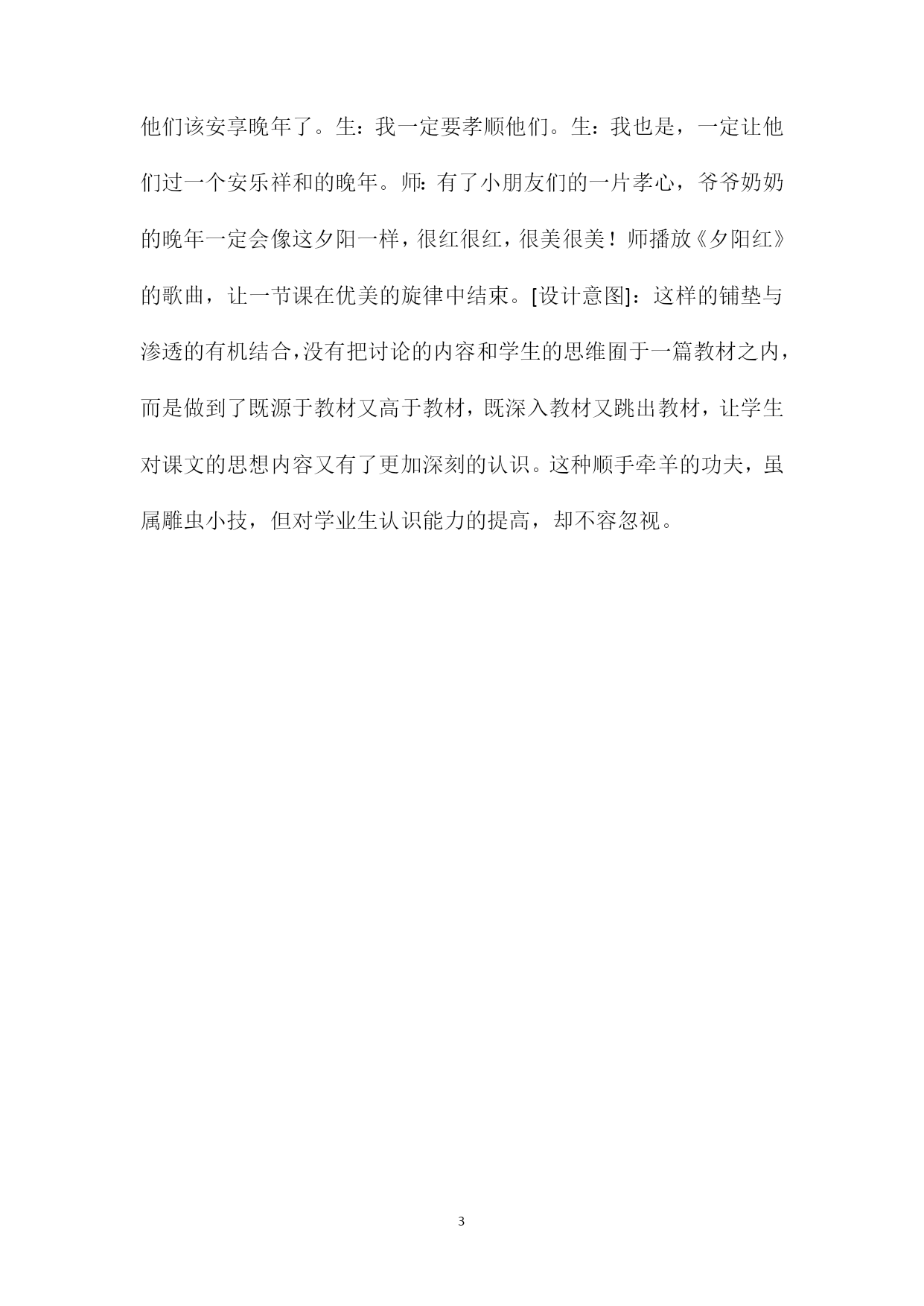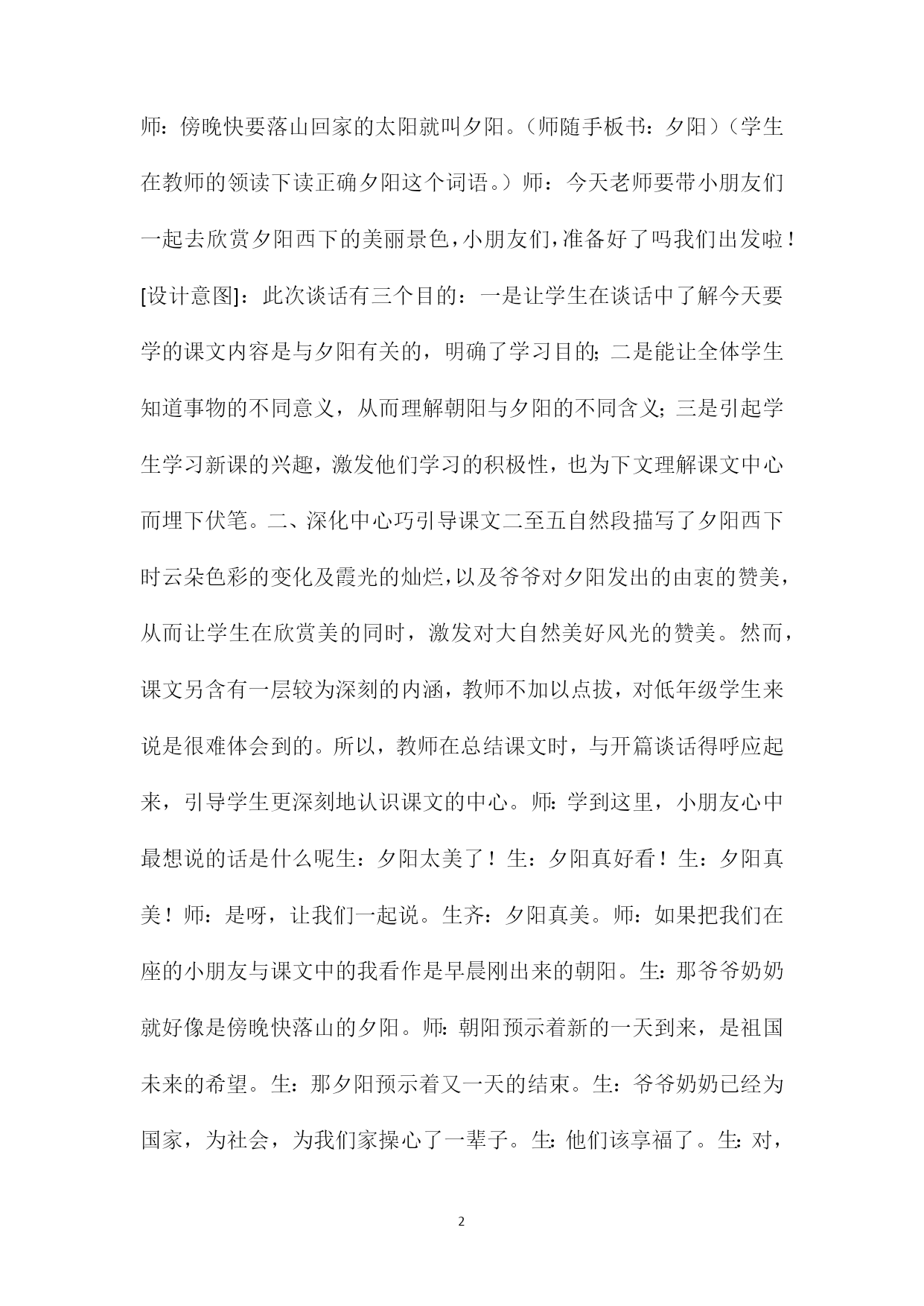 PAGEPAGE3《夕阳真美》教学设计铺垫渗透法教学举隅;;;;《夕阳真美》教学设计八都中心小学吕金明《夕阳真美》是苏教版第三册的第八单元的一篇课文,这篇课文生动地描绘了夕阳西下时天地间壮丽而富有变化的景色,形象的插图,优美的词句,给人以诗中有画,画中有诗的美感。然而,学生在领略文与画的同时,只会感受到文中小作者与爷爷奶奶所看到的夕阳之美与心中的愉悦,并不能体会到爷爷奶奶就正如这眼前夕阳一样,是无限美好的。因此,教师为学生理解课文内涵作一些铺垫与渗透是非常有必要的。一、课前谈话埋伏笔学生在日常生活中,经常看到夕阳西下,满天彩霞之美景,但并不一定能明确地知道:那就是夕阳。针对这种情况,我设计了一段新授前的谈话,为理解下文铺垫。教师用多媒体出示一些日常风景图,有的是拍摄的朝阳美景,有的则是夕阳美景。师:小朋友,老师给大家带来的景色美吗生:很美。师:老师要考考聪明的小朋友,你们发现图片有区别吗生:有的是太阳刚升起来的景色。生:有的是太阳快落山时的景色。师:对呀,小朋友们都是很聪明的,一下子就看出来了。那我们给早晨刚升起来的太阳取个名字,叫做朝阳。(师随手板书:朝阳)(学生在教师的领读下读正确朝阳这个词语)师:傍晚快要落山回家的太阳就叫夕阳。(师随手板书:夕阳)(学生在教师的领读下读正确夕阳这个词语。)师:今天老师要带小朋友们一起去欣赏夕阳西下的美丽景色,小朋友们,准备好了吗我们出发啦![设计意图]:此次谈话有三个目的:一是让学生在谈话中了解今天要学的课文内容是与夕阳有关的,明确了学习目的;二是能让全体学生知道事物的不同意义,从而理解朝阳与夕阳的不同含义;三是引起学生学习新课的兴趣,激发他们学习的积极性,也为下文理解课文中心而埋下伏笔。二、深化中心巧引导课文二至五自然段描写了夕阳西下时云朵色彩的变化及霞光的灿烂,以及爷爷对夕阳发出的由衷的赞美,从而让学生在欣赏美的同时,激发对大自然美好风光的赞美。然而,课文另含有一层较为深刻的内涵,教师不加以点拔,对低年级学生来说是很难体会到的。所以,教师在总结课文时,与开篇谈话得呼应起来,引导学生更深刻地认识课文的中心。师:学到这里,小朋友心中最想说的话是什么呢生:夕阳太美了!生:夕阳真好看!生:夕阳真美!师:是呀,让我们一起说。生齐:夕阳真美。师:如果把我们在座的小朋友与课文中的我看作是早晨刚出来的朝阳。生:那爷爷奶奶就好像是傍晚快落山的夕阳。师:朝阳预示着新的一天到来,是祖国未来的希望。生:那夕阳预示着又一天的结束。生:爷爷奶奶已经为国家,为社会,为我们家操心了一辈子。生:他们该享福了。生:对,他们该安享晚年了。生:我一定要孝顺他们。生:我也是,一定让他们过一个安乐祥和的晚年。师:有了小朋友们的一片孝心,爷爷奶奶的晚年一定会像这夕阳一样,很红很红,很美很美!师播放《夕阳红》的歌曲,让一节课在优美的旋律中结束。[设计意图]:这样的铺垫与渗透的有机结合,没有把讨论的内容和学生的思维囿于一篇教材之内,而是做到了既源于教材又高于教材,既深入教材又跳出教材,让学生对课文的思想内容又有了更加深刻的认识。这种顺手牵羊的功夫,虽属雕虫小技,但对学业生认识能力的提高,却不容忽视。
