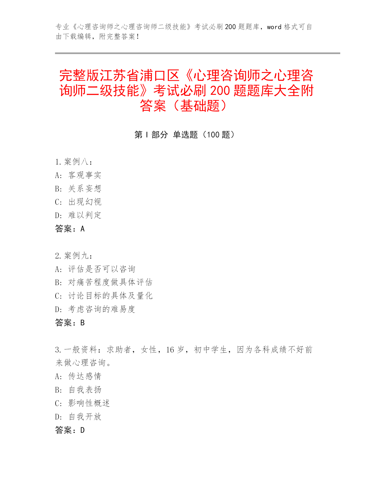 完整版江苏省浦口区《心理咨询师之心理咨询师二级技能》考试必刷200题题库大全附答案(基础题)