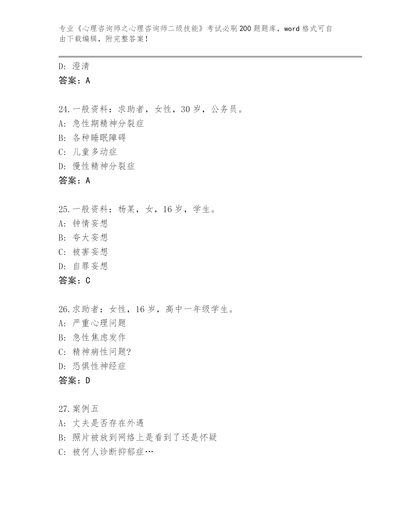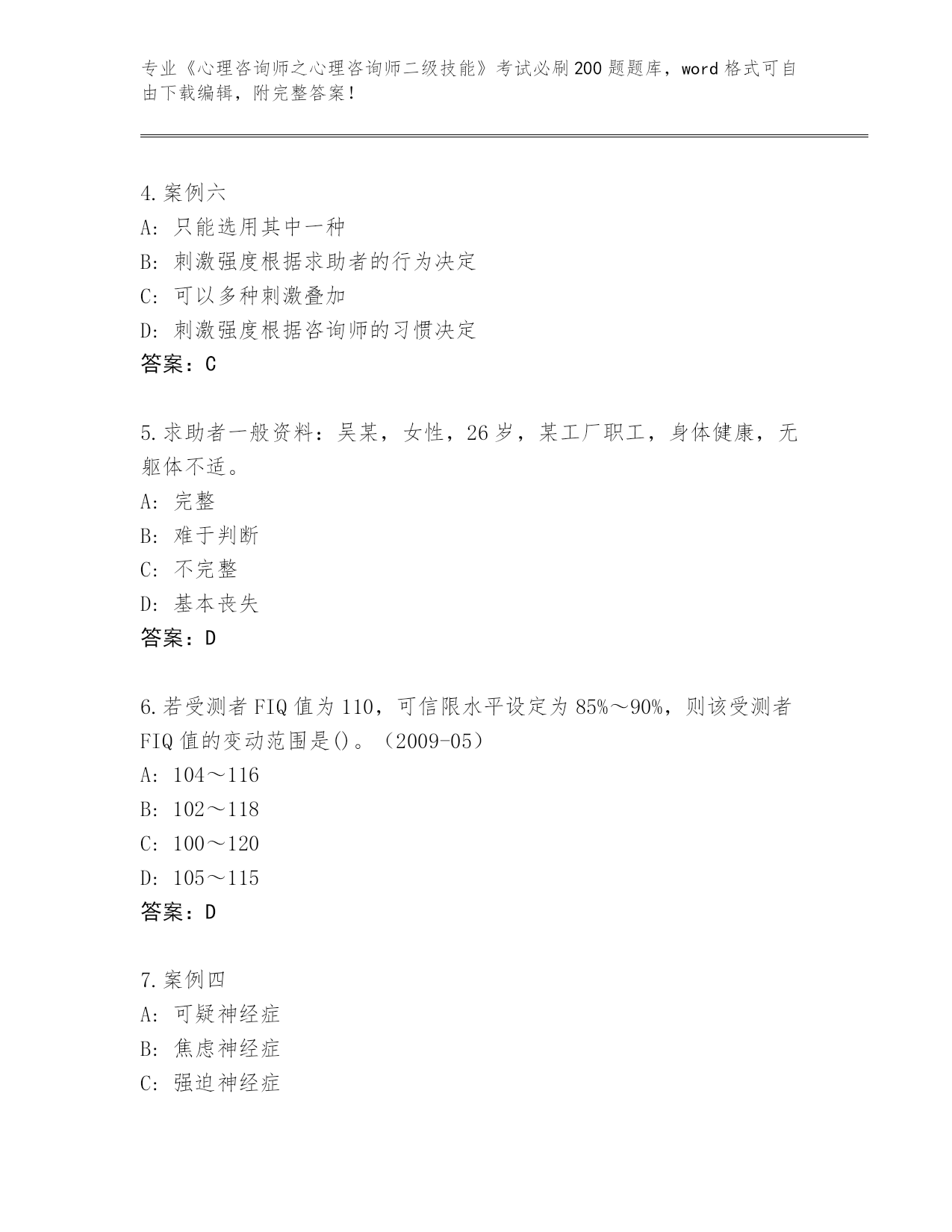 江苏省新吴区2024年《心理咨询师之心理咨询师二级技能》考试必刷200题大全附答案(基础题)