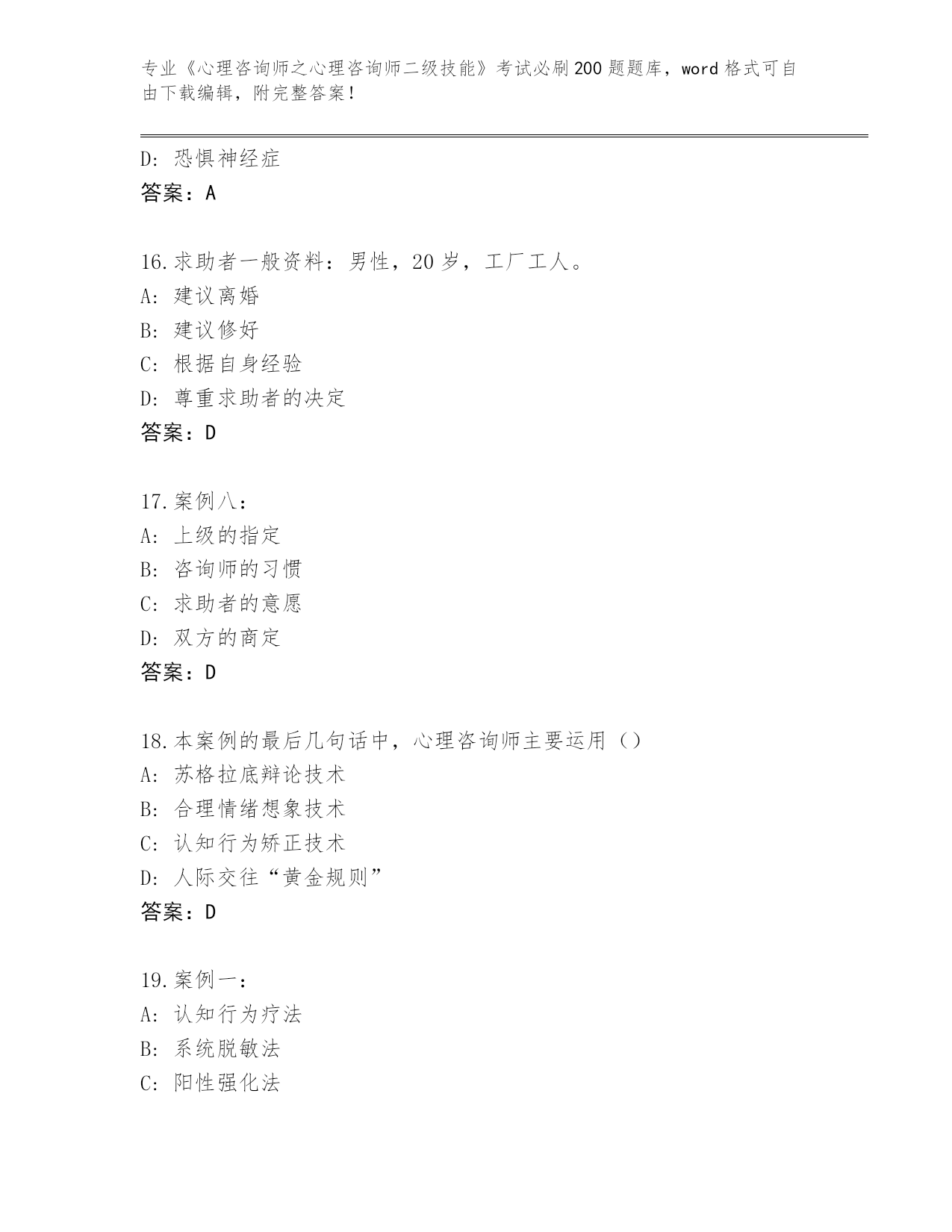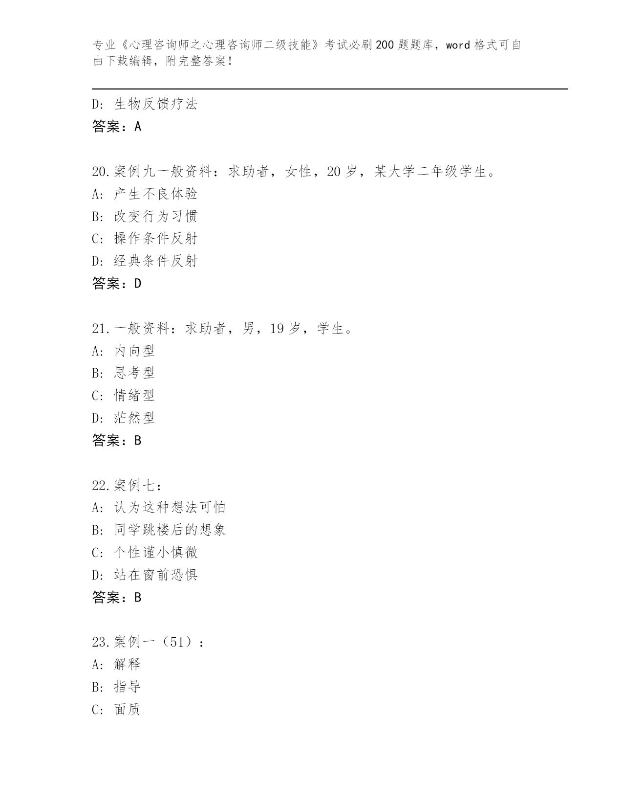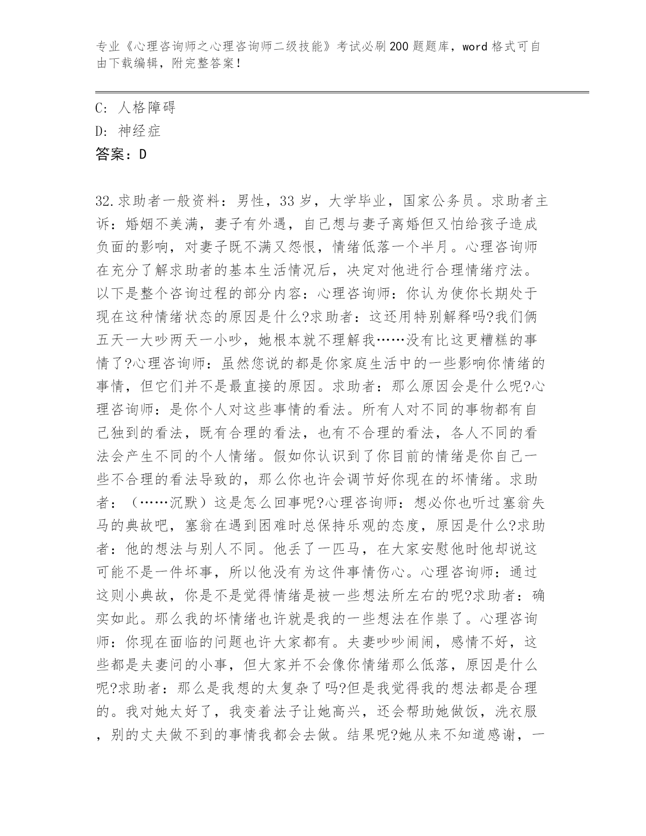江苏省港闸区完整版《心理咨询师之心理咨询师二级技能》考试必刷200题真题题库附解析答案