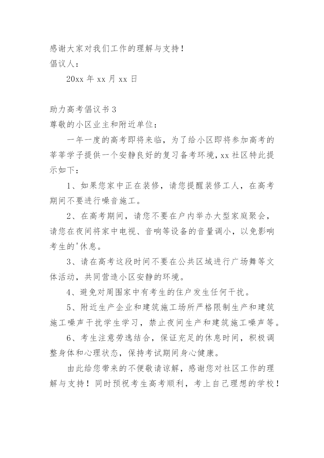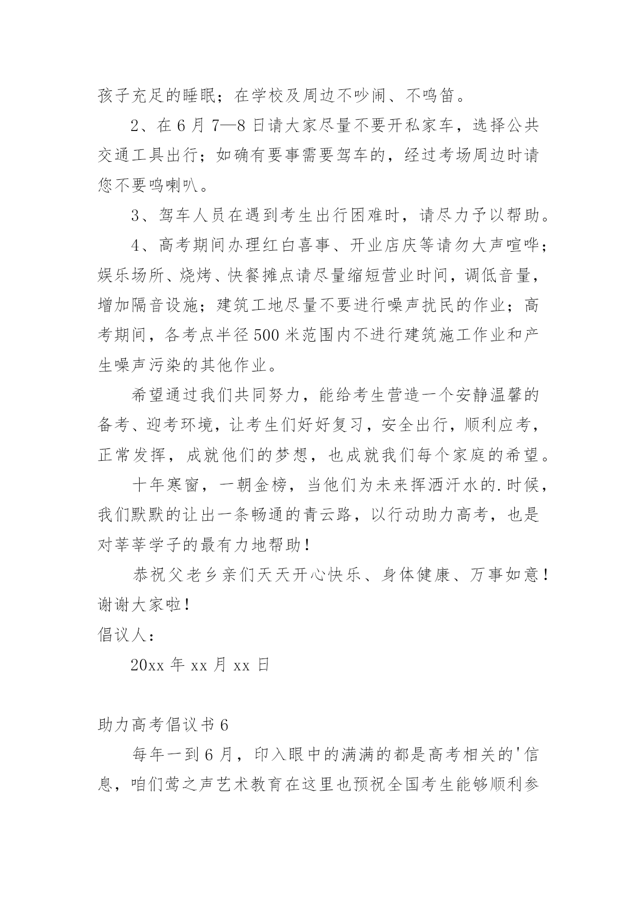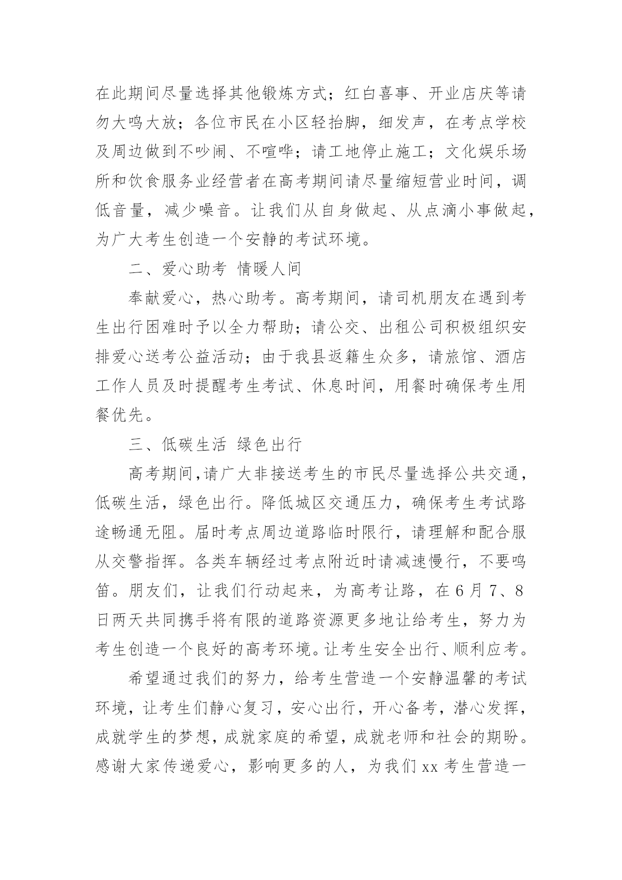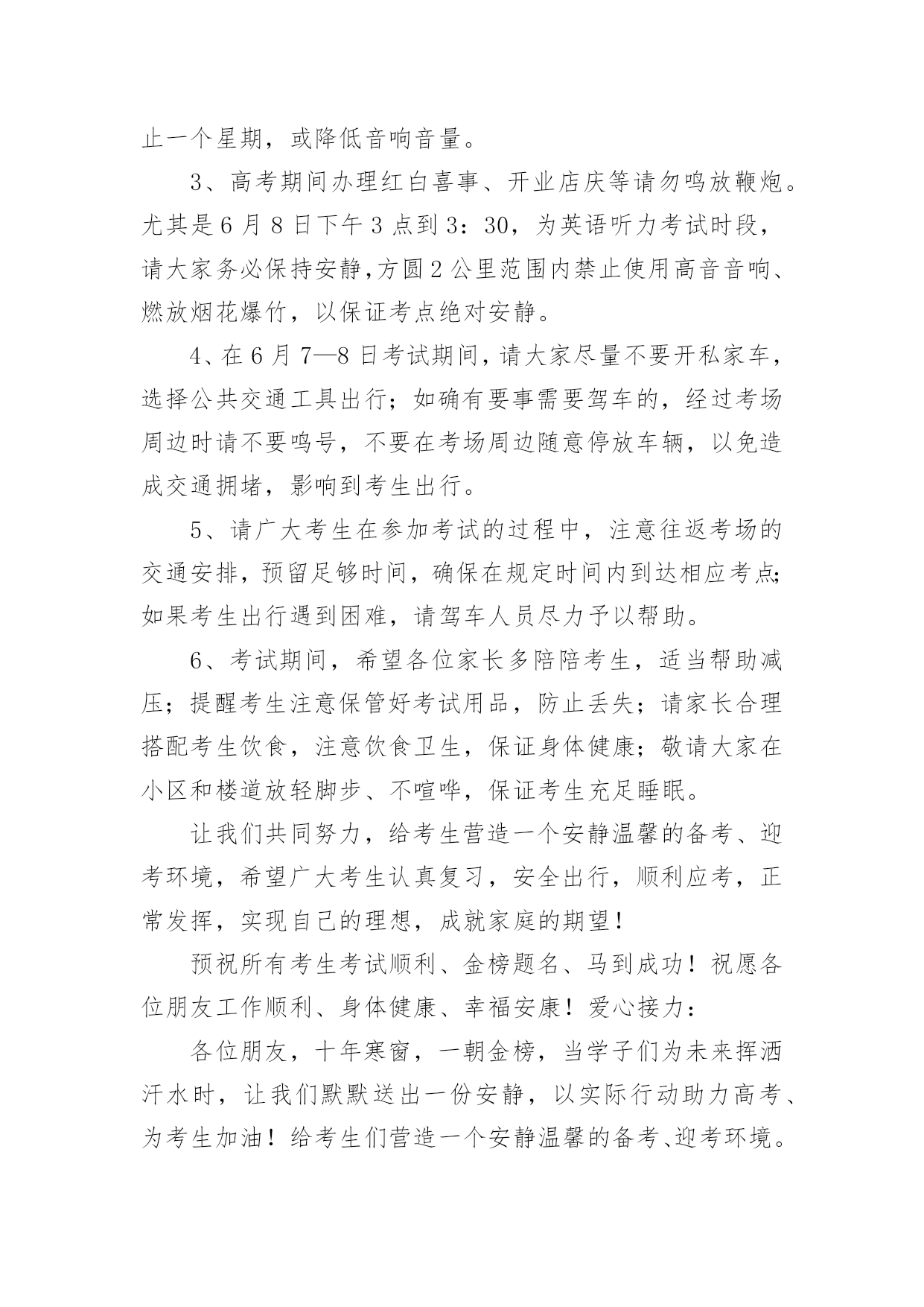 助力高考倡议书在生活中,需要使用倡议书的事情愈发增多,倡议书在写作上具有一定的格式要求。相信写倡议书是一个让许多人都头痛的问题,下面是小编精心整理的助力高考倡议书,仅供参考,希望能够帮助到大家。助力高考倡议书1尊敬的小区业主和附近单位:一年一度的高考即将临,为了给小区即将参加高考的莘莘学子提供一个安静良好的复习备考环境,社区特此提示如下:1、如果您家中正在装修,请您提醒装修工人,在高考期间不要进行噪音施工。2、在高考期间,请您不要在户内举办大型家庭聚会,请您在夜间将家中电视、音响等设备的音量调小,以免影响考生的休息。3、请在高考这段时间不要在公共区域进行广场舞等体活动,共同营造小区安静的环境。4、避免对周围家中有考生的'住户发生任何干扰。5、附近生产企业和建筑施工场所严格限制生产和建筑施工噪声干扰学生学习,禁止夜间生产和建筑施工噪声等。6、考生注意劳逸结合,倡议充足的休息时间。积极调整身体和心理壮态,保持考试期间身心健康。由此给您带的不便敬请谅解,感谢您对社区工作的理解与支持!同时预祝考生高考顺利,考上自己理想的大学!此致敬礼!倡议人:xx20xx年xx月xx日助力高考倡议书2广大市民朋友们:十年寒窗苦读,十年努力拼搏,都将在这个6月开花结果。高考即将来临,这是全县准备参加高考的考生人生的重要时刻,牵动着全县人民的心。为莘莘学子营造一个安静舒适的'学习、考试和休息环境,是家庭、学校、社会共同的责任和义务。为此,作为一个家长,我倡议:1、高考期间,希望您能给自己的爱车放个假,尽量选择步行、自行车或公共交通等绿色方式出行,让出一条高考绿色通道。如必要驾车时,请您绕开考场主干道。考试期间,考点周边的主要交通路段将实行交通管制,请大家服从交警指挥。2、高考期间,请各娱乐场所、饮食摊点尽量缩短营业时间、并调低音量;建筑工地不要进行噪声扰民作业。各考点半径500米范围内不进行建筑施工和其他产生噪声污染的作业。高考期间,跳广场舞的大妈、大叔们,希望你们能停止一个星期,或降低音响音量。3、高考期间办理红白喜事、开业店庆等请勿鸣放鞭炮。尤其是6月8日下午3点到3:30,为英语听力考试时段,请大家务必保持安静,方圆2公里范围内禁止使用高音音响、燃放烟花爆竹,以保证考点绝对安静。4、在6月7—8日考试期间,请大家尽量不要开私家车,选择公共交通工具出行;如确有要事需要驾车的,经过考场周边时请不要鸣号,不要在考场周边随意停放车辆,以免造成交通拥堵,影响到考生出行。5、请广大考生在参加考试的过程中,注意往返考场的交通安排,预留足够时间,确保在规定时间内到达相应考点;如果考生出行遇到困难,请驾车人员尽力予以帮助。6、考试期间,希望各位家长多陪陪考生,适当帮助减压;提醒考生注意保管好考试用品,防止丢失;请家长合理搭配考生饮食,注意饮食卫生,保证身体健康;敬请大家在小区和楼道放轻脚步、不喧哗,保证考生充足睡眠。让我们共同努力,给考生营造一个安静温馨的备考、迎考环境,希望广大考生认真复习,安全出行,顺利应考,正常发挥,实现自己的理想,成就家庭的期望!预祝所有考生考试顺利、金榜题名、马到成功!祝愿各位朋友工作顺利、身体健康、幸福安康!爱心接力:各位朋友,十年寒窗,一朝金榜,当学子们为未来挥洒汗水时,让我们默默送出一份安静,以实际行动助力高考、为考生加油!给考生们营造一个安静温馨的备考、迎考环境。感谢大家对我们工作的理解与支持!倡议人:20xx年xx月xx日助力高考倡议书3尊敬的小区业主和附近单位:一年一度的高考即将来临,为了给小区即将参加高考的莘莘学子提供一个安静良好的复习备考环境,xx社区特此提示如下:1、如果您家中正在装修,请您提醒装修工人,在高考期间不要进行噪音施工。2、在高考期间,请您不要在户内举办大型家庭聚会,请您在夜间将家中电视、音响等设备的音量调小,以免影响考生的'休息。3、请在高考这段时间不要在公共区域进行广场舞等文体活动,共同营造小区安静的环境。4、避免对周围家中有考生的住户发生任何干扰。5、附近生产企业和建筑施工场所严格限制生产和建筑施工噪声干扰学生学习,禁止夜间生产和建筑施工噪声等。6、考生注意劳逸结合,保证充足的休息时间,积极调整身体和心理状态,保持考试期间身心健康。由此给您带来的不便敬请谅解,感谢您对社区工作的理解与支持!同时预祝考生高考顺利,考上自己理想的学校!助力高考倡议书4全县广大市民朋友们:一年一度的高考即将来临,这是所有学子人生中重要时刻,牵动着千万人的心,莘莘学子们正在为自己的梦想进行最后的努力。“十年寒窗磨一剑,只待今朝问鼎时”,给莘莘学子营造一个安静舒适的学习、考试和休息环境,是每个家庭、学校和社会公众共同的责任和义务!为确保考生能够在舒适的环境中打好最后的“攻坚战”,xx团县委向广大人民群众提出如下倡议:1、广大私家