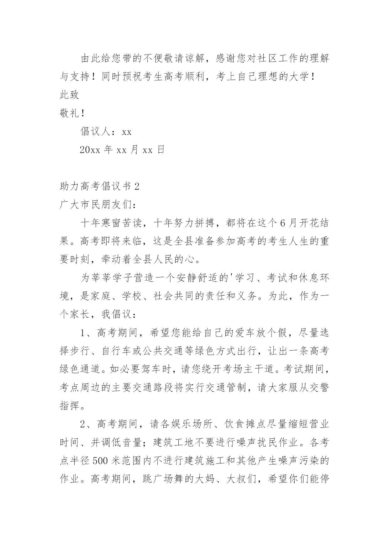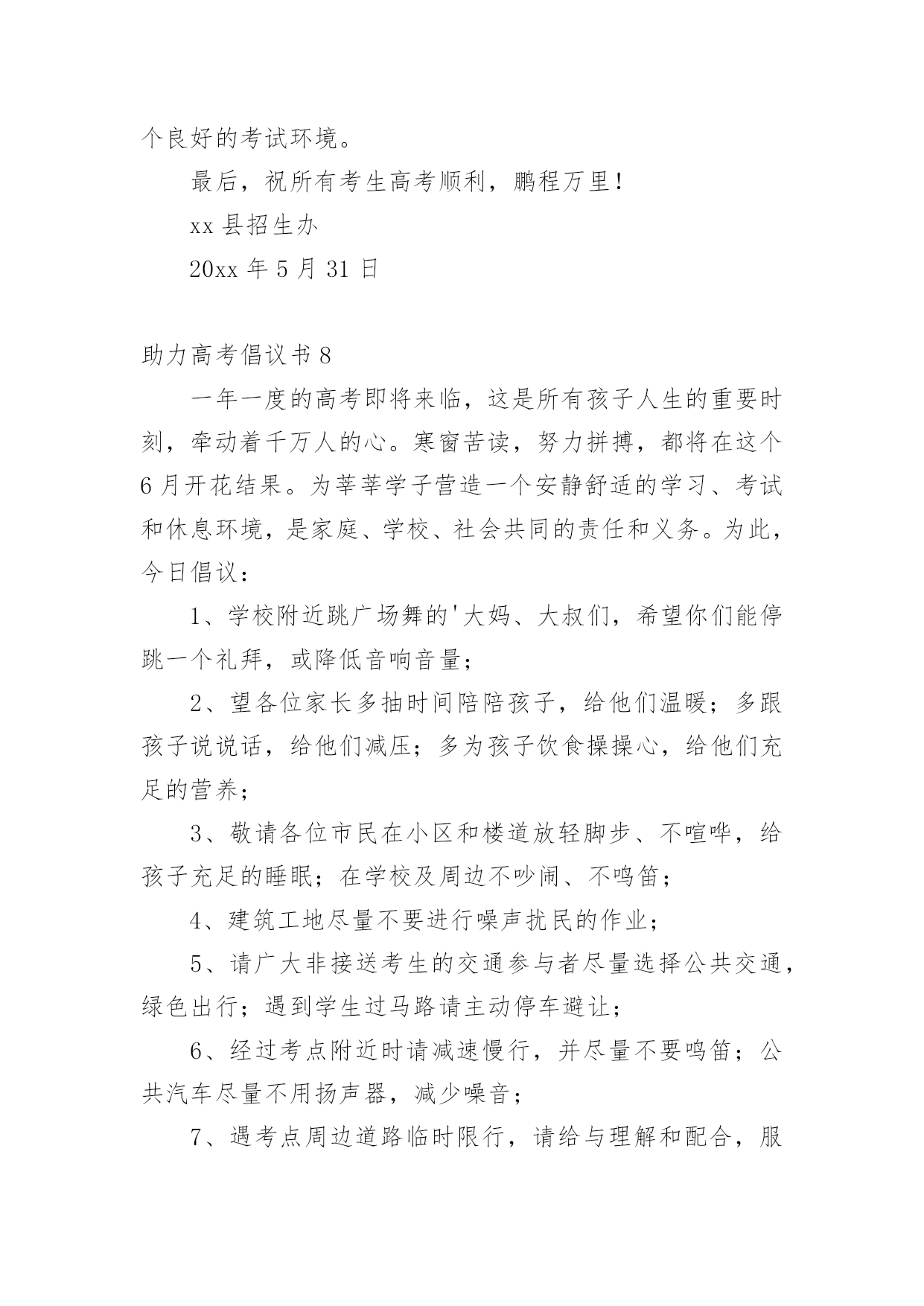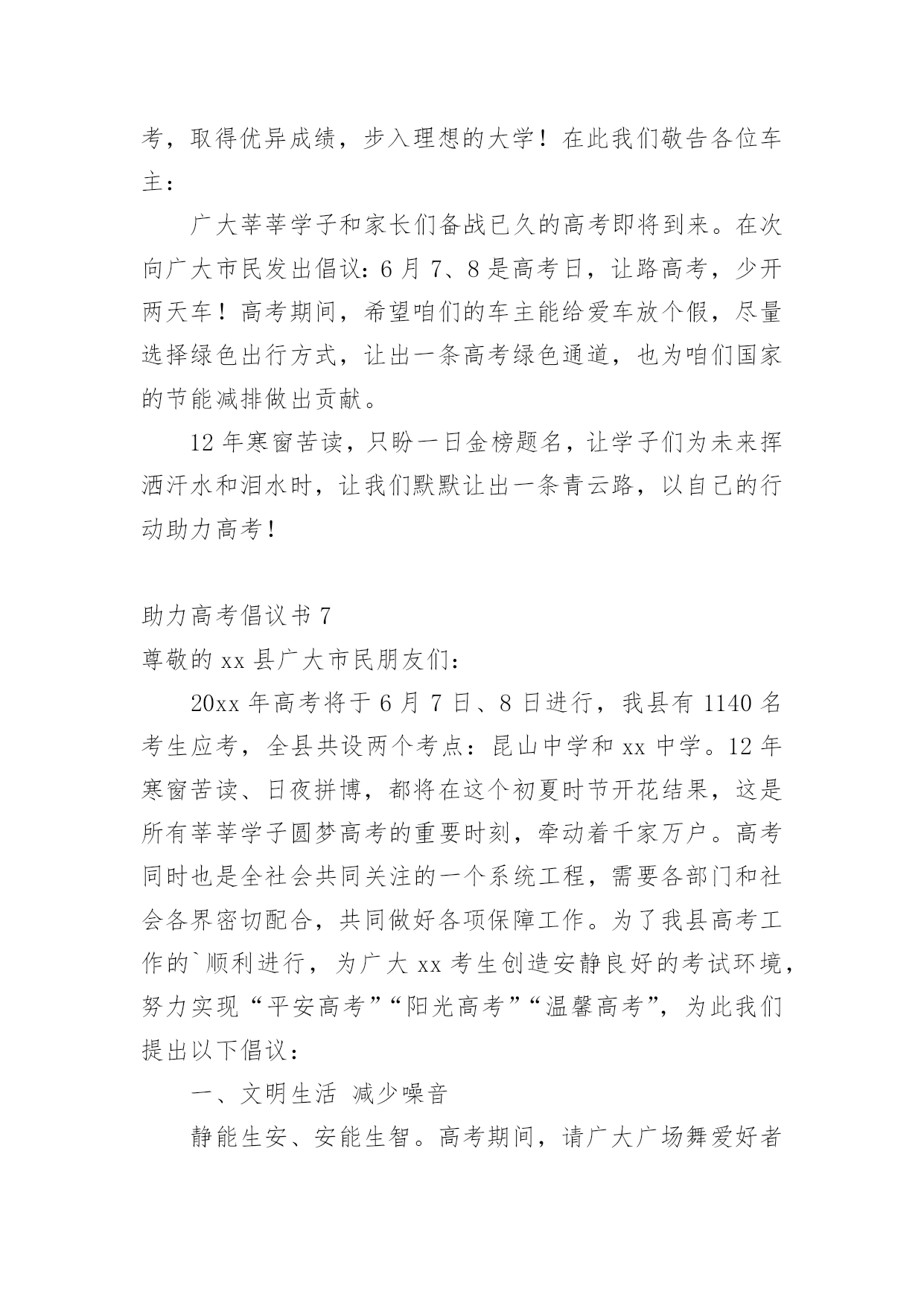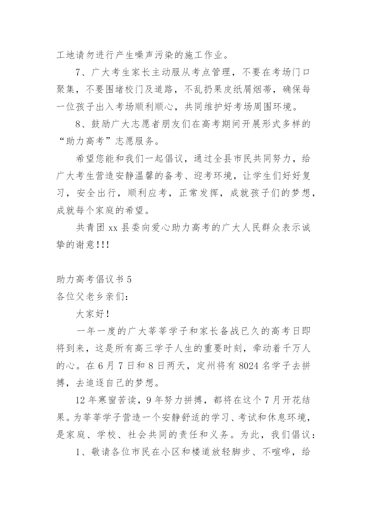 助力高考倡议书在生活中,需要使用倡议书的事情愈发增多,倡议书在写作上具有一定的格式要求。相信写倡议书是一个让许多人都头痛的问题,下面是小编精心整理的助力高考倡议书,仅供参考,希望能够帮助到大家。助力高考倡议书1尊敬的小区业主和附近单位:一年一度的高考即将临,为了给小区即将参加高考的莘莘学子提供一个安静良好的复习备考环境,社区特此提示如下:1、如果您家中正在装修,请您提醒装修工人,在高考期间不要进行噪音施工。2、在高考期间,请您不要在户内举办大型家庭聚会,请您在夜间将家中电视、音响等设备的音量调小,以免影响考生的休息。3、请在高考这段时间不要在公共区域进行广场舞等体活动,共同营造小区安静的环境。4、避免对周围家中有考生的'住户发生任何干扰。5、附近生产企业和建筑施工场所严格限制生产和建筑施工噪声干扰学生学习,禁止夜间生产和建筑施工噪声等。6、考生注意劳逸结合,倡议充足的休息时间。积极调整身体和心理壮态,保持考试期间身心健康。由此给您带的不便敬请谅解,感谢您对社区工作的理解与支持!同时预祝考生高考顺利,考上自己理想的大学!此致敬礼!倡议人:xx20xx年xx月xx日助力高考倡议书2广大市民朋友们:十年寒窗苦读,十年努力拼搏,都将在这个6月开花结果。高考即将来临,这是全县准备参加高考的考生人生的重要时刻,牵动着全县人民的心。为莘莘学子营造一个安静舒适的'学习、考试和休息环境,是家庭、学校、社会共同的责任和义务。为此,作为一个家长,我倡议:1、高考期间,希望您能给自己的爱车放个假,尽量选择步行、自行车或公共交通等绿色方式出行,让出一条高考绿色通道。如必要驾车时,请您绕开考场主干道。考试期间,考点周边的主要交通路段将实行交通管制,请大家服从交警指挥。2、高考期间,请各娱乐场所、饮食摊点尽量缩短营业时间、并调低音量;建筑工地不要进行噪声扰民作业。各考点半径500米范围内不进行建筑施工和其他产生噪声污染的作业。高考期间,跳广场舞的大妈、大叔们,希望你们能停止一个星期,或降低音响音量。3、高考期间办理红白喜事、开业店庆等请勿鸣放鞭炮。尤其是6月8日下午3点到3:30,为英语听力考试时段,请大家务必保持安静,方圆2公里范围内禁止使用高音音响、燃放烟花爆竹,以保证考点绝对安静。4、在6月7—8日考试期间,请大家尽量不要开私家车,选择公共交通工具出行;如确有要事需要驾车的,经过考场周边时请不要鸣号,不要在考场周边随意停放车辆,以免造成交通拥堵,影响到考生出行。5、请广大考生在参加考试的过程中,注意往返考场的交通安排,预留足够时间,确保在规定时间内到达相应考点;如果考生出行遇到困难,请驾车人员尽力予以帮助。6、考试期间,希望各位家长多陪陪考生,适当帮助减压;提醒考生注意保管好考试用品,防止丢失;请家长合理搭配考生饮食,注意饮食卫生,保证身体健康;敬请大家在小区和楼道放轻脚步、不喧哗,保证考生充足睡眠。让我们共同努力,给考生营造一个安静温馨的备考、迎考环境,希望广大考生认真复习,安全出行,顺利应考,正常发挥,实现自己的理想,成就家庭的期望!预祝所有考生考试顺利、金榜题名、马到成功!祝愿各位朋友工作顺利、身体健康、幸福安康!爱心接力:各位朋友,十年寒窗,一朝金榜,当学子们为未来挥洒汗水时,让我们默默送出一份安静,以实际行动助力高考、为考生加油!给考生们营造一个安静温馨的备考、迎考环境。感谢大家对我们工作的理解与支持!倡议人:20xx年xx月xx日助力高考倡议书3尊敬的小区业主和附近单位:一年一度的高考即将来临,为了给小区即将参加高考的莘莘学子提供一个安静良好的复习备考环境,xx社区特此提示如下:1、如果您家中正在装修,请您提醒装修工人,在高考期间不要进行噪音施工。2、在高考期间,请您不要在户内举办大型家庭聚会,请您在夜间将家中电视、音响等设备的音量调小,以免影响考生的'休息。3、请在高考这段时间不要在公共区域进行广场舞等文体活动,共同营造小区安静的环境。4、避免对周围家中有考生的住户发生任何干扰。5、附近生产企业和建筑施工场所严格限制生产和建筑施工噪声干扰学生学习,禁止夜间生产和建筑施工噪声等。6、考生注意劳逸结合,保证充足的休息时间,积极调整身体和心理状态,保持考试期间身心健康。由此给您带来的不便敬请谅解,感谢您对社区工作的理解与支持!同时预祝考生高考顺利,考上自己理想的学校!助力高考倡议书4全县广大市民朋友们:一年一度的高考即将来临,这是所有学子人生中重要时刻,牵动着千万人的心,莘莘学子们正在为自己的梦想进行最后的努力。“十年寒窗磨一剑,只待今朝问鼎时”,给莘莘学子营造一个安静舒适的学习、考试和休息环境,是每个家庭、学校和社会公众共同的责任和义务!为确保考生能够在舒适的环境中打好最后的“攻坚战”,xx团县委向广大人民群众提出如下倡议:1、广大私家