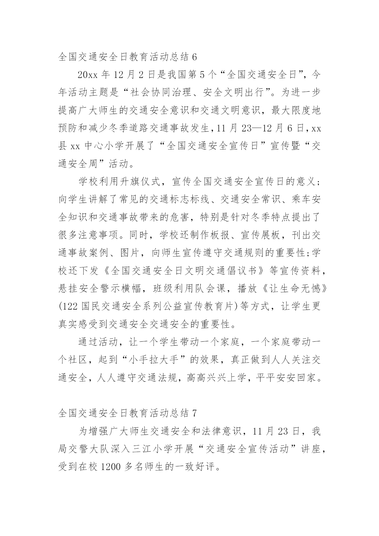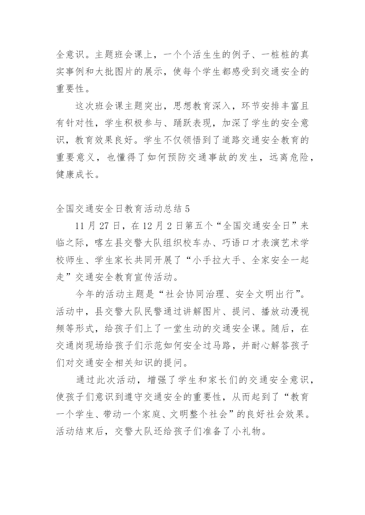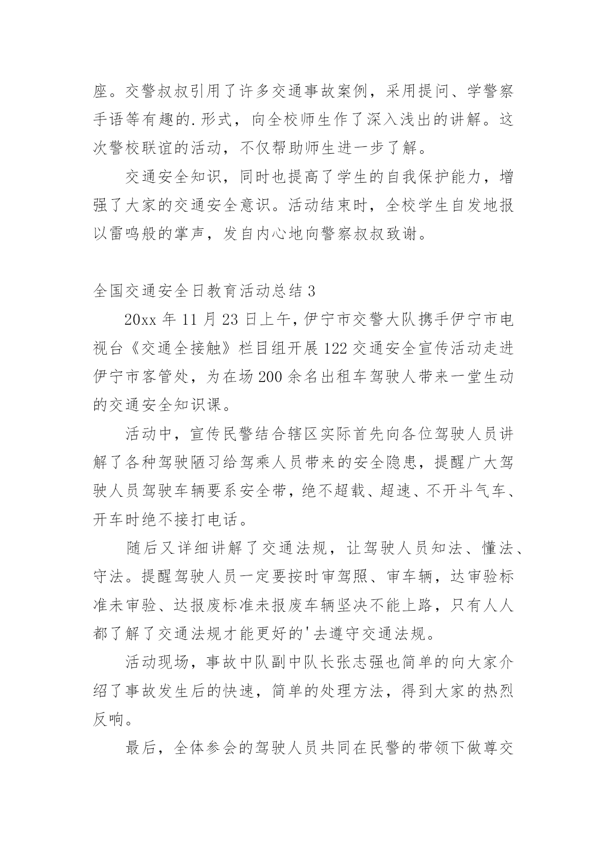 全国交通安全日教育活动总结总结是对过去一定时期的工作、学习或思想情况进行回顾、分析,并做出客观评价的书面材料,通过它可以全面地、系统地了解以往的学习和工作情况,不妨让我们认真地完成总结吧。你想知道总结怎么写吗?以下是小编精心整理的全国交通安全日教育活动总结,希望对大家有所帮助。全国交通安全日教育活动总结1在第—个122全国交通安全日到来之际,邯郸市交警渚河大队围绕社会协同治理、安全文明出行的宣传主题,在丛台公园门口开展了讲公德、讲礼貌,争做文明行车人的交通安全宣传活动,倡导大家共同维护道路交通环境。活动中,民警走上街头,利用交通安全宣传车、放置展板、发放宣传材料等形式,结合当前重点交通违法行为及交通事故案例,向过往群众讲述交通安全的重要性,并发放宣传材料500余份,为群众提供违章查询、易堵路段讲解、事故e处理等方便查询、处理的渠道,并耐心解答群众提出的各类问题,进一步提高群众交通安全意识。交警渚河大队还邀请了车辆维修人员参与到活动中来,为群众提供专业的车辆维修及保养知识,受到了市民的欢迎。全国交通安全日教育活动总结2生命弥足珍贵,安全提供保障。安全维系着社会的稳定,牵动着家庭的幸福,关系着未成年学生的健康成长。根据教委文件精神,书院小学有计划地开展了“增强交通安全意识,提高自我保护能力”为主题的交通安全教育活动,在全校师生中掀起学习交通知识,规范交通行为,遵守交通规则的热潮。一、领导高度重视,师生员工积极行动升国旗时,书院小学召开交通安全教育动员会,会上刘校长引用活生生的事例,阐述了交通安全的重要性,号召全校师生积极行动,自觉了解交通安全常识,自觉规范自己的交通行为,提高自我保护能力,在遵守交通规则方面为社会做出表率。由于领导的高度重视,大力宣传,书院小学全体师生员工积极响应,拉开了交通安全教育活动的序幕,学校利用课间操、队会课等时间以《道路交通安全法》、《中小学生走路、骑车、乘车安全知识读本》等为蓝本,认真学习有关法规条例。二、开展特色活动,增强交通安全意识学校大队部在校园举行《道路交通安全常识》图片展,积极营造良好氛围,各中队根据学生年龄特点,开展学生乐于参加的活动,让学生在活动中学习,在活动中受教育。具体安排是办好一期“安全版报”,开展一次“交通安全”主题队会。三、规范交通行为,提高自我保护能力书院小学邀请了交警队的王雄队长,在学校校园内为全校师生作了别开生面的“交通安全知识及自我保护”主题讲座。交警叔叔引用了许多交通事故案例,采用提问、学警察手语等有趣的.形式,向全校师生作了深入浅出的讲解。这次警校联谊的活动,不仅帮助师生进一步了解。交通安全知识,同时也提高了学生的自我保护能力,增强了大家的交通安全意识。活动结束时,全校学生自发地报以雷鸣般的掌声,发自内心地向警察叔叔致谢。全国交通安全日教育活动总结320xx年11月23日上午,伊宁市交警大队携手伊宁市电视台《交通全接触》栏目组开展122交通安全宣传活动走进伊宁市客管处,为在场200余名出租车驾驶人带来一堂生动的交通安全知识课。活动中,宣传民警结合辖区实际首先向各位驾驶人员讲解了各种驾驶陋习给驾乘人员带来的安全隐患,提醒广大驾驶人员驾驶车辆要系安全带,绝不超载、超速、不开斗气车、开车时绝不接打电话。随后又详细讲解了交通法规,让驾驶人员知法、懂法、守法。提醒驾驶人员一定要按时审驾照、审车辆,达审验标准未审验、达报废标准未报废车辆坚决不能上路,只有人人都了解了交通法规才能更好的'去遵守交通法规。活动现场,事故中队副中队长张志强也简单的向大家介绍了事故发生后的快速,简单的处理方法,得到大家的热烈反响。最后,全体参会的驾驶人员共同在民警的带领下做尊交规守交法的宣誓,保证以后文明行车,安全行驶,全民共创交通安全文明伊宁。全国交通安全日教育活动总结4随着经济的日益发展,我们大地球母亲已变得越来越美丽,马路上车辆川流不息的景象随处可见。然而由于有些人交通安全意识的淡薄,在车水马龙的马路上演了一幕幕不可挽回的悲剧。目前全国各地屡屡发生的学生安全事故,让我们痛定思痛,倍感对广大同学进行安全教育的必要性和紧迫性。为了增强学生的交通安全观念,提高学生的交通安全意识,培养学生良好文明的交通行为习惯,根据我校的实际情况,学校决定从交通安全常识方面对同学们进行较为系统的安全教育,让全体同学都树立起安全防范意识。小学特组织各班开展了交通安全教育主题班会活动。班会从学生行走安全、骑车安全、乘车安全等方面对学生进行交通安全教育。老师先组织学生共同观看了中小学生交通安全知识教育宣传片,以直观的手段,让学生懂得了过马路时一定要走人行横道线、要遵守交通信号灯、行人靠右走、千万不能在马路上玩耍,大家都看得非常认真,听得非常仔细。接下来让同学们上台讲述自己搜集到的关于安全事故的一些资料,通过这一件件血的教训,