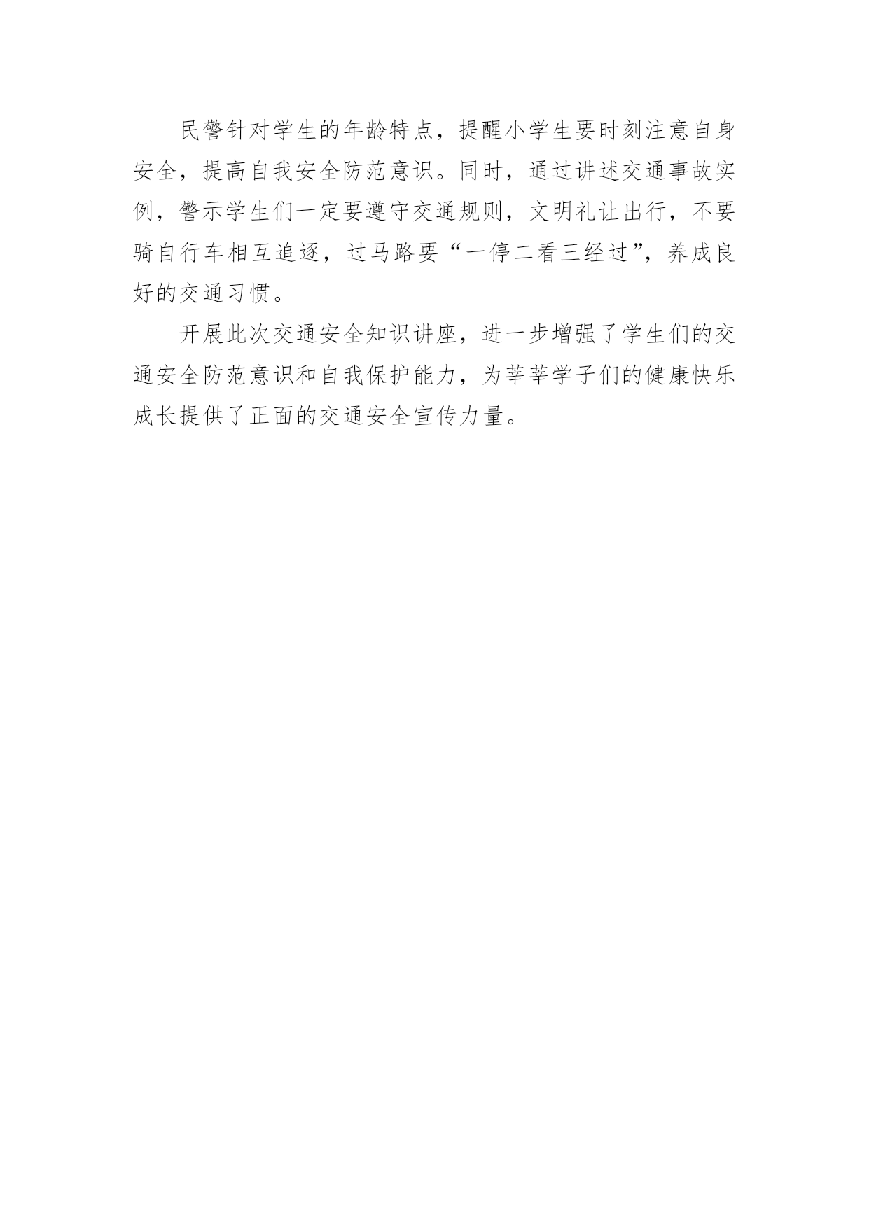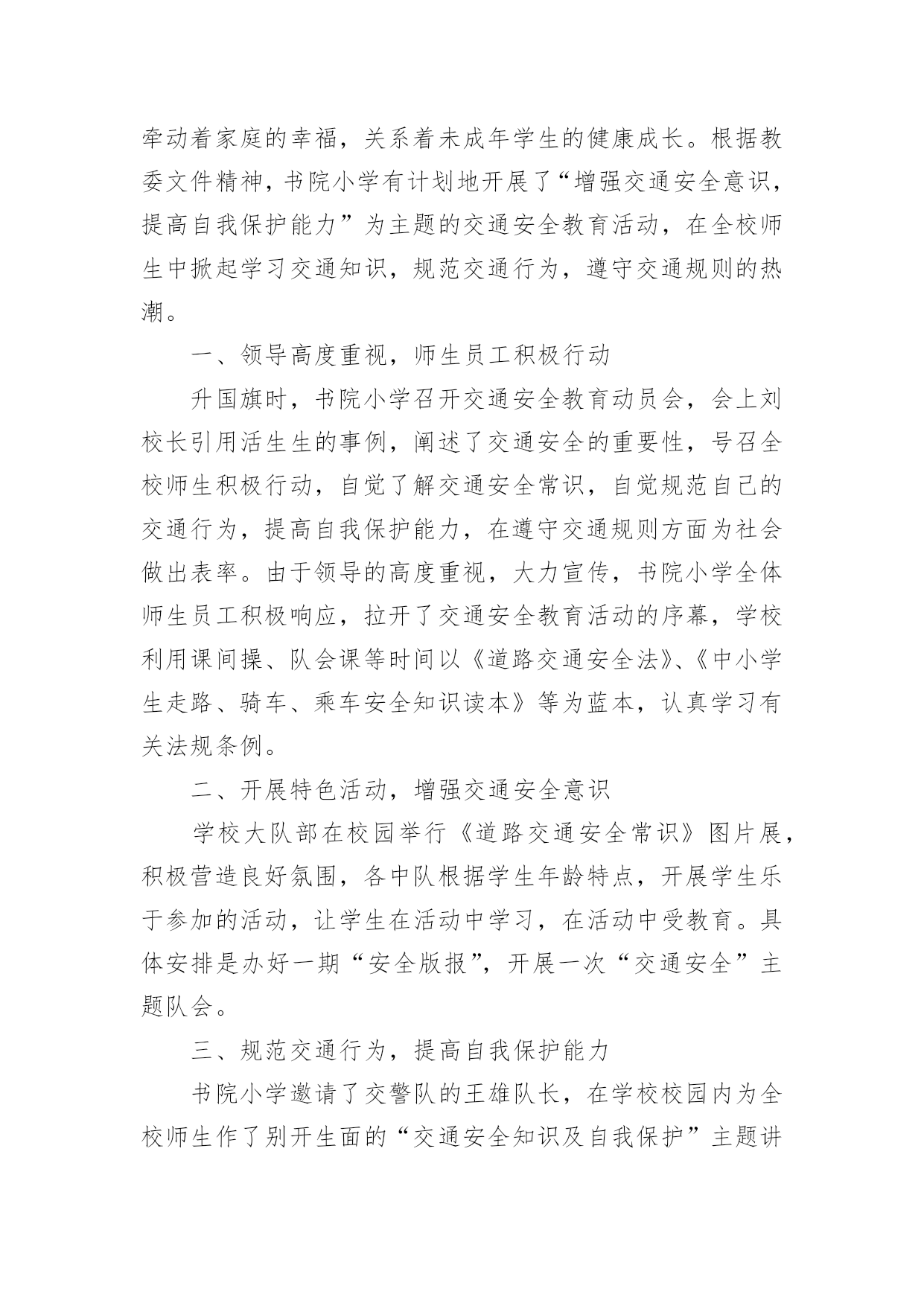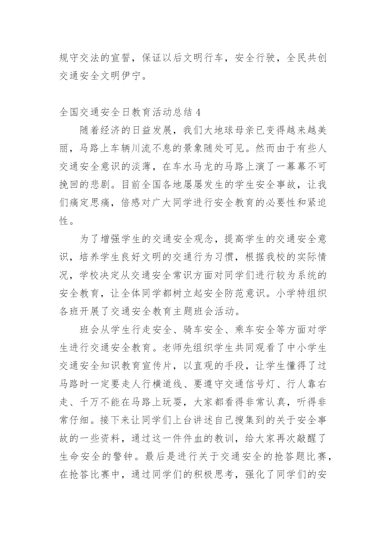 全国交通安全日教育活动总结总结是对过去一定时期的工作、学习或思想情况进行回顾、分析,并做出客观评价的书面材料,通过它可以全面地、系统地了解以往的学习和工作情况,不妨让我们认真地完成总结吧。你想知道总结怎么写吗?以下是小编精心整理的全国交通安全日教育活动总结,希望对大家有所帮助。全国交通安全日教育活动总结1在第—个122全国交通安全日到来之际,邯郸市交警渚河大队围绕社会协同治理、安全文明出行的宣传主题,在丛台公园门口开展了讲公德、讲礼貌,争做文明行车人的交通安全宣传活动,倡导大家共同维护道路交通环境。活动中,民警走上街头,利用交通安全宣传车、放置展板、发放宣传材料等形式,结合当前重点交通违法行为及交通事故案例,向过往群众讲述交通安全的重要性,并发放宣传材料500余份,为群众提供违章查询、易堵路段讲解、事故e处理等方便查询、处理的渠道,并耐心解答群众提出的各类问题,进一步提高群众交通安全意识。交警渚河大队还邀请了车辆维修人员参与到活动中来,为群众提供专业的车辆维修及保养知识,受到了市民的欢迎。全国交通安全日教育活动总结2生命弥足珍贵,安全提供保障。安全维系着社会的稳定,牵动着家庭的幸福,关系着未成年学生的健康成长。根据教委文件精神,书院小学有计划地开展了“增强交通安全意识,提高自我保护能力”为主题的交通安全教育活动,在全校师生中掀起学习交通知识,规范交通行为,遵守交通规则的热潮。一、领导高度重视,师生员工积极行动升国旗时,书院小学召开交通安全教育动员会,会上刘校长引用活生生的事例,阐述了交通安全的重要性,号召全校师生积极行动,自觉了解交通安全常识,自觉规范自己的交通行为,提高自我保护能力,在遵守交通规则方面为社会做出表率。由于领导的高度重视,大力宣传,书院小学全体师生员工积极响应,拉开了交通安全教育活动的序幕,学校利用课间操、队会课等时间以《道路交通安全法》、《中小学生走路、骑车、乘车安全知识读本》等为蓝本,认真学习有关法规条例。二、开展特色活动,增强交通安全意识学校大队部在校园举行《道路交通安全常识》图片展,积极营造良好氛围,各中队根据学生年龄特点,开展学生乐于参加的活动,让学生在活动中学习,在活动中受教育。具体安排是办好一期“安全版报”,开展一次“交通安全”主题队会。三、规范交通行为,提高自我保护能力书院小学邀请了交警队的王雄队长,在学校校园内为全校师生作了别开生面的“交通安全知识及自我保护”主题讲座。交警叔叔引用了许多交通事故案例,采用提问、学警察手语等有趣的.形式,向全校师生作了深入浅出的讲解。这次警校联谊的活动,不仅帮助师生进一步了解。交通安全知识,同时也提高了学生的自我保护能力,增强了大家的交通安全意识。活动结束时,全校学生自发地报以雷鸣般的掌声,发自内心地向警察叔叔致谢。全国交通安全日教育活动总结320xx年11月23日上午,伊宁市交警大队携手伊宁市电视台《交通全接触》栏目组开展122交通安全宣传活动走进伊宁市客管处,为在场200余名出租车驾驶人带来一堂生动的交通安全知识课。活动中,宣传民警结合辖区实际首先向各位驾驶人员讲解了各种驾驶陋习给驾乘人员带来的安全隐患,提醒广大驾驶人员驾驶车辆要系安全带,绝不超载、超速、不开斗气车、开车时绝不接打电话。随后又详细讲解了交通法规,让驾驶人员知法、懂法、守法。提醒驾驶人员一定要按时审驾照、审车辆,达审验标准未审验、达报废标准未报废车辆坚决不能上路,只有人人都了解了交通法规才能更好的'去遵守交通法规。活动现场,事故中队副中队长张志强也简单的向大家介绍了事故发生后的快速,简单的处理方法,得到大家的热烈反响。最后,全体参会的驾驶人员共同在民警的带领下做尊交规守交法的宣誓,保证以后文明行车,安全行驶,全民共创交通安全文明伊宁。全国交通安全日教育活动总结4随着经济的日益发展,我们大地球母亲已变得越来越美丽,马路上车辆川流不息的景象随处可见。然而由于有些人交通安全意识的淡薄,在车水马龙的马路上演了一幕幕不可挽回的悲剧。目前全国各地屡屡发生的学生安全事故,让我们痛定思痛,倍感对广大同学进行安全教育的必要性和紧迫性。为了增强学生的交通安全观念,提高学生的交通安全意识,培养学生良好文明的交通行为习惯,根据我校的实际情况,学校决定从交通安全常识方面对同学们进行较为系统的安全教育,让全体同学都树立起安全防范意识。小学特组织各班开展了交通安全教育主题班会活动。班会从学生行走安全、骑车安全、乘车安全等方面对学生进行交通安全教育。老师先组织学生共同观看了中小学生交通安全知识教育宣传片,以直观的手段,让学生懂得了过马路时一定要走人行横道线、要遵守交通信号灯、行人靠右走、千万不能在马路上玩耍,大家都看得非常认真,听得非常仔细。接下来让同学们上台讲述自己搜集到的关于安全事故的一些资料,通过这一件件血的教训,