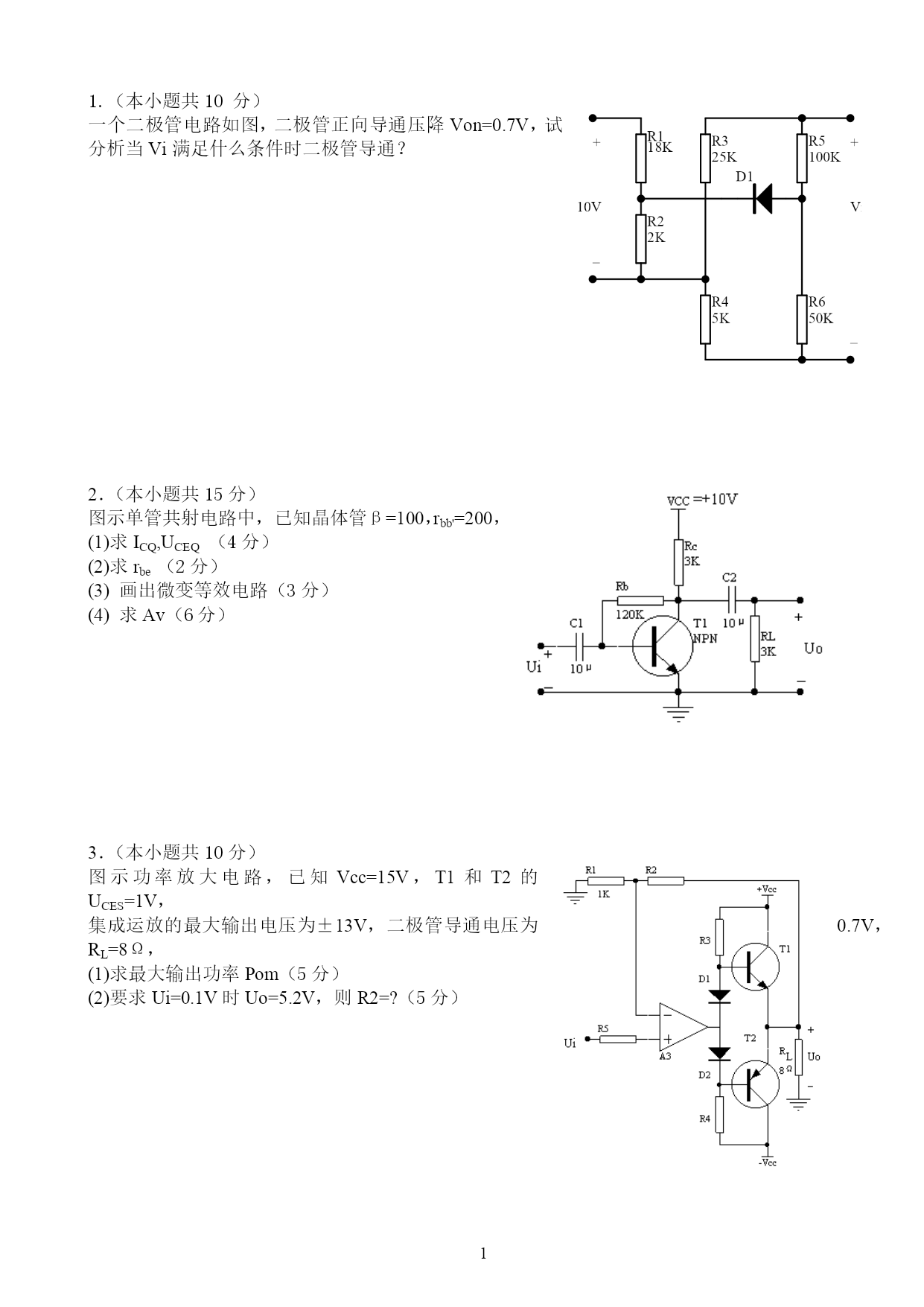 1.(本小题共10分)一个二极管电路如图,二极管正向导通压降Von=0.7V,试分析当Vi满足什么条件时二极管导通?2.(本小题共15分)图示单管共射电路中,已知晶体管β=100,rbb'=200,(1)求ICQ,UCEQ(4分)(2)求rbe(2分)(3)画出微变等效电路(3分)(4)求Av(6分)3.(本小题共10分)图示功率放大电路,已知Vcc=15V,T1和T2的UCES=1V,集成运放的最大输出电压为±13V,二极管导通电压为0.7V,RL=8Ω,(1)求最大输出功率Pom(5分)(2)要求Ui=0.1V时Uo=5.2V,则R2=?(5分)4.(本小题共10分)理想运放组成的运算电路如图,若Ui1=0.1V,Ui2=0.4V,试求Uo1和Uo25.(本小题共10分)理想运放电路如图,试:(1)求出UI~UO的关系式(8分)(2)画出UO=f(UI)曲线。(2分)6.(本小题共10分)试求图中电压比较器的阈值,并画出传输特性曲线。7.(本小题共10分)设计一个图示的输出可调的串联型稳压电路,要求:(1)确定运放的输入极性(2分)(2)若要求输出为5~7.5V,R1=?(5分)(3)定性画出一个稳压管电路取代3V电源(3分)