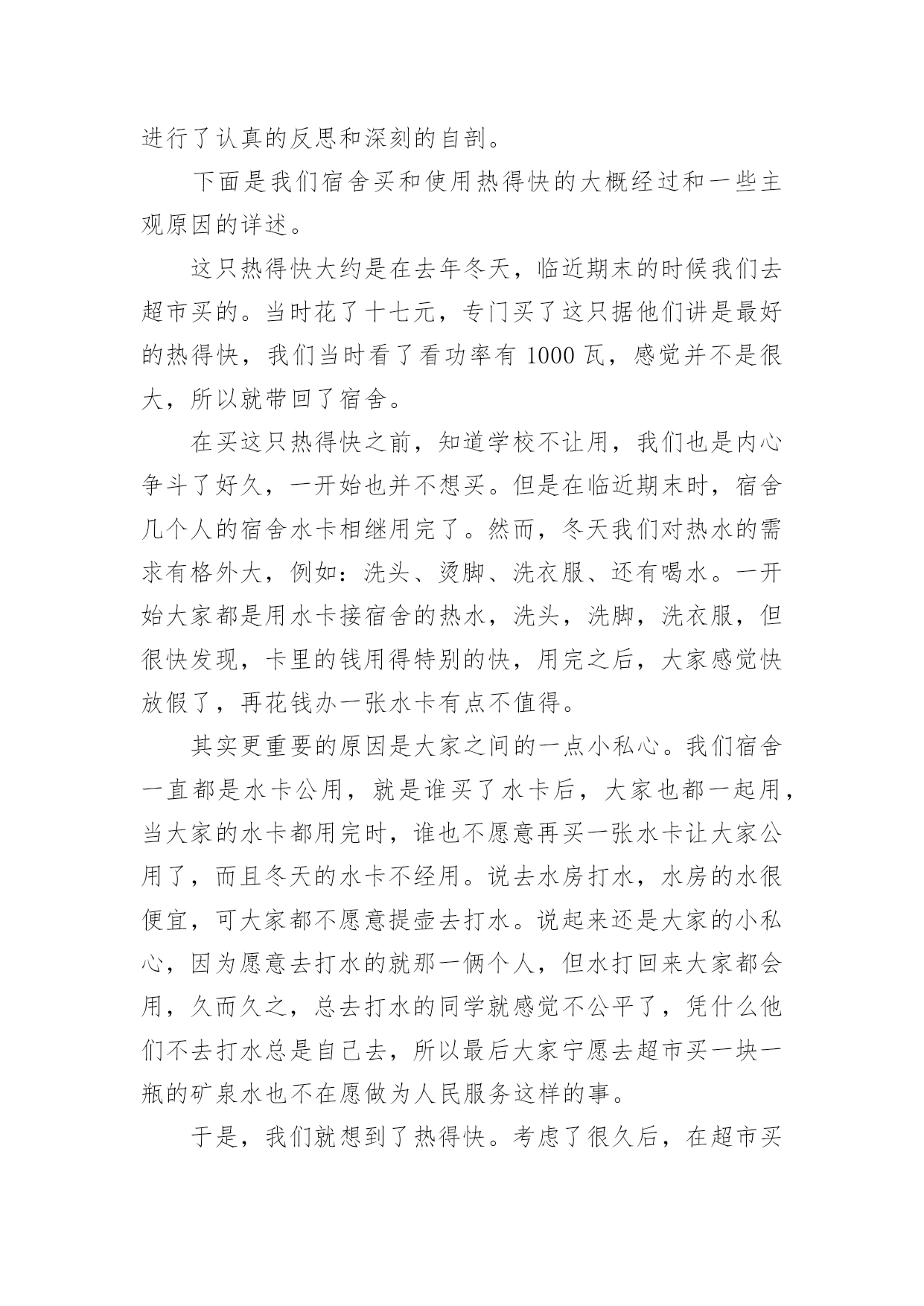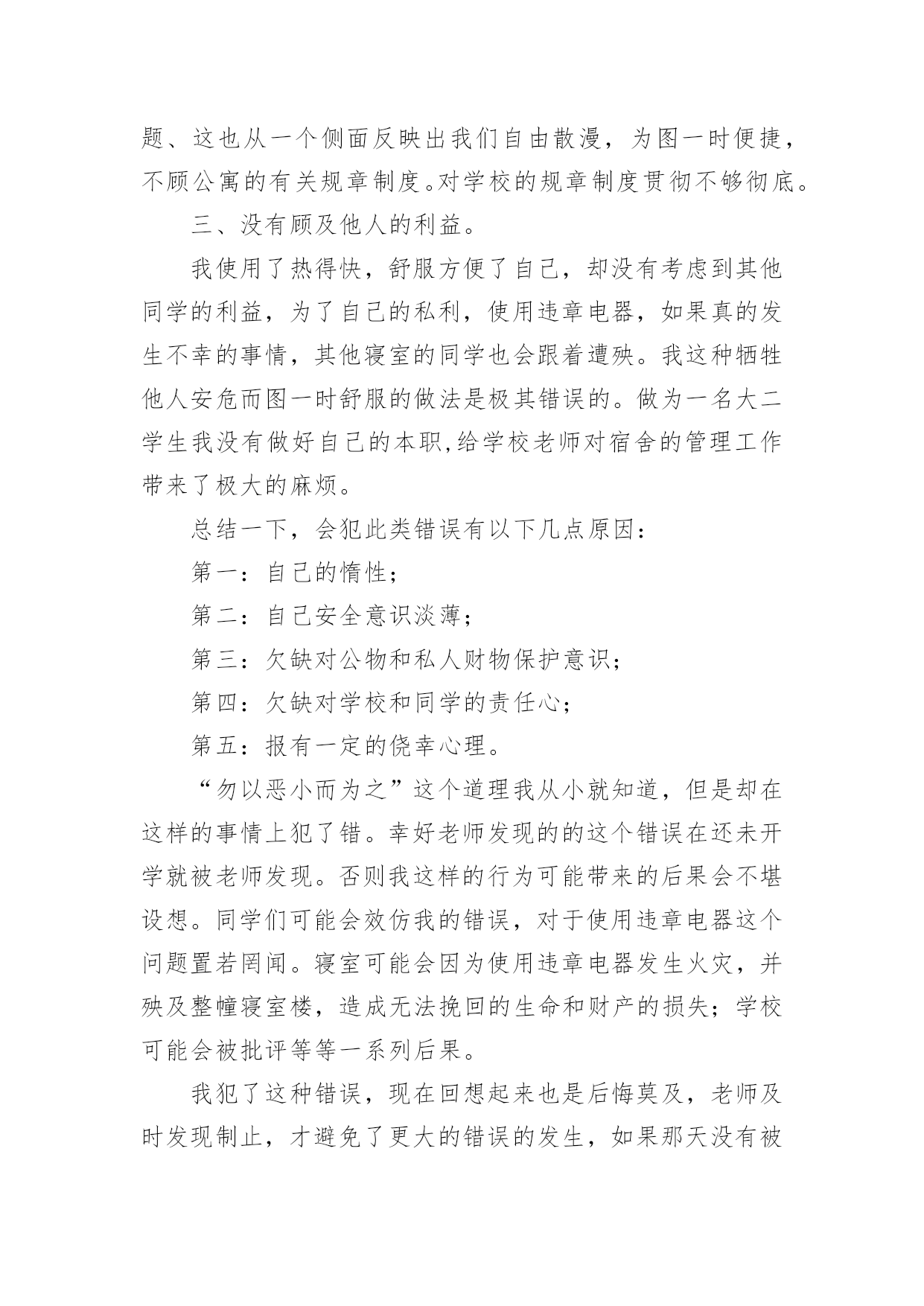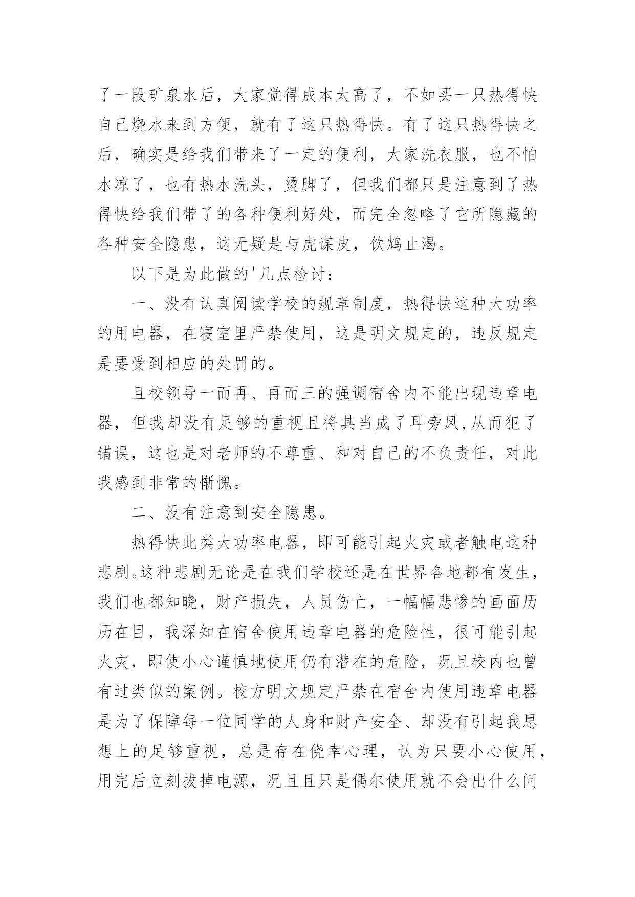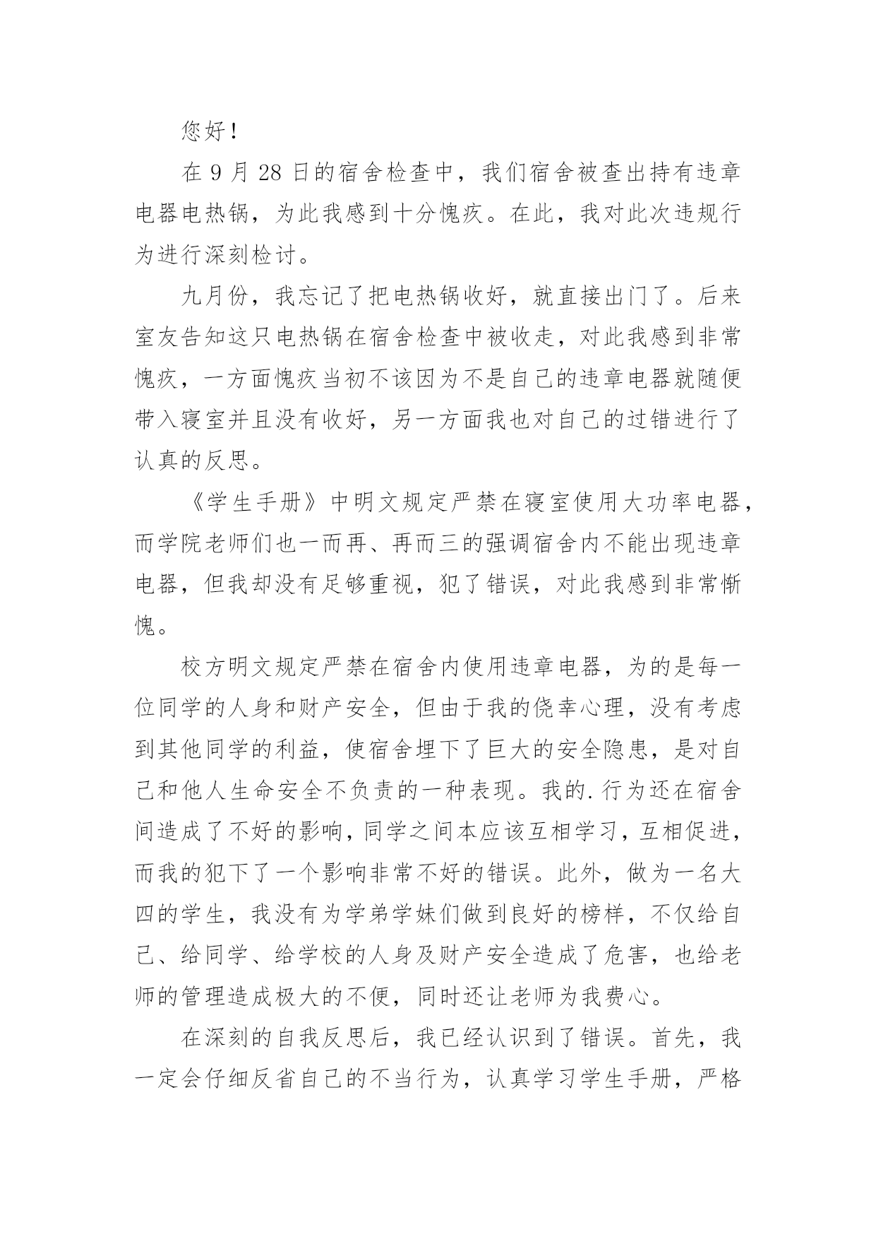 宿舍违章电器检讨书宿舍违章电器检讨书在学习、工作或生活中出现了过错后,为了避免再犯,我们要通过写检讨书来反省,在写检讨书时犯错的原因要描述清楚。大家知道正规的检讨书怎么写吗?下面是小编帮大家整理的宿舍违章电器检讨书,希望能够帮助到大家。宿舍违章电器检讨书1尊敬的老师:您好!20xx年x月,宿管人员在检查宿舍时查到并没收了我的电热壶,留下了字条给与了警告和说明。对此,我表示接受,感谢他们发现并指正了这一威胁隐患。事情的经过是这样的。毕业时,同学搬家,把电热壶落在了宿舍,打电话然我代为保管,等稳定后再来拿。于是我搬宿舍时一起把电热壶带到了新宿舍。等把宿舍安顿好后,由于白天工作,下班后经常去给还在xx的同学帮忙换房子和整理房子,就把放在宿舍的电热壶忘了,直到看到宿管留下的字条才想起来有个电热壶。在此期间,都没有见过这个电热壶的样子,当然,更没有使用过。看到纸条后,我才注意到多日不曾回来,宿舍楼道口的不准使用大功率用电器的通知。然后又仔细阅读了研究生手册中公寓安全管理这章,知道了“不得在学生公寓内存放电炉、电饭煲、电热杯、热得快等违章电器”的规定。由此,我仔细深入的思考了存放违章电器的严重性。宿舍是由以前的家属楼改造而成,该楼年代久远,安全防护设施比较落后,由于刚刚改造完成,各种安全设备还不齐全,电路也不安全,一旦使用大功率用电器很容易引发火灾。该楼每单元只有一条窄小的楼道和楼梯,发生火灾后人员很难撤离。如果住在低层使用大功率用电器而引发火灾的话,楼上的人会相当危险。想到此点,我不由地除了一身冷汗。万幸的是,学校宿管人员很敬业,认真检查了我们的宿舍,把这种危险扼杀在了萌芽阶段,正是他们的工作到位,保证了大家的安全,在此,我对自己的行为感到后悔和羞愧,并对学校深表谢意。其次,我的行为不符合一个研究生的要求。作为当代的大学生,尤其是研究生,应该识大体、顾大局。不应该为了自己的粗心大意违反校纪校规。我的行为还在宿舍间造成了极坏的影响。同学之间应该互相学习、互相促进,而我的`表现给同学们带了一个坏头,不利于校风的建设。作为一名住宿者,我没有做好自己的本职,给学校和宿管人员的工作带来了很大的麻烦。对此,我深表歉意。因此,我决定做出如下个人整改措施:一、按照要求上交检讨书一份,对自己思想和行为上的错误根源深入地梳理,并认清可能造成的严重后果。二、用心克服生活上粗心大意的缺点。三、和同学、宿管人员加强沟通,保证今后不会再出现违反校纪校规的情况。我非常感谢学校老师和宿管人员对我所犯错误的及时指正,我保证今后不会再有类似行为发生在我的身上,并决心为我校的安全工作做好宣传。此致敬礼检讨人:xxx20xx年x月x日宿舍违章电器检讨书2尊敬的王老师:您好!我是男生宿舍楼22号甲E区107寝室的xxx,为违反学校规定,擅自使用大功率违章电器——热得快,向老师作深刻检讨。20xx年xx月xx日上午,当楼长老师走进我们寝室时,发现我正在使用学校明令禁止的违章电器——热得快,烧水。老师发现之后,立即予以没收,并通知老师您前来处理。到老师没收热得快后,我一开始并不认为这是一件多么严重的事情,认为只要没出什么事情发生就应该不算大事。但当老师您对我进行批评教育时,我才清晰地认知到此次行为的严重性和自己自私无知。我的错误不但是对自己的不负责任,更是危及到了室友及整幢寝室同学的生命安全。在老师对我们简短而深刻的谈话后,我对于使用违章电器的行为进行了认真的反思和深刻的自剖。下面是我们宿舍买和使用热得快的大概经过和一些主观原因的详述。这只热得快大约是在去年冬天,临近期末的时候我们去超市买的。当时花了十七元,专门买了这只据他们讲是最好的热得快,我们当时看了看功率有1000瓦,感觉并不是很大,所以就带回了宿舍。在买这只热得快之前,知道学校不让用,我们也是内心争斗了好久,一开始也并不想买。但是在临近期末时,宿舍几个人的宿舍水卡相继用完了。然而,冬天我们对热水的需求有格外大,例如:洗头、烫脚、洗衣服、还有喝水。一开始大家都是用水卡接宿舍的热水,洗头,洗脚,洗衣服,但很快发现,卡里的钱用得特别的快,用完之后,大家感觉快放假了,再花钱办一张水卡有点不值得。其实更重要的原因是大家之间的一点小私心。我们宿舍一直都是水卡公用,就是谁买了水卡后,大家也都一起用,当大家的水卡都用完时,谁也不愿意再买一张水卡让大家公用了,而且冬天的水卡不经用。说去水房打水,水房的水很便宜,可大家都不愿意提壶去打水。说起来还是大家的小私心,因为愿意去打水的就那一俩个人,但水打回来大家都会用,久而久之,总去打水的同学就感觉不公平了,凭什么他们不去打水总是自己去,所以最后大家宁愿去超市买一块一瓶的矿泉水也不在愿做为人民服务这样的事。于是,我们就想到了热得快。考虑了很久后,在超市买了一段矿泉水后,大家觉得成本太高了,不如买
