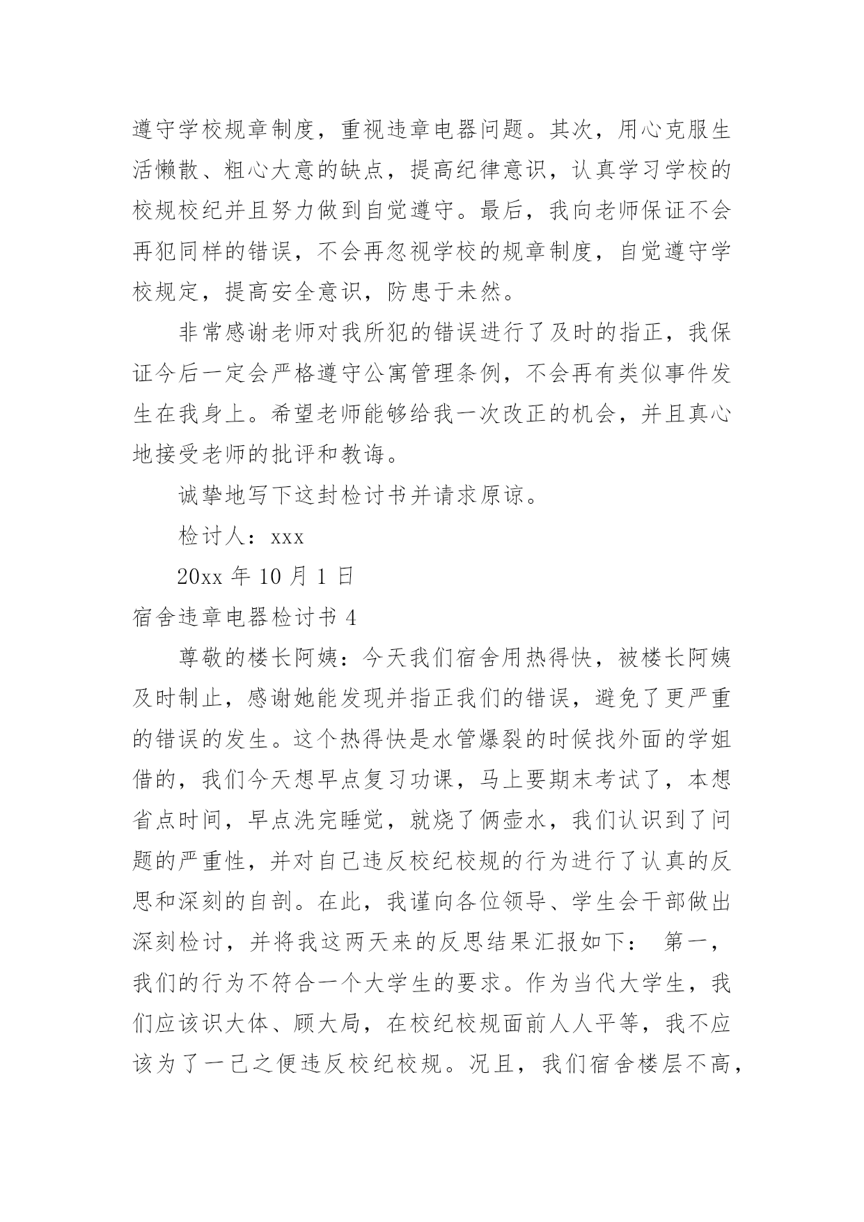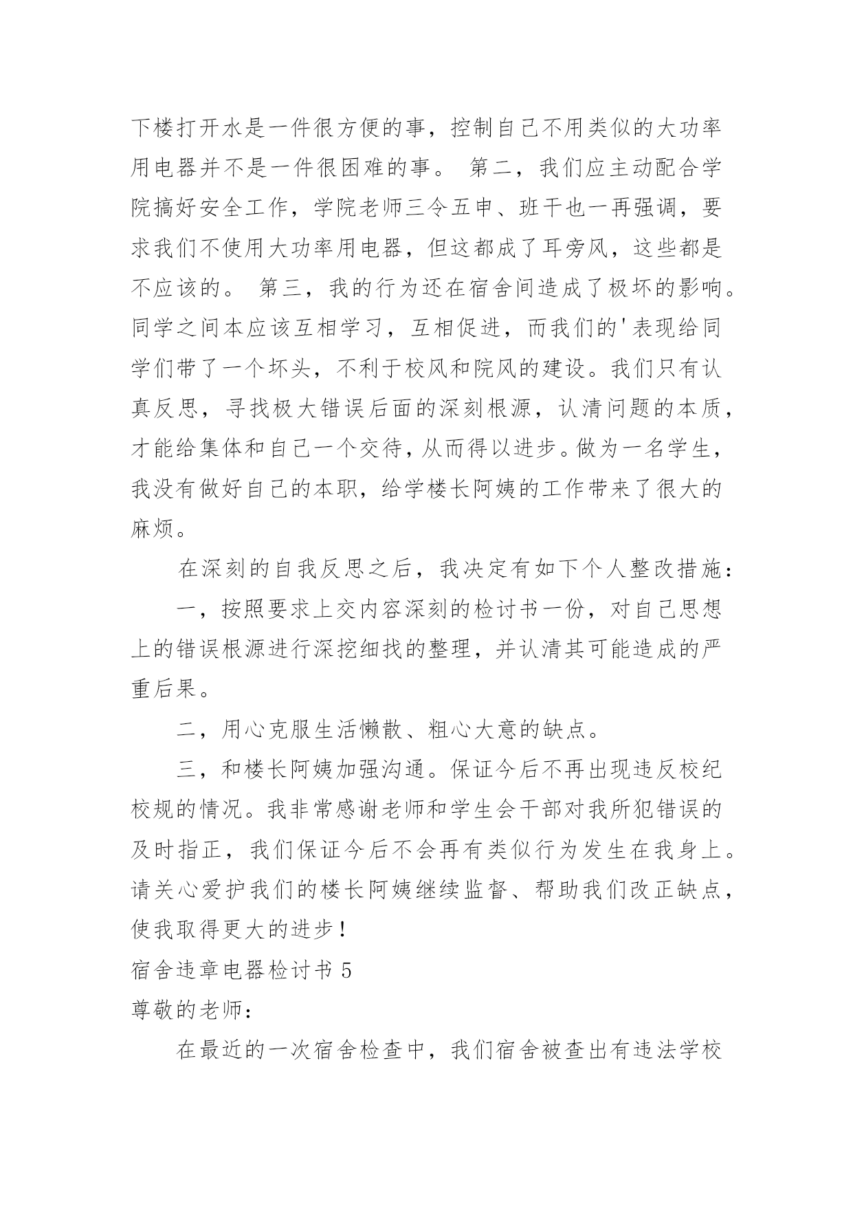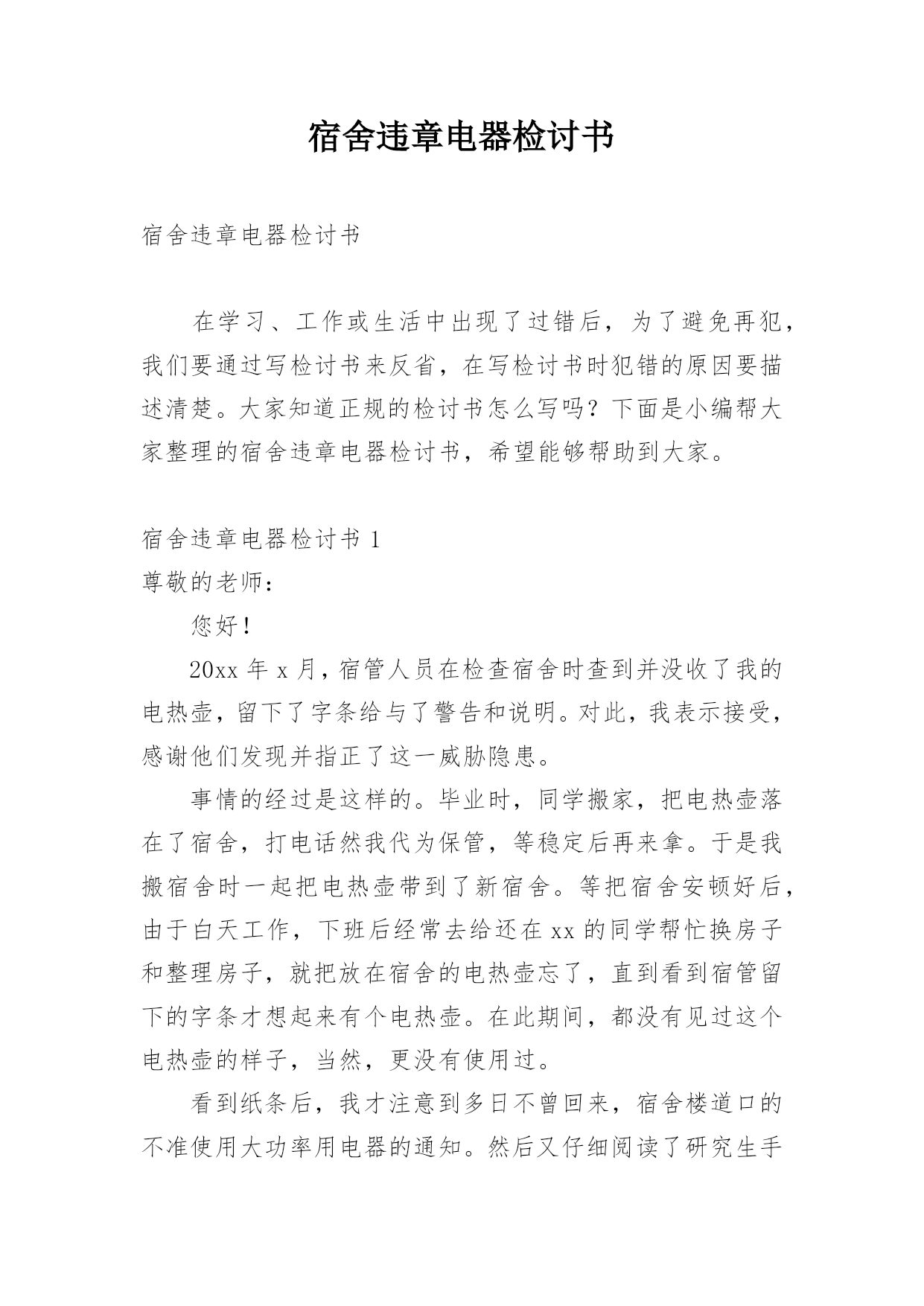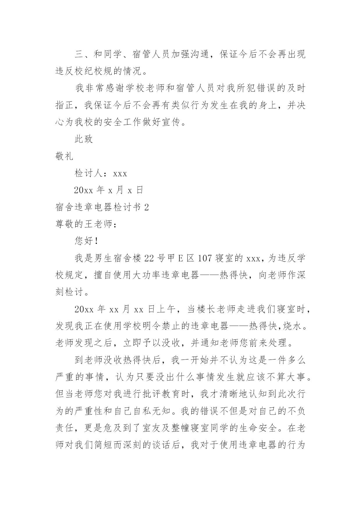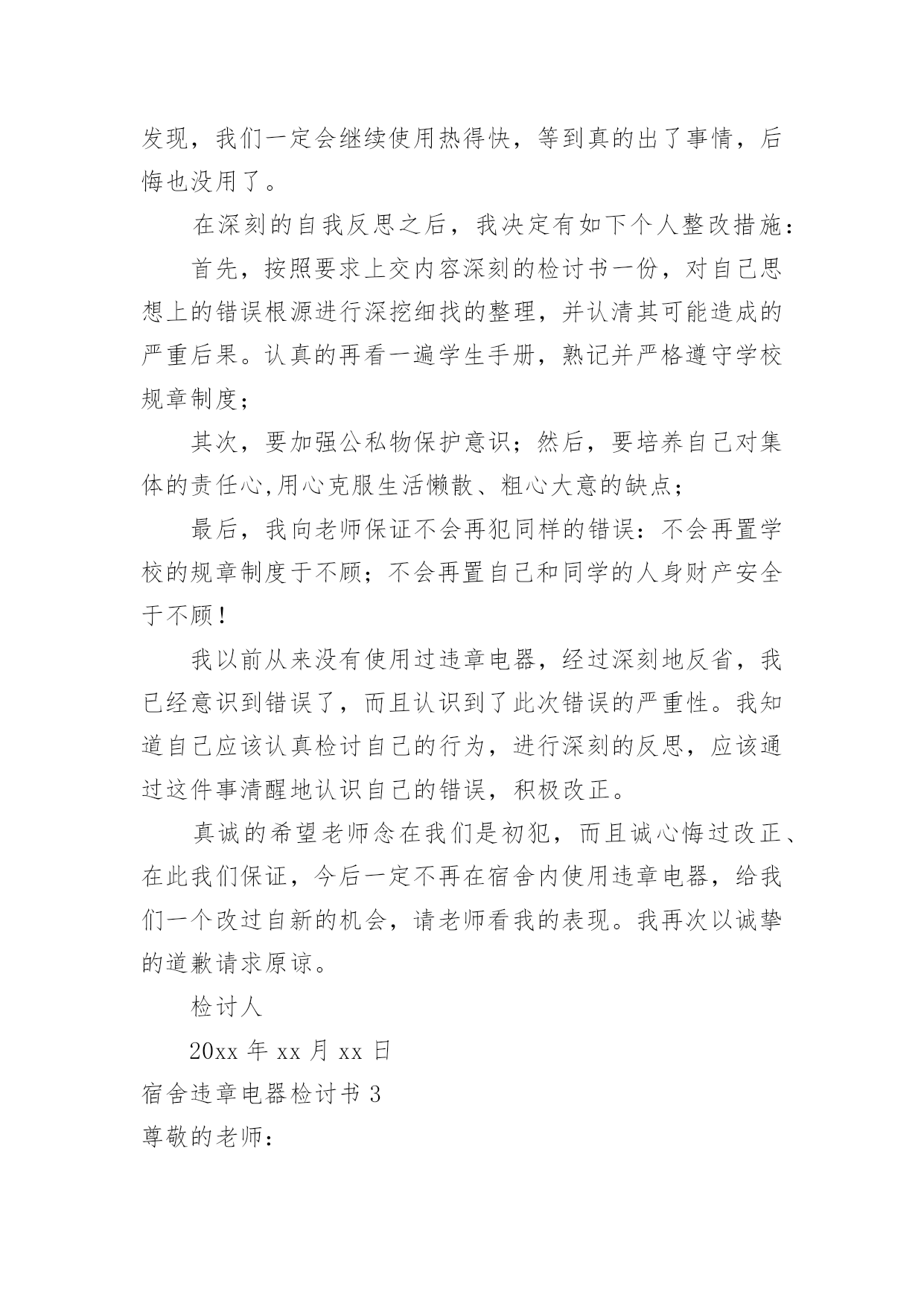 宿舍违章电器检讨书宿舍违章电器检讨书在学习、工作或生活中出现了过错后,为了避免再犯,我们要通过写检讨书来反省,在写检讨书时犯错的原因要描述清楚。大家知道正规的检讨书怎么写吗?下面是小编帮大家整理的宿舍违章电器检讨书,希望能够帮助到大家。宿舍违章电器检讨书1尊敬的老师:您好!20xx年x月,宿管人员在检查宿舍时查到并没收了我的电热壶,留下了字条给与了警告和说明。对此,我表示接受,感谢他们发现并指正了这一威胁隐患。事情的经过是这样的。毕业时,同学搬家,把电热壶落在了宿舍,打电话然我代为保管,等稳定后再来拿。于是我搬宿舍时一起把电热壶带到了新宿舍。等把宿舍安顿好后,由于白天工作,下班后经常去给还在xx的同学帮忙换房子和整理房子,就把放在宿舍的电热壶忘了,直到看到宿管留下的字条才想起来有个电热壶。在此期间,都没有见过这个电热壶的样子,当然,更没有使用过。看到纸条后,我才注意到多日不曾回来,宿舍楼道口的不准使用大功率用电器的通知。然后又仔细阅读了研究生手册中公寓安全管理这章,知道了“不得在学生公寓内存放电炉、电饭煲、电热杯、热得快等违章电器”的规定。由此,我仔细深入的思考了存放违章电器的严重性。宿舍是由以前的家属楼改造而成,该楼年代久远,安全防护设施比较落后,由于刚刚改造完成,各种安全设备还不齐全,电路也不安全,一旦使用大功率用电器很容易引发火灾。该楼每单元只有一条窄小的楼道和楼梯,发生火灾后人员很难撤离。如果住在低层使用大功率用电器而引发火灾的话,楼上的人会相当危险。想到此点,我不由地除了一身冷汗。万幸的是,学校宿管人员很敬业,认真检查了我们的宿舍,把这种危险扼杀在了萌芽阶段,正是他们的工作到位,保证了大家的安全,在此,我对自己的行为感到后悔和羞愧,并对学校深表谢意。其次,我的行为不符合一个研究生的要求。作为当代的大学生,尤其是研究生,应该识大体、顾大局。不应该为了自己的粗心大意违反校纪校规。我的行为还在宿舍间造成了极坏的影响。同学之间应该互相学习、互相促进,而我的`表现给同学们带了一个坏头,不利于校风的建设。作为一名住宿者,我没有做好自己的本职,给学校和宿管人员的工作带来了很大的麻烦。对此,我深表歉意。因此,我决定做出如下个人整改措施:一、按照要求上交检讨书一份,对自己思想和行为上的错误根源深入地梳理,并认清可能造成的严重后果。二、用心克服生活上粗心大意的缺点。三、和同学、宿管人员加强沟通,保证今后不会再出现违反校纪校规的情况。我非常感谢学校老师和宿管人员对我所犯错误的及时指正,我保证今后不会再有类似行为发生在我的身上,并决心为我校的安全工作做好宣传。此致敬礼检讨人:xxx20xx年x月x日宿舍违章电器检讨书2尊敬的王老师:您好!我是男生宿舍楼22号甲E区107寝室的xxx,为违反学校规定,擅自使用大功率违章电器——热得快,向老师作深刻检讨。20xx年xx月xx日上午,当楼长老师走进我们寝室时,发现我正在使用学校明令禁止的违章电器——热得快,烧水。老师发现之后,立即予以没收,并通知老师您前来处理。到老师没收热得快后,我一开始并不认为这是一件多么严重的事情,认为只要没出什么事情发生就应该不算大事。但当老师您对我进行批评教育时,我才清晰地认知到此次行为的严重性和自己自私无知。我的错误不但是对自己的不负责任,更是危及到了室友及整幢寝室同学的生命安全。在老师对我们简短而深刻的谈话后,我对于使用违章电器的行为进行了认真的反思和深刻的自剖。下面是我们宿舍买和使用热得快的大概经过和一些主观原因的详述。这只热得快大约是在去年冬天,临近期末的时候我们去超市买的。当时花了十七元,专门买了这只据他们讲是最好的热得快,我们当时看了看功率有1000瓦,感觉并不是很大,所以就带回了宿舍。在买这只热得快之前,知道学校不让用,我们也是内心争斗了好久,一开始也并不想买。但是在临近期末时,宿舍几个人的宿舍水卡相继用完了。然而,冬天我们对热水的需求有格外大,例如:洗头、烫脚、洗衣服、还有喝水。一开始大家都是用水卡接宿舍的热水,洗头,洗脚,洗衣服,但很快发现,卡里的钱用得特别的快,用完之后,大家感觉快放假了,再花钱办一张水卡有点不值得。其实更重要的原因是大家之间的一点小私心。我们宿舍一直都是水卡公用,就是谁买了水卡后,大家也都一起用,当大家的水卡都用完时,谁也不愿意再买一张水卡让大家公用了,而且冬天的水卡不经用。说去水房打水,水房的水很便宜,可大家都不愿意提壶去打水。说起来还是大家的小私心,因为愿意去打水的就那一俩个人,但水打回来大家都会用,久而久之,总去打水的同学就感觉不公平了,凭什么他们不去打水总是自己去,所以最后大家宁愿去超市买一块一瓶的矿泉水也不在愿做为人民服务这样的事。于是,我们就想到了热得快。考虑了很久后,在超市买了一段矿泉水后,大家觉得成本太高了,不如买