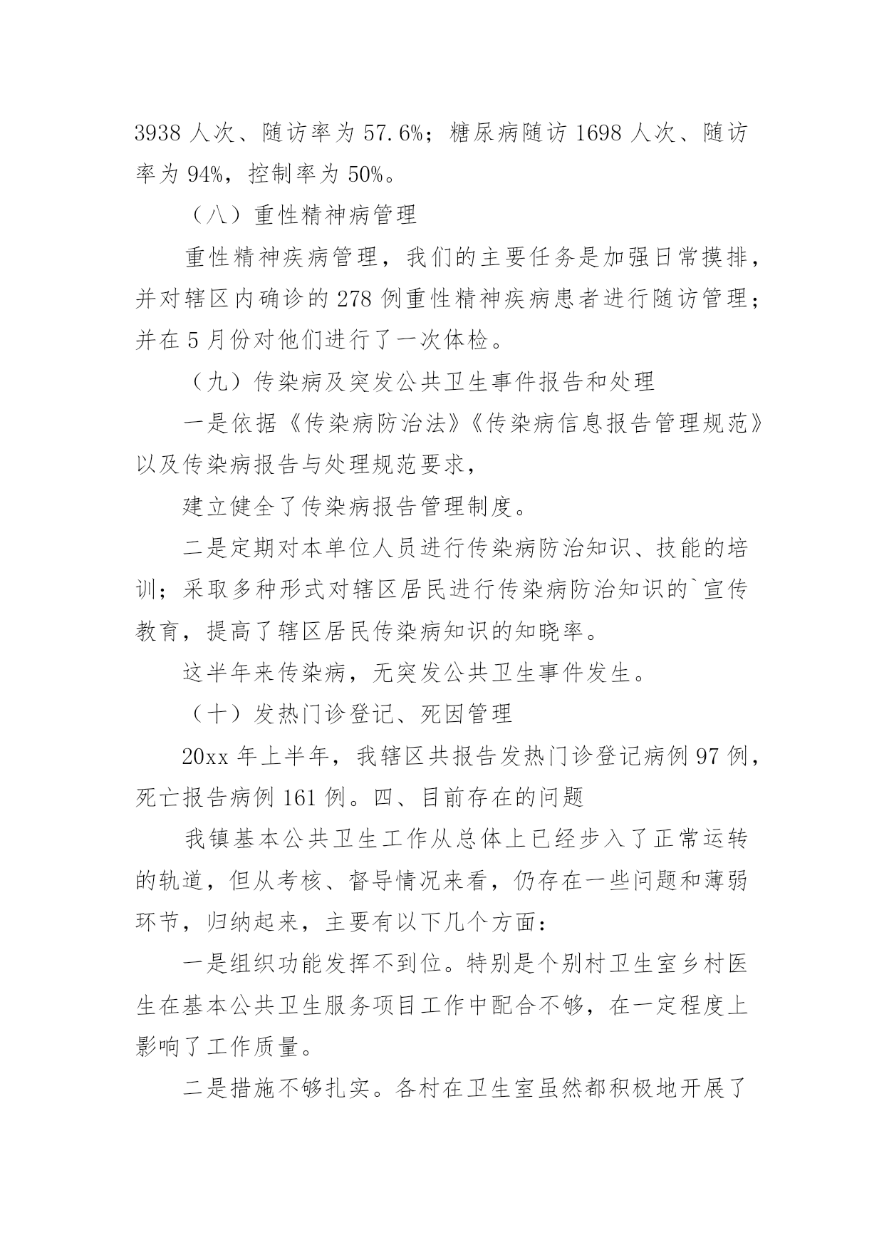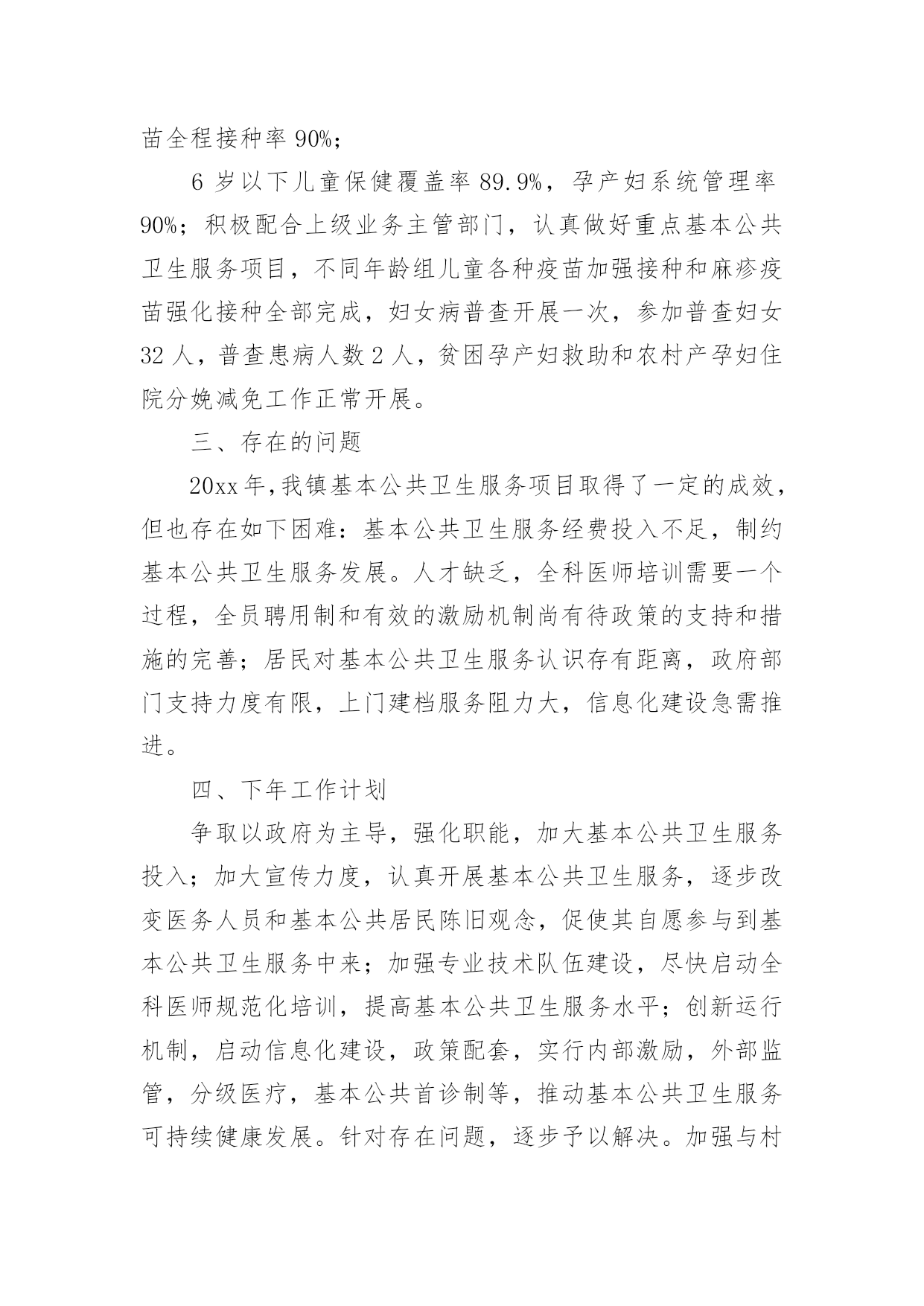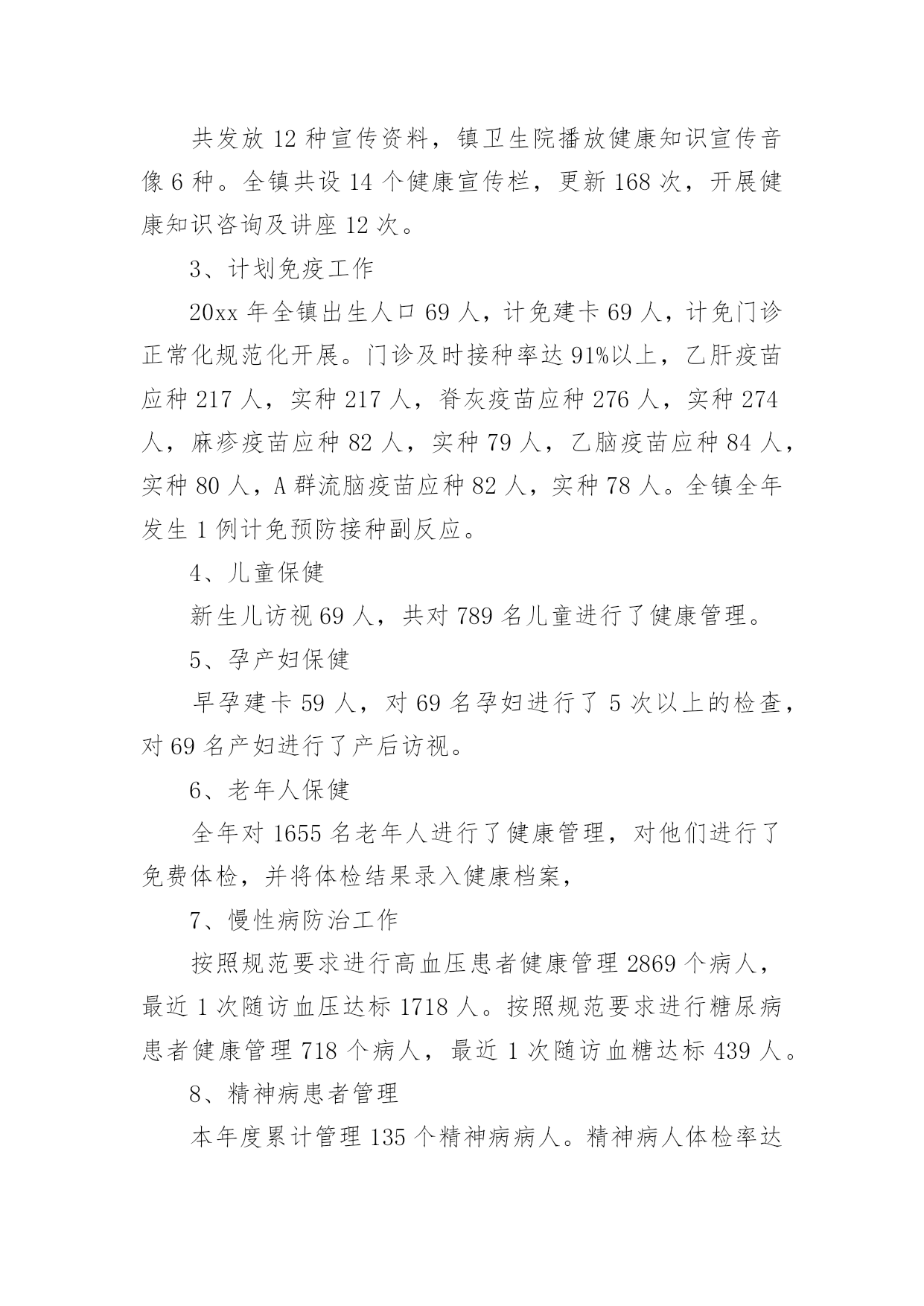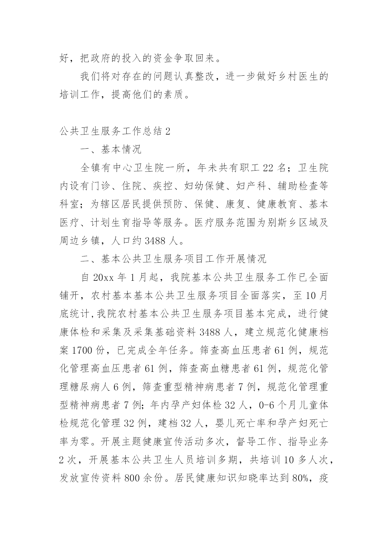公共卫生服务工作总结1公共卫生服务工作总结总结是在某一时期、某一项目或某些工作告一段落或者全部完成后进行回顾检查、分析评价,从而得出教训和一些规律性认识的一种书面材料,它可使零星的、肤浅的、表面的感性认知上升到全面的、系统的、本质的理性认识上来,因此我们要做好归纳,写好总结。那么总结应该包括什么内容呢?下面是小编精心整理的公共卫生服务工作总结,希望能够帮助到大家。公共卫生服务工作总结120xx年,我们马甸镇防保所在区卫健委的领导下,在区疾病预防控制中心、区卫生监督所、区妇幼保健院、区皮肤病防治院的业务指导下,全所同志艰苦奋斗,共同努力下,取得了一定的成绩,完成了工作任务.一、取得成绩1、居民健康档案工作20xx年共建立居民健康档案25310人份,有动态记录健康档案数11126人份。其中重点人群建档数字为:65岁以上老人建档3482人,高血压建档2949人,2型糖尿病建档754人,精神病建档135人。2、健康教育工作共发放12种宣传资料,镇卫生院播放健康知识宣传音像6种。全镇共设14个健康宣传栏,更新168次,开展健康知识咨询及讲座12次。3、计划免疫工作20xx年全镇出生人口69人,计免建卡69人,计免门诊正常化规范化开展。门诊及时接种率达91%以上,乙肝疫苗应种217人,实种217人,脊灰疫苗应种276人,实种274人,麻疹疫苗应种82人,实种79人,乙脑疫苗应种84人,实种80人,A群流脑疫苗应种82人,实种78人。全镇全年发生1例计免预防接种副反应。4、儿童保健新生儿访视69人,共对789名儿童进行了健康管理。5、孕产妇保健早孕建卡59人,对69名孕妇进行了5次以上的检查,对69名产妇进行了产后访视。6、老年人保健全年对1655名老年人进行了健康管理,对他们进行了免费体检,并将体检结果录入健康档案,7、慢性病防治工作按照规范要求进行高血压患者健康管理2869个病人,最近1次随访血压达标1718人。按照规范要求进行糖尿病患者健康管理718个病人,最近1次随访血糖达标439人。8、精神病患者管理本年度累计管理135个精神病病人。精神病人体检率达60%以上。9、传染病管理全镇新发生乙类传染病12人,与去年同期比较有所下降。一季度对医院、村卫生室的传染病防治知识培训已经结束。4月1日起卫生院的肠道门诊正常开设,并对可疑02病0157病的病员粪便进行了采样送检。10、卫生监督工作20xx年我镇共协助开展饮用水卫生安全学校卫生非法行医非法采供血实地巡查100次,发现0条卫生监督协管线索,报告0条卫生监督协管线索。二、存在问题1、在计划免疫工作中,儿童的'流动性大,增加了工作困难。2、我们许多工作要村卫生室他们去做,但是乡村医生的业务素质较差,工作责任心差,影响了我们的工作质量。3、在妇儿保工作中,孕妇的流动性大,给我们的妇保系管工作带来了困难。三、原因分析我们这里属于苏北,是经济欠发达地区,每年我们镇都有6000余人到外地打工,造成人口流动性大是必然的。其次,由于多年来,政府对卫生的财政投入太少,乡村医生没有及时的得到学习机会,业务素质差。四、今后打算我们将认真做好工作,争取把14大类55大项的工作做好,把政府的投入的资金争取回来。我们将对存在的问题认真整改,进一步做好乡村医生的培训工作,提高他们的素质。公共卫生服务工作总结2一、基本情况全镇有中心卫生院一所,年未共有职工22名;卫生院内设有门诊、住院、疾控、妇幼保健、妇产科、辅助检查等科室;为辖区居民提供预防、保健、康复、健康教育、基本医疗、计划生育指导等服务。医疗服务范围为别斯乡区域及周边乡镇,人口约3488人。二、基本公共卫生服务项目工作开展情况自20xx年1月起,我院基本公共卫生服务工作已全面铺开,农村基本基本公共卫生服务项目全面落实,至10月底统计,我院农村基本公共卫生服务项目基本完成,进行健康体检和采集及采集基础资料3488人,建立规范化健康档案1700份,已完成全年任务。筛查高血压患者61例,规范化管理高血压患者61例,筛查高血糖患者61例,规范化管理糖尿病人6例,筛查重型精神病患者7例,规范化管理重型精神病患者7例;年内孕产妇体检32人,0-6个月儿童体检规范化管理32例,建档32人,婴儿死亡率和孕产妇死亡率为零。开展主题健康宣传活动多次,督导工作、指导业务2次,开展基本公共卫生人员培训多期,共培训10多人次,发放宣传资料800余份。居民健康知识知晓率达到80%,疫苗全程接种率90%;6岁以下儿童保健覆盖率89.9%,孕产妇系统管理率90%;积极配合上级业务主管部门,认真做好重点基本公共卫生服务项目,不同年龄组儿童各种疫苗加强接种和麻疹疫苗强化接种全部完成,妇女病普查开展一次,参加普查妇女32人,普查患病人数2人,贫困孕产妇救助和农村产孕妇住院分娩减免工作正常开展