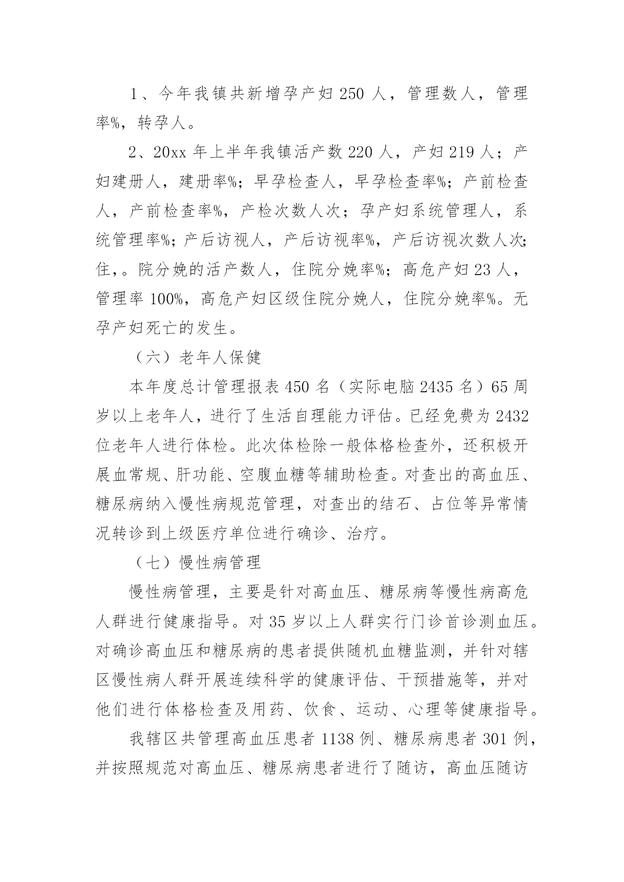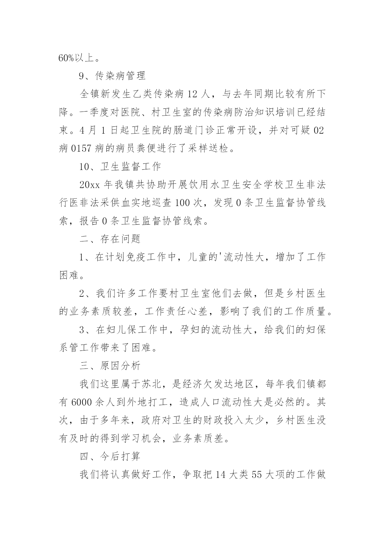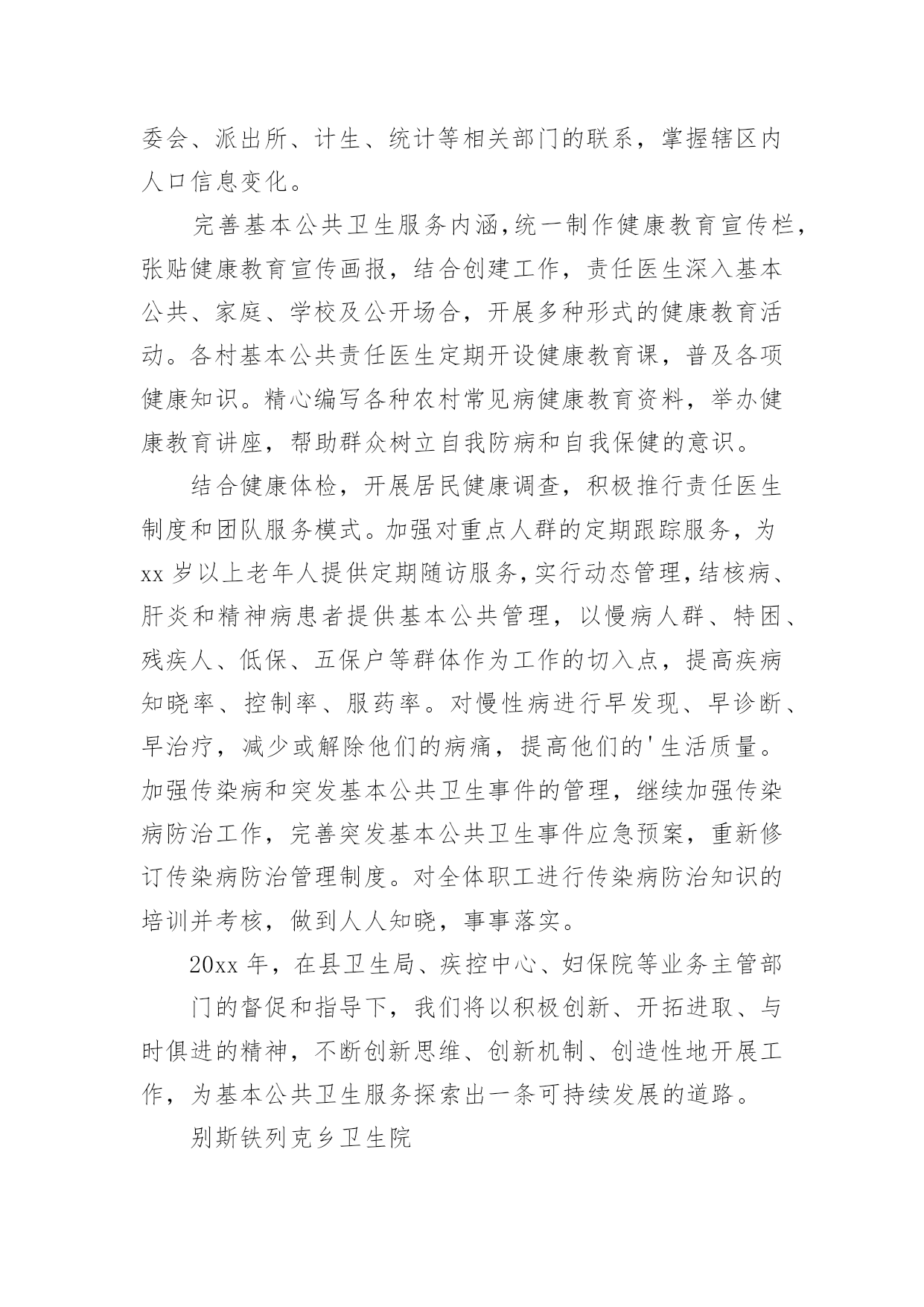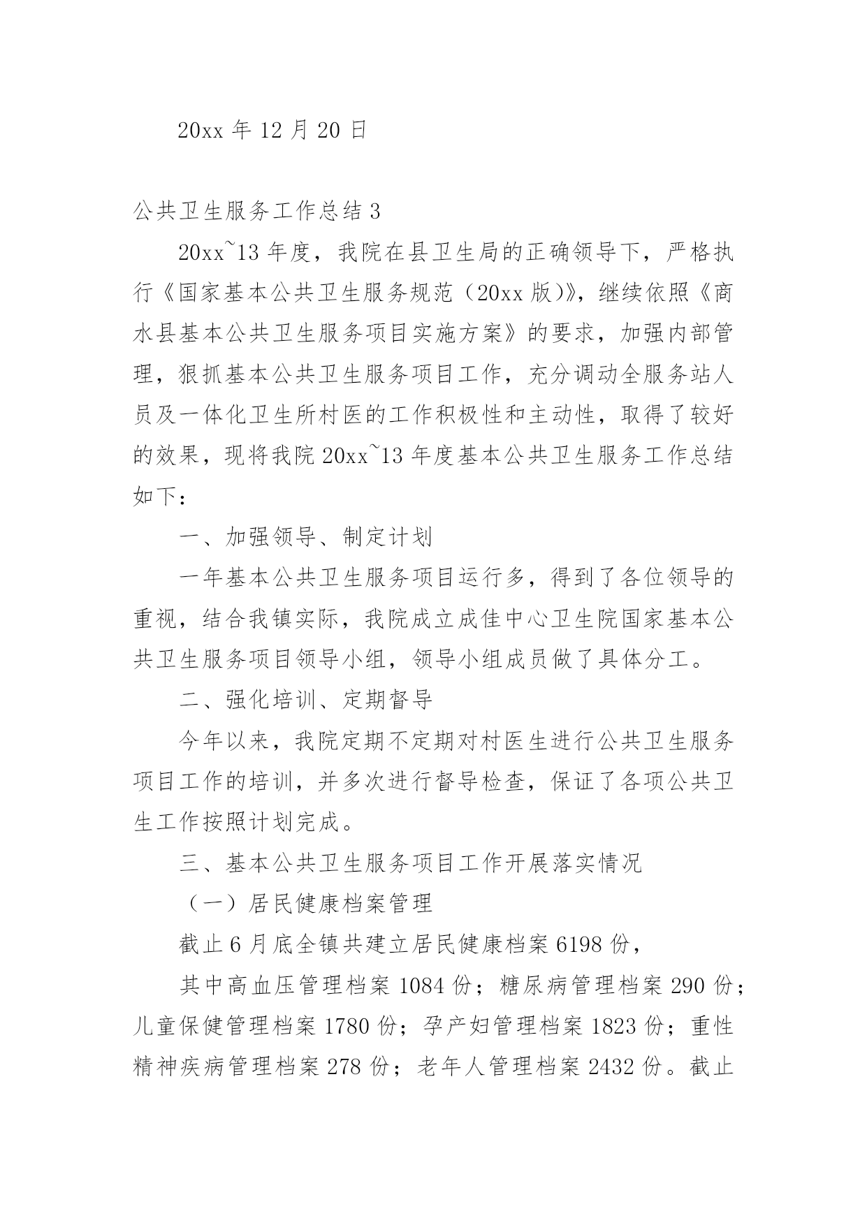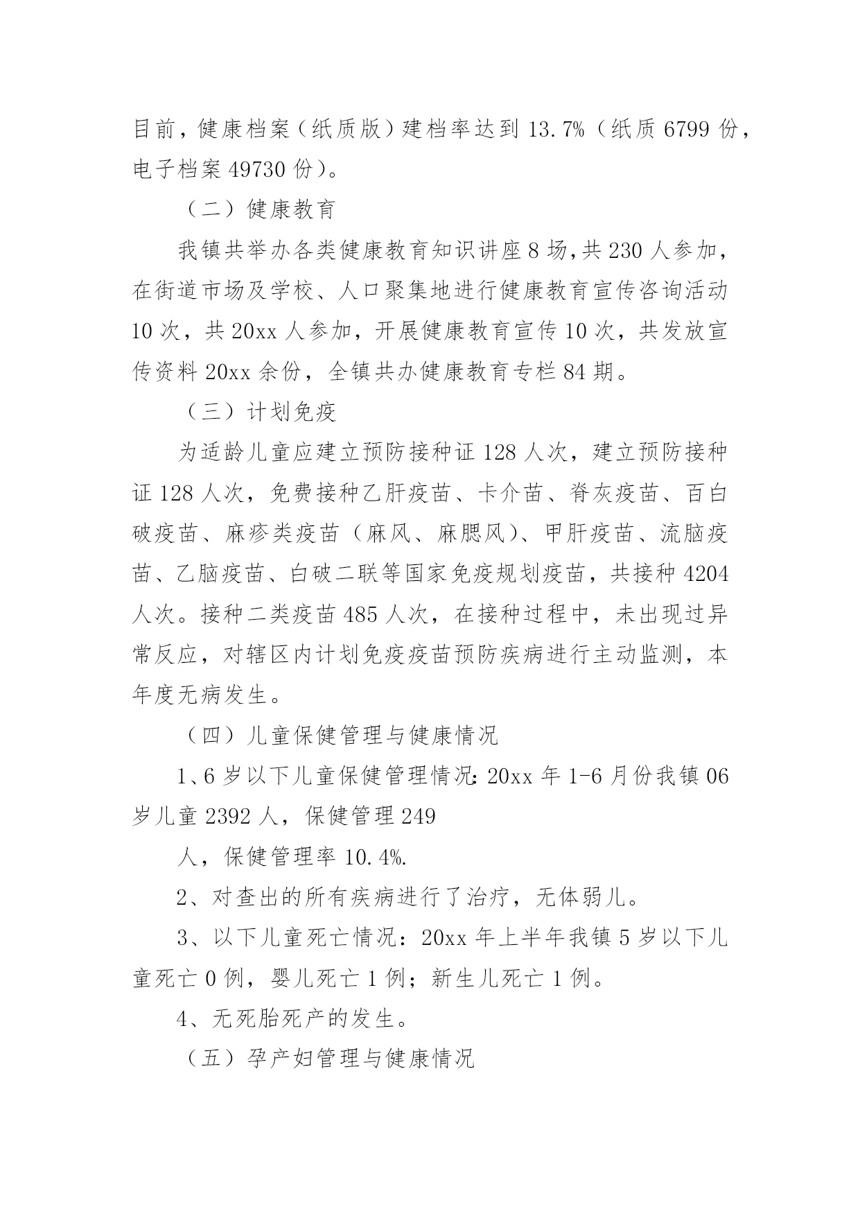 公共卫生服务工作总结1公共卫生服务工作总结总结是在某一时期、某一项目或某些工作告一段落或者全部完成后进行回顾检查、分析评价,从而得出教训和一些规律性认识的一种书面材料,它可使零星的、肤浅的、表面的感性认知上升到全面的、系统的、本质的理性认识上来,因此我们要做好归纳,写好总结。那么总结应该包括什么内容呢?下面是小编精心整理的公共卫生服务工作总结,希望能够帮助到大家。公共卫生服务工作总结120xx年,我们马甸镇防保所在区卫健委的领导下,在区疾病预防控制中心、区卫生监督所、区妇幼保健院、区皮肤病防治院的业务指导下,全所同志艰苦奋斗,共同努力下,取得了一定的成绩,完成了工作任务.一、取得成绩1、居民健康档案工作20xx年共建立居民健康档案25310人份,有动态记录健康档案数11126人份。其中重点人群建档数字为:65岁以上老人建档3482人,高血压建档2949人,2型糖尿病建档754人,精神病建档135人。2、健康教育工作共发放12种宣传资料,镇卫生院播放健康知识宣传音像6种。全镇共设14个健康宣传栏,更新168次,开展健康知识咨询及讲座12次。3、计划免疫工作20xx年全镇出生人口69人,计免建卡69人,计免门诊正常化规范化开展。门诊及时接种率达91%以上,乙肝疫苗应种217人,实种217人,脊灰疫苗应种276人,实种274人,麻疹疫苗应种82人,实种79人,乙脑疫苗应种84人,实种80人,A群流脑疫苗应种82人,实种78人。全镇全年发生1例计免预防接种副反应。4、儿童保健新生儿访视69人,共对789名儿童进行了健康管理。5、孕产妇保健早孕建卡59人,对69名孕妇进行了5次以上的检查,对69名产妇进行了产后访视。6、老年人保健全年对1655名老年人进行了健康管理,对他们进行了免费体检,并将体检结果录入健康档案,7、慢性病防治工作按照规范要求进行高血压患者健康管理2869个病人,最近1次随访血压达标1718人。按照规范要求进行糖尿病患者健康管理718个病人,最近1次随访血糖达标439人。8、精神病患者管理本年度累计管理135个精神病病人。精神病人体检率达60%以上。9、传染病管理全镇新发生乙类传染病12人,与去年同期比较有所下降。一季度对医院、村卫生室的传染病防治知识培训已经结束。4月1日起卫生院的肠道门诊正常开设,并对可疑02病0157病的病员粪便进行了采样送检。10、卫生监督工作20xx年我镇共协助开展饮用水卫生安全学校卫生非法行医非法采供血实地巡查100次,发现0条卫生监督协管线索,报告0条卫生监督协管线索。二、存在问题1、在计划免疫工作中,儿童的'流动性大,增加了工作困难。2、我们许多工作要村卫生室他们去做,但是乡村医生的业务素质较差,工作责任心差,影响了我们的工作质量。3、在妇儿保工作中,孕妇的流动性大,给我们的妇保系管工作带来了困难。三、原因分析我们这里属于苏北,是经济欠发达地区,每年我们镇都有6000余人到外地打工,造成人口流动性大是必然的。其次,由于多年来,政府对卫生的财政投入太少,乡村医生没有及时的得到学习机会,业务素质差。四、今后打算我们将认真做好工作,争取把14大类55大项的工作做好,把政府的投入的资金争取回来。我们将对存在的问题认真整改,进一步做好乡村医生的培训工作,提高他们的素质。公共卫生服务工作总结2一、基本情况全镇有中心卫生院一所,年未共有职工22名;卫生院内设有门诊、住院、疾控、妇幼保健、妇产科、辅助检查等科室;为辖区居民提供预防、保健、康复、健康教育、基本医疗、计划生育指导等服务。医疗服务范围为别斯乡区域及周边乡镇,人口约3488人。二、基本公共卫生服务项目工作开展情况自20xx年1月起,我院基本公共卫生服务工作已全面铺开,农村基本基本公共卫生服务项目全面落实,至10月底统计,我院农村基本公共卫生服务项目基本完成,进行健康体检和采集及采集基础资料3488人,建立规范化健康档案1700份,已完成全年任务。筛查高血压患者61例,规范化管理高血压患者61例,筛查高血糖患者61例,规范化管理糖尿病人6例,筛查重型精神病患者7例,规范化管理重型精神病患者7例;年内孕产妇体检32人,0-6个月儿童体检规范化管理32例,建档32人,婴儿死亡率和孕产妇死亡率为零。开展主题健康宣传活动多次,督导工作、指导业务2次,开展基本公共卫生人员培训多期,共培训10多人次,发放宣传资料800余份。居民健康知识知晓率达到80%,疫苗全程接种率90%;6岁以下儿童保健覆盖率89.9%,孕产妇系统管理率90%;积极配合上级业务主管部门,认真做好重点基本公共卫生服务项目,不同年龄组儿童各种疫苗加强接种和麻疹疫苗强化接种全部完成,妇女病普查开展一次,参加普查妇女32人,普查患病人数2人,贫困孕产妇救助和农村产孕妇住院分娩减免工作正常开展
