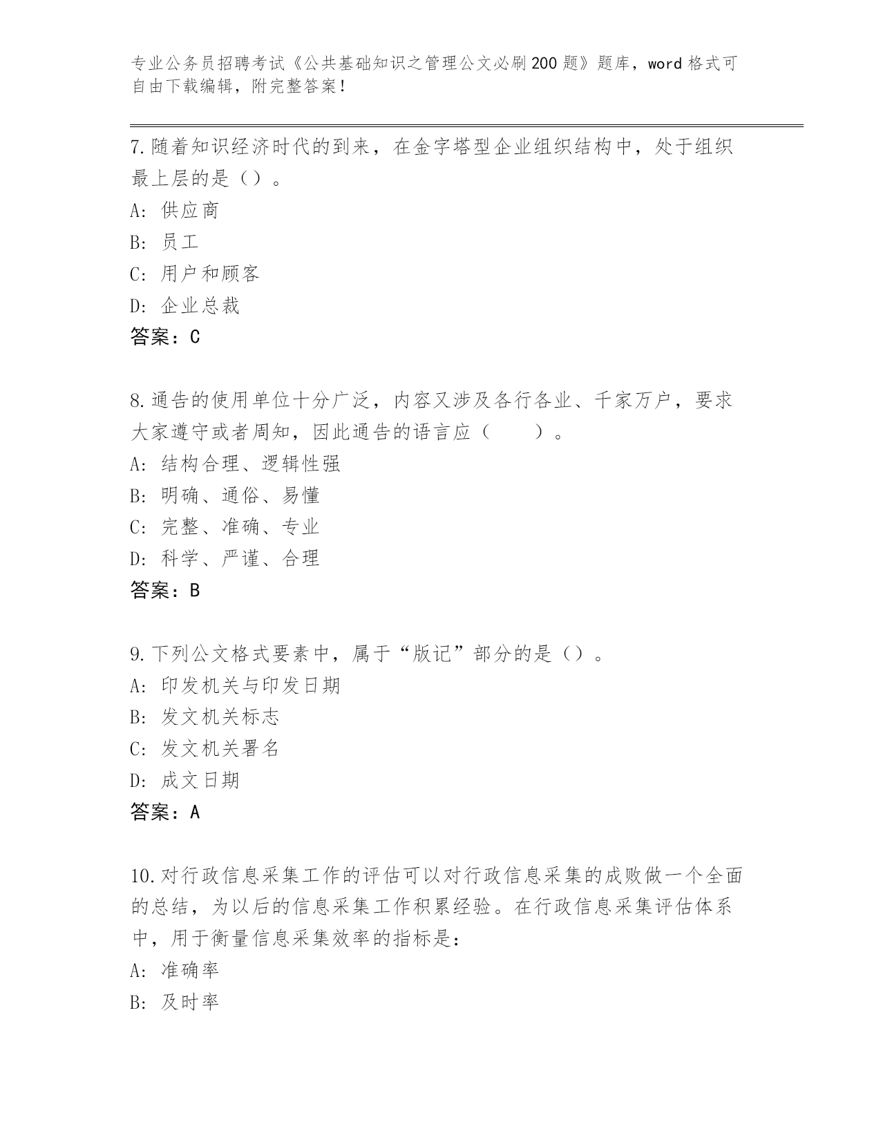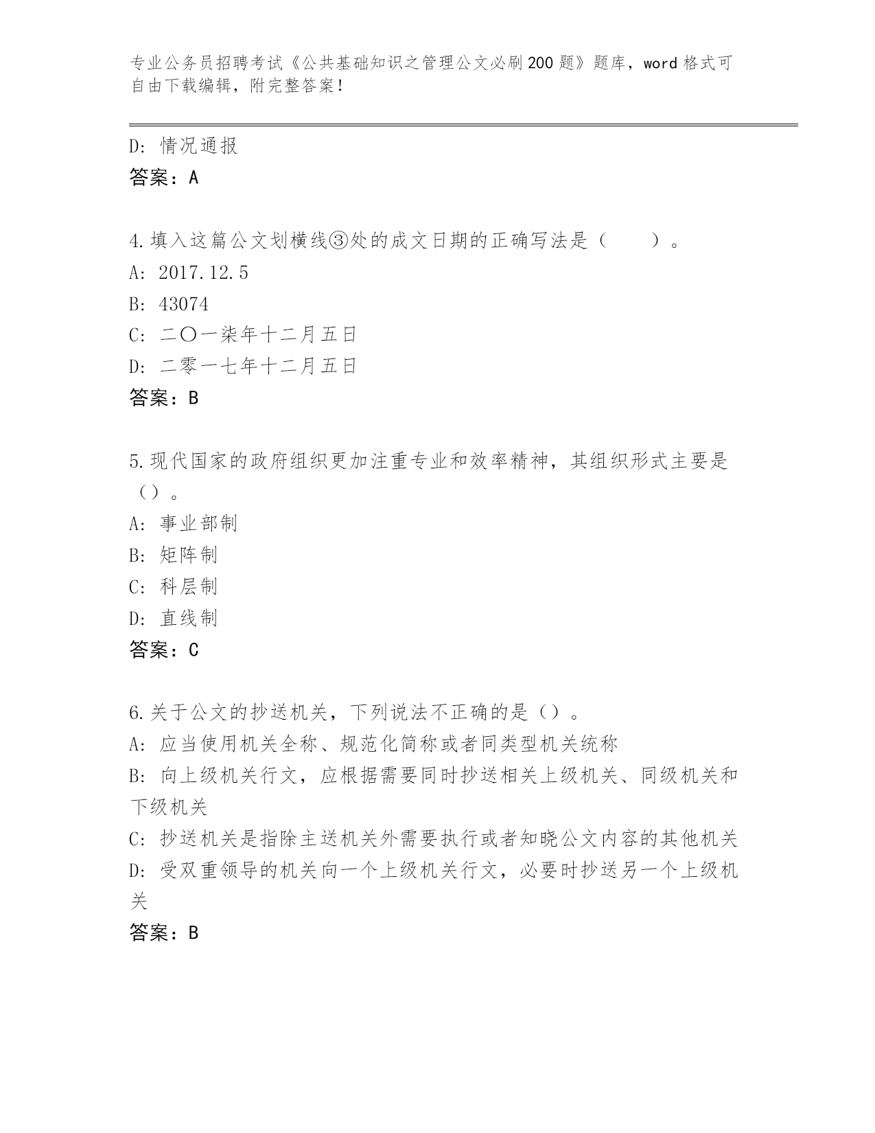 吉林省安图县2024公务员招聘考试《公共基础知识之管理公文必刷200题》完整题库(夺冠).docx
