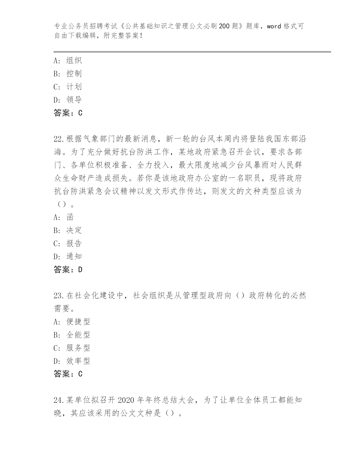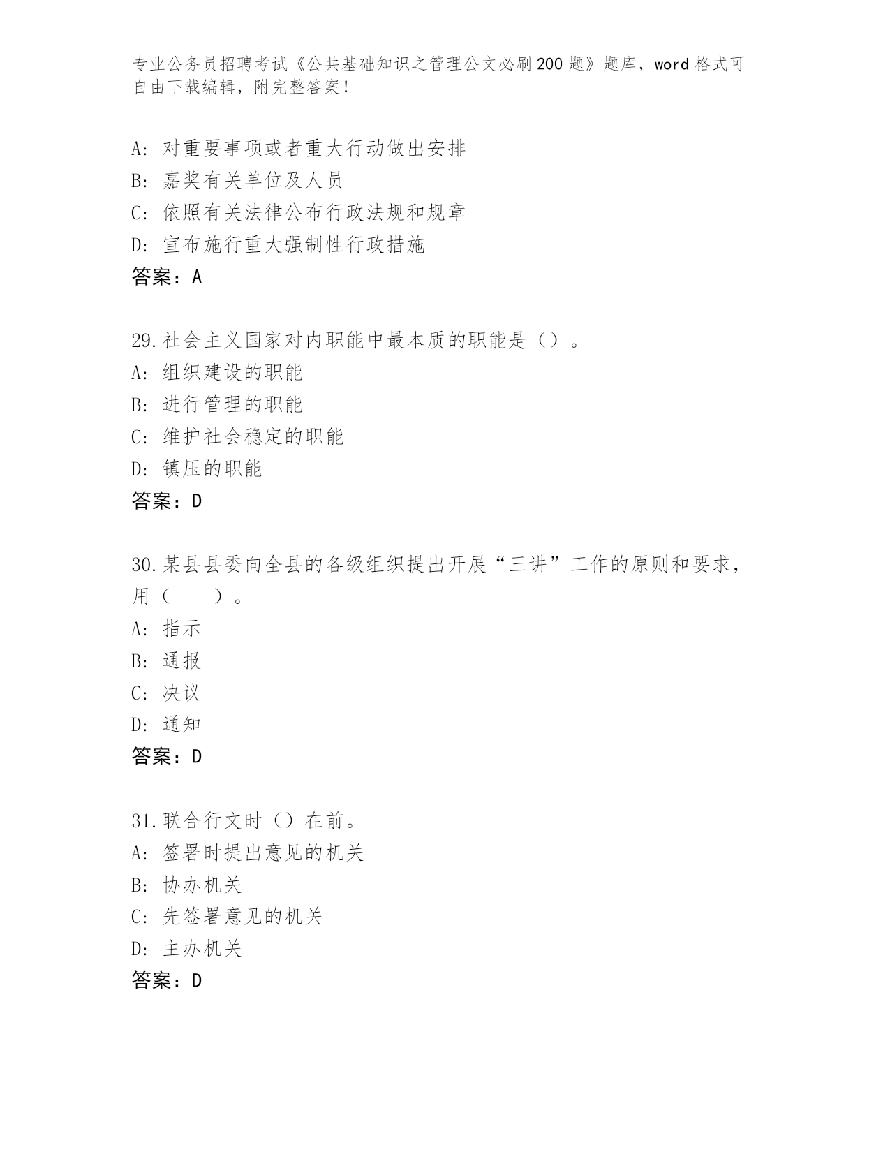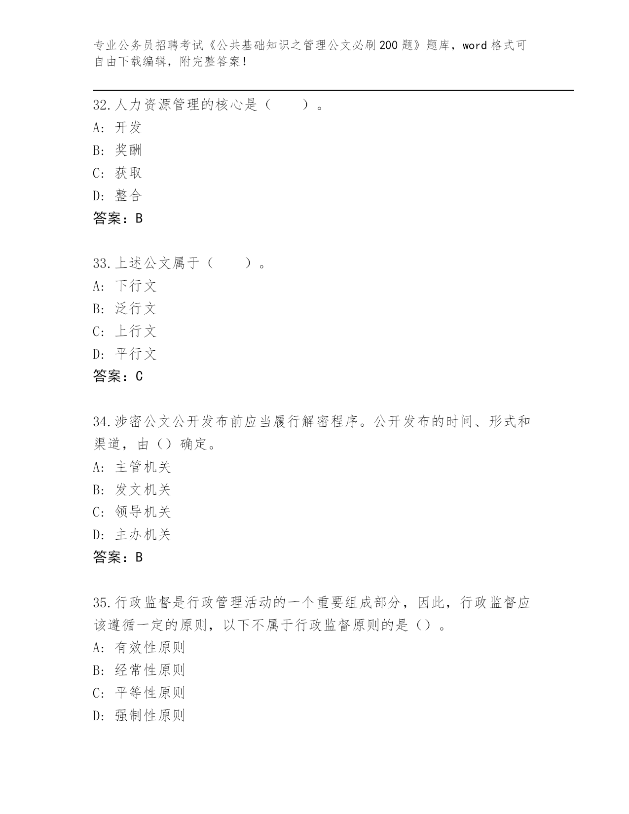 吉林省安图县2024公务员招聘考试《公共基础知识之管理公文必刷200题》完整题库(夺冠)