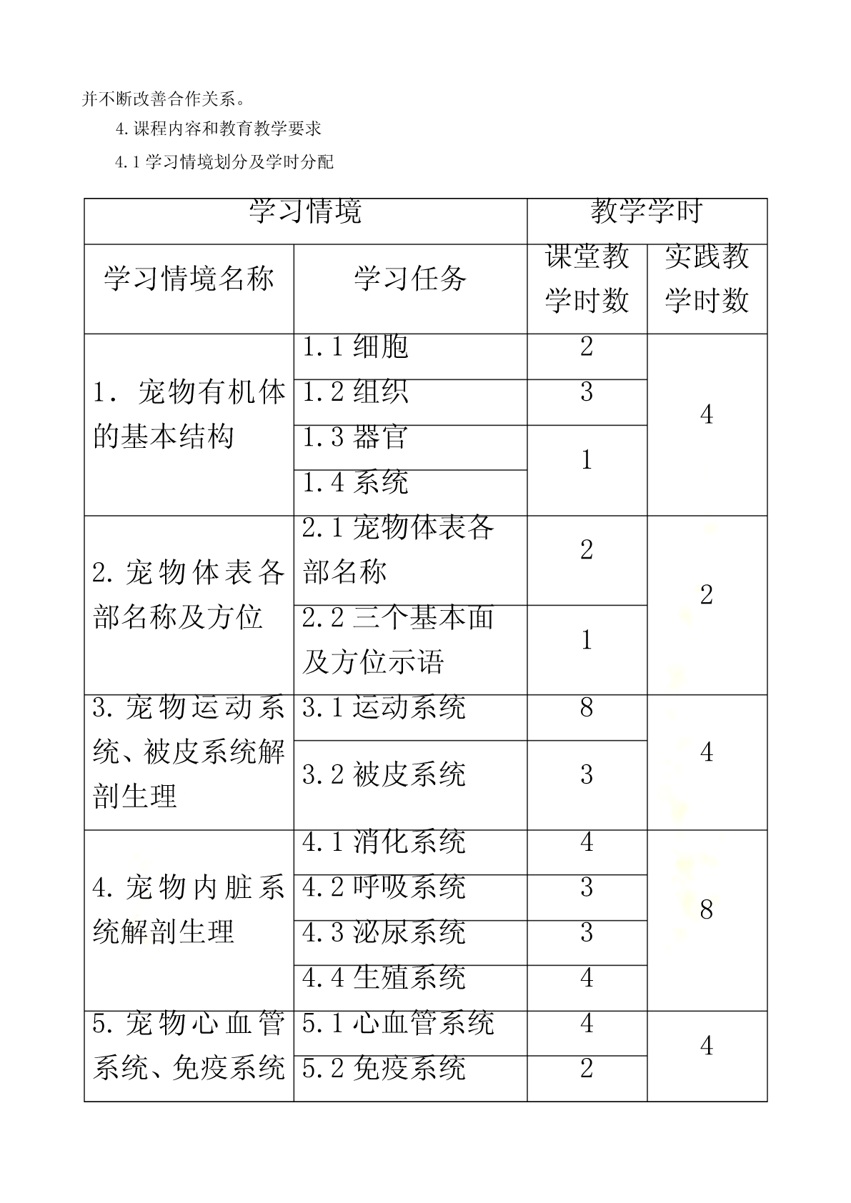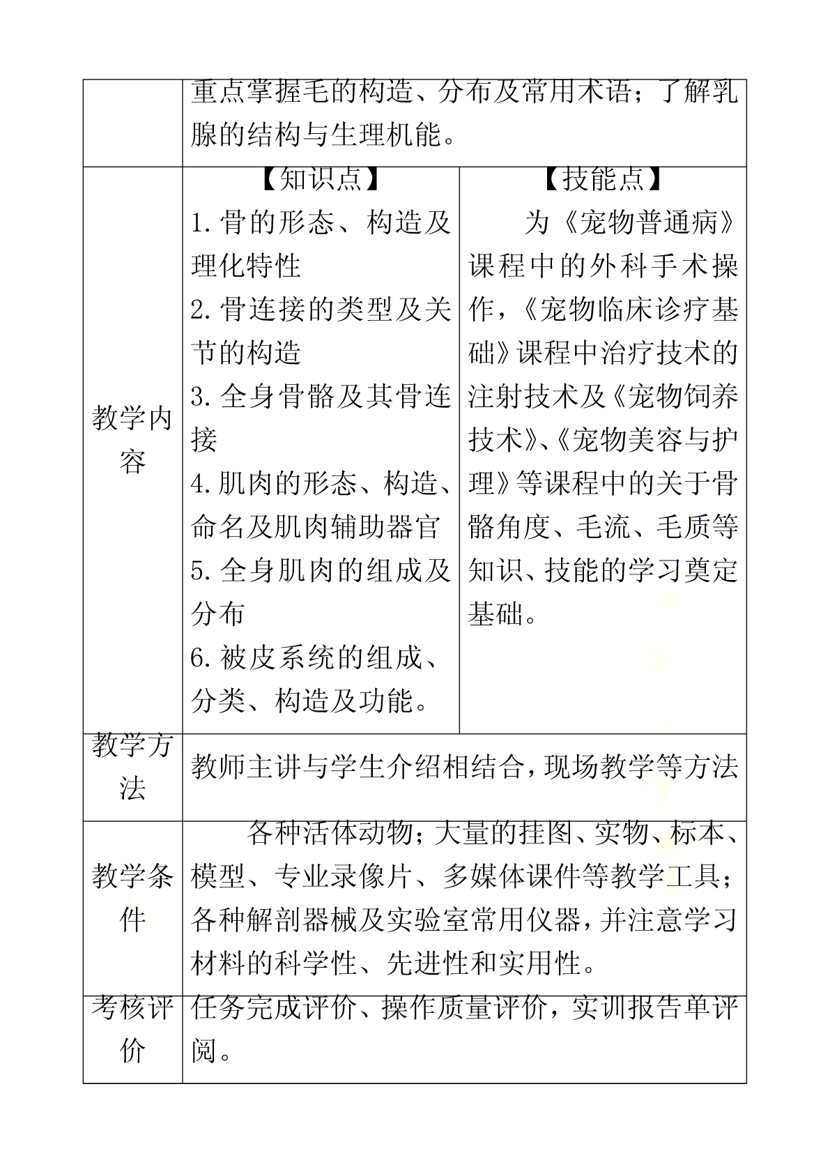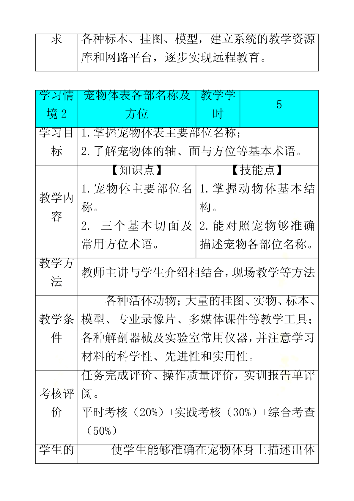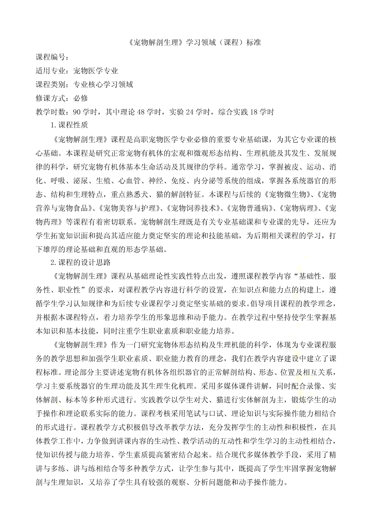 宠物解剖生理课程标准《宠物解剖生理》学习领域(课程)标准课程编号:适用专业:宠物医学专业课程类别:专业核心学习领域修课方式:必修教学时数:90学时,其中理论48学时,实验24学时,综合实践18学时1.课程性质《宠物解剖生理》课程是高职宠物医学专业必修的重要专业基础课,为其它专业课的核心基础。本课程是研究正常宠物有机体的宏观和微观形态结构、生理机能及其发生、发展规律的科学,研究宠物有机体基本生命活动及其规律的学科。通常学习,掌握被皮、运动、消化、呼吸、泌尿、生殖、心血管、神经、免疫、内分泌等系统的组成,掌握各系统器官的形态、结构和生理特点,重点熟悉犬、猫的解剖特征。本课程与后续的《宠物微生物》、《宠物营养与宠物食品》、《宠物美容与护理》、《宠物饲养技术》、《宠物普通病》、《宠物病理》、《宠物药理》等课程有着密切联系。宠物解剖生理既是有关专业基础课和专业课的先导,还应为学生拓宽知识面和提高其适应能力奠定坚实的理论和技能基础,为后期相关课程的学习,打下雄厚的理论基础和直观的形态学基础。2.课程的设计思路《宠物解剖生理》课程从基础理论性实践性特点出发,遵照课程教学内容“基础性、服务性、职业性”的要求,对课程教学内容进行科学的设置,在知识点和能力点的构建上,遵循学生学习认知规律和为后续专业课程学习奠定坚实基础的要求。倡导项目课程的教学理念,并根据本课程特点,着力培养学生的形象思维和动手能力。在教学过程中坚持使学生掌握基本知识和基本技能,同时注重学生职业素质和职业能力培养。《宠物解剖生理》作为一门研究宠物体形态结构及生理机能的科学,体现为专业课程服务的教学思想和加强学生职业素质、职业能力教育的理念,我们在教学内容建设中建立了课程标准。理论部分主要讲述宠物有机体各组织器官的正常解剖结构、形态、位置及相互关系,学习主要系统器官的生理功能及其生理生化机理。采用多媒体课件讲解,同时配合录像、实体解剖、标本等多种形式进行。实践教学以学生对犬、猫进行实体解剖为主,锻炼学生的动手操作和理论联系实际的能力。课程考核采用笔试与口试、理论知识与实际操作能力相结合的形式进行。课程教学方式积极倡导改革教学方法,充分发挥学生的主动性和积极性,在具体教学工作中,力争做到讲课内容的生动性、教学活动的互动性和学生学习的主动性相结合,使知识传授与能力培养、学生素质提高紧密结合起来。结合现代多媒体教学手段,采用了精讲与多练、讲与练相结合等多种教学方式,让学生参与其中,既提高了学生牢固掌握宠物解剖与生理知识,又培养了学生具有较强的观察、分析问题能和动手操作能力。3.课程的目标本课程的教学目标是:使学生掌握宠物医学专业所必须的专业基础理论、专业基础实践技能和综合职业能力,掌握犬、猫有机体器官的形态结构与功能,利用实验室指导犬、猫基本的解剖知识等,能够更好地为《宠物临床诊疗》、《宠物病理》、《宠物营养与宠物食品》等专业课程服务,培养学生具有较强的工作岗位适应能力、分析和解决实际问题的能力以及创新意识和职业道德意识。3.1职业专门能力教育目标3.1.1技能教学目标:(1)熟悉宠物体全身骨骼、关节的名称。(2)熟悉宠物体全身肌肉、体表淋巴结的名称。(3)熟悉宠物体全身各器官的形态位置以及在体表的投影位置。(4)熟练掌握显微镜的构造、使用方法以及保养方法。(5)能识别显微镜下的器官组织切片。(6)能够准确测定宠物的生理常数(心音、胃肠蠕动音的听取;脉搏检查;呼吸、心率和体温测定)。3.1.2知识教学目标(1)掌握犬、猫各系统、器官、组织的正常形态结构。(2)了解各器官、系统的生理功能。(3)掌握犬、猫在适应环境变化的过程中所发生的包括行为、各器官、各系统、细胞及其组成物质分子在内的活动变化与机制的基本规律、基本理论。(4)掌握犬、猫二者在形态结构以及生理功能上的异同点。3.1.3思想教育目标(1)具有爱岗敬业、踏实肯干、精益求精、认真负责的工作态度。(2)具有艰苦奋斗、自主立业、开拓创新的精神。3.2职业核心能力教育目标3.2.1学习能力:具有发现问题、综合分析问题和解决生产实际问题的能力;具有掌握新技术、新品种、新设备的能力;通过各种媒体快速获得信息的能力。3.2.2工作能力:按宠物医学的生产任务要求,运用所学知识提出工作方案,完成工作任务;具有进行组织管理,开展工作的能力;协调各方面公共关系的能力和团队合作的能力;具有环境保护意识。3.2.3创新思维能力:能进行宠物医学研究实验、引进、改进生产技术和初步发明创新的能力。4、合作能力:能根据工作活动的需要,协商合作目标、相互配合工作、调整合作方式并不断改善合作关系。4.课程内容和教育
