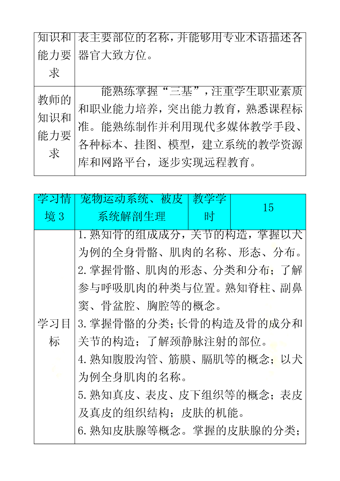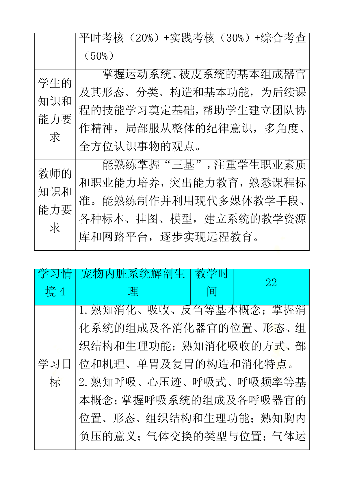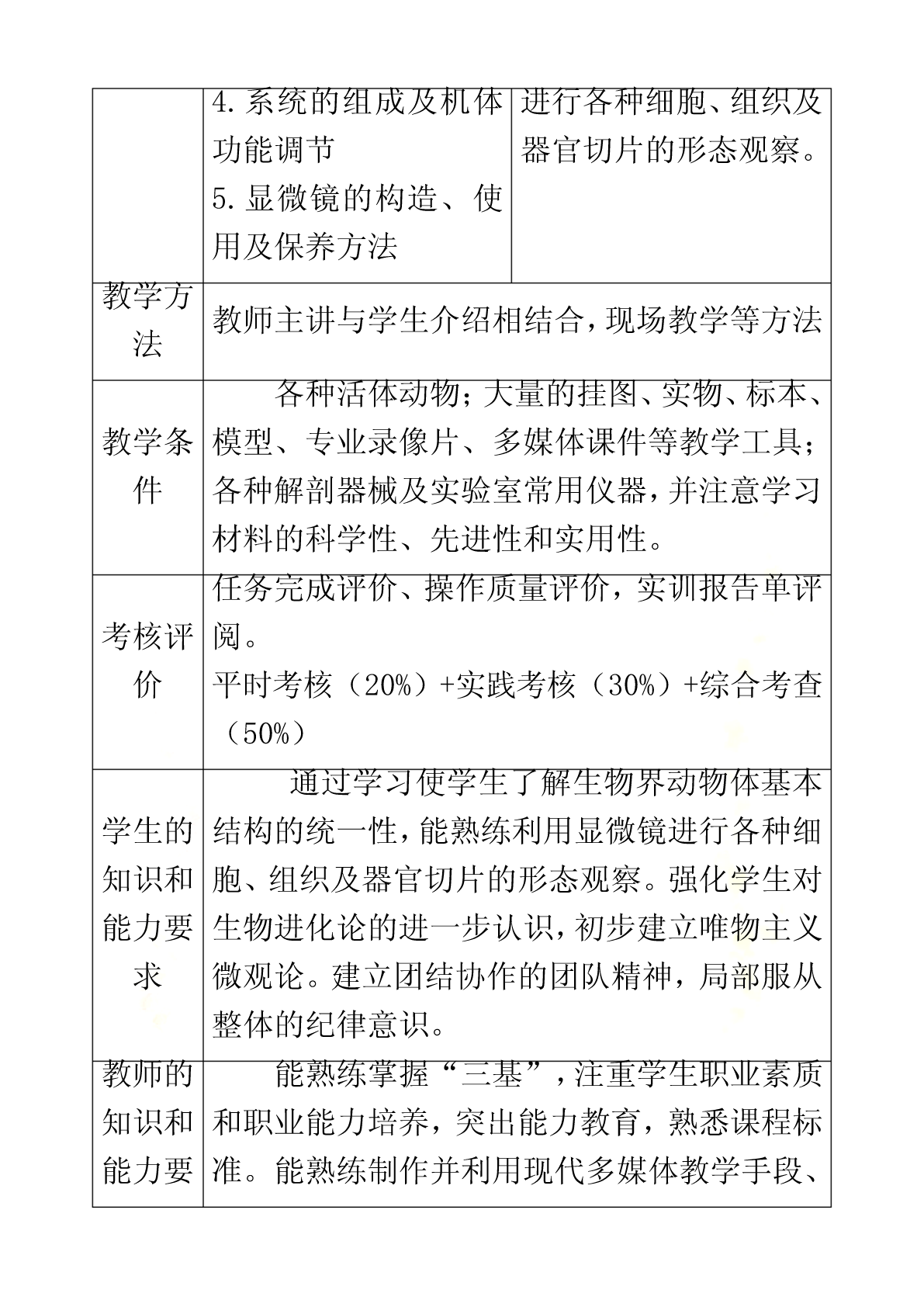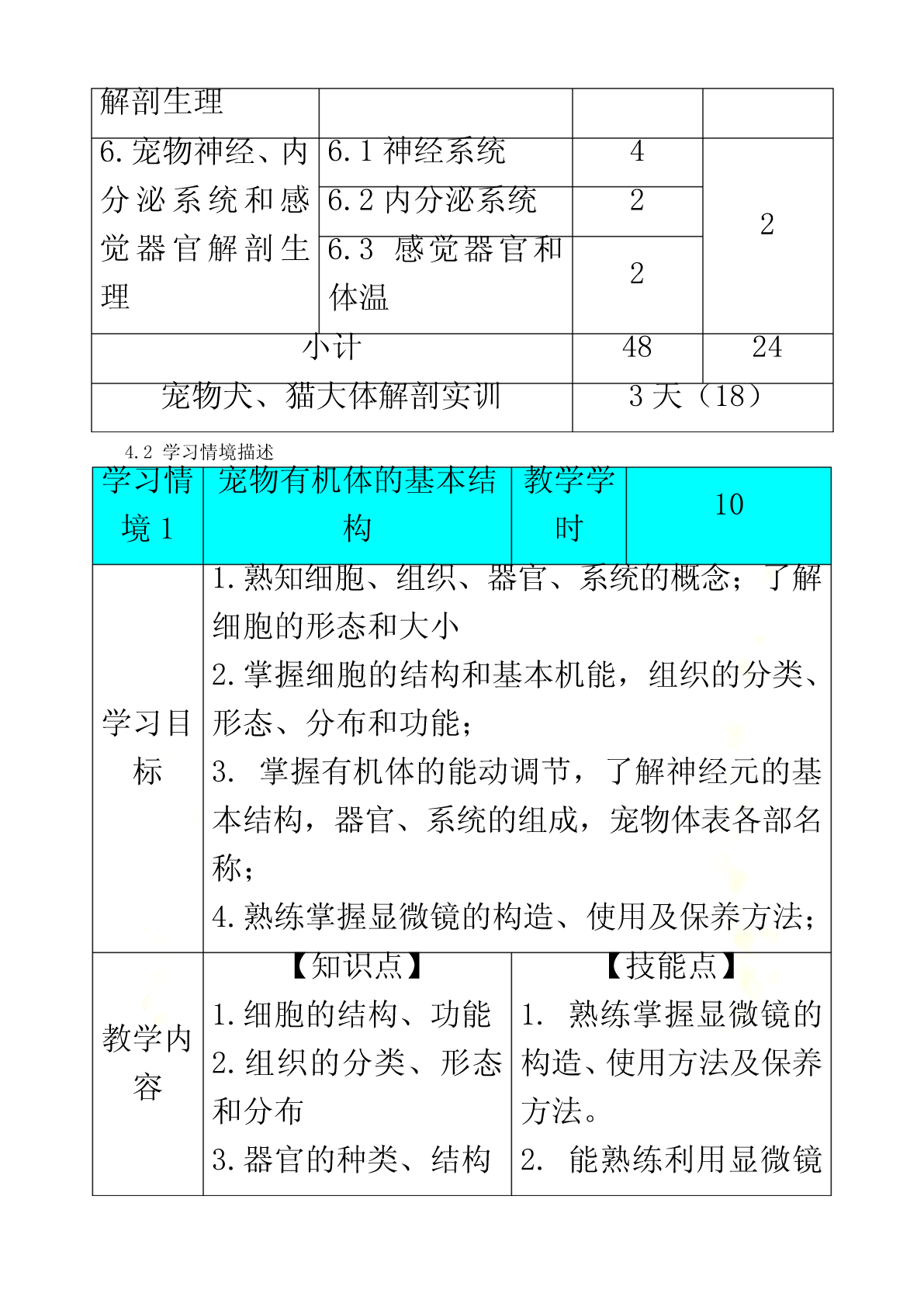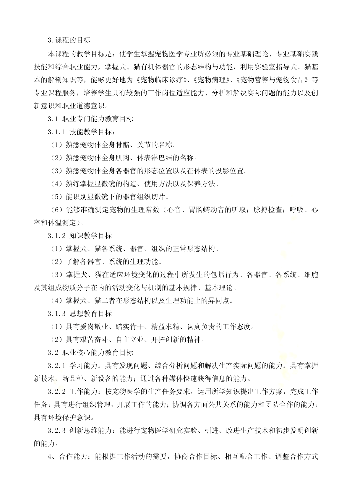 宠物解剖生理课程标准《宠物解剖生理》学习领域(课程)标准课程编号:适用专业:宠物医学专业课程类别:专业核心学习领域修课方式:必修教学时数:90学时,其中理论48学时,实验24学时,综合实践18学时1.课程性质《宠物解剖生理》课程是高职宠物医学专业必修的重要专业基础课,为其它专业课的核心基础。本课程是研究正常宠物有机体的宏观和微观形态结构、生理机能及其发生、发展规律的科学,研究宠物有机体基本生命活动及其规律的学科。通常学习,掌握被皮、运动、消化、呼吸、泌尿、生殖、心血管、神经、免疫、内分泌等系统的组成,掌握各系统器官的形态、结构和生理特点,重点熟悉犬、猫的解剖特征。本课程与后续的《宠物微生物》、《宠物营养与宠物食品》、《宠物美容与护理》、《宠物饲养技术》、《宠物普通病》、《宠物病理》、《宠物药理》等课程有着密切联系。宠物解剖生理既是有关专业基础课和专业课的先导,还应为学生拓宽知识面和提高其适应能力奠定坚实的理论和技能基础,为后期相关课程的学习,打下雄厚的理论基础和直观的形态学基础。2.课程的设计思路《宠物解剖生理》课程从基础理论性实践性特点出发,遵照课程教学内容“基础性、服务性、职业性”的要求,对课程教学内容进行科学的设置,在知识点和能力点的构建上,遵循学生学习认知规律和为后续专业课程学习奠定坚实基础的要求。倡导项目课程的教学理念,并根据本课程特点,着力培养学生的形象思维和动手能力。在教学过程中坚持使学生掌握基本知识和基本技能,同时注重学生职业素质和职业能力培养。《宠物解剖生理》作为一门研究宠物体形态结构及生理机能的科学,体现为专业课程服务的教学思想和加强学生职业素质、职业能力教育的理念,我们在教学内容建设中建立了课程标准。理论部分主要讲述宠物有机体各组织器官的正常解剖结构、形态、位置及相互关系,学习主要系统器官的生理功能及其生理生化机理。采用多媒体课件讲解,同时配合录像、实体解剖、标本等多种形式进行。实践教学以学生对犬、猫进行实体解剖为主,锻炼学生的动手操作和理论联系实际的能力。课程考核采用笔试与口试、理论知识与实际操作能力相结合的形式进行。课程教学方式积极倡导改革教学方法,充分发挥学生的主动性和积极性,在具体教学工作中,力争做到讲课内容的生动性、教学活动的互动性和学生学习的主动性相结合,使知识传授与能力培养、学生素质提高紧密结合起来。结合现代多媒体教学手段,采用了精讲与多练、讲与练相结合等多种教学方式,让学生参与其中,既提高了学生牢固掌握宠物解剖与生理知识,又培养了学生具有较强的观察、分析问题能和动手操作能力。3.课程的目标本课程的教学目标是:使学生掌握宠物医学专业所必须的专业基础理论、专业基础实践技能和综合职业能力,掌握犬、猫有机体器官的形态结构与功能,利用实验室指导犬、猫基本的解剖知识等,能够更好地为《宠物临床诊疗》、《宠物病理》、《宠物营养与宠物食品》等专业课程服务,培养学生具有较强的工作岗位适应能力、分析和解决实际问题的能力以及创新意识和职业道德意识。3.1职业专门能力教育目标3.1.1技能教学目标:(1)熟悉宠物体全身骨骼、关节的名称。(2)熟悉宠物体全身肌肉、体表淋巴结的名称。(3)熟悉宠物体全身各器官的形态位置以及在体表的投影位置。(4)熟练掌握显微镜的构造、使用方法以及保养方法。(5)能识别显微镜下的器官组织切片。(6)能够准确测定宠物的生理常数(心音、胃肠蠕动音的听取;脉搏检查;呼吸、心率和体温测定)。3.1.2知识教学目标(1)掌握犬、猫各系统、器官、组织的正常形态结构。(2)了解各器官、系统的生理功能。(3)掌握犬、猫在适应环境变化的过程中所发生的包括行为、各器官、各系统、细胞及其组成物质分子在内的活动变化与机制的基本规律、基本理论。(4)掌握犬、猫二者在形态结构以及生理功能上的异同点。3.1.3思想教育目标(1)具有爱岗敬业、踏实肯干、精益求精、认真负责的工作态度。(2)具有艰苦奋斗、自主立业、开拓创新的精神。3.2职业核心能力教育目标3.2.1学习能力:具有发现问题、综合分析问题和解决生产实际问题的能力;具有掌握新技术、新品种、新设备的能力;通过各种媒体快速获得信息的能力。3.2.2工作能力:按宠物医学的生产任务要求,运用所学知识提出工作方案,完成工作任务;具有进行组织管理,开展工作的能力;协调各方面公共关系的能力和团队合作的能力;具有环境保护意识。3.2.3创新思维能力:能进行宠物医学研究实验、引进、改进生产技术和初步发明创新的能力。4、合作能力:能根据工作活动的需要,协商合作目标、相互配合工作、调整合作方式并不断改善合作关系。4.课程内容和教育