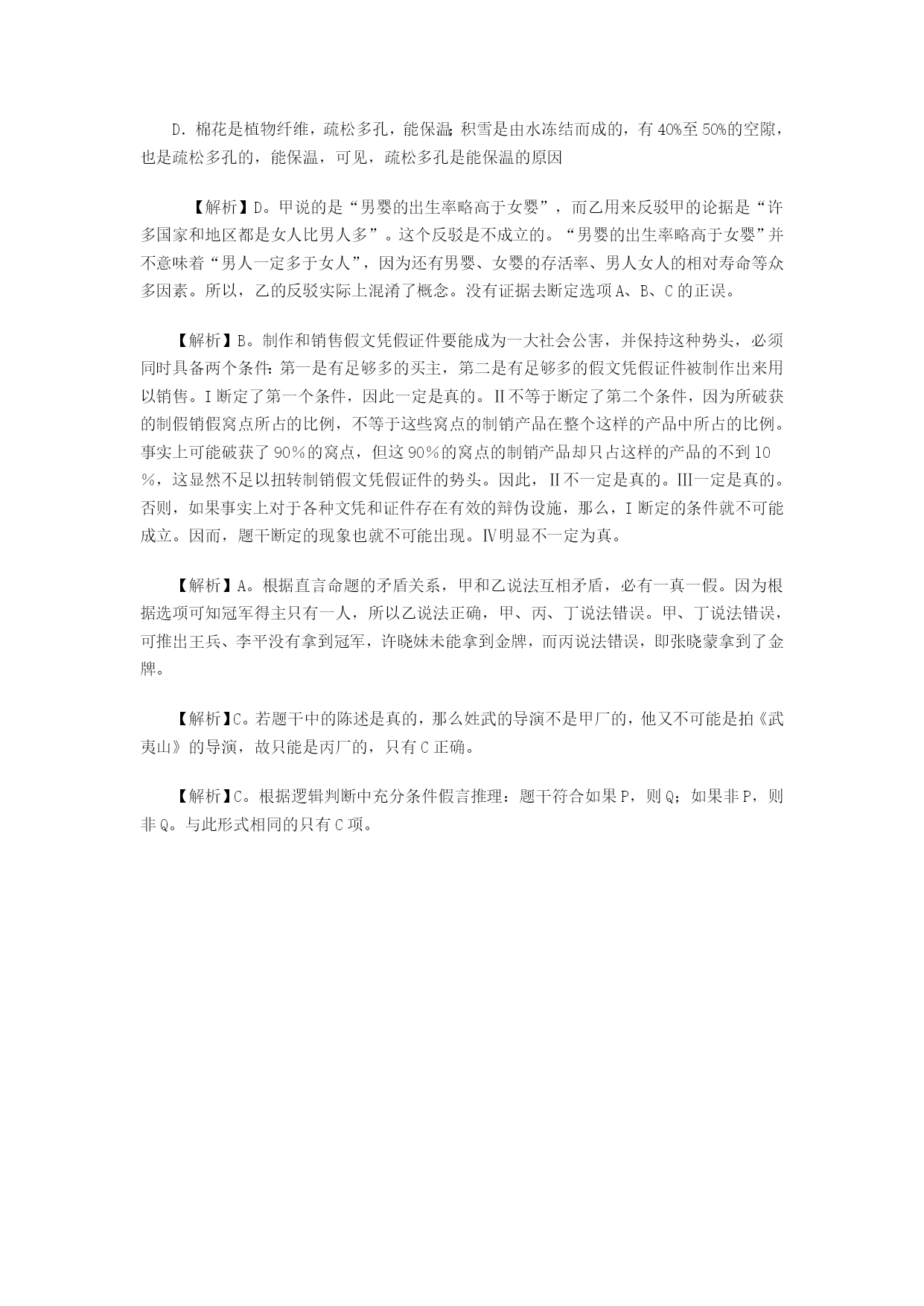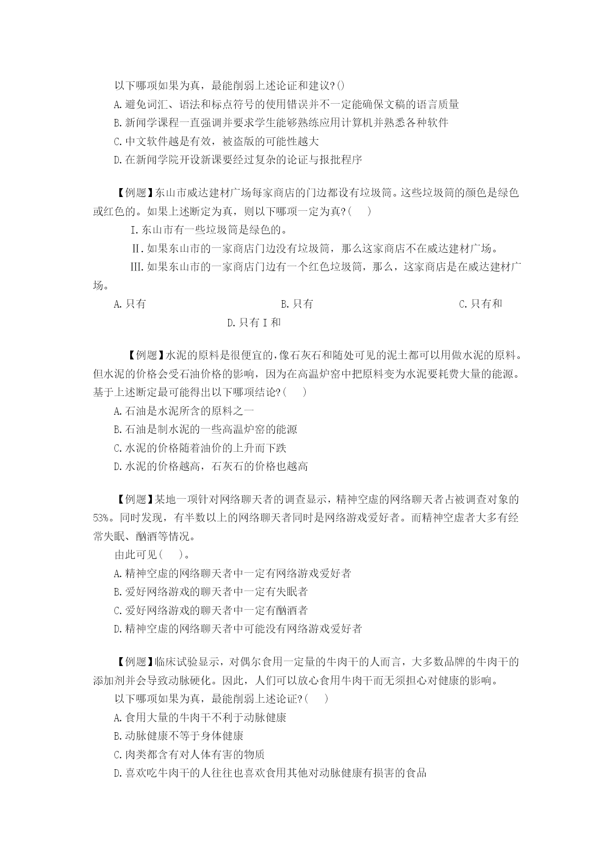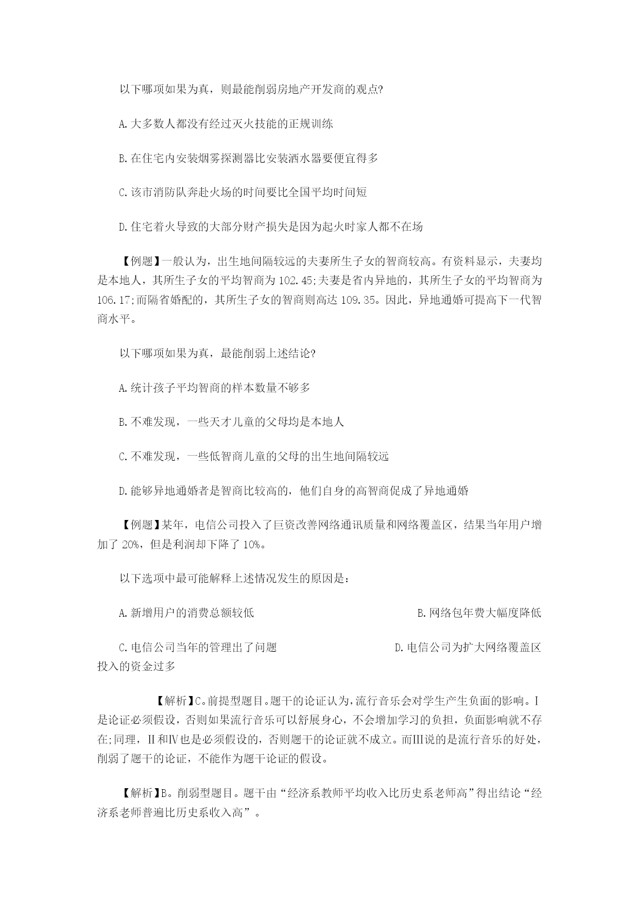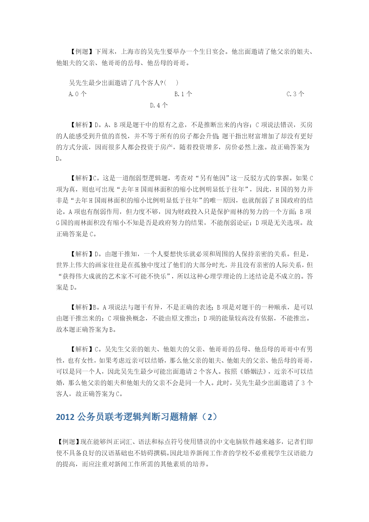 2012公务员联考逻辑判断习题精解(1)【例题】经济在增长,财富在增加,却没有更好的方式分流,买股票、做生意等等,很少能给投资带来安全感,在很缺乏安全感的情况下,房产投资成为一个不二选择,所有买过房的人都感受到升值的喜悦,在全世界来说房地产投资可能也是一个比较突出的选择。由此可以推出()。A.投资者缺乏安全感B.房产投资是现阶段最好的选择C.所有的房子都会升值D.房价长期看涨【例题】H国赤道雨林的面积每年以惊人的比例减少,引起了全球的关注。但是,卫星照片的数据显示,去年H国雨林面积的缩小比例明显低于往年。去年,H国政府支出数百万美元用以制止乱砍滥伐和防止森林火灾。H国政府宣称,上述卫星照片的数据说明,本国政府保护赤道雨林的努力取得了显著成效。以下哪项为真,最能削弱H国政府的上述结论?()A.去年H国用于保护赤道雨林的财政投入明显低于往年B.与H国毗邻的G国的赤道雨林的面积并未缩小C.去年H国的旱季出现了异乎寻常的大面积持续降雨D.森林面积的萎缩是全球性的环保问题【例题】根据一种心理学理论,一个人要想快乐就必须和周围的人保持亲密的关系。但是,世界上伟大的画家往往是在孤独中度过了他们的大部分时光,并且没有亲密的人际关系。所以这种心理学理论的上述结论是不成立的。以下哪项最可能是上述论证所假设的?()A.该心理学理论是为了揭示内心体验与艺术成就的关系B.有亲密人际关系的人几乎没有孤独的时候C.孤独对于伟大的绘画艺术家来说是必需的D.获得伟大成就的艺术家不可能不快乐【例题】远红外线被人体吸收后,可使生物细胞产生共振效应,可将远红外热能传递到人体皮下较深的部分,以下深层温度上升,产生的温热由内向外散发。这种作用强度,使毛细血管扩张,促进血液循环,强化各组织之间的新陈代谢,增加组织的再生能力,提高机体的免疫能力,调节精神的异常兴奋状态。从上段文字可以推出()。A.远红外线可使生物细胞温度上升B.远红外线对人体有医疗保健作用C.远红外线能使人精神亢奋D.远红外线能量较高可以治疗疾病【例题】下周末,上海市的吴先生要举办一个生日宴会。他出面邀请了他父亲的姐夫、他姐夫的父亲、他哥哥的岳母、他岳母的哥哥。吴先生最少出面邀请了几个客人?()A.0个B.1个C.3个D.4个【解析】D。A、B项是题干中的原有之意,不是推断出来的内容;C项说法错误,买房的人能感受到升值的喜悦,并不等于所有的房子都会升值;题干指出财富增加了却没有更好的方式分流,因而很多人都会投资于房产,随着投资增多,房价必然上涨。故正确答案为D。【解析】C。这是一道削弱型逻辑题,考查对“另有他因”这一反驳方式的掌握。如果C项为真,则也可出现“去年H国雨林面积的缩小比例明显低于往年”,因此,H国的努力并非是“去年H国雨林面积的缩小比例明显低于往年”的唯一原因,也就削弱了H国政府的结论。A项也有削弱作用,但力度不够,因为财政投入只是保护雨林的努力的一个方面;B项G国的雨林面积没有缩小不知是否是政府努力的结果,不能削弱论证;D项是无关选项。故正确答案是C。【解析】D。由题干推知,一个人要想快乐就必须和周围的人保持亲密的关系。但是,世界上伟大的画家往往是在孤独中度过了他们的大部分时光,并且没有亲密的人际关系,但“获得伟大成就的艺术家不可能不快乐”,所以这种心理学理论的上述结论是不成立的。答案是D。【解析】B。A项说法与题干有异,不是正确的表述;B项是对题干的一种顺承,是可以由题干推出来的;C项偷换概念,不能由原文推出;D项的能量较高没有依据,不能推出。故本题正确答案为B。【解析】C。吴先生父亲的姐夫、他姐夫的父亲、他哥哥的岳母、他岳母的哥哥中有男性,也有女性,如果考虑近亲可以结婚,那么他父亲的姐夫、他姐夫的父亲、他岳母的哥哥,可以是同一个人,因此吴先生最少可能出面邀请2个客人。按照《婚姻法》,近亲不可以结婚,那么他父亲的姐夫和他姐夫的父亲不会是同一个人。此时,吴先生最少出面邀请了3个客人,故正确答案为C。2012公务员联考逻辑判断习题精解(2)【例题】现在能够纠正词汇、语法和标点符号使用错误的中文电脑软件越来越多,记者们即使不具备良好的汉语基础也不妨碍撰稿。因此培养新闻工作者的学校不必重视学生汉语能力的提高,而应注重对新闻工作所需的其他素质的培养。以下哪项如果为真,最能削弱上述论证和建议?()A.避免词汇、语法和标点符号的使用错误并不一定能确保文稿的语言质量B.新闻学课程一直强调并要求学生能够熟练应用计算机并熟悉各种软件C.中文软件越是有效,被盗版的可能性越大D.在新闻学院开设新课要经过复杂的论证与报批程序【例题】东山市威达建材广场每家商店的门边都设有垃圾筒。这些垃圾筒的颜色是绿色或红色的。如果上述断定为真,则以下哪项一定为真?()I.东山市有一些垃圾筒是绿色的。Ⅱ.如果