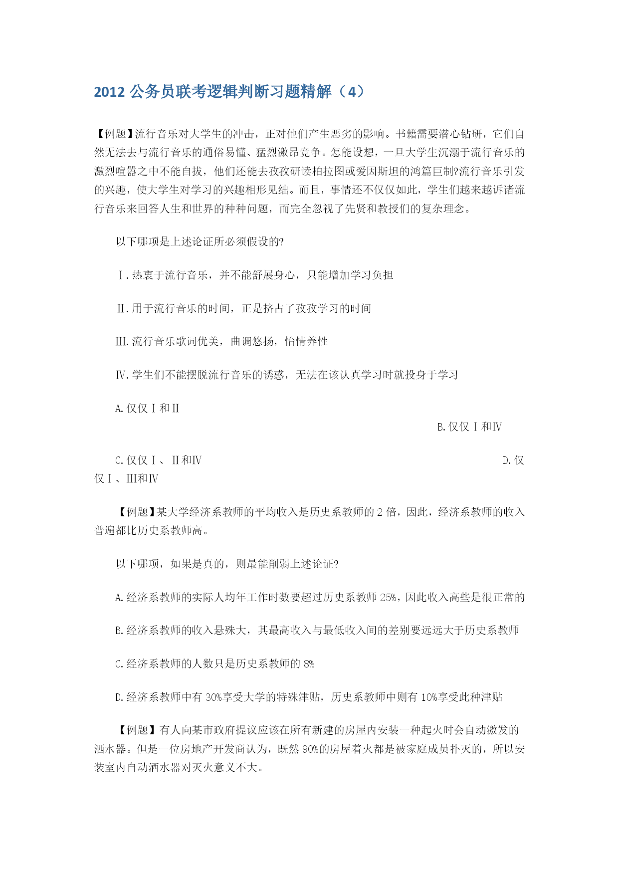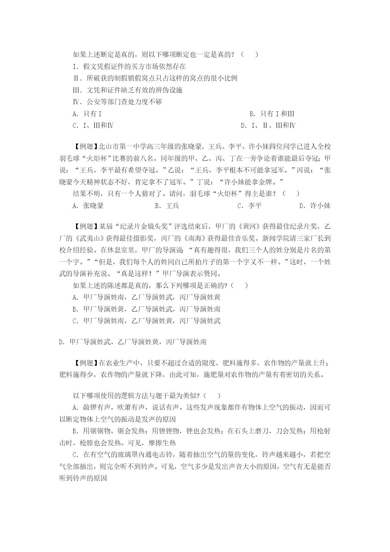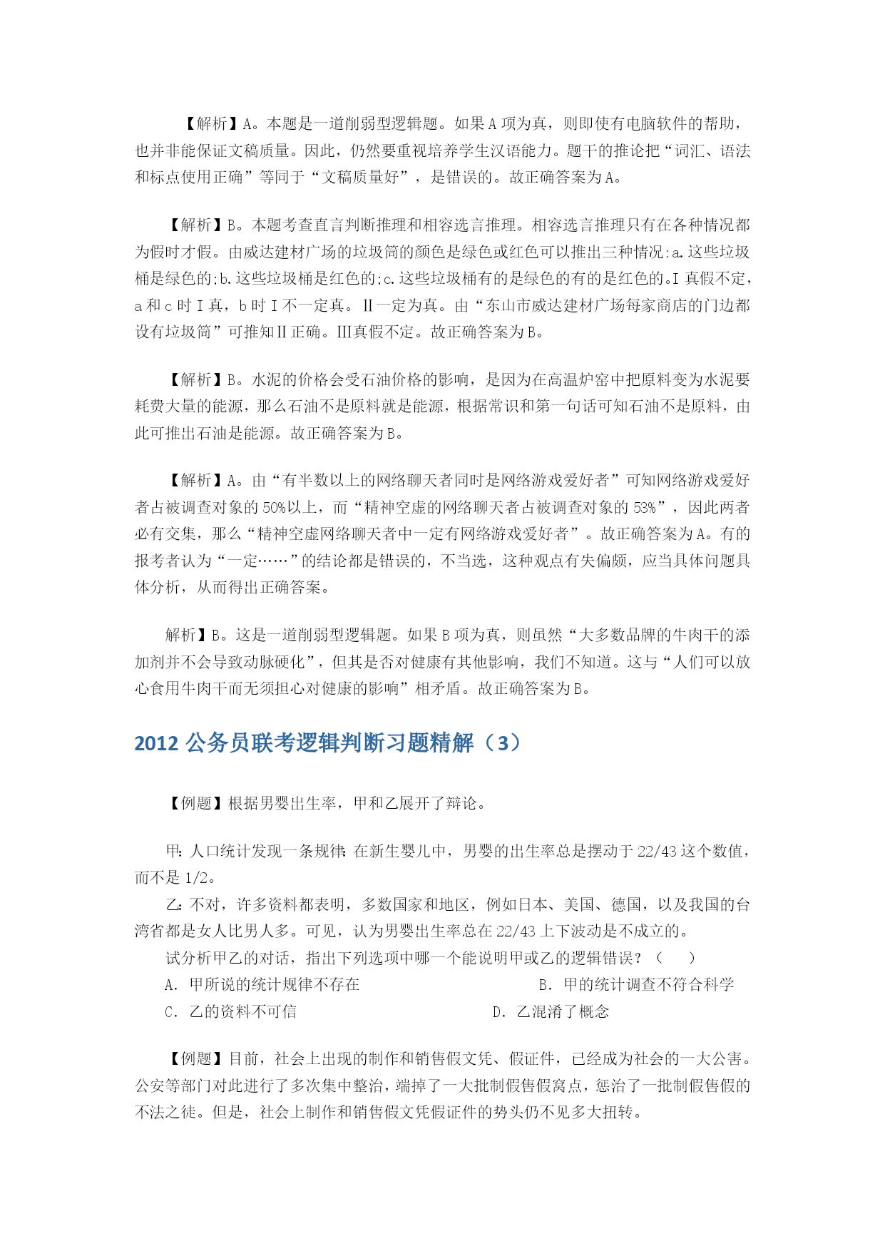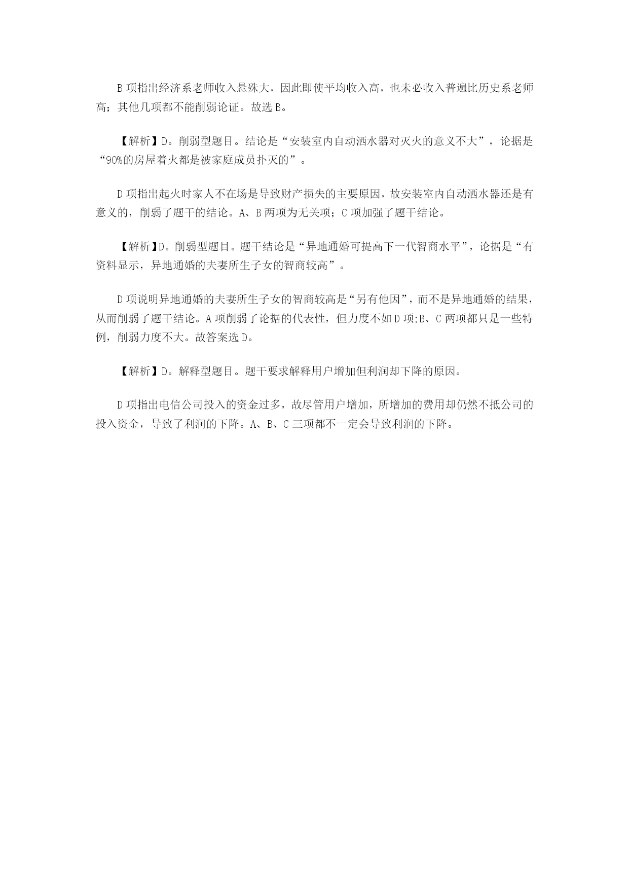 2012公务员联考逻辑判断习题精解(1)【例题】经济在增长,财富在增加,却没有更好的方式分流,买股票、做生意等等,很少能给投资带来安全感,在很缺乏安全感的情况下,房产投资成为一个不二选择,所有买过房的人都感受到升值的喜悦,在全世界来说房地产投资可能也是一个比较突出的选择。由此可以推出()。A.投资者缺乏安全感B.房产投资是现阶段最好的选择C.所有的房子都会升值D.房价长期看涨【例题】H国赤道雨林的面积每年以惊人的比例减少,引起了全球的关注。但是,卫星照片的数据显示,去年H国雨林面积的缩小比例明显低于往年。去年,H国政府支出数百万美元用以制止乱砍滥伐和防止森林火灾。H国政府宣称,上述卫星照片的数据说明,本国政府保护赤道雨林的努力取得了显著成效。以下哪项为真,最能削弱H国政府的上述结论?()A.去年H国用于保护赤道雨林的财政投入明显低于往年B.与H国毗邻的G国的赤道雨林的面积并未缩小C.去年H国的旱季出现了异乎寻常的大面积持续降雨D.森林面积的萎缩是全球性的环保问题【例题】根据一种心理学理论,一个人要想快乐就必须和周围的人保持亲密的关系。但是,世界上伟大的画家往往是在孤独中度过了他们的大部分时光,并且没有亲密的人际关系。所以这种心理学理论的上述结论是不成立的。以下哪项最可能是上述论证所假设的?()A.该心理学理论是为了揭示内心体验与艺术成就的关系B.有亲密人际关系的人几乎没有孤独的时候C.孤独对于伟大的绘画艺术家来说是必需的D.获得伟大成就的艺术家不可能不快乐【例题】远红外线被人体吸收后,可使生物细胞产生共振效应,可将远红外热能传递到人体皮下较深的部分,以下深层温度上升,产生的温热由内向外散发。这种作用强度,使毛细血管扩张,促进血液循环,强化各组织之间的新陈代谢,增加组织的再生能力,提高机体的免疫能力,调节精神的异常兴奋状态。从上段文字可以推出()。A.远红外线可使生物细胞温度上升B.远红外线对人体有医疗保健作用C.远红外线能使人精神亢奋D.远红外线能量较高可以治疗疾病【例题】下周末,上海市的吴先生要举办一个生日宴会。他出面邀请了他父亲的姐夫、他姐夫的父亲、他哥哥的岳母、他岳母的哥哥。吴先生最少出面邀请了几个客人?()A.0个B.1个C.3个D.4个【解析】D。A、B项是题干中的原有之意,不是推断出来的内容;C项说法错误,买房的人能感受到升值的喜悦,并不等于所有的房子都会升值;题干指出财富增加了却没有更好的方式分流,因而很多人都会投资于房产,随着投资增多,房价必然上涨。故正确答案为D。【解析】C。这是一道削弱型逻辑题,考查对“另有他因”这一反驳方式的掌握。如果C项为真,则也可出现“去年H国雨林面积的缩小比例明显低于往年”,因此,H国的努力并非是“去年H国雨林面积的缩小比例明显低于往年”的唯一原因,也就削弱了H国政府的结论。A项也有削弱作用,但力度不够,因为财政投入只是保护雨林的努力的一个方面;B项G国的雨林面积没有缩小不知是否是政府努力的结果,不能削弱论证;D项是无关选项。故正确答案是C。【解析】D。由题干推知,一个人要想快乐就必须和周围的人保持亲密的关系。但是,世界上伟大的画家往往是在孤独中度过了他们的大部分时光,并且没有亲密的人际关系,但“获得伟大成就的艺术家不可能不快乐”,所以这种心理学理论的上述结论是不成立的。答案是D。【解析】B。A项说法与题干有异,不是正确的表述;B项是对题干的一种顺承,是可以由题干推出来的;C项偷换概念,不能由原文推出;D项的能量较高没有依据,不能推出。故本题正确答案为B。【解析】C。吴先生父亲的姐夫、他姐夫的父亲、他哥哥的岳母、他岳母的哥哥中有男性,也有女性,如果考虑近亲可以结婚,那么他父亲的姐夫、他姐夫的父亲、他岳母的哥哥,可以是同一个人,因此吴先生最少可能出面邀请2个客人。按照《婚姻法》,近亲不可以结婚,那么他父亲的姐夫和他姐夫的父亲不会是同一个人。此时,吴先生最少出面邀请了3个客人,故正确答案为C。2012公务员联考逻辑判断习题精解(2)【例题】现在能够纠正词汇、语法和标点符号使用错误的中文电脑软件越来越多,记者们即使不具备良好的汉语基础也不妨碍撰稿。因此培养新闻工作者的学校不必重视学生汉语能力的提高,而应注重对新闻工作所需的其他素质的培养。以下哪项如果为真,最能削弱上述论证和建议?()A.避免词汇、语法和标点符号的使用错误并不一定能确保文稿的语言质量B.新闻学课程一直强调并要求学生能够熟练应用计算机并熟悉各种软件C.中文软件越是有效,被盗版的可能性越大D.在新闻学院开设新课要经过复杂的论证与报批程序【例题】东山市威达建材广场每家商店的门边都设有垃圾筒。这些垃圾筒的颜色是绿色或红色的。如果上述断定为真,则以下哪项一定为真?()I.东山市有一些垃圾筒是绿色的。Ⅱ.如果