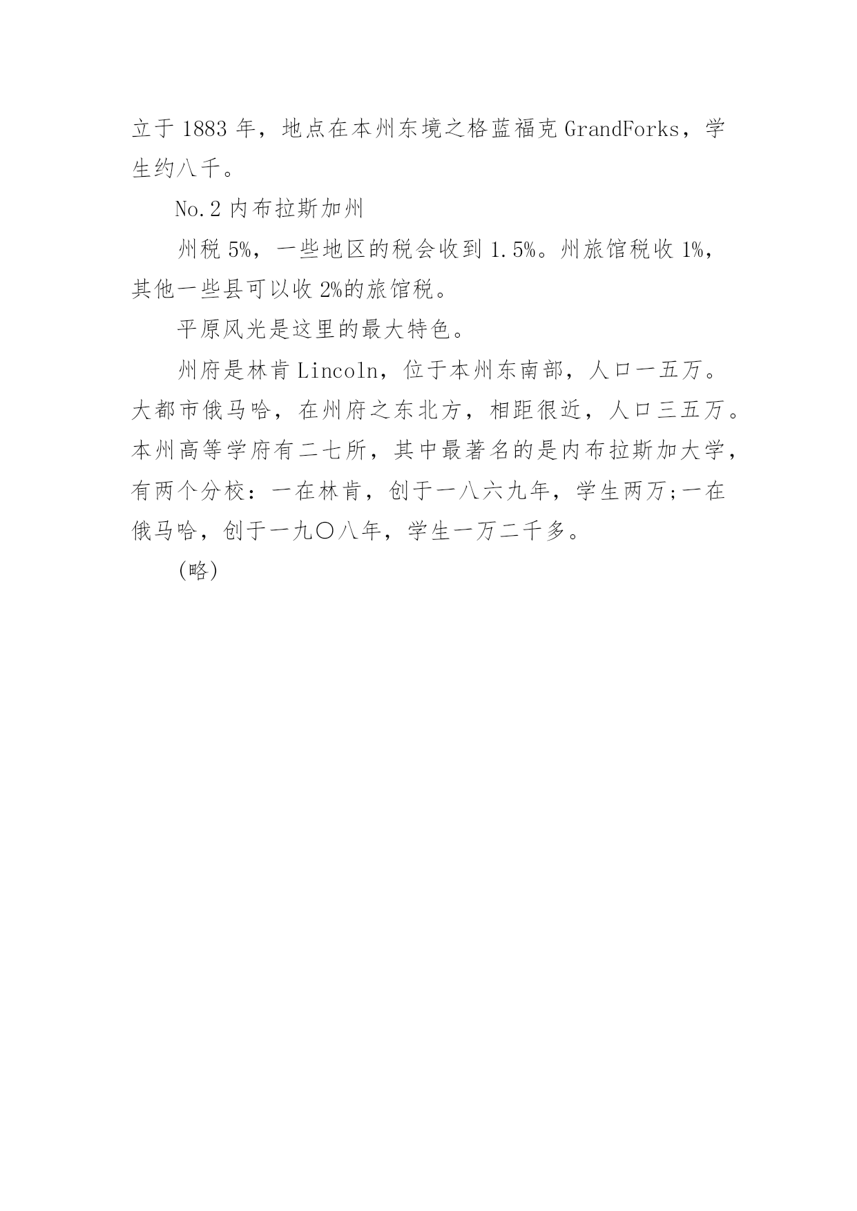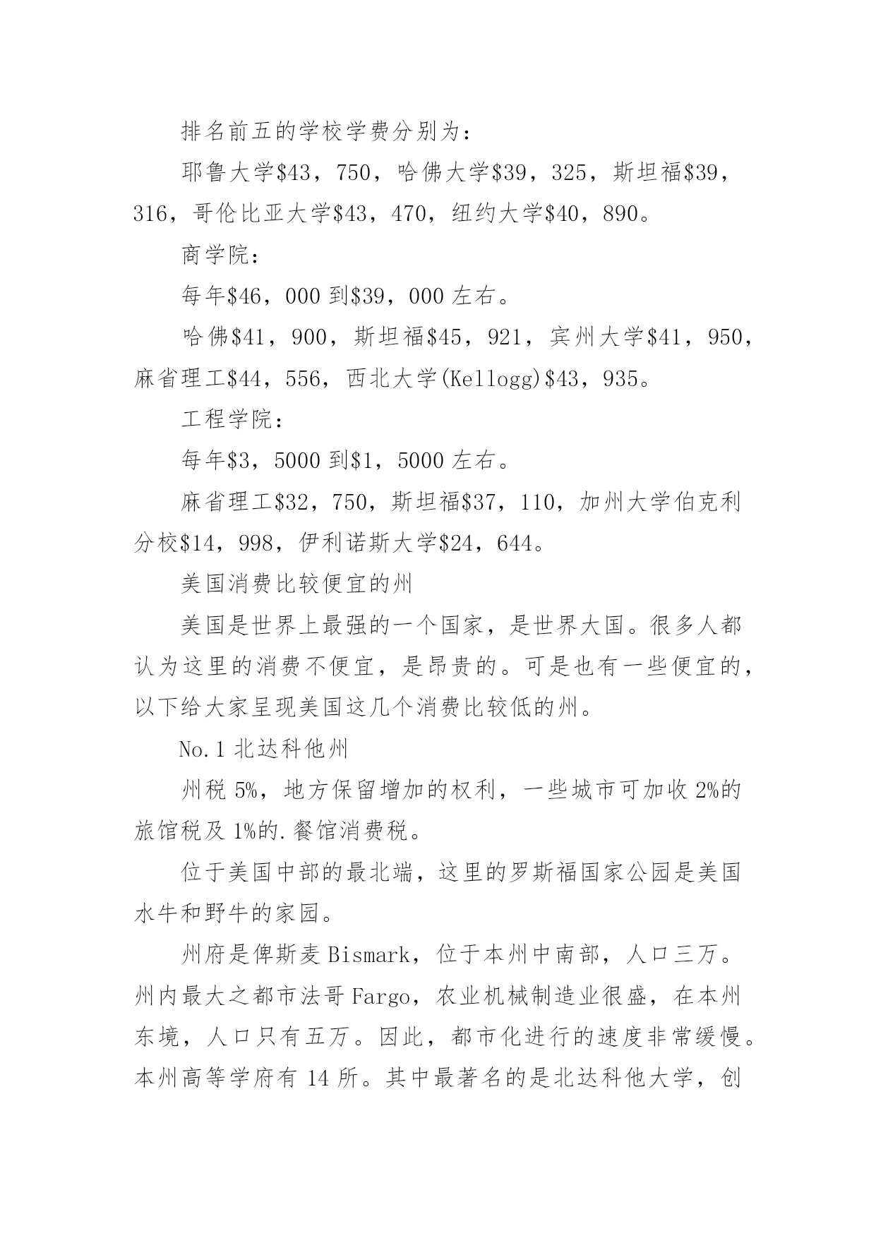 美国研究生留学费用介绍美国研究生留学费用介绍在美国读书可能显得昂贵,但是你恐怕已经意味到,对你所投资的钱来说,美国教育非常物有所值。本节具体考察在美国读研究生的费用以及你可以通过哪些途径来支付你的费用,包括来自大学和其它来源的财政资助。提前计划很多国际学生认为,在他们被美国的学院或大学录取后,他们可以很容易得到学习所需要的钱。这种想法是不切实际的。事实上,这样的假定只会使你面临艰苦和失望。大多数学校在一个学年开始学很长时间就对他们所有的奖学金以及学生贷款资金进行了分配。此外,作为申请学生签证的一个条件,你必须能够向研究生录取办公室以及你当地的美国一般公立大学学费每年约为USD10,000~20,000。(合计人民币7万~14万)私利一般35000-60000,当然如果是绝对名校的话还会有升高的。美国硕士一般要读两年,如管理、计算机等学科,读一年的有金融、法律LLM,而会记则需要9个月到19个月。根据所攻读专业学年的不同,以及公立大学与私立大学的不同,学费也有很大的差异。法学院:每年$43,000到$35,000左右。排名前五的学校学费分别为:耶鲁大学$43,750,哈佛大学$39,325,斯坦福$39,316,哥伦比亚大学$43,470,纽约大学$40,890。商学院:每年$46,000到$39,000左右。哈佛$41,900,斯坦福$45,921,宾州大学$41,950,麻省理工$44,556,西北大学(Kellogg)$43,935。工程学院:每年$3,5000到$1,5000左右。麻省理工$32,750,斯坦福$37,110,加州大学伯克利分校$14,998,伊利诺斯大学$24,644。美国消费比较便宜的州美国是世界上最强的一个国家,是世界大国。很多人都认为这里的消费不便宜,是昂贵的。可是也有一些便宜的,以下给大家呈现美国这几个消费比较低的州。No.1北达科他州州税5%,地方保留增加的权利,一些城市可加收2%的旅馆税及1%的.餐馆消费税。位于美国中部的最北端,这里的罗斯福国家公园是美国水牛和野牛的家园。州府是俾斯麦Bismark,位于本州中南部,人口三万。州内最大之都市法哥Fargo,农业机械制造业很盛,在本州东境,人口只有五万。因此,都市化进行的速度非常缓慢。本州高等学府有14所。其中最著名的是北达科他大学,创立于1883年,地点在本州东境之格蓝福克GrandForks,学生约八千。No.2内布拉斯加州州税5%,一些地区的税会收到1.5%。州旅馆税收1%,其他一些县可以收2%的旅馆税。平原风光是这里的最大特色。州府是林肯Lincoln,位于本州东南部,人口一五万。大都市俄马哈,在州府之东北方,相距很近,人口三五万。本州高等学府有二七所,其中最著名的是内布拉斯加大学,有两个分校:一在林肯,创于一八六九年,学生两万;一在俄马哈,创于一九○八年,学生一万二千多。(略)