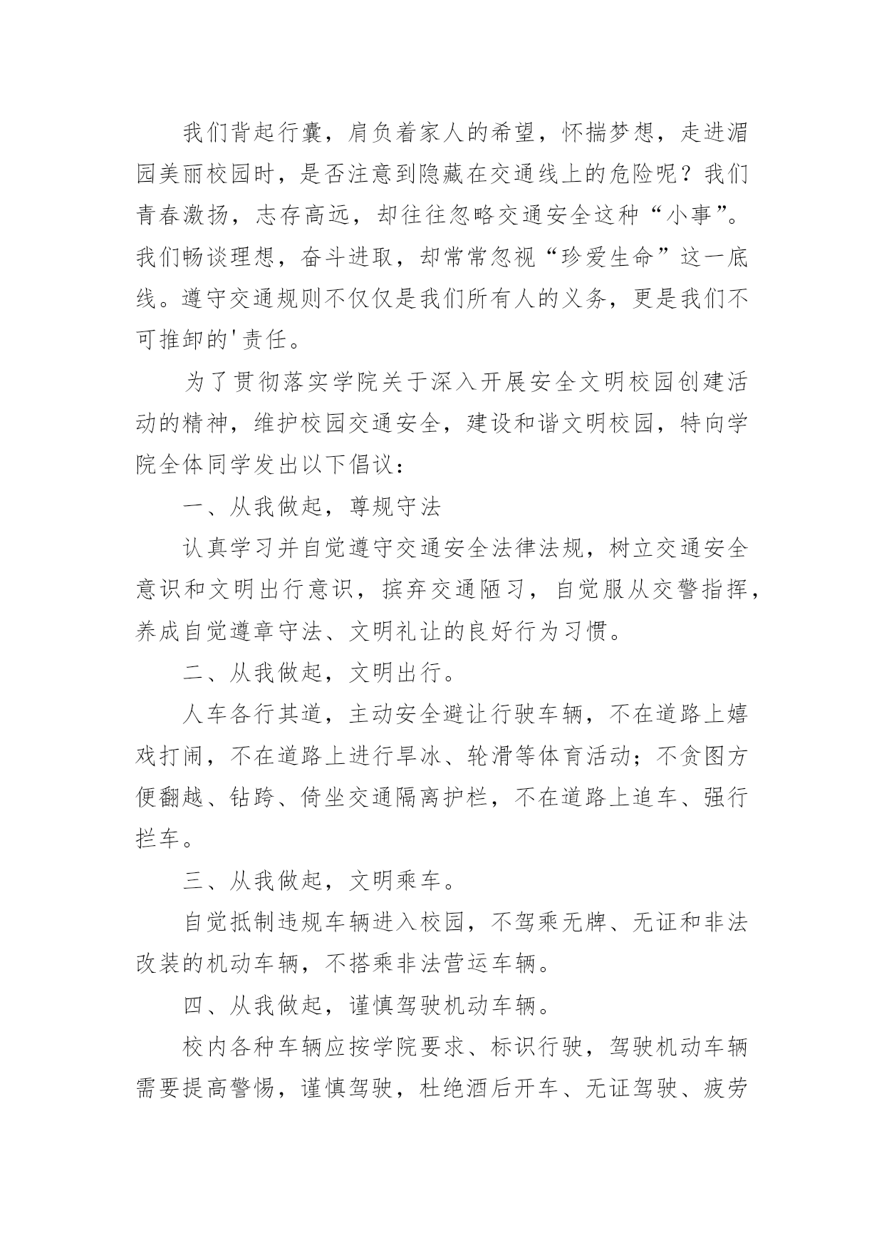 交通安全活动倡议书交通安全活动倡议书范文(精选8篇)在不断进步的时代,越来越多地方需要用到倡议书,在写作上,倡议书有一定的书写规范。那要怎么写好倡议书呢?以下是小编收集整理的交通安全活动倡议书范文(精选8篇),仅供参考,希望能够帮助到大家。交通安全活动倡议书1各位家长朋友:5月11日下午,我区斜口发生一起在校初中生无证驾驶二轮摩托车与货车相撞的交通事故。致乘坐摩托车的1名7岁儿童现场死亡和3名驾乘摩托车的初中学生不同程度受伤,造成重大交通事故。这起涉及学生的重大交通事故,再次为我们敲响了校园交通安全警钟。为了进一步加强我校校园交通安全教育,切实提高小学生交通安全意识,坚决遏制涉及学生的交通事故发生,现就加强我校校园交通安全教育工作倡议如下:1、认真落实《中华人民共和国道路交通安全法》关于开展在校学生交通安全教育的法律要求,教育引导学生树立牢固的遵法守规意识,不断提高学生的交通安全防范能力,切实做到防患于未然。2、面向学生家加强交通安全宣传,确保学生上放学和节假日期间的交通安全,明确家长的校外监护责任。通过校园、家庭的共同携手,努力营造良好氛围,全力确保学生交通安全及人身安全。3、未满12周岁学生不得在马路上学骑自行车,12岁以上学生骑自行车上路,要严格遵守交通安全法。4、未满16周岁不得驾驶符合国标的电动自行车(设计时速不超过25公里,车辆自重不超过55公斤,且必须配置骑行动力脚踏)。5、严禁小学生驾驶、乘坐各种电动两轮、三轮摩托车、老年代步车,严禁小学生无证驾驶各类机动车辆。6、严禁非制式校车车辆集中接送学生,家长驾驶私家车接送孩子的,原则上只允许接送自家的学生。7、凡发现黑校车接送学生及其他违法接送学生行为的,要立即现场予以制止,并及时告知学校,也可以报警或联系交警中队,依法及时查处,坚决予以取缔,以确保学生的人身安全。此致敬礼!倡议人:xxx日期:20xx年xx月xx日交通安全活动倡议书2广大驾驶员朋友、市民朋友们:当前,我市上下正全力以赴创建全国文明城市提名城市、国家卫生城市、国家全域旅游示范市、国家水生态文明城市。为助力“四城联创”“让群众更满意”,全市政法综治系统率先在公交营运车辆、公务车辆、公职人员私家车范围启动礼让斑马线行动,逐步引导规范广大车主增强礼让斑马线意识。开展“司机礼让斑马线·文明接力保平安”活动,为树立我市文明形象、打造平安和谐软环境、提高城市综合竞争力有着十分重要的意义。作为焦作人,尤其是党政机关企事业单位的党员、干部、职工,我们更要坚决响应市委、市政府关于创建全国文明城市提名城市、“让群众更满意”的号召,理应成为文明交通的实践者、参与者、支持者。为此,特发出如下倡议:一、文明驾车,礼让行人。车辆在行经斑马线路段时,主动减速行驶,不争道抢行;遇行人正在通过斑马线时,主动停车让行。要严格执行“三个必须”:必须提前减速,作好礼让准备;当有行人通过斑马线时,必须停车让行;当无行人通过斑马线时,必须低速通过。二、文明出行,遵章守法。行人通过路口或者横过道路,应当走斑马线,遵守交通信号灯指示,不跨越护栏;通过无交通信号灯斑马线时,要注意观察两边来车,确认机动车停车礼让时,应当快速通过,不在马路上追逐嬉戏、打闹、玩手机,主动营造“路畅人和”的出行环境。三、文明交通,促进和谐。驾驶人和行人主动接受社会监督。文明行车,从按章行驶、礼让斑马线开始;文明过马路,从遵守信号指示、各行其道做起,主动为停车礼让驾驶员竖起大拇指,积极为礼让行为点赞,共同营造“文明出行,车人相让”的良好氛围。让我们积极投身于“司机礼让斑马线·文明接力保平安”行动,做文明人、行文明路、开文明车,使斑马线成为礼貌线、文明线、安全线,成为XX的一道风景线,为“四城联创”和建设创新XX、富裕XX、美丽XX、平安焦作增光添彩!此致敬礼!倡议人:xxx日期:20xx年xx月xx日交通安全活动倡议书3亲爱的同学们:你们好!每天来往于上下学路上,在行人车辆拥挤的道路上,你是否看到了潜藏的危险呢?随着年龄的增长,我们同学的道路交通安全意识不断增强,但是仍有少部分同学因道路交通安全意识淡薄而受到了血的教训,那一个幕幕令人心痛的画面,留给我们的是心灵上的震撼和对受伤者无尽的痛惜。在痛惜的同时,我们更应该清醒地认识到,自觉遵守交通法规,就是珍爱生命!俗话说:“没有规矩不成方圆”。遵守交通法规是我们每个人的义务,更是我们每个人的责任,只要我们每个人都严守交通规则,我们的社会就会向着文明的彼岸又迈进一步。在此,向全校学生提出几点倡议:1.认真学习交通法规知识,自觉遵守交通规则,红灯停、绿灯行,过马路走斑马线,牢牢树立安全行路的意识。2.遵守交通规则,做到文明行路:必须在人行道上行走,没有人行道的靠路边行走;不在马路上追逐打闹,急拐猛跑或游戏上学、放学按时回家。3.以