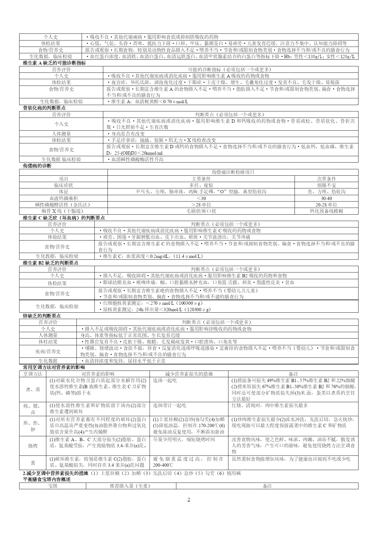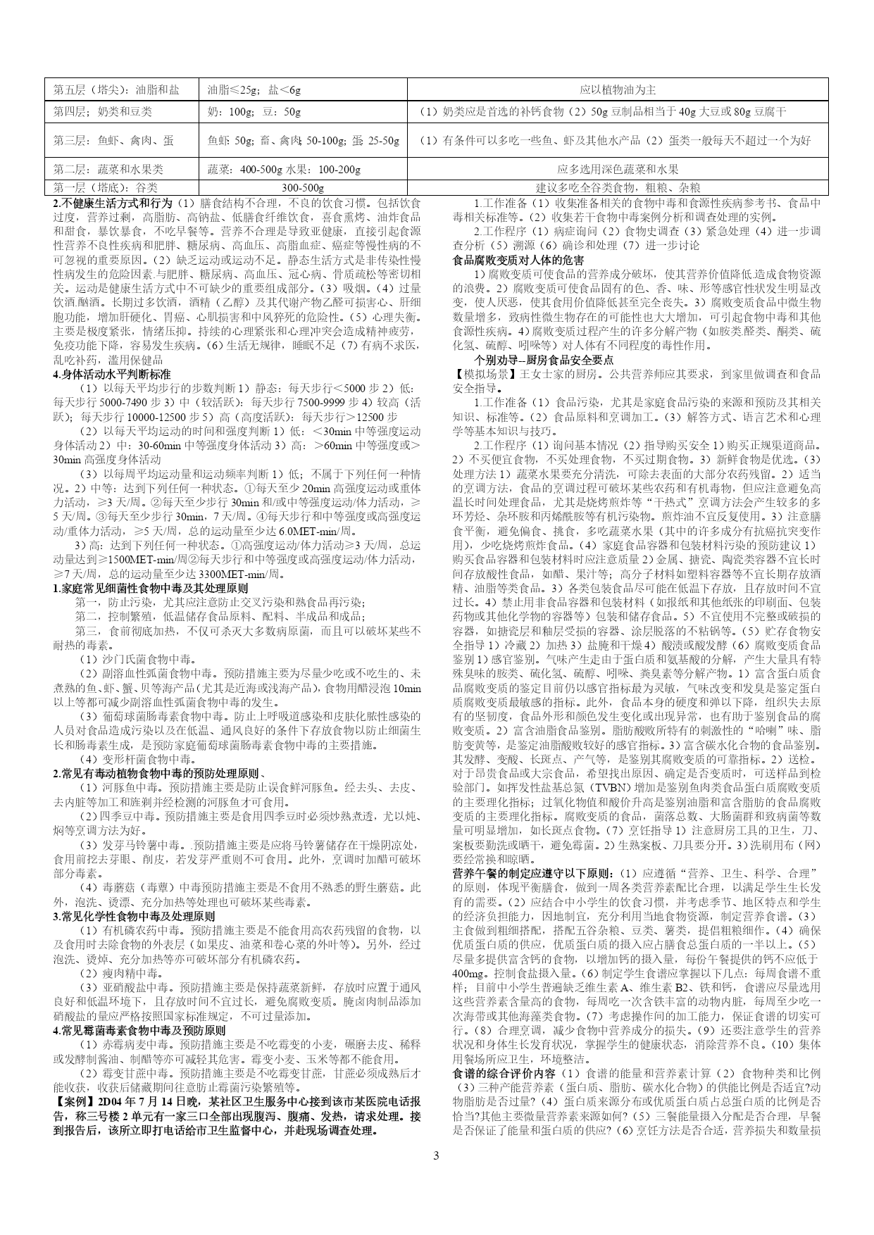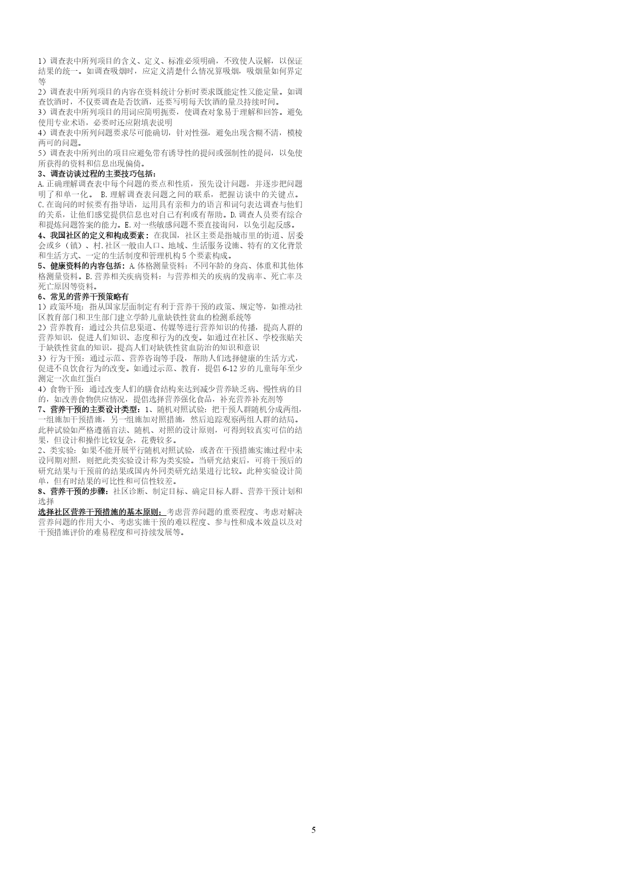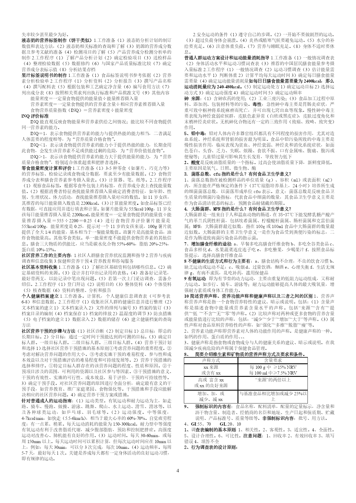 PAGEPAGE5指标器具测量部位测量方法身高身高计头顶到脚掌赤足,立正,足跟、骶骨部及两肩胛间与立柱相接触,耳屏上缘与两眼框下缘最低点呈水平位,将水平压板轻轻沿立柱下滑轻压被测者头顶,读数。体重体重计全身总重测量之前1小时内禁食,排空尿液、粪便,脱去衣服、帽鞋袜,安静站在秤盘中央,读数。坐高坐高计头顶到臀部脱去鞋帽袜,坐到坐盘或凳子上,骶骨靠量板上身直立,两大腿与躯体成直角,足尖向前,两足平放,向下移动头版与头顶接触,读数头围塑料帯尺两眉弓上方突出部位、枕骨粗隆脱去帽子围巾,用软尺在两眉弓上方突出部位到枕骨粗隆一周,记录读数上臂围塑料带尺在肩峰和尺骨鹰嘴连线的中点取上臂自肩峰和尺骨鹰嘴连线的中点,软尺测量,水平围绕一周,记录读数。胸围塑料带尺男:两乳头下缘女:测量胸围以胸骨中线4肋做水平固定点正常成年人测量胸围以两乳头下缘或胸骨中线4肋高度为水平固定点,绕后到两肩胛下角下缘回到固定点,读数。皮褶厚度皮褶厚度肱三头肌皮褶厚度肩胛下角皮褶厚度腹部皮褶厚度直立,双手自然下垂,在上臂自肩峰和尺骨鹰嘴连线的中点上方2cm处,用左手拇食中指将皮肤和皮下组织提起来,在其下方1cm处,用皮褶计卡住测量,读数。场地时间场地应保持安静,照明良好,远离噪音,通风良好,室温20-22℃为宜,相对湿度在50-55%;测量时间:上午10时左右。1、24h回顾法的特点:24h膳食回顾法是通过询问被调查对象过去24h实际的膳食情况,对其食物摄入量进行计算和评价的一种方法。优点是所用时间短、应答者不需要较高文化,能得到个体的膳食营养素摄入状况,便于与其他相关因素进行分析比较,凋查结果对于人群营养状况的原因分析非常有价值。缺点是应答者的回颇依赖于短期记忆,对调查者要严格培训,不然调查者之间的差别很难标准化。步骤1.工作准备(1)设计调查表(2)准备食物模型、图谱、各种标准容器(3)熟悉被调查者家中常用的容器和食物分量(4)食物成分表或营养计算器软件(5)培训和调查2.工作程序(1)入户说明来意(2)说明调查内容(3)调查和记录(4)引导回顾记录要点(5)弥补调查不足(6)资料的核查(7)个人人日数的计算个人人目数=早餐餐次总数×早餐餐次比+中餐餐次总数×中餐餐次比+晚餐餐次总数×晚餐餐次比全家总人日数=所有在家用餐个人的人日数之和2、回顾法和膳食史法的原理和特点膳食史法已被广泛用于营养流行病学调查研究。对于许多慢性疾病,研究过去的膳食状况比研究现在的更有意义。膳食史法的优点是可以进行具有代表性膳食模式的调杳,并且样本量大,费用低,使用人力少,一般不影响被调查者的膳食习惯和进餐方式。膳食史法是一种抽象的方法,进行这样的调查需要营养专家的指导。3、记账法的原理和优缺点记账法的操作较简单,费用低,所需人力少,适用于大样本膳食调查。且易于为膳食管理人员掌握。该法适合于家庭调查,也适合于幼儿园、中小学校或部队的调查。记账法可以调查较长时期的膳食,如1个月或更长。在记录精确和每餐用餐人数统计确实的情况下,能够得到较准确的结果。与其他方法相比较,不但可以调查妊时期的膳食,而且适合于进行全年不同季节的调查。缺点是调查结果只能得到全家或集体中人均的膳食摄入量,难以分析个体膳食摄入情况。基本方法和要点记账法的基础是膳食账目,所以要求被调查单位的伙食账目完善,数据可靠。对于家庭,一般没有食物消耗账目可查,如用记账法进行调查时,可在调查开始前登记其所有储存的及新购进的食物种类和数量,调查期间购入的食物,在调查结束时再次称量全部剩余食物的重量,然后计算出调查期间消费的食品总量。由于家庭成员年龄、性别等相差较大,因此人数也需按混合系数计算其营养摄人量。步骤1.工作准备(1)食物成分表、计算器或计算软件(2)相关的数据调查、计算表格(3)培训相关调查人员(4)确定调查单位和时间2.工作程序(1)与膳食管理人员见面(2)了解食物结存(3)了解进餐人数(4)了解食物购进数量(5)食物清耗量情况计算和记录(6)计算总人日数(7)核对记录结果(8)编号与归档4、称重记账法的原理和优缺点由调查对象或研究者称量记录一定时期内的食物消耗总量,研究者通过奄阅这些记录,并根据同一时期进餐人数,计算每人每日各种食物的平均摄入量。该法较称重法操作简单,所需费用低,人力少,适合于大样本调查。同时,记录较单纯记账法精确,能够得到较准确的结果。此法较少依赖记账人员的记忆,食物遗漏少。而且,伙食单位的工作人员经过短期培训即可掌握这种方法,能够定期自行调查。这种方法适合进行全年不同季节的调查。但是这种方法只能得到全家或集体中人均的摄入量,难以分析个体膳食摄入情况。2、相关计算方法家庭每种食物实际消耗量=食物结存量+购进食物总量-废弃食物总量-剩余总量家庭平均每人每日每种食物摄入量=