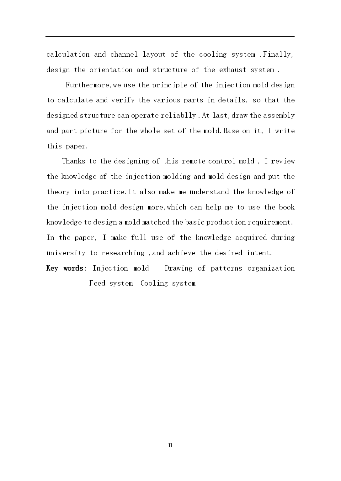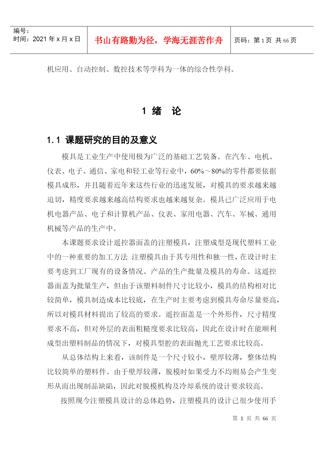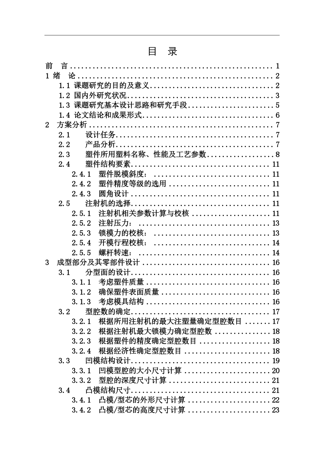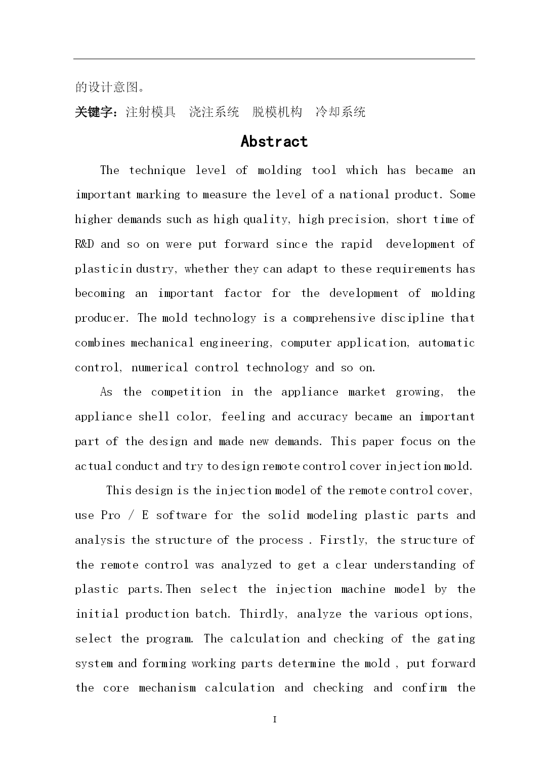 PAGEPAGEII摘要模具生产技术水平的高低,已成为衡量一个国家产品制造水平高低的重要标志。塑料工业的飞速发展,对注塑模具的设计与生产提出了质量好、制造精度高、研发周期短等越来越高的要求,能否适应这种需求已成为模具生产企业发展的关键因素。模具技术是融合机械工程、计算机应用、自动控制、数控技术等学科为一体的综合性学科。随着家电市场竞争的白热化,家电外壳设计成为了衡量家电外壳色彩、手感、精度的重要一环,进而对设计提出了新的需求。本毕业设计正是从实际使用出发,进行遥控器面盖注塑成型模具的设计。本设计是对遥控器面盖进行的注塑模型设计,利用Pro/E软件对塑件进行了实体造型,并对塑件结构进行了工艺剖析。首先对遥控器的结构工艺性进行分析,清楚了解塑件;由生产批量初步选定注射机型号;然后对本次模具设计的各个方案进行论证分析,从选定方案中对浇注系统、成型工作零件的计算及校核,从中确定模架,推出与抽芯机构的计算及校核,冷却系统的计算及其水道布置设计,在最后对排气和导向与定位结构的设计。其次利用注塑模具设计原理对各个具体系统零件进行详细的计算和校核,使设计出的结构可确保模具可靠运行,在此基础上完成了本毕业论文的写作。最后绘制整套模具的装配图和零件图。通过对本课题遥控器模型设计,我重温了注塑成型与模具设计知识,使书本知识和理论与实际生产相结合,加强了对注塑模具设计知识的理解,使自己能运用书本知识设计出基本符合生产要求的模具。在论文中我充分地运用了大学期间所学到的知识。进行了研究,巩固和深化,达到了预期的设计意图。关键字:注射模具浇注系统脱模机构冷却系统AbstractThetechniquelevelofmoldingtoolwhichhasbecameanimportantmarkingtomeasurethelevelofanationalproduct.Somehigherdemandssuchashighquality,highprecision,shorttimeofR&Dandsoonwereputforwardsincetherapiddevelopmentofplasticindustry,whethertheycanadapttotheserequirementshasbecominganimportantfactorforthedevelopmentofmoldingproducer.Themoldtechnologyisacomprehensivedisciplinethatcombinesmechanicalengineering,computerapplication,automaticcontrol,numericalcontroltechnologyandsoon.Asthecompetitionintheappliancemarketgrowing,theapplianceshellcolor,feelingandaccuracybecameanimportantpartofthedesignandmadenewdemands.Thispaperfocusontheactualconductandtrytodesignremotecontrolcoverinjectionmold.Thisdesignistheinjectionmodeloftheremotecontrolcover,usePro/Esoftwareforthesolidmodelingplasticpartsandanalysisthestructureoftheprocess.Firstly,thestructureoftheremotecontrolwasanalyzedtogetaclearunderstandingofplasticparts.Thenselecttheinjectionmachinemodelbytheinitialproductionbatch.Thirdly,analyzethevariousoptions,selecttheprogram.Thecalculationandcheckingofthegatingsystemandformingworkingpartsdeterminethemold,putforwardthecoremechanismcalculationandcheckingandconfirmthecalculationandchannellayoutofthecoolingsystem.Finally,designtheorientationandstructureoftheexhaustsystem.Furthermore,weusetheprinc
