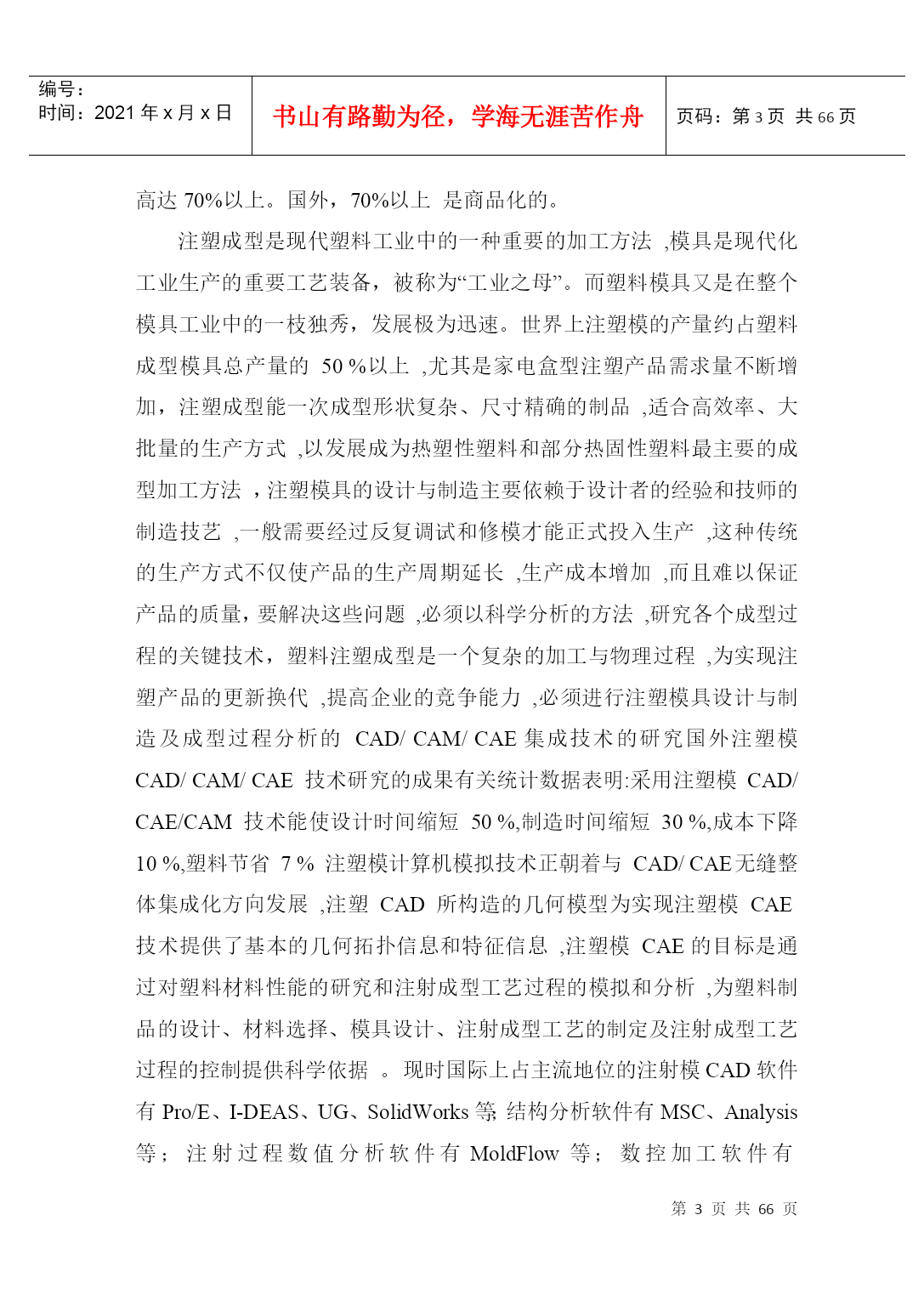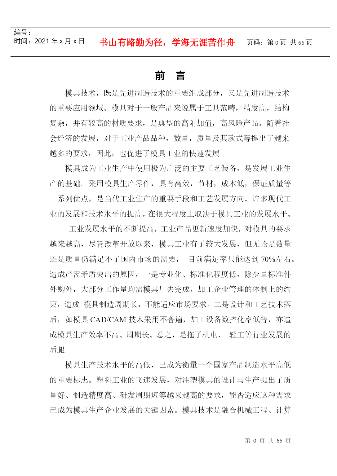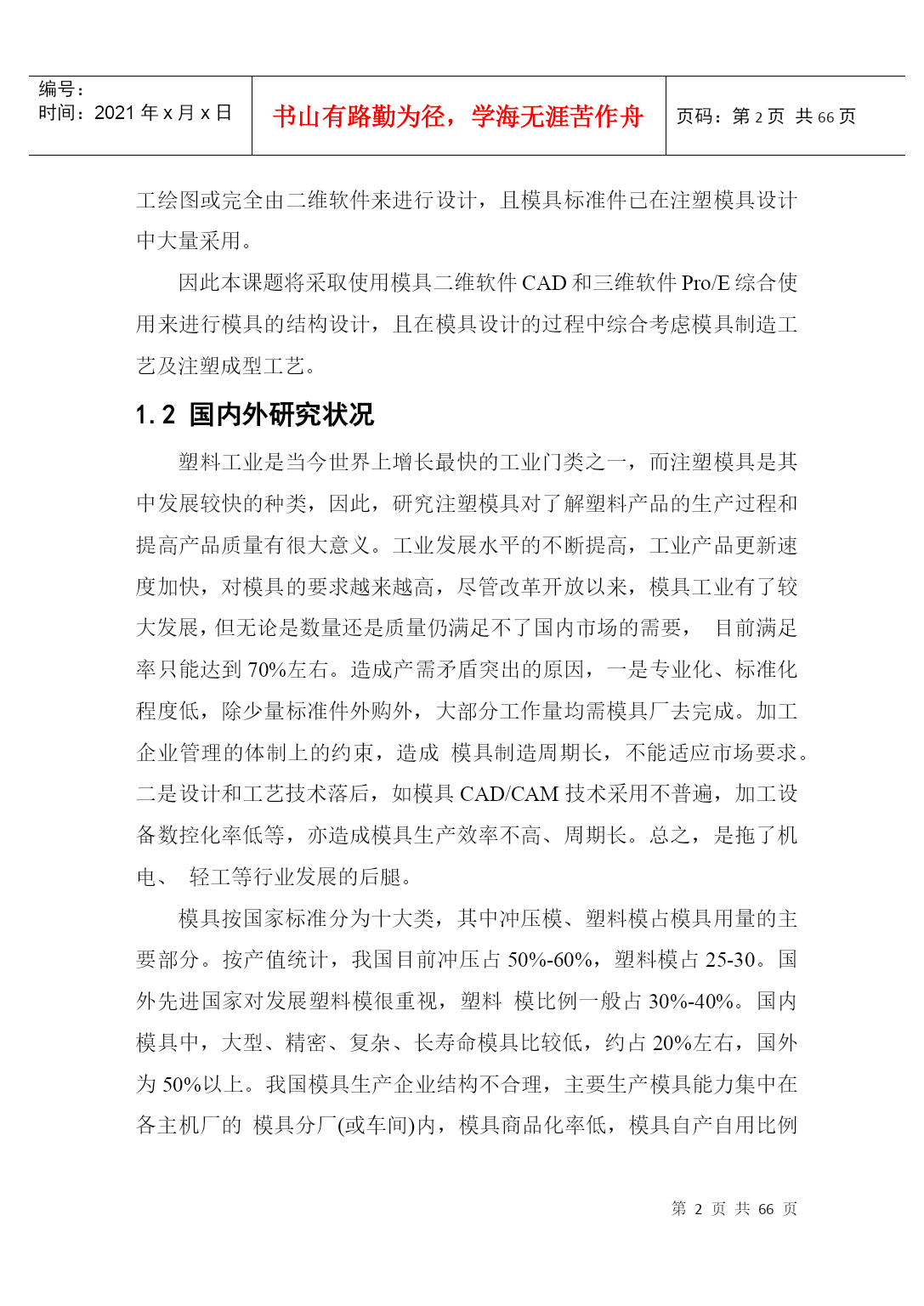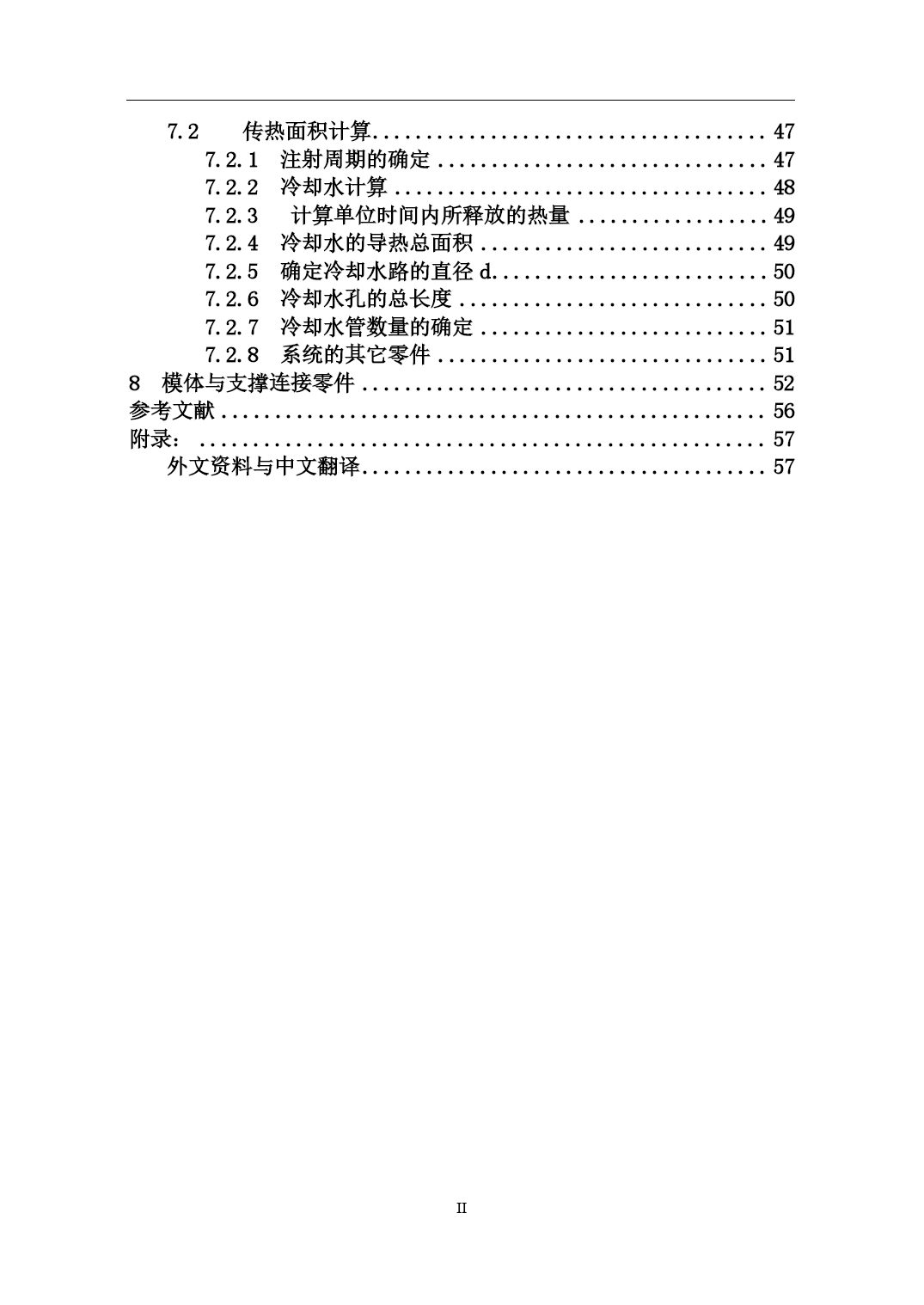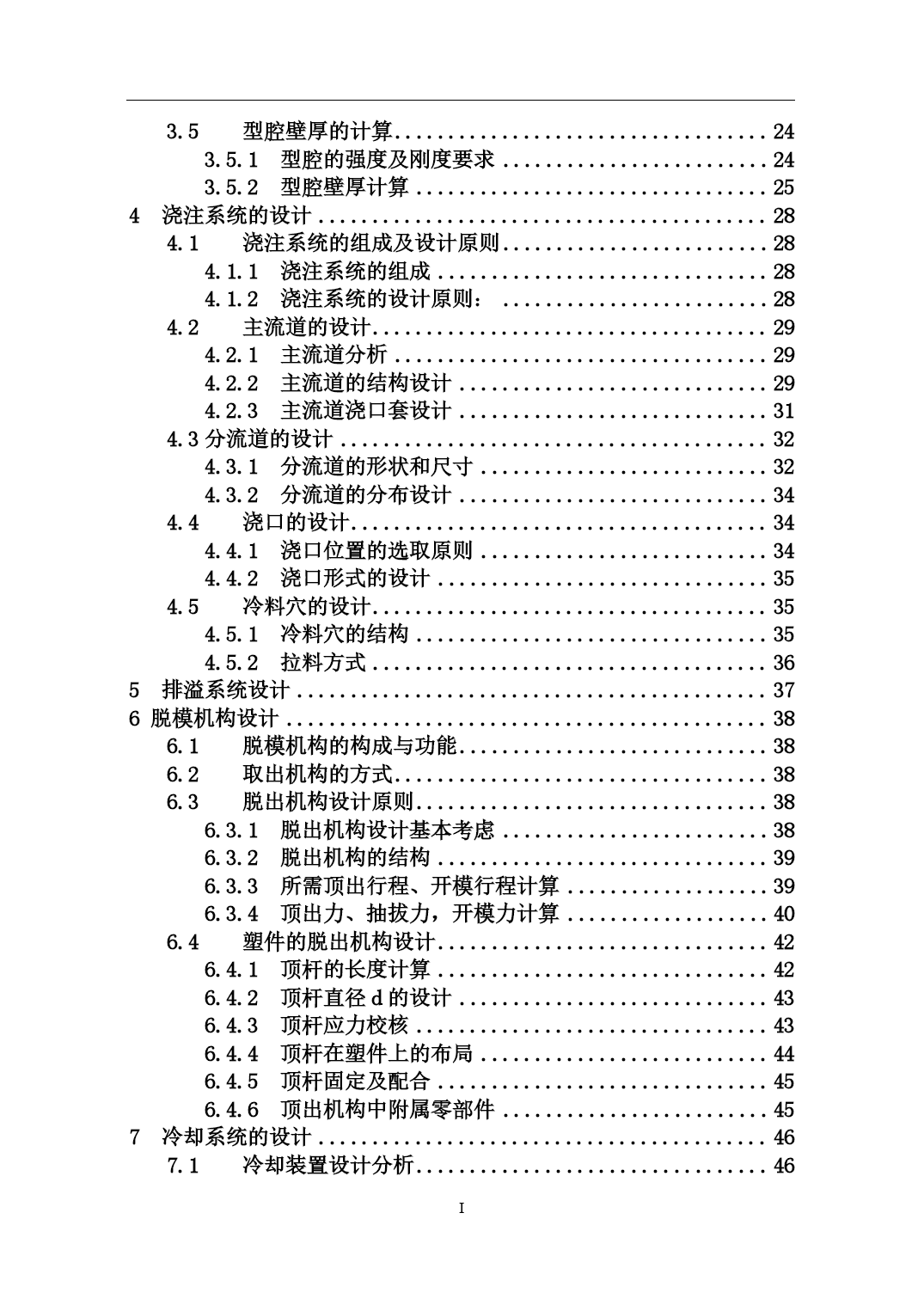 PAGEPAGEII摘要模具生产技术水平的高低,已成为衡量一个国家产品制造水平高低的重要标志。塑料工业的飞速发展,对注塑模具的设计与生产提出了质量好、制造精度高、研发周期短等越来越高的要求,能否适应这种需求已成为模具生产企业发展的关键因素。模具技术是融合机械工程、计算机应用、自动控制、数控技术等学科为一体的综合性学科。随着家电市场竞争的白热化,家电外壳设计成为了衡量家电外壳色彩、手感、精度的重要一环,进而对设计提出了新的需求。本毕业设计正是从实际使用出发,进行遥控器面盖注塑成型模具的设计。本设计是对遥控器面盖进行的注塑模型设计,利用Pro/E软件对塑件进行了实体造型,并对塑件结构进行了工艺剖析。首先对遥控器的结构工艺性进行分析,清楚了解塑件;由生产批量初步选定注射机型号;然后对本次模具设计的各个方案进行论证分析,从选定方案中对浇注系统、成型工作零件的计算及校核,从中确定模架,推出与抽芯机构的计算及校核,冷却系统的计算及其水道布置设计,在最后对排气和导向与定位结构的设计。其次利用注塑模具设计原理对各个具体系统零件进行详细的计算和校核,使设计出的结构可确保模具可靠运行,在此基础上完成了本毕业论文的写作。最后绘制整套模具的装配图和零件图。通过对本课题遥控器模型设计,我重温了注塑成型与模具设计知识,使书本知识和理论与实际生产相结合,加强了对注塑模具设计知识的理解,使自己能运用书本知识设计出基本符合生产要求的模具。在论文中我充分地运用了大学期间所学到的知识。进行了研究,巩固和深化,达到了预期的设计意图。关键字:注射模具浇注系统脱模机构冷却系统AbstractThetechniquelevelofmoldingtoolwhichhasbecameanimportantmarkingtomeasurethelevelofanationalproduct.Somehigherdemandssuchashighquality,highprecision,shorttimeofR&Dandsoonwereputforwardsincetherapiddevelopmentofplasticindustry,whethertheycanadapttotheserequirementshasbecominganimportantfactorforthedevelopmentofmoldingproducer.Themoldtechnologyisacomprehensivedisciplinethatcombinesmechanicalengineering,computerapplication,automaticcontrol,numericalcontroltechnologyandsoon.Asthecompetitionintheappliancemarketgrowing,theapplianceshellcolor,feelingandaccuracybecameanimportantpartofthedesignandmadenewdemands.Thispaperfocusontheactualconductandtrytodesignremotecontrolcoverinjectionmold.Thisdesignistheinjectionmodeloftheremotecontrolcover,usePro/Esoftwareforthesolidmodelingplasticpartsandanalysisthestructureoftheprocess.Firstly,thestructureoftheremotecontrolwasanalyzedtogetaclearunderstandingofplasticparts.Thenselecttheinjectionmachinemodelbytheinitialproductionbatch.Thirdly,analyzethevariousoptions,selecttheprogram.Thecalculationandcheckingofthegatingsystemandformingworkingpartsdeterminethemold,putforwardthecoremechanismcalculationandcheckingandconfirmthecalculationandchannellayoutofthecoolingsystem.Finally,designtheorientationandstructureoftheexhaustsystem.Furthermore,weusetheprinc