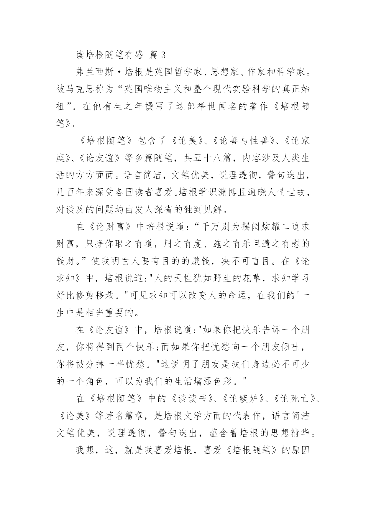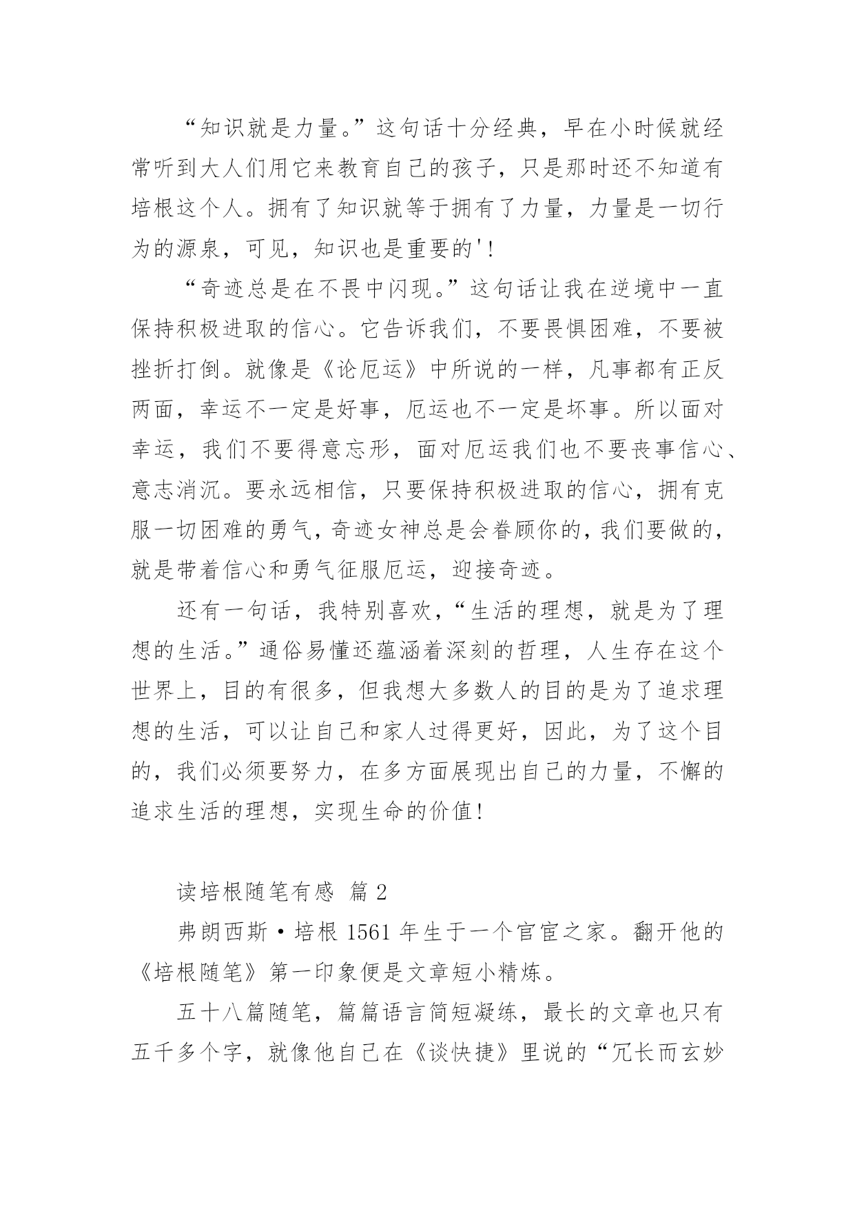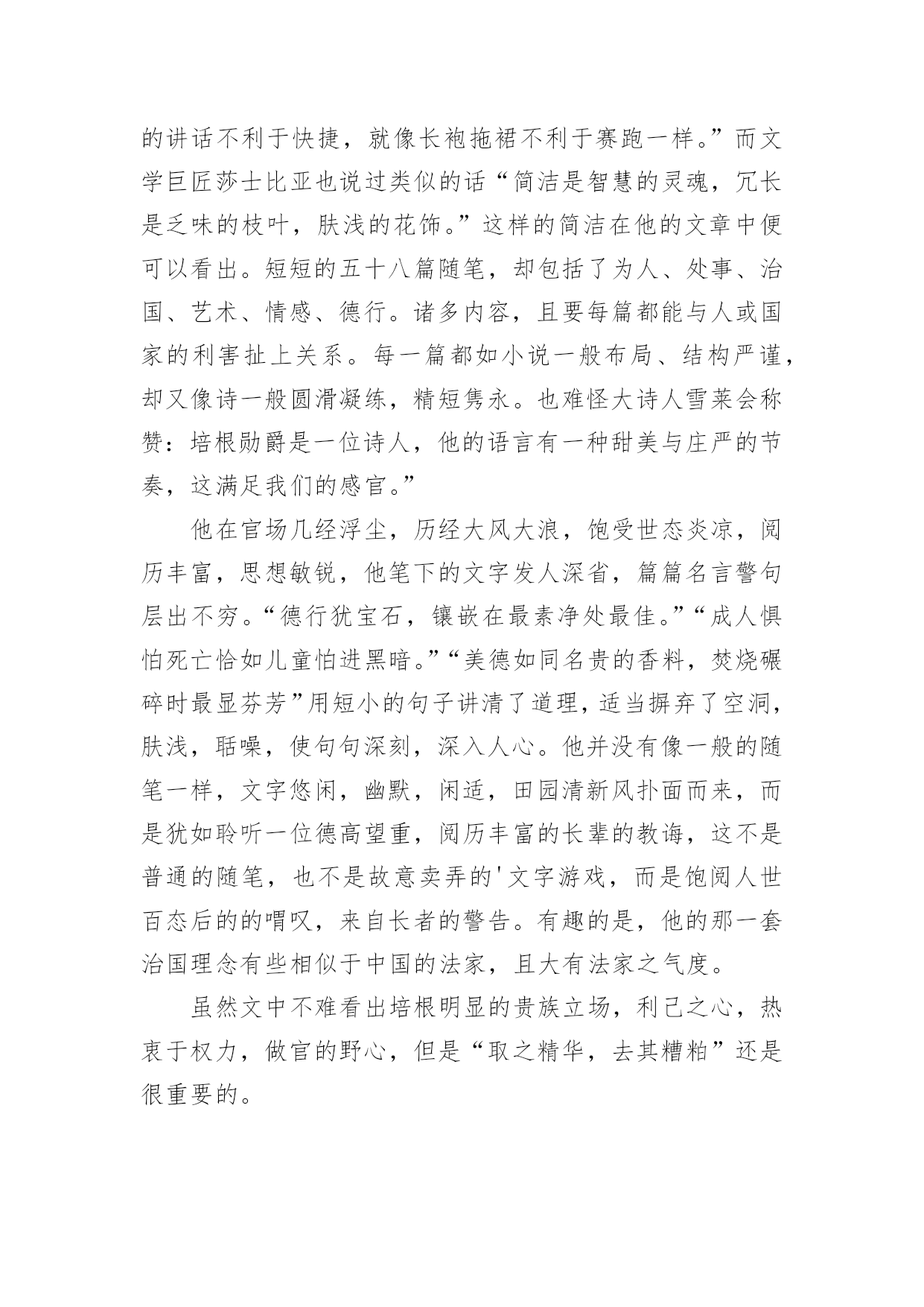 读培根随笔有感读完某一作品后,想必你一定有很多值得分享的心得,这时最关键的读后感不能忘了哦。那么你真的会写读后感吗?以下是小编整理的读培根随笔有感,希望对大家有所帮助。读培根随笔有感篇1《培根随笔》是英国随笔文学的开山之作,以其简洁的语言、优美的文笔、透彻的说理、迭出的警句,在世界文学史上占据了非常重要的地位,“读之犹如聆听高人赐教,受益匪浅”。这本书是最近才接触的,看过之后,我只有一种感觉——敬佩。于是,整理读后感。培根,一位伟大的英国文学家、哲学家,尤其是在哲学方面,成绩显赫,这是我在读这本书之前就知道的。读过《培根随笔》之后,我对培根的崇敬又上了一层。在我看来,这本书十分深奥,十分难懂,有些地方反复咀嚼多遍后仍然有些不理解。但是一旦知晓了其中内涵便回味无穷,受益匪浅,其中蕴含着的深刻哲理发人深省、令人深思……“读书使人成为完善的人。”这句话曾经作为我的座右铭来激励我努力读书。成为一个完善的人,是大多数人追求一生的理想,可见,读书是多么的重要啊!“知识就是力量。”这句话十分经典,早在小时候就经常听到大人们用它来教育自己的孩子,只是那时还不知道有培根这个人。拥有了知识就等于拥有了力量,力量是一切行为的源泉,可见,知识也是重要的'!“奇迹总是在不畏中闪现。”这句话让我在逆境中一直保持积极进取的信心。它告诉我们,不要畏惧困难,不要被挫折打倒。就像是《论厄运》中所说的一样,凡事都有正反两面,幸运不一定是好事,厄运也不一定是坏事。所以面对幸运,我们不要得意忘形,面对厄运我们也不要丧事信心、意志消沉。要永远相信,只要保持积极进取的信心,拥有克服一切困难的勇气,奇迹女神总是会眷顾你的,我们要做的,就是带着信心和勇气征服厄运,迎接奇迹。还有一句话,我特别喜欢,“生活的理想,就是为了理想的生活。”通俗易懂还蕴涵着深刻的哲理,人生存在这个世界上,目的有很多,但我想大多数人的目的是为了追求理想的生活,可以让自己和家人过得更好,因此,为了这个目的,我们必须要努力,在多方面展现出自己的力量,不懈的追求生活的理想,实现生命的价值!读培根随笔有感篇2弗朗西斯·培根1561年生于一个官宦之家。翻开他的《培根随笔》第一印象便是文章短小精炼。五十八篇随笔,篇篇语言简短凝练,最长的文章也只有五千多个字,就像他自己在《谈快捷》里说的“冗长而玄妙的讲话不利于快捷,就像长袍拖裙不利于赛跑一样。”而文学巨匠莎士比亚也说过类似的话“简洁是智慧的灵魂,冗长是乏味的枝叶,肤浅的花饰。”这样的简洁在他的文章中便可以看出。短短的五十八篇随笔,却包括了为人、处事、治国、艺术、情感、德行。诸多内容,且要每篇都能与人或国家的利害扯上关系。每一篇都如小说一般布局、结构严谨,却又像诗一般圆滑凝练,精短隽永。也难怪大诗人雪莱会称赞:培根勋爵是一位诗人,他的语言有一种甜美与庄严的节奏,这满足我们的感官。”他在官场几经浮尘,历经大风大浪,饱受世态炎凉,阅历丰富,思想敏锐,他笔下的文字发人深省,篇篇名言警句层出不穷。“德行犹宝石,镶嵌在最素净处最佳。”“成人惧怕死亡恰如儿童怕进黑暗。”“美德如同名贵的香料,焚烧碾碎时最显芬芳”用短小的句子讲清了道理,适当摒弃了空洞,肤浅,聒噪,使句句深刻,深入人心。他并没有像一般的随笔一样,文字悠闲,幽默,闲适,田园清新风扑面而来,而是犹如聆听一位德高望重,阅历丰富的长辈的教诲,这不是普通的随笔,也不是故意卖弄的'文字游戏,而是饱阅人世百态后的的喟叹,来自长者的警告。有趣的是,他的那一套治国理念有些相似于中国的法家,且大有法家之气度。虽然文中不难看出培根明显的贵族立场,利己之心,热衷于权力,做官的野心,但是“取之精华,去其糟粕”还是很重要的。读培根随笔有感篇3弗兰西斯·培根是英国哲学家、思想家、作家和科学家。被马克思称为“英国唯物主义和整个现代实验科学的真正始祖”。在他有生之年撰写了这部举世闻名的著作《培根随笔》。《培根随笔》包含了《论美》、《论善与性善》、《论家庭》、《论友谊》等多篇随笔,共五十八篇,内容涉及人类生活的方方面面。语言简洁,文笔优美,说理透彻,警句迭出,几百年来深受各国读者喜爱。培根学识渊博且通晓人情世故,对谈及的问题均由发人深省的独到见解。在《论财富》中培根说道:“千万别为摆阔炫耀二追求财富,只挣你取之有道,用之有度、施之有乐且遗之有慰的钱财。”使我明白人要有目的的赚钱,决不可盲目。在《论求知》中,培根说道:"人的天性犹如野生的花草,求知学习好比修剪移栽。"可见求知可以改变人的命运,在我们的'一生中是相当重要的。在《论友谊》中,培根说道:"如果你把快乐告诉一个朋友,你将得到两个快乐;而如果你把忧愁向一个朋友倾吐,你将被分掉一半忧愁。"这说明了朋友是我们身边必不可少的一个角色,可以为我们的生活增添色彩。"在《培根随笔》中的《谈读书》、《论嫉妒