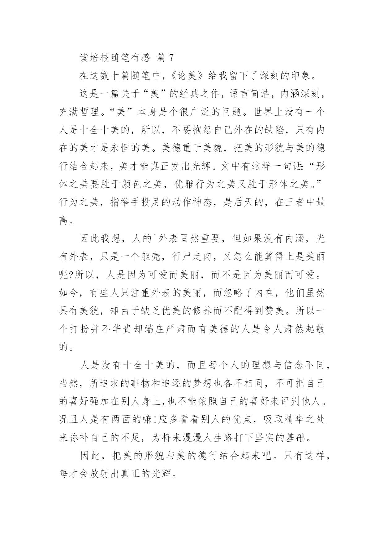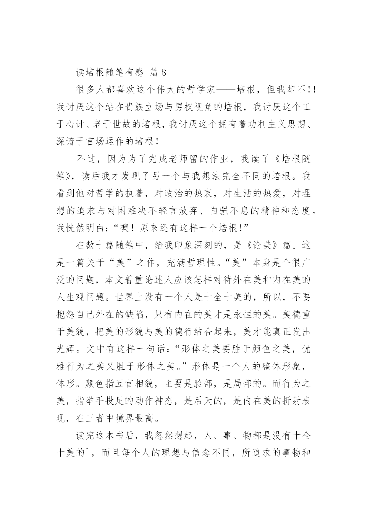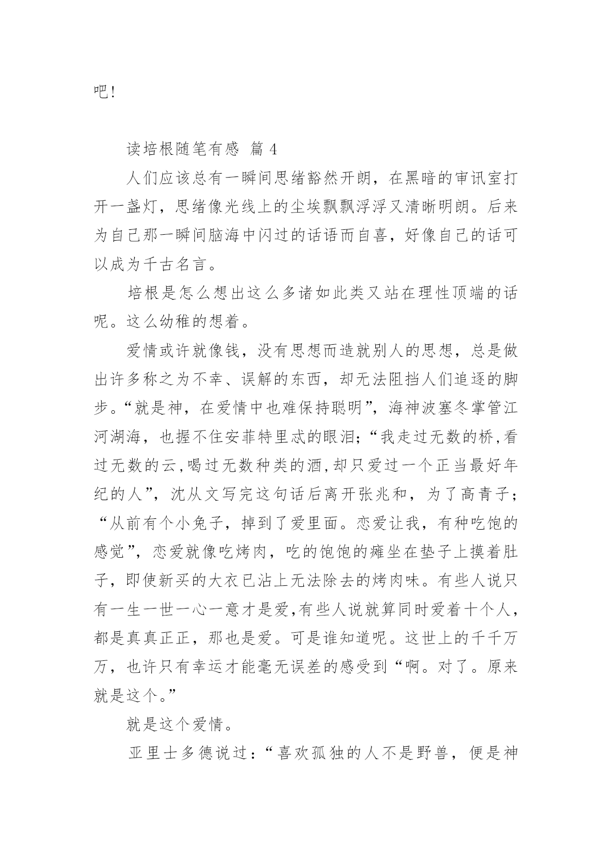 读培根随笔有感读完某一作品后,想必你一定有很多值得分享的心得,这时最关键的读后感不能忘了哦。那么你真的会写读后感吗?以下是小编整理的读培根随笔有感,希望对大家有所帮助。读培根随笔有感篇1《培根随笔》是英国随笔文学的开山之作,以其简洁的语言、优美的文笔、透彻的说理、迭出的警句,在世界文学史上占据了非常重要的地位,“读之犹如聆听高人赐教,受益匪浅”。这本书是最近才接触的,看过之后,我只有一种感觉——敬佩。于是,整理读后感。培根,一位伟大的英国文学家、哲学家,尤其是在哲学方面,成绩显赫,这是我在读这本书之前就知道的。读过《培根随笔》之后,我对培根的崇敬又上了一层。在我看来,这本书十分深奥,十分难懂,有些地方反复咀嚼多遍后仍然有些不理解。但是一旦知晓了其中内涵便回味无穷,受益匪浅,其中蕴含着的深刻哲理发人深省、令人深思……“读书使人成为完善的人。”这句话曾经作为我的座右铭来激励我努力读书。成为一个完善的人,是大多数人追求一生的理想,可见,读书是多么的重要啊!“知识就是力量。”这句话十分经典,早在小时候就经常听到大人们用它来教育自己的孩子,只是那时还不知道有培根这个人。拥有了知识就等于拥有了力量,力量是一切行为的源泉,可见,知识也是重要的'!“奇迹总是在不畏中闪现。”这句话让我在逆境中一直保持积极进取的信心。它告诉我们,不要畏惧困难,不要被挫折打倒。就像是《论厄运》中所说的一样,凡事都有正反两面,幸运不一定是好事,厄运也不一定是坏事。所以面对幸运,我们不要得意忘形,面对厄运我们也不要丧事信心、意志消沉。要永远相信,只要保持积极进取的信心,拥有克服一切困难的勇气,奇迹女神总是会眷顾你的,我们要做的,就是带着信心和勇气征服厄运,迎接奇迹。还有一句话,我特别喜欢,“生活的理想,就是为了理想的生活。”通俗易懂还蕴涵着深刻的哲理,人生存在这个世界上,目的有很多,但我想大多数人的目的是为了追求理想的生活,可以让自己和家人过得更好,因此,为了这个目的,我们必须要努力,在多方面展现出自己的力量,不懈的追求生活的理想,实现生命的价值!读培根随笔有感篇2弗朗西斯·培根1561年生于一个官宦之家。翻开他的《培根随笔》第一印象便是文章短小精炼。五十八篇随笔,篇篇语言简短凝练,最长的文章也只有五千多个字,就像他自己在《谈快捷》里说的“冗长而玄妙的讲话不利于快捷,就像长袍拖裙不利于赛跑一样。”而文学巨匠莎士比亚也说过类似的话“简洁是智慧的灵魂,冗长是乏味的枝叶,肤浅的花饰。”这样的简洁在他的文章中便可以看出。短短的五十八篇随笔,却包括了为人、处事、治国、艺术、情感、德行。诸多内容,且要每篇都能与人或国家的利害扯上关系。每一篇都如小说一般布局、结构严谨,却又像诗一般圆滑凝练,精短隽永。也难怪大诗人雪莱会称赞:培根勋爵是一位诗人,他的语言有一种甜美与庄严的节奏,这满足我们的感官。”他在官场几经浮尘,历经大风大浪,饱受世态炎凉,阅历丰富,思想敏锐,他笔下的文字发人深省,篇篇名言警句层出不穷。“德行犹宝石,镶嵌在最素净处最佳。”“成人惧怕死亡恰如儿童怕进黑暗。”“美德如同名贵的香料,焚烧碾碎时最显芬芳”用短小的句子讲清了道理,适当摒弃了空洞,肤浅,聒噪,使句句深刻,深入人心。他并没有像一般的随笔一样,文字悠闲,幽默,闲适,田园清新风扑面而来,而是犹如聆听一位德高望重,阅历丰富的长辈的教诲,这不是普通的随笔,也不是故意卖弄的'文字游戏,而是饱阅人世百态后的的喟叹,来自长者的警告。有趣的是,他的那一套治国理念有些相似于中国的法家,且大有法家之气度。虽然文中不难看出培根明显的贵族立场,利己之心,热衷于权力,做官的野心,但是“取之精华,去其糟粕”还是很重要的。读培根随笔有感篇3弗兰西斯·培根是英国哲学家、思想家、作家和科学家。被马克思称为“英国唯物主义和整个现代实验科学的真正始祖”。在他有生之年撰写了这部举世闻名的著作《培根随笔》。《培根随笔》包含了《论美》、《论善与性善》、《论家庭》、《论友谊》等多篇随笔,共五十八篇,内容涉及人类生活的方方面面。语言简洁,文笔优美,说理透彻,警句迭出,几百年来深受各国读者喜爱。培根学识渊博且通晓人情世故,对谈及的问题均由发人深省的独到见解。在《论财富》中培根说道:“千万别为摆阔炫耀二追求财富,只挣你取之有道,用之有度、施之有乐且遗之有慰的钱财。”使我明白人要有目的的赚钱,决不可盲目。在《论求知》中,培根说道:"人的天性犹如野生的花草,求知学习好比修剪移栽。"可见求知可以改变人的命运,在我们的'一生中是相当重要的。在《论友谊》中,培根说道:"如果你把快乐告诉一个朋友,你将得到两个快乐;而如果你把忧愁向一个朋友倾吐,你将被分掉一半忧愁。"这说明了朋友是我们身边必不可少的一个角色,可以为我们的生活增添色彩。"在《培根随笔》中的《谈读书》、《论嫉妒