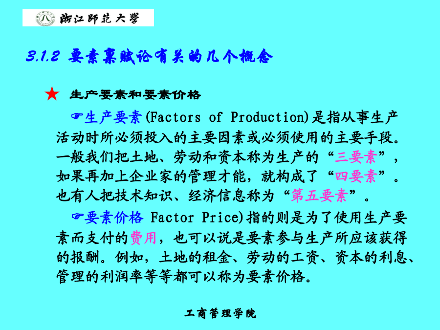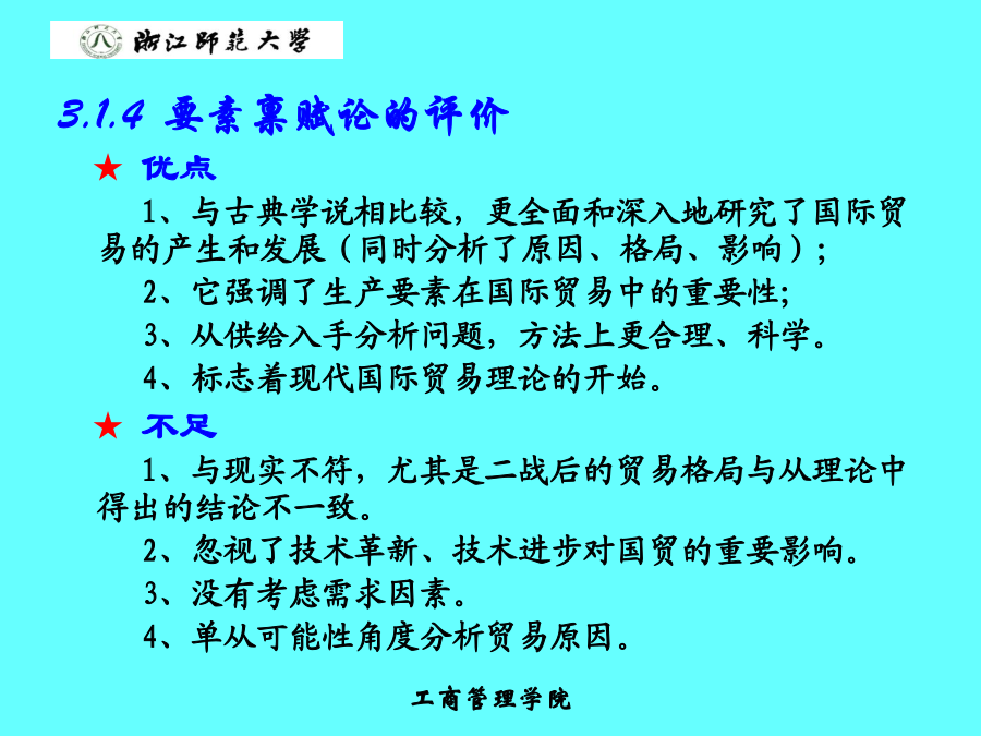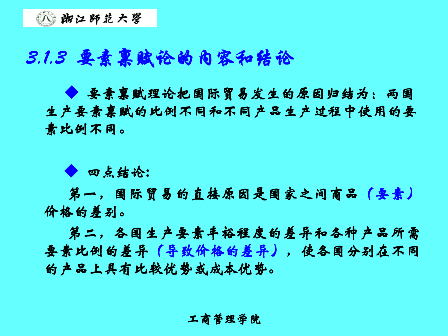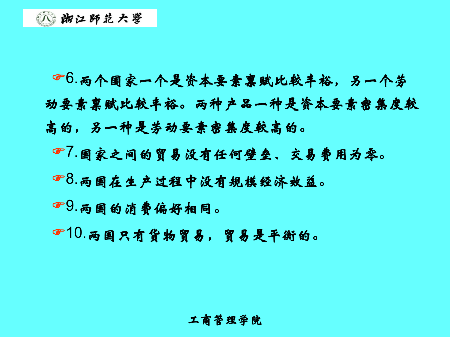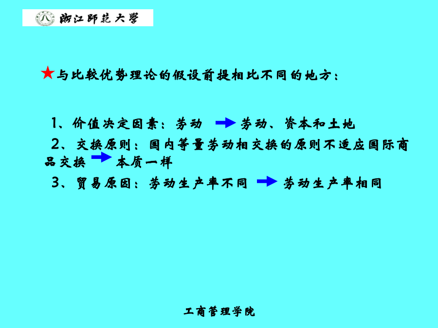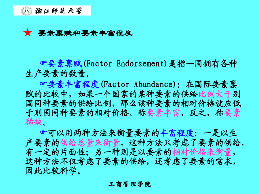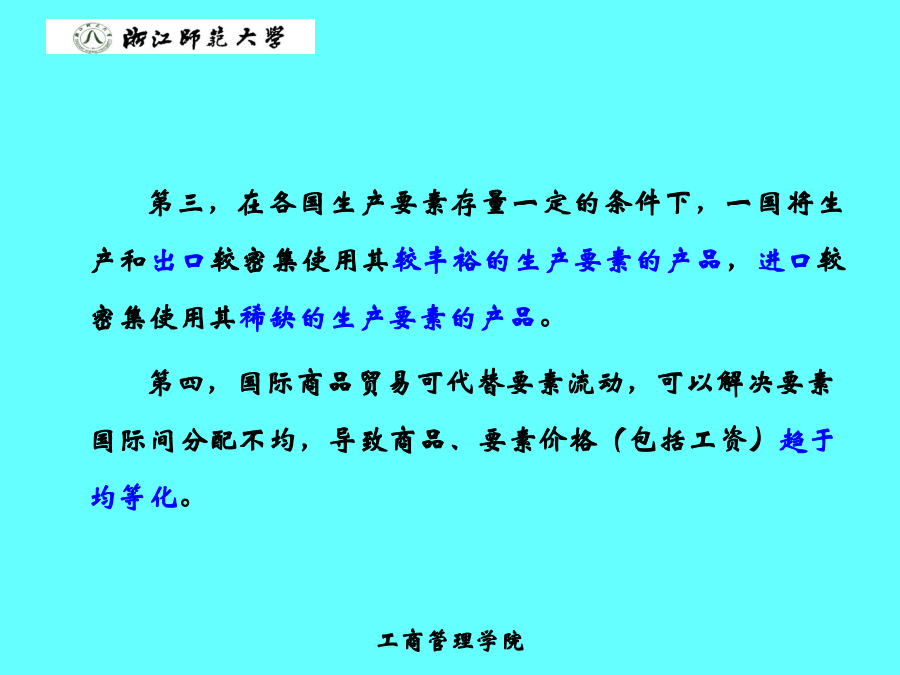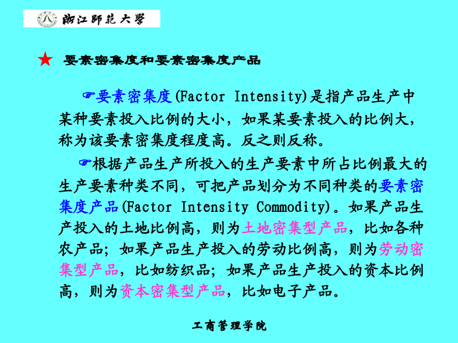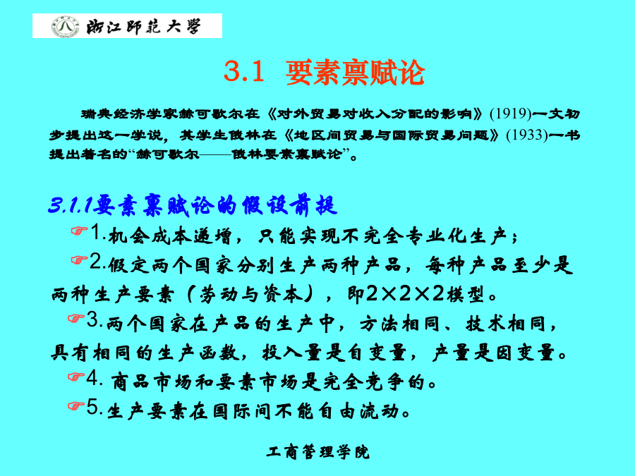 第三章要素禀赋理论瑞典经济学家赫可歇尔在《对外贸易对收入分配的影响》(1919)一文初步提出这一学说,其学生俄林在《地区间贸易与国际贸易问题》(1933)一书提出著名的“赫可歇尔——俄林要素禀赋论”。3.1.1要素禀赋论的假设前提1.机会成本递增,只能实现不完全专业化生产;2.假定两个国家分别生产两种产品,每种产品至少是两种生产要素(劳动与资本),即2×2×2模型。3.两个国家在产品的生产中,方法相同、技术相同,具有相同的生产函数,投入量是自变量,产量是因变量。4.商品市场和要素市场是完全竞争的。5.生产要素在国际间不能自由流动。6.两个国家一个是资本要素禀赋比较丰裕,另一个劳动要素禀赋比较丰裕。两种产品一种是资本要素密集度较高的,另一种是劳动要素密集度较高的。7.国家之间的贸易没有任何壁垒、交易费用为零。8.两国在生产过程中没有规模经济效益。9.两国的消费偏好相同。10.两国只有货物贸易,贸易是平衡的。★与比较优势理论的假设前提相比不同的地方:3.1.2要素禀赋论有关的几个概念★要素禀赋和要素丰富程度★要素密集度和要素密集度产品3.1.3要素禀赋论的内容和结论第三,在各国生产要素存量一定的条件下,一国将生产和出口较密集使用其较丰裕的生产要素的产品,进口较密集使用其稀缺的生产要素的产品。第四,国际商品贸易可代替要素流动,可以解决要素国际间分配不均,导致商品、要素价格(包括工资)趋于均等化。3.1.4要素禀赋论的评价3.2要素禀赋论的发展3.2.1要素比例变化理论3.3里昂惕夫之谜3.3.1里昂惕夫之谜美国学者列昂惕夫通过投入——产出的方法,对美国1947年的对外贸易进出口商品中的所使用劳动力和资本进行了分析,得出与H-O模型的结论完全相反的结论(即美国出口的不是资本密集型产品,而是劳动密集型产品;进口的不是劳动密集型产品,而是资本密集型产品)。这就是里昂惕夫之谜。一些学者也对要素禀赋学说进行了实证,结果表明确实在部分国家对外贸易中存在列昂惕夫之谜现象。TestsonUSAdata3.3.2对里昂惕夫之谜的解释1、技术差距学说。2、自然资源学说。3、要素密集转化学说。4、贸易壁垒限制学说。5、人力资本学说。6、需求偏好学说。7、跨国公司影响学说。★技术差距学说★自然资源学说★要素密集转化学说H-O模型假设各国生产同一种商品时使用相同的技术。也就是说同一种商品有相同的要素密集度。而事实上,由于各国要素禀赋和技术发展水平的差异,这种假设不很现实。如粮食在中国是劳动密集型的,而在美国就是资本密集型的。因此,由于要素密集度的逆转,事实上是资本密集型的美国农产品被统计成了劳动密集型产品。★贸易壁垒限制学说★人力资本学说H-O理论假设同类要素在各国间是同质的。但事实上,无论是自然资源、劳动力还是资本,其素质是不同的。列昂惕夫认为,美国最丰富的资源不是资本,而是熟练农民和科技专业劳动者。他们不是普通意义上的劳动力,而是人力资本(HumanCapital)。从这一角度看,美国大量出口的正是农产品和技术密集型产品(当时被归为劳动密集型产品)。★需求偏好说★跨国公司影响说3.3.3列昂惕夫之谜评价列昂惕夫之谜的提出开创了用统计数据实证国际贸易理论的先河。列昂惕夫之谜源于H-O理论过于严格的假设前提脱离了现实经济世界。尤其在二战之后,国际经济格局与古典模型之间的差距越来越大,呼唤现代贸易理论的诞生。从对列昂惕夫之谜的解释可以看出,影响国际贸易格局的因素是多种多样的。思考与练习End