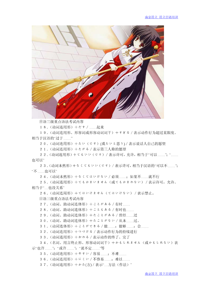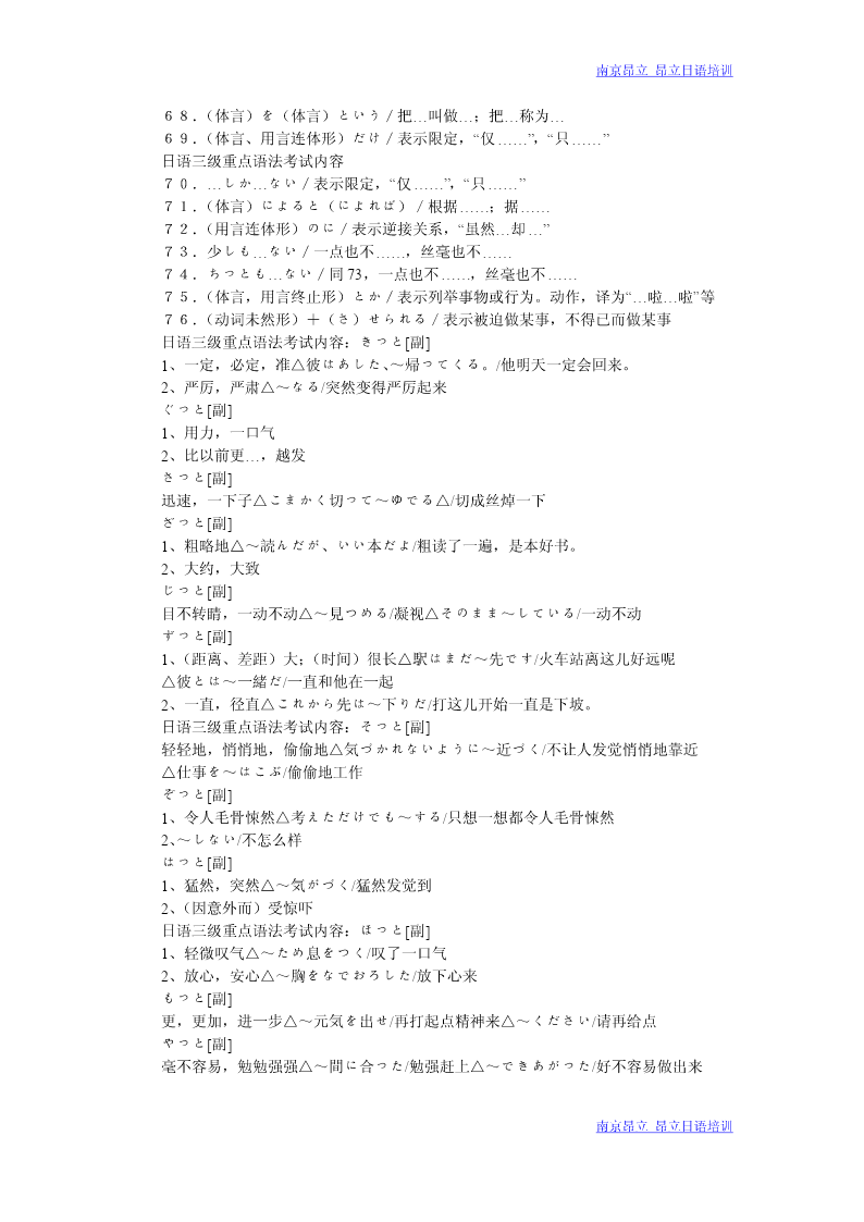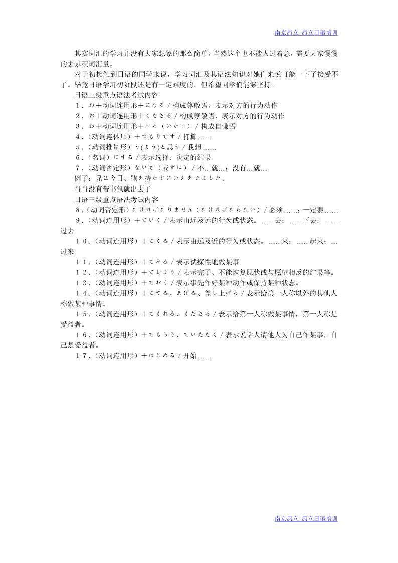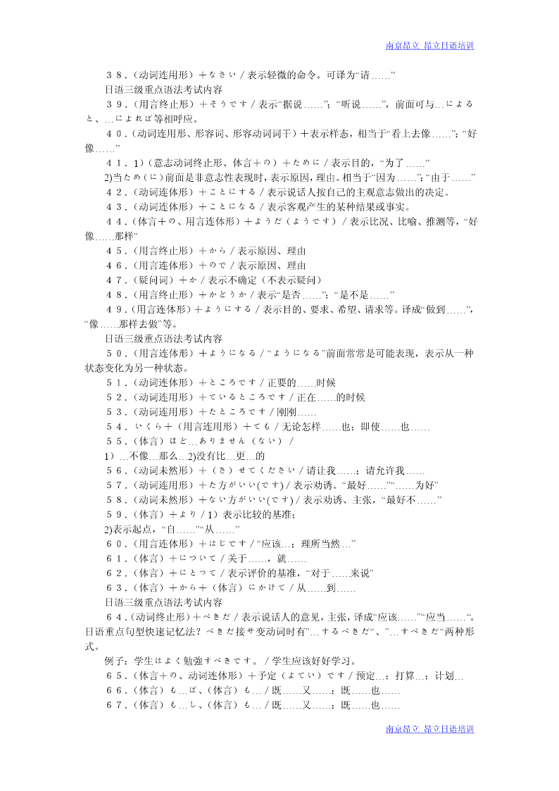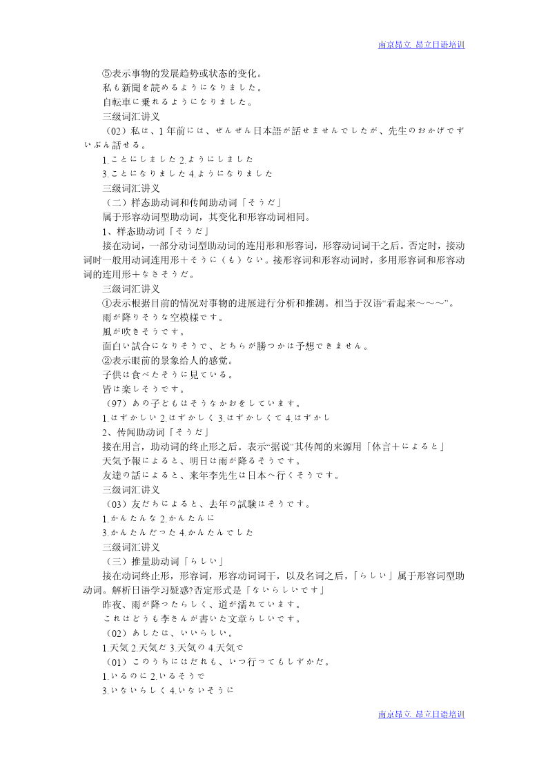 南京昂立昂立日语培训三级词汇讲义对于刚刚接触到日语的同学,可能什么都还不了解,这种情况下,学习单词是主要,只有了解了更多的日语单词才能进入更深入的学习。所以,三级词汇讲义就变得非常重要。三级词汇讲义一、关于「ようだ」,「そうだ」「らしい」的比较与分析(一)比况助动词「ようだ」接在用言终止形,体言之后,「ようだ」属于形容动词型助动词,其变化和形容动词相同。①表示比喻。子供の顔はりんごのようで、とても可愛い。まるで絵のようです。②表示例示。举出一个事例说明事物的范围,种类和程度。パンダのような動物は世界でも珍しいです。先生のように発音してください。(05年)みんなが子どもの元気に歌いはじめた。1.ように2.ぐらいに3.ほどに4.そうに③表示不确切或委婉的判断。白さんは日本文学を研究しているようです。家事の原因は煙草の火のようです。咳も出るし、頭も痛いし、どうも風邪を引いたようです。三级词汇讲义(02)あの人は、ようですね。1.お医者さんだ2.お医者さんな3.お医者さんの4.お医者さんで④表示目的、愿望、请求、号召及引起对方的注意等。南京日语培训班说,只能用「ように」的形式。日本語が上手になるように必死に勉強しています。風邪を引かないように気をつけてください。南京昂立昂立日语培训南京昂立昂立日语培训⑤表示事物的发展趋势或状态的变化。私も新聞を読めるようになりました。自転車に乗れるようになりました。三级词汇讲义(02)私は、1年前には、ぜんぜん日本語が話せませんでしたが、先生のおかげでずいぶん話せる。1.ことにしました2.ようにしました3.ことになりました4.ようになりました三级词汇讲义(二)样态助动词和传闻助动词「そうだ」属于形容动词型助动词,其变化和形容动词相同。1、样态助动词「そうだ」接在动词,一部分动词型助动词的连用形和形容词,形容动词词干之后。否定时,接动词时一般用动词连用形+そうに(も)ない。接形容词和形容动词时,多用形容词和形容动词的连用形+なさそうだ。三级词汇讲义①表示根据目前的情况对事物的进展进行分析和推测。相当于汉语“看起来~~~”。雨が降りそうな空模様です。風が吹きそうです。面白い試合になりそうで、どちらが勝つかは予想できません。②表示眼前的景象给人的感觉。子供は食べたそうに見ている。皆は楽しそうです。(97)あの子どもはそうなかおをしています。1.はずかしい2.はずかしく3.はずかしくて4.はずかし2、传闻助动词「そうだ」接在用言,助动词的终止形之后。表示“据说”其传闻的来源用「体言+によると」天気予報によると、明日は雨が降るそうです。友達の話によると、来年李先生は日本へ行くそうです。三级词汇讲义(03)友だちによると、去年の試験はそうです。1.かんたんな2.かんたんに3.かんたんだった4.かんたんでした三级词汇讲义(三)推量助动词「らしい」接在动词终止形,形容词,形容动词词干,以及名词之后,「らしい」属于形容词型助动词。解析日语学习疑惑?否定形式是「ないらしいです」昨夜、雨が降ったらしく、道が濡れています。これはどうも李さんが書いた文章らしいです。(02)あしたは、いいらしい。1.天気2.天気だ3.天気の4.天気で(01)このうちにはだれも、いつ行ってもしずかだ。1.いるのに2.いるそうで3.いないらしく4.いないそうに南京昂立昂立日语培训南京昂立昂立日语培训其实词汇的学习并没有大家想象的那么简单,当然这个也不能太过着急,需要大家慢慢的去累积词汇量。对于初接触到日语的同学来说,学习词汇及其语法知识对她们来说可能一下子接受不了。毕竟日语学习初阶段还是有一定难度的,但希望同学们能够坚持。日语三级重点语法考试内容1.お+动词连用形+になる/构成尊敬语,表示对方的行为动作2.お+动词连用形+くださる/构成尊敬语,表示对方的行为动作3.お+动词连用形+する(いたす)/构成自谦语4.(动词连体形)+つもりです/打算……5.(动词推量形)う(よう)と思う/我想……6.(名词)にする/表示选择、决定的结果7.(动词否定形)ないで(或ずに)/不…就…;没有…就…例子:兄は今日、鞄を持たずにいえをでました。哥哥没有带书包就出去了日语三级重点语法考试内容8.(动词否定形)なければなりません(なければならない)/必须……;一定要……9.(动词连用形)+ていく/表示由近及远的行为或状态。……去;……下去;……过去10.(动词连用形)+てくる/表示由远及近的行为或状态。……来;……起来;…过来11.(动词连用形)+てみる/表示试