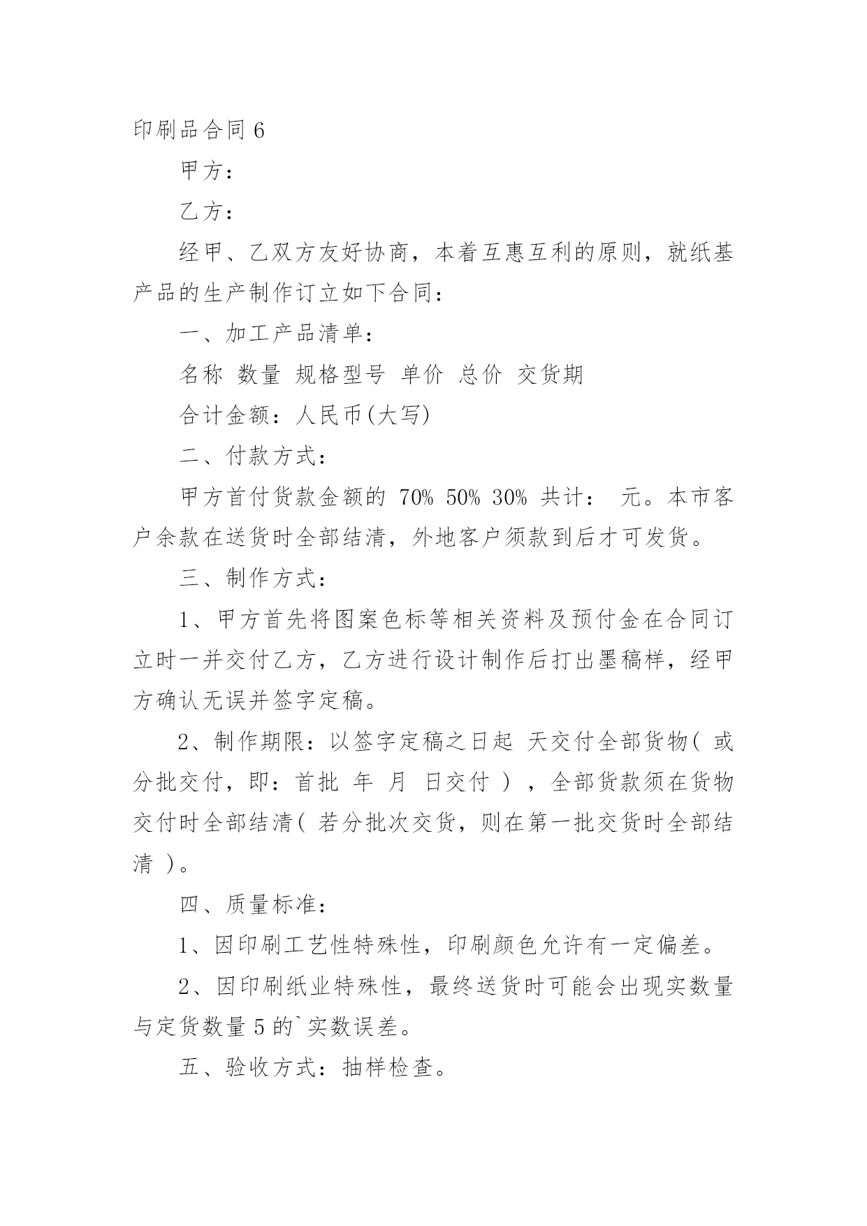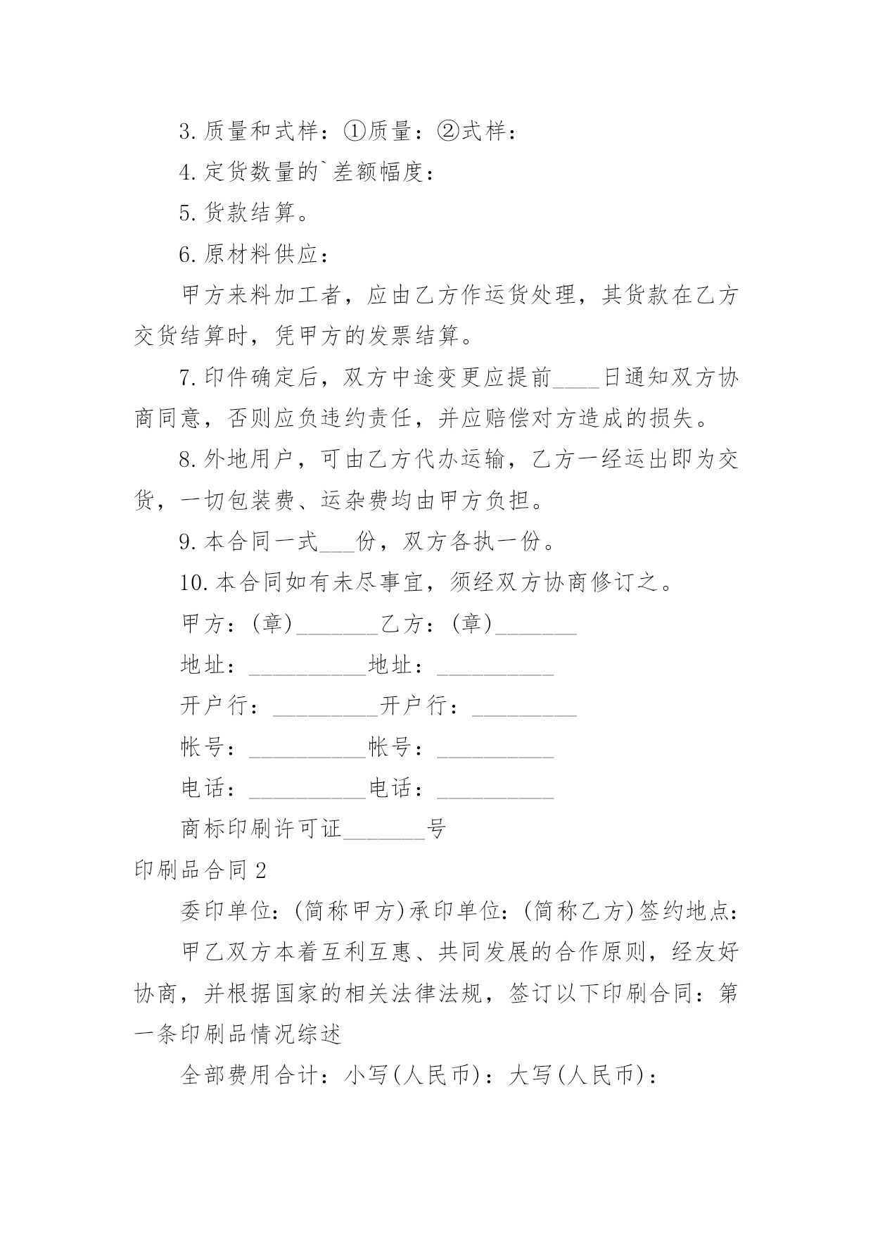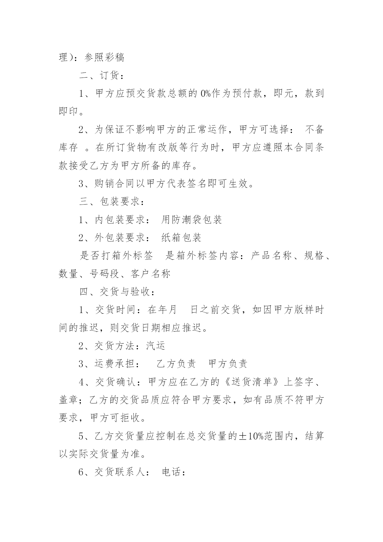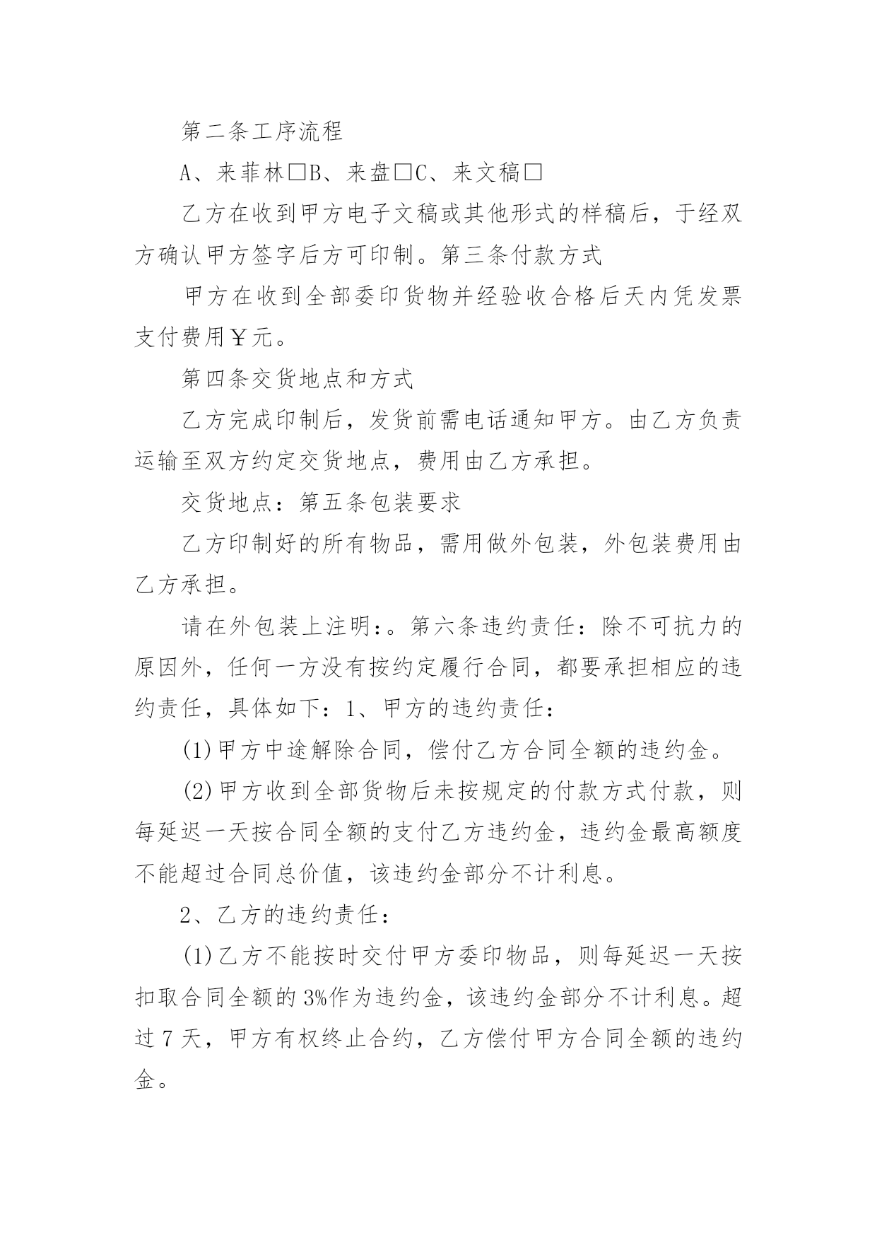 印刷品合同印刷品合同在不断进步的社会中,我们用到合同的地方越来越多,签订合同能够较为有效的约束违约行为。那么一般合同是怎么起草的呢?下面是小编为大家整理的印刷品合同,欢迎阅读与收藏。印刷品合同1合同编号:75406甲方:______乙方:______兹因甲方生产需要向乙方订印下列印刷品,经双方协商同意订立合同如下:1.印刷品名称、数量及交货日期:品名规格单位数量计划单价金额用料交货期2.加工原料:3.质量和式样:①质量:②式样:4.定货数量的`差额幅度:5.货款结算。6.原材料供应:甲方来料加工者,应由乙方作运货处理,其货款在乙方交货结算时,凭甲方的发票结算。7.印件确定后,双方中途变更应提前____日通知双方协商同意,否则应负违约责任,并应赔偿对方造成的损失。8.外地用户,可由乙方代办运输,乙方一经运出即为交货,一切包装费、运杂费均由甲方负担。9.本合同一式___份,双方各执一份。10.本合同如有未尽事宜,须经双方协商修订之。甲方:(章)_______乙方:(章)_______地址:__________地址:__________开户行:_________开户行:_________帐号:__________帐号:__________电话:__________电话:__________商标印刷许可证_______号印刷品合同2委印单位:(简称甲方)承印单位:(简称乙方)签约地点:甲乙双方本着互利互惠、共同发展的合作原则,经友好协商,并根据国家的相关法律法规,签订以下印刷合同:第一条印刷品情况综述全部费用合计:小写(人民币):大写(人民币):第二条工序流程A、来菲林□B、来盘□C、来文稿□乙方在收到甲方电子文稿或其他形式的样稿后,于经双方确认甲方签字后方可印制。第三条付款方式甲方在收到全部委印货物并经验收合格后天内凭发票支付费用¥元。第四条交货地点和方式乙方完成印制后,发货前需电话通知甲方。由乙方负责运输至双方约定交货地点,费用由乙方承担。交货地点:第五条包装要求乙方印制好的所有物品,需用做外包装,外包装费用由乙方承担。请在外包装上注明:。第六条违约责任:除不可抗力的原因外,任何一方没有按约定履行合同,都要承担相应的违约责任,具体如下:1、甲方的违约责任:(1)甲方中途解除合同,偿付乙方合同全额的违约金。(2)甲方收到全部货物后未按规定的付款方式付款,则每延迟一天按合同全额的支付乙方违约金,违约金最高额度不能超过合同总价值,该违约金部分不计利息。2、乙方的违约责任:(1)乙方不能按时交付甲方委印物品,则每延迟一天按扣取合同全额的3%作为违约金,该违约金部分不计利息。超过7天,甲方有权终止合约,乙方偿付甲方合同全额的违约金。(2)若乙方的印制品不能达到双方合同所约定的`要求,则甲方有权拒收,或根据相应的情况按比例扣除货款,扣除比例由双方根据情况协商。(3)甲方在使用过程中,发现印制品在没有外界因素影响的情况下,存在质量问题,甲方应在天内通知乙方进行退换处理,其运费由乙方负担。第七条争议解决双方在履行合同过程中应友好协商解决分歧意见,如协商不能解决,均同意交由甲方所在地有管辖权的法院裁决。第八条合同文本本合同一式两份,双方各执一份,具同等法律效力,由双方代表签字盖章后生效。第九条本合同自签订之日起生效。委印单位(甲方):承印单位(乙方):地址:地址:法定代表人:法定代表人:委托代理人(盖章):委托代理人(盖章):电话:电话:日期:日期:印刷品合同3合同编号:双方协定:1.印件交货日期按甲乙双方协定为准,如遇不可测因素延误交货时间,双方应协商解决。2.产品印刷前甲方必须确认稿件所有内容并签字同意,乙方才能下单生产。甲方自带稿件的`,我司视为最终确认稿件。签字确认后的稿件,产品印刷后内容若有误我司概不负责。3.产品验收标准以来样及印刷行规的标准为标准(数码打样与成品印刷会有色差),如客户跟机看样按客户签样稿为准,其它一切差错与乙方无关。4.特殊行业补充说明:因印刷品颜色由墨压、天气、温度、湿度以及工厂内不同机品印刷等多种自然因素影响,不同批次印刷品会产生色差,此属印刷通性,不应做不合格品处之。5.本合同一式两份,双方各执一份,自签订之日起共具法律效应,任何一方违约、毁约都应承担另一方的全部损失。甲方:乙方:代表人:代表人:年月日年月日印刷品合同4甲方(买方):乙方(卖方):联系人:联系人:联系电话:联系电话:传真:传真:甲、乙双方经友好协商,本着互惠互利、长期合作的原则,根据《中华人民共和国合同法》及有关法规规定,为明确双方在商品购销过程中的`权利、义务和经济责任,经双方协商签订本协议书,供双方共同遵守。一、订购物品清单及单价:4、产品工艺要求(印色/涂布/吹气泡/制袋/表面处理):参照彩稿二、订货:1、甲方应预交货款总额的0%作为预