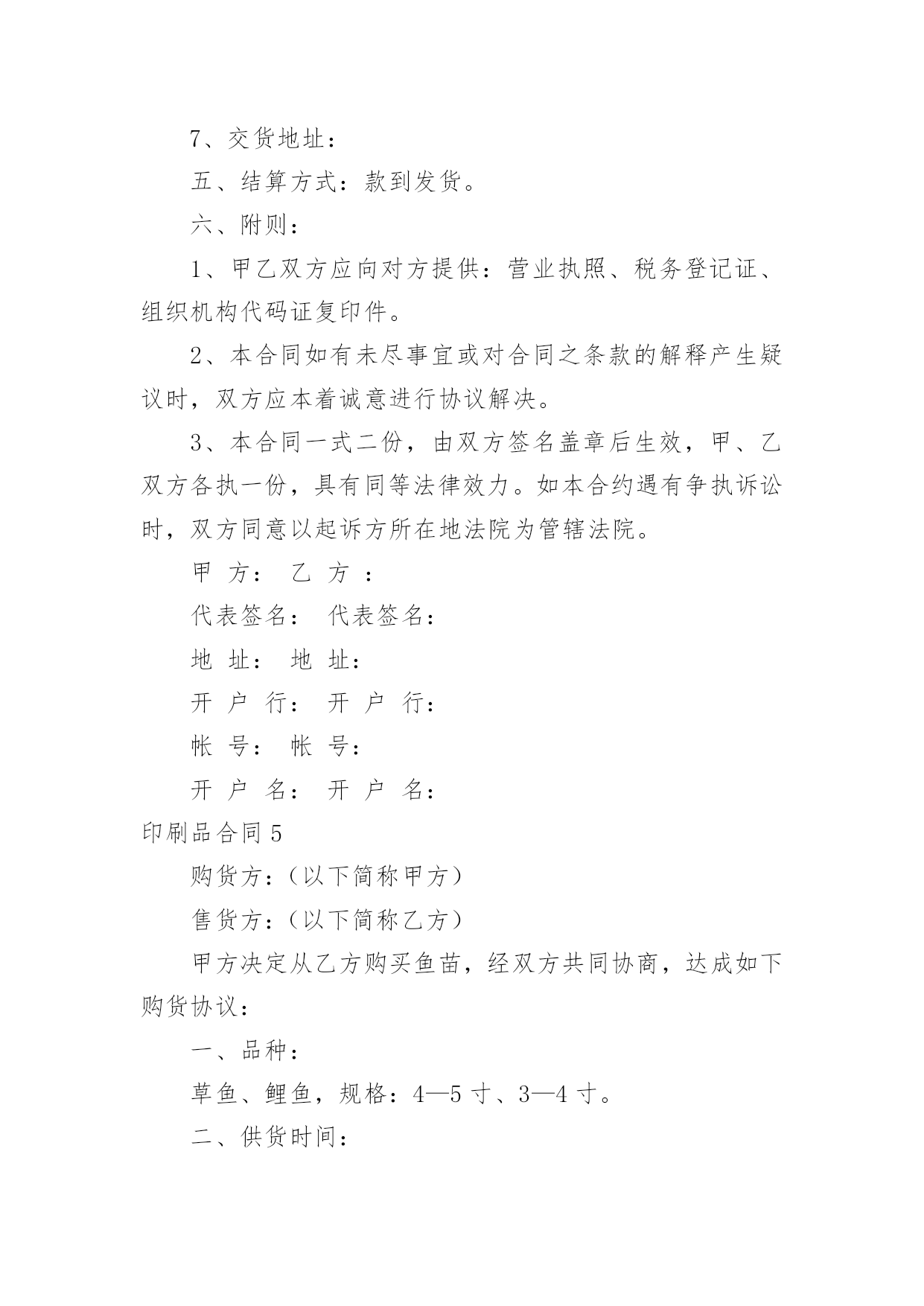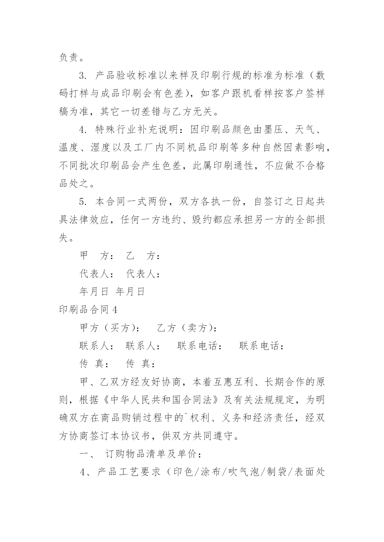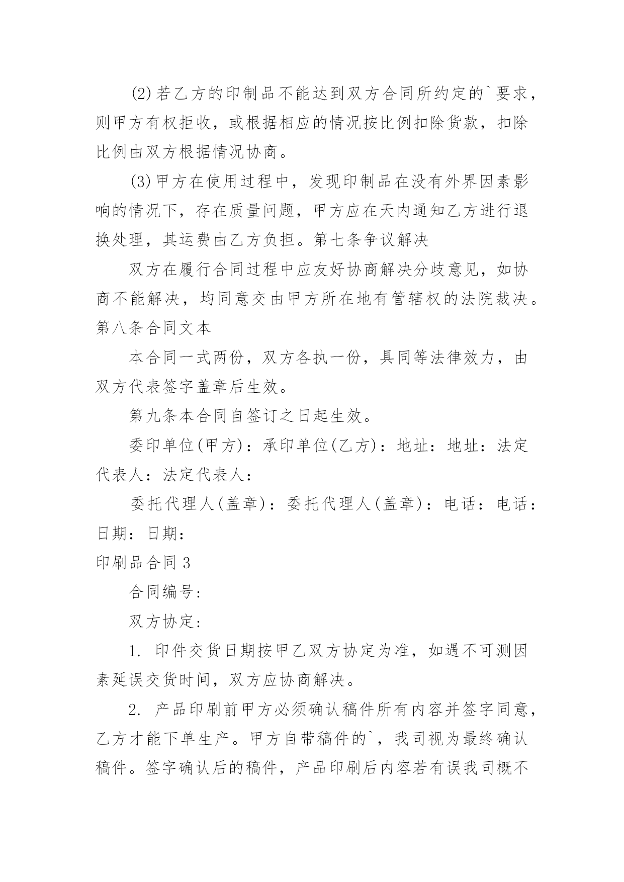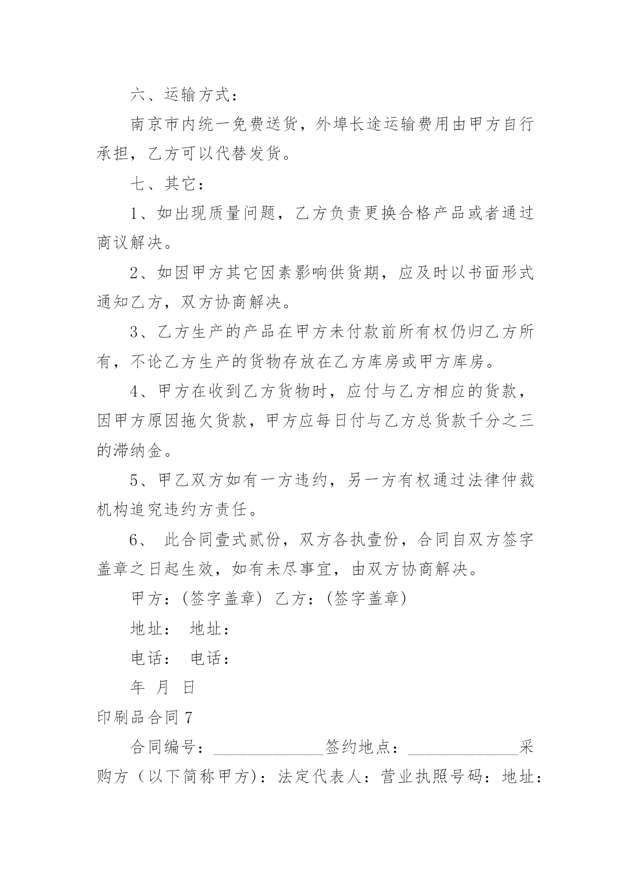印刷品合同印刷品合同在不断进步的社会中,我们用到合同的地方越来越多,签订合同能够较为有效的约束违约行为。那么一般合同是怎么起草的呢?下面是小编为大家整理的印刷品合同,欢迎阅读与收藏。印刷品合同1合同编号:75406甲方:______乙方:______兹因甲方生产需要向乙方订印下列印刷品,经双方协商同意订立合同如下:1.印刷品名称、数量及交货日期:品名规格单位数量计划单价金额用料交货期2.加工原料:3.质量和式样:①质量:②式样:4.定货数量的`差额幅度:5.货款结算。6.原材料供应:甲方来料加工者,应由乙方作运货处理,其货款在乙方交货结算时,凭甲方的发票结算。7.印件确定后,双方中途变更应提前____日通知双方协商同意,否则应负违约责任,并应赔偿对方造成的损失。8.外地用户,可由乙方代办运输,乙方一经运出即为交货,一切包装费、运杂费均由甲方负担。9.本合同一式___份,双方各执一份。10.本合同如有未尽事宜,须经双方协商修订之。甲方:(章)_______乙方:(章)_______地址:__________地址:__________开户行:_________开户行:_________帐号:__________帐号:__________电话:__________电话:__________商标印刷许可证_______号印刷品合同2委印单位:(简称甲方)承印单位:(简称乙方)签约地点:甲乙双方本着互利互惠、共同发展的合作原则,经友好协商,并根据国家的相关法律法规,签订以下印刷合同:第一条印刷品情况综述全部费用合计:小写(人民币):大写(人民币):第二条工序流程A、来菲林□B、来盘□C、来文稿□乙方在收到甲方电子文稿或其他形式的样稿后,于经双方确认甲方签字后方可印制。第三条付款方式甲方在收到全部委印货物并经验收合格后天内凭发票支付费用¥元。第四条交货地点和方式乙方完成印制后,发货前需电话通知甲方。由乙方负责运输至双方约定交货地点,费用由乙方承担。交货地点:第五条包装要求乙方印制好的所有物品,需用做外包装,外包装费用由乙方承担。请在外包装上注明:。第六条违约责任:除不可抗力的原因外,任何一方没有按约定履行合同,都要承担相应的违约责任,具体如下:1、甲方的违约责任:(1)甲方中途解除合同,偿付乙方合同全额的违约金。(2)甲方收到全部货物后未按规定的付款方式付款,则每延迟一天按合同全额的支付乙方违约金,违约金最高额度不能超过合同总价值,该违约金部分不计利息。2、乙方的违约责任:(1)乙方不能按时交付甲方委印物品,则每延迟一天按扣取合同全额的3%作为违约金,该违约金部分不计利息。超过7天,甲方有权终止合约,乙方偿付甲方合同全额的违约金。(2)若乙方的印制品不能达到双方合同所约定的`要求,则甲方有权拒收,或根据相应的情况按比例扣除货款,扣除比例由双方根据情况协商。(3)甲方在使用过程中,发现印制品在没有外界因素影响的情况下,存在质量问题,甲方应在天内通知乙方进行退换处理,其运费由乙方负担。第七条争议解决双方在履行合同过程中应友好协商解决分歧意见,如协商不能解决,均同意交由甲方所在地有管辖权的法院裁决。第八条合同文本本合同一式两份,双方各执一份,具同等法律效力,由双方代表签字盖章后生效。第九条本合同自签订之日起生效。委印单位(甲方):承印单位(乙方):地址:地址:法定代表人:法定代表人:委托代理人(盖章):委托代理人(盖章):电话:电话:日期:日期:印刷品合同3合同编号:双方协定:1.印件交货日期按甲乙双方协定为准,如遇不可测因素延误交货时间,双方应协商解决。2.产品印刷前甲方必须确认稿件所有内容并签字同意,乙方才能下单生产。甲方自带稿件的`,我司视为最终确认稿件。签字确认后的稿件,产品印刷后内容若有误我司概不负责。3.产品验收标准以来样及印刷行规的标准为标准(数码打样与成品印刷会有色差),如客户跟机看样按客户签样稿为准,其它一切差错与乙方无关。4.特殊行业补充说明:因印刷品颜色由墨压、天气、温度、湿度以及工厂内不同机品印刷等多种自然因素影响,不同批次印刷品会产生色差,此属印刷通性,不应做不合格品处之。5.本合同一式两份,双方各执一份,自签订之日起共具法律效应,任何一方违约、毁约都应承担另一方的全部损失。甲方:乙方:代表人:代表人:年月日年月日印刷品合同4甲方(买方):乙方(卖方):联系人:联系人:联系电话:联系电话:传真:传真:甲、乙双方经友好协商,本着互惠互利、长期合作的原则,根据《中华人民共和国合同法》及有关法规规定,为明确双方在商品购销过程中的`权利、义务和经济责任,经双方协商签订本协议书,供双方共同遵守。一、订购物品清单及单价:4、产品工艺要求(印色/涂布/吹气泡/制袋/表面处理):参照彩稿二、订货:1、甲方应预交货款总额的0%作为预